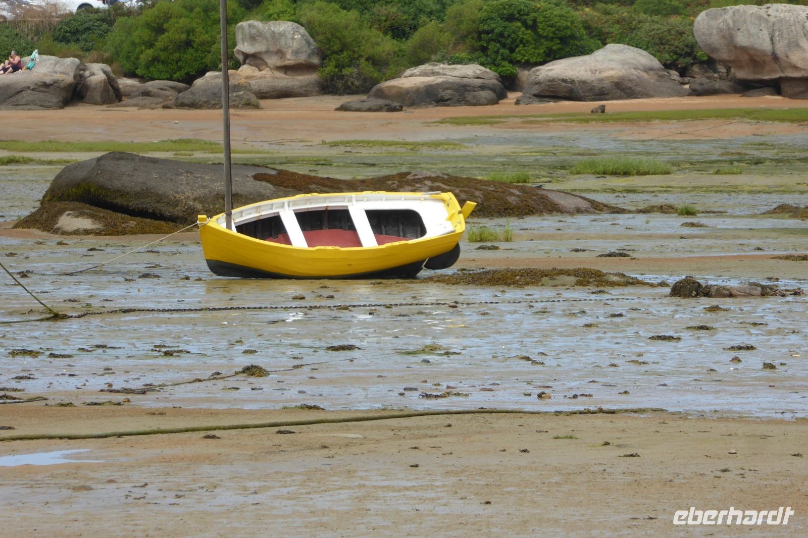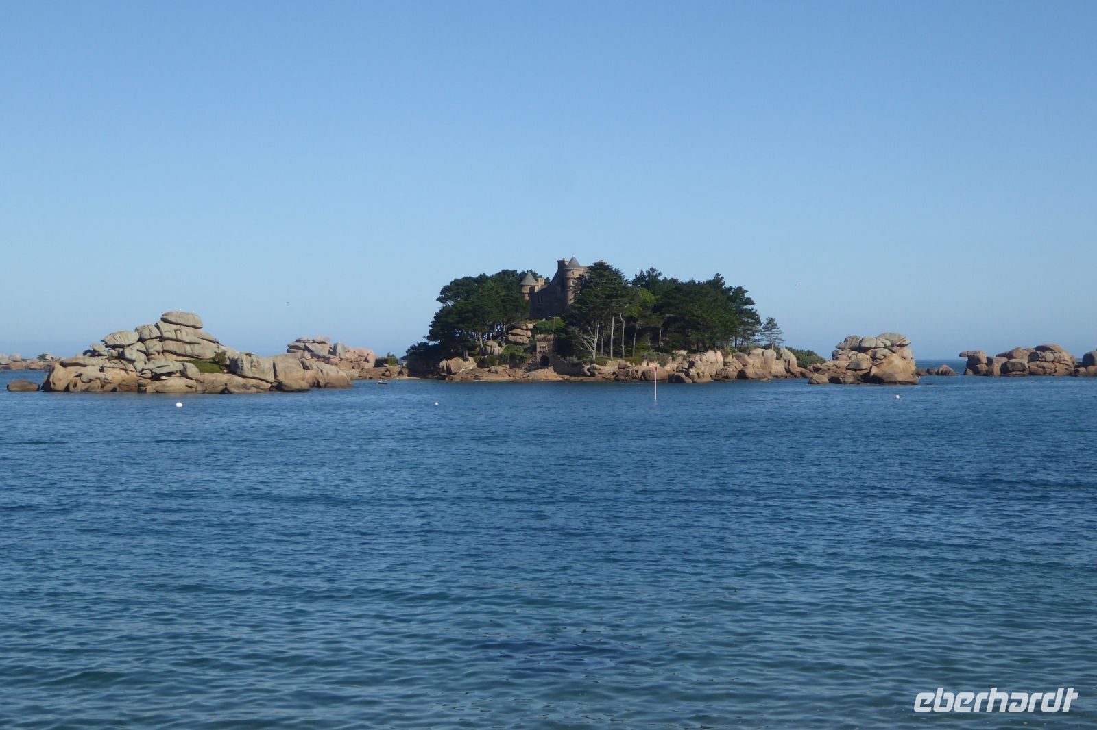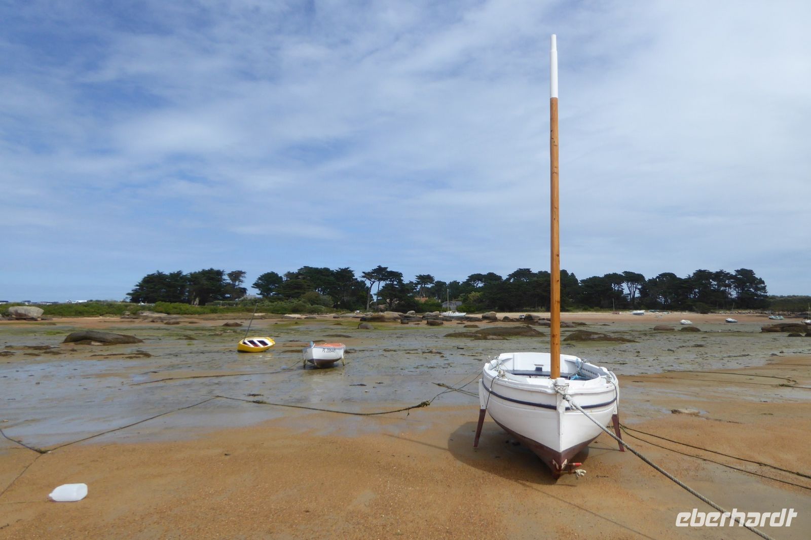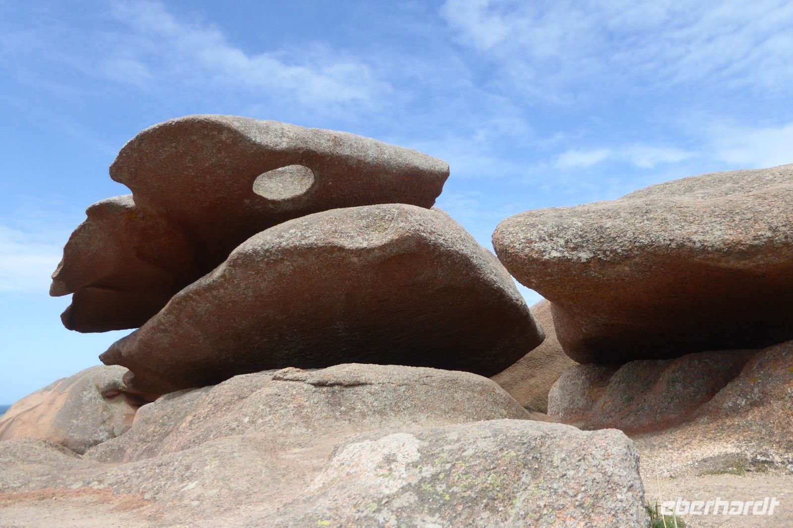Heute stand die Wanderung zu dem vielleicht schönsten Abschnitt unserer Reise auf dem Programm. Bei wunderschönem Wetter und angenehmen Temperaturen starteten wir unsere Wanderung an der Wassermühle am Eingang des Traouiero Tales. Gleich hinter dem kleinen Stausee geht es in das Tal, wo sich große Steinbrüche befinden. Im sechsten Band der Romane um Kommissar Dupin, Bretonisches Leuchten, ist dort der Schauplatz der Geschichte. Für uns beginnt hier der geologisch interessanteste Teil der Route vor 300 Millionen Jahren sind diese Steine entstanden, die wie von Riesenhand geworfen, bizarre Formationen bilden. Der Interpretation dieser Gebilde sind keine Grenzen gesetzt. Wir gingen über den alten Zöllner- und Schmugglerpfad, der uns immer wieder herrliche Ausblicke auf das Meer und die vorgelagerten Inseln bot. In der Bucht von Ploumenac´h steht mitten im Wasser ein kleines Oratorium mit der Statue des Heiligen Guirec. Die alte hölzerne Statue wurde längst ausgetauscht in eine aus massiven Stein, denn die heiratswilligen Mädchen früherer Zeiten glaubten fest daran, dass eine Nadel in die Nase des Heiligen gestochen, ihnen einen passenden Ehemann bescheren möge. Kurze Zeit später erreichten wir den Leuchtturm von Men Ruz. Nach einer kleinen Pause entschieden wir uns, die folgenden drei Wanderkilometer, die sanft den Weg hinunter zum Strand von Trestraou führen, individuell zu gehen. So konnte jeder nach seinem Tempo und seinen Interessen seine Zeit einteilen und den Weg für sich genießen. Der weiße Sandstrand und die Wellen luden besonders Wagemutige zu einem erfrischenden Bad im 17° warmen Wasser des Atlantiks ein.