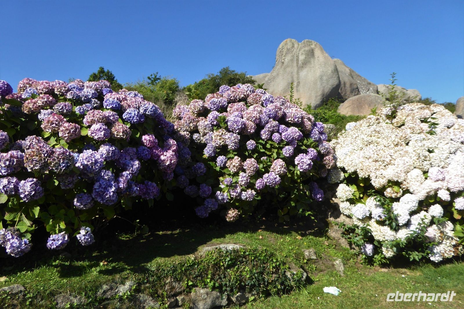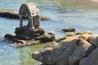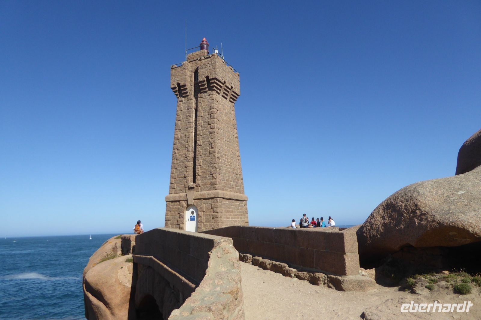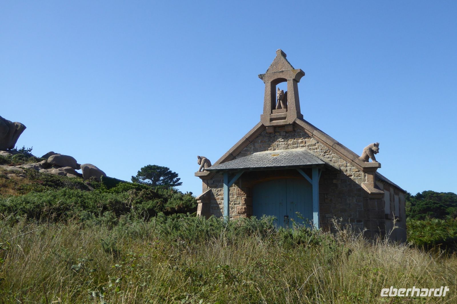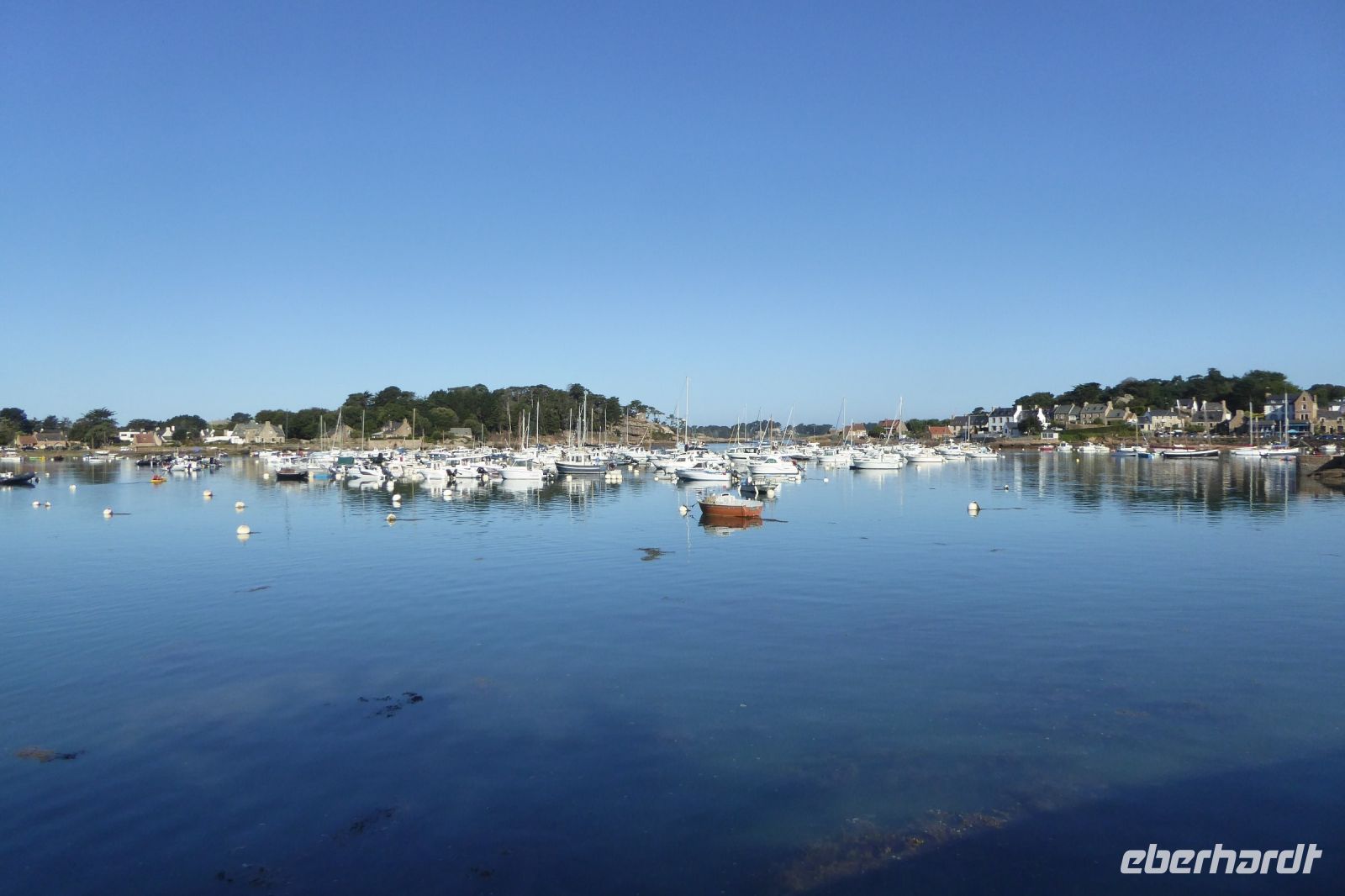 Heute stand die Wanderung zu dem vielleicht schönsten Abschnitt unserer Reise auf dem Programm. Bei wunderschönem Wetter und angenehmen Temperaturen starteten wir unsere Wanderung an der Wassermühle am Eingang des Traouiero Tales. Gleich hinter dem kleinen Stausee geht es in das Tal, wo sich große Steinbrüche befinden. Im sechsten Band der Romane um Kommissar Dupin, Bretonisches Leuchten, ist dort der Schauplatz der Geschichte. Für uns beginnt hier der geologisch interessanteste Teil der Route vor 300 Millionen Jahren sind diese Steine entstanden, die wie von Riesenhand geworfen, bizarre Formationen bilden. Der Interpretation dieser Gebilde sind keine Grenzen gesetzt. Wir gingen über den alten Zöllner- und Schmugglerpfad, der uns immer wieder herrliche Ausblicke auf das Meer und die vorgelagerten Inseln bot. In der Bucht von Ploumenac´h steht mitten im Wasser ein kleines Oratorium mit der Statue des Heiligen Guirec. Die alte hölzerne Statue wurde längst ausgetauscht in eine aus massiven Stein, denn die heiratswilligen Mädchen früherer Zeiten glaubten fest daran, dass eine Nadel in die Nase des Heiligen gestochen, ihnen einen passenden Ehemann bescheren möge. Kurze Zeit später erreichten wir den Leuchtturm von Men Ruz. Nach einer kleinen Pause entschieden wir uns, die folgenden drei Wanderkilometer, die sanft den Weg hinunter zum Strand von Trestraou führen, individuell zu gehen. So konnte jeder nach seinem Tempo und seinen Interessen seine Zeit einteilen und den Weg für sich genießen. Der weiße Sandstrand und die Wellen luden besonders Wagemutige zu einem erfrischenden Bad im 17° warmen Wasser des Atlantiks ein.
