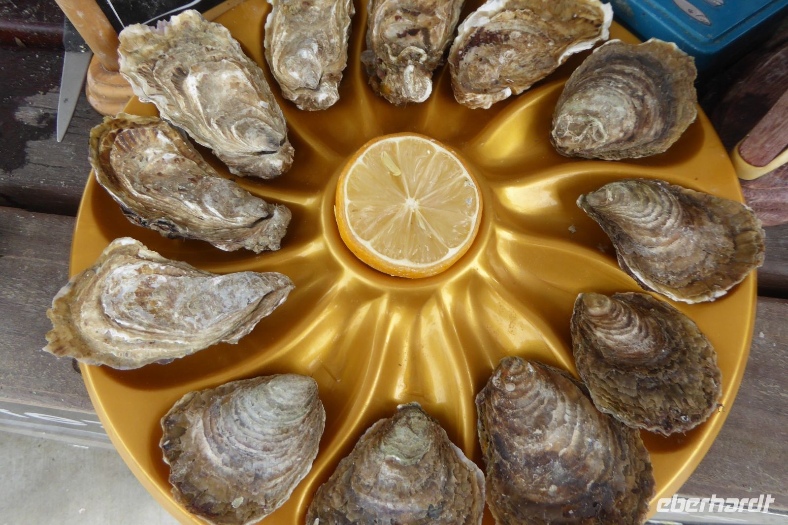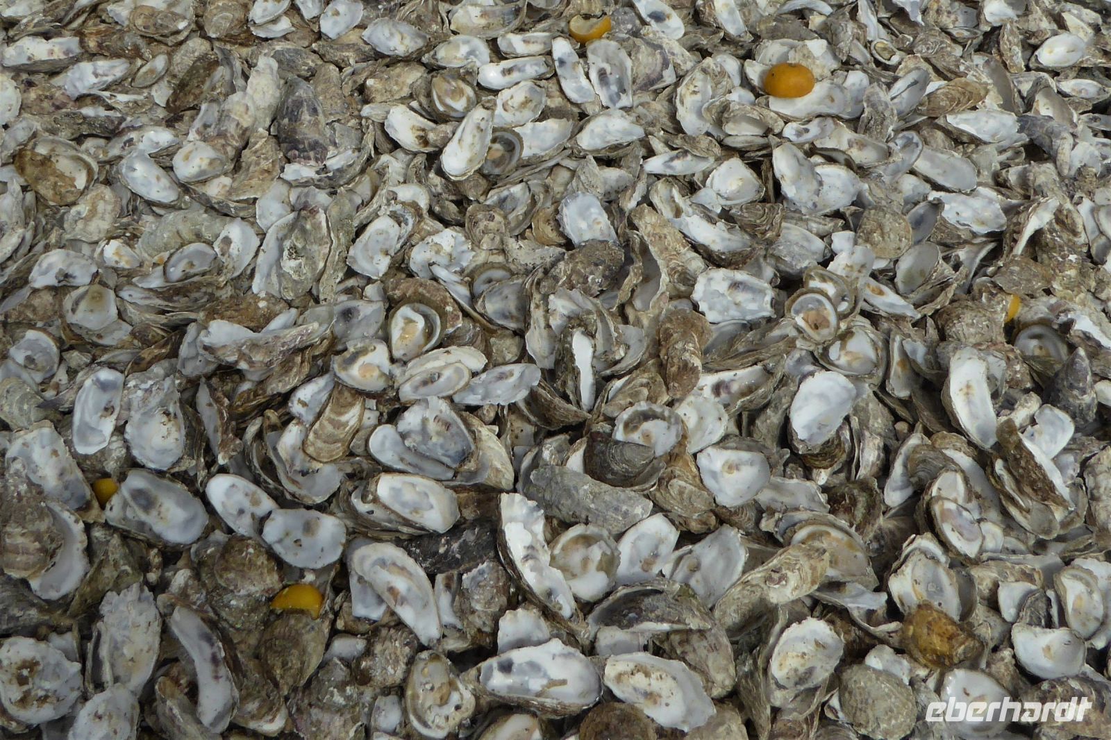 Das nächste Highlight unseres Tages war der Besuch des Austernmarkts am Hafen von Cancale. Schon seit dem 13. Jahrhundert ist hier die Austernzucht nachgewiesen. Heute beschäftigen 50 Austernzuchtbetriebe mit einem Jahresumsatz von über 4 Mio € gut 300 Mitarbeiter und versorgen die Gourmets in aller Welt mit den besten und frischesten Austern der Welt. Ausgerüstet mit gekühlten Flaschen Sauvignon blanc spazierten wir durch das hübsche Städtchen zu den Austernständen, hinter denen die Gourmets frische Austern schlürfen, deren Schalen bereits einen großen Berg bilden. Auch wir leisteten unseren Beitrag zur Erhöhung des Bergs aus Austernschalen und verglichen den Geschmack der pazifischen Austern mit dem der flachen einheimischen Austern aus Cancale.