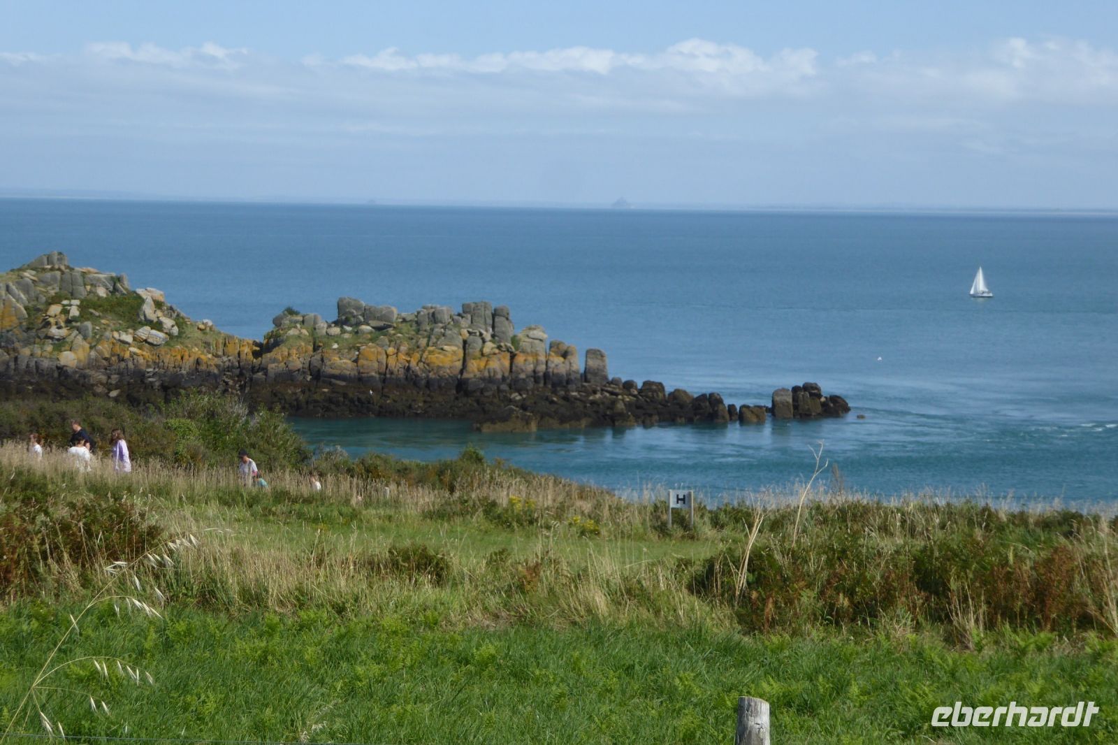 Unsere letzte Wanderung führte uns zur Pointe de Grouin. Leider war die Parkplatzsituation für unseren Bus suboptimal und der Küstenweg nur über einen dornigen Pfad zu erreichen. Auf der Landspitze blickten wir auf das smaragdfarbene Meer und konnten den Mont St. Michel wie einen Schemen im Meer sehen. Hier an den schroffen Felsen lässt sich der Tidenhub von bis zu 14 Metern am besten ablesen.