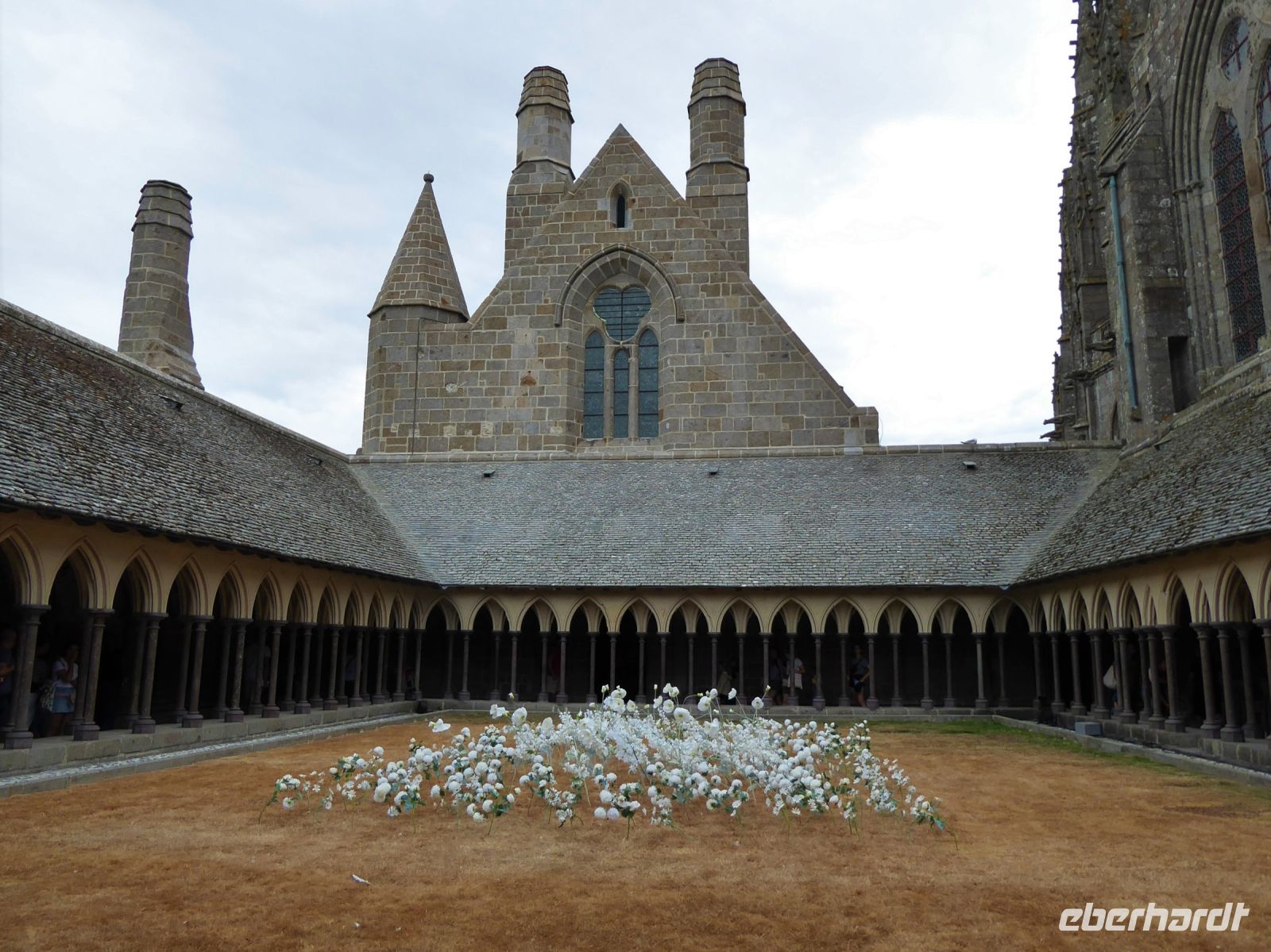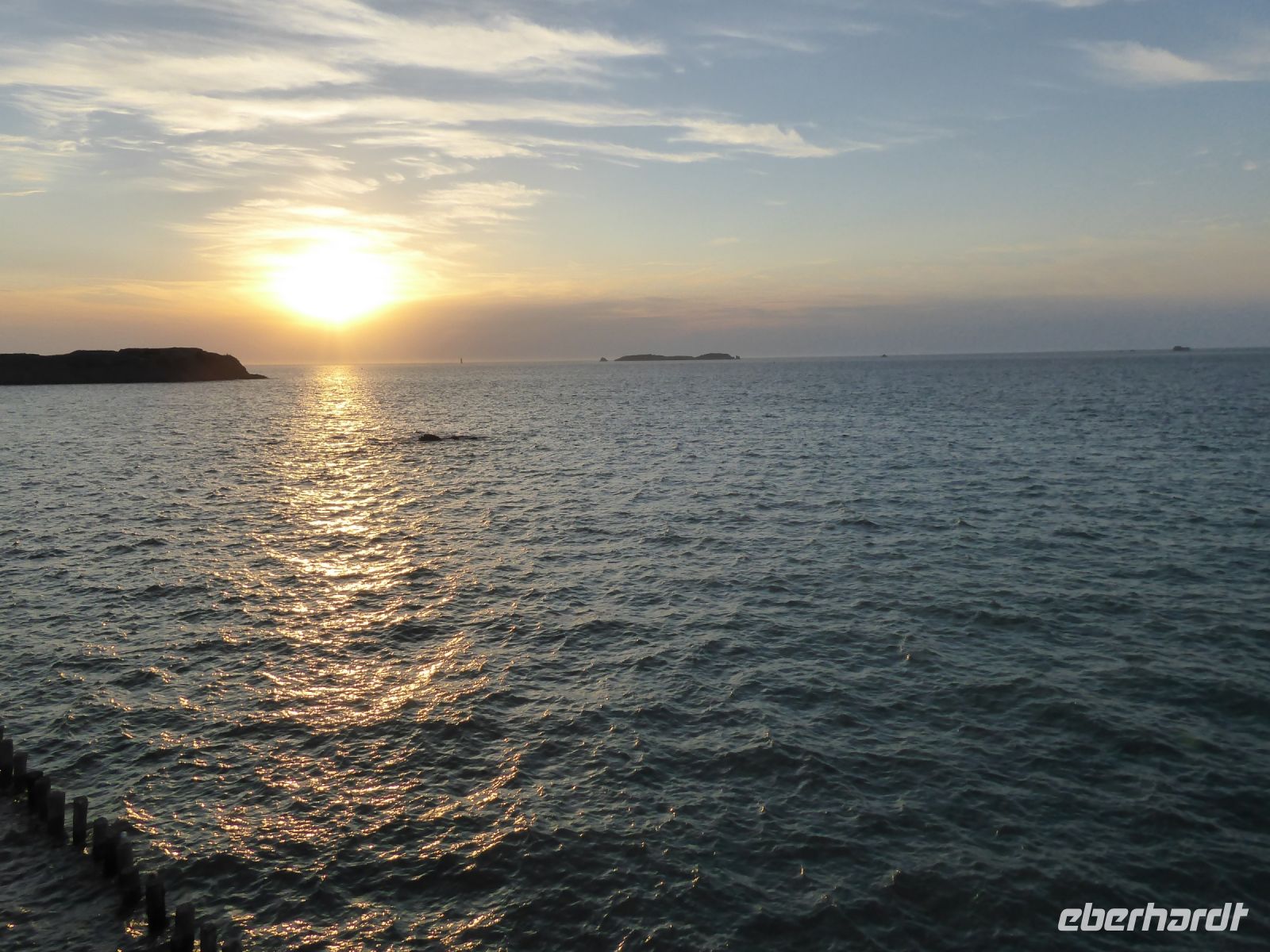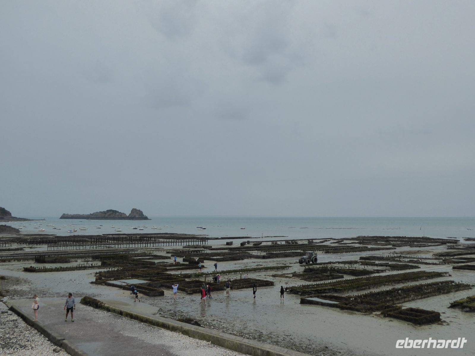 Schon früh am nächsten Morgen machten wir uns auf den berühmten Mont Saint Michel zu besuchen. Nach einer guten Stunde Fahrt erreichten wir den Berg noch vor dem großen Besucheransturm. Seit 1300 Jahren zieht der Inselberg die Menschen in seinen Bann. Jedes Jahr wird der Berg, der seit 1979 UNESCO Weltkulturerbe ist, von drei Millionen Touristen und Pilgern besucht. Bei unserer Ankunft war der Berg tatsächlich noch ganz vom Meerwasser umspült. Viele Jahrzehnte lang wurde die Klosteranlage als gefürchtetes Staatsgefängnis genutzt, bis sich im neunzehnten Jahrhundert Victor Hugo für die Schließung des Gefängnisses einsetzte. Heute ist der Klosterberg das touristische Highlight der Normandie. 286 steinerne Stufen gilt es nach oben zu steigen, um von der Plattform vor der Kirche St. Michel einen grandiosen Blick über das Wattenmeer und die vom Fluss Couesnon in die Regionen Normandie und Bretagne geteilte Landschaft zu werfen. Ausgestattet mit Audioguides wurden wir über die spannende Geschichte des Bergs und seiner Bewohner informiert. Nach und nach füllten sich die Gassen mit einer Flut von Touristen, die sich den Mont St. Michel als Ziel für ihren Sonntagsausflug auserkoren hatten. Nach der Mittagspause verließen wir gemeinsam den heiligen Berg und ließen uns von den bequemen Shuttlebussen zurück zum Parkplatz fahren. Über die Salzwiesen fuhren wir nach Cancale, einem kleinen Ort an der Smaragdküste, der vor allem bei Austernliebhabern einen Namen hat. Nirgends sind die Austern frischer, nirgends bekommt man bessere Austern als in Cancale. Seit dem dreizehnten Jahrhundert werden sie hier gezüchtet. Marktfrisch wird überwiegend die pazifische Felsenauster angeboten und mit etwas Zitrone direkt am Strand verzehrt. Auch die seltene europäische Auster, die Huître plat, die bei Feinschmeckern wegen ihres leicht nussigen Geschmacks gerühmt wird, wird hier auf dem Austernmarkt angeboten. Ausgestattet mit Flaschen gekühlten Weißweins, einem leckeren Chablis, gesellten wir uns zu den anderen Gourmets und schlürften genüsslich direkt am Meer die frischen Austern. Zurück in St. Malò bummelten wir durch die von dicken Mauern umgebene Korsarenstadt. Wir staunten über den perfekten Wiederaufbau der im August 1944 zu 85 % durch anglo-amerikanische Bombardierungen zerstörten Stadt, in der sich die deutschen Besatzer verschanzt hatten und sich weigerten, die Stadt aufzugeben und zu kapitulieren. Heute tummeln sich Touristen in den Gassen, aus allen Lokalen tönt Musik und Lachen- längst ist St. Malò zu einer Hochburg des internationalen Tourismus geworden. Erst spät in der Nacht wird es ruhig und die Wellen des Meeres branden sanft an die hölzernen Wellenbrecher.