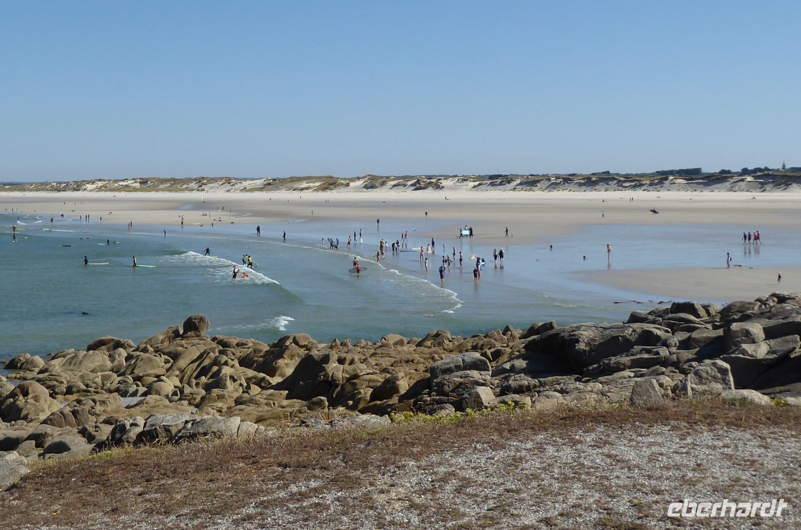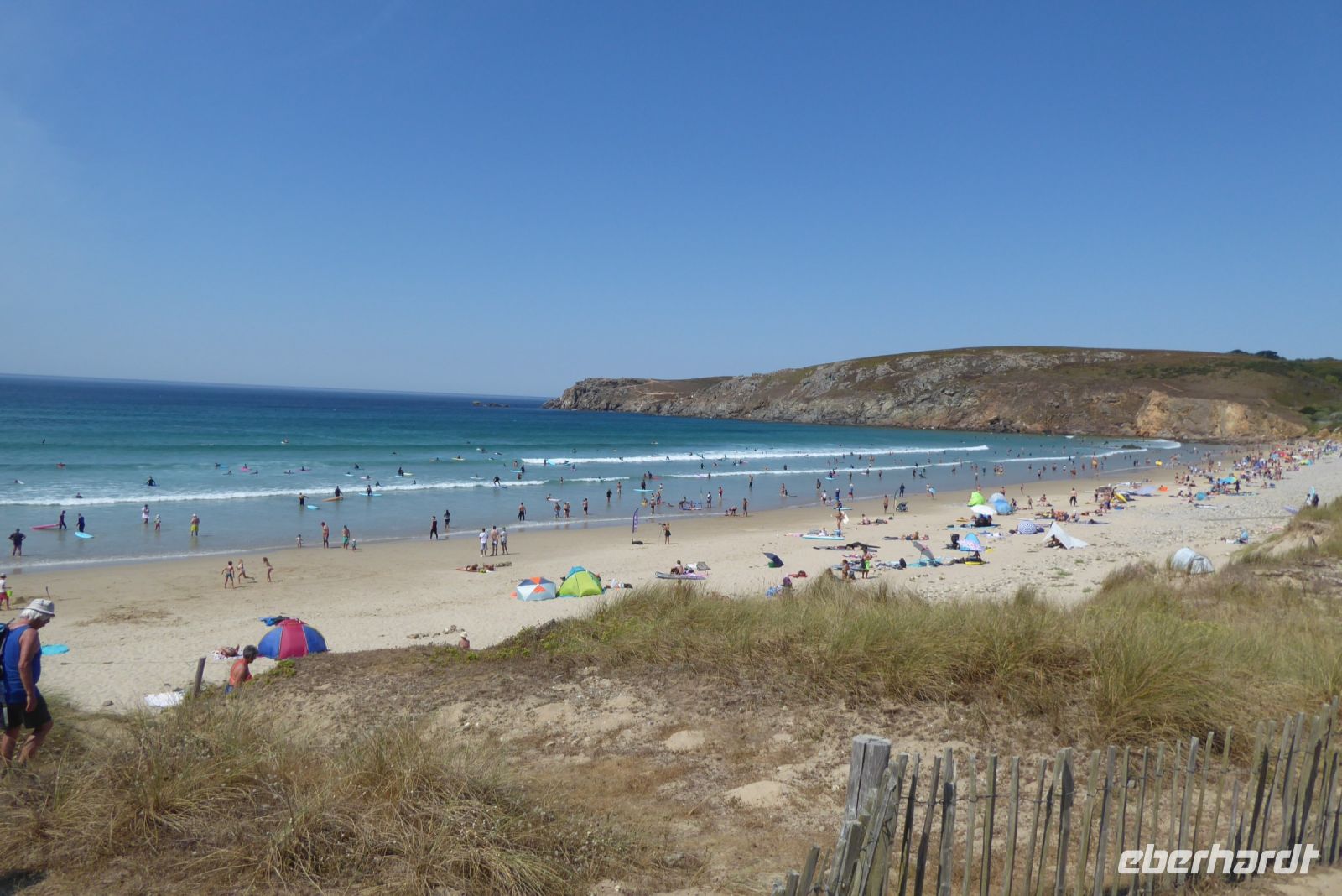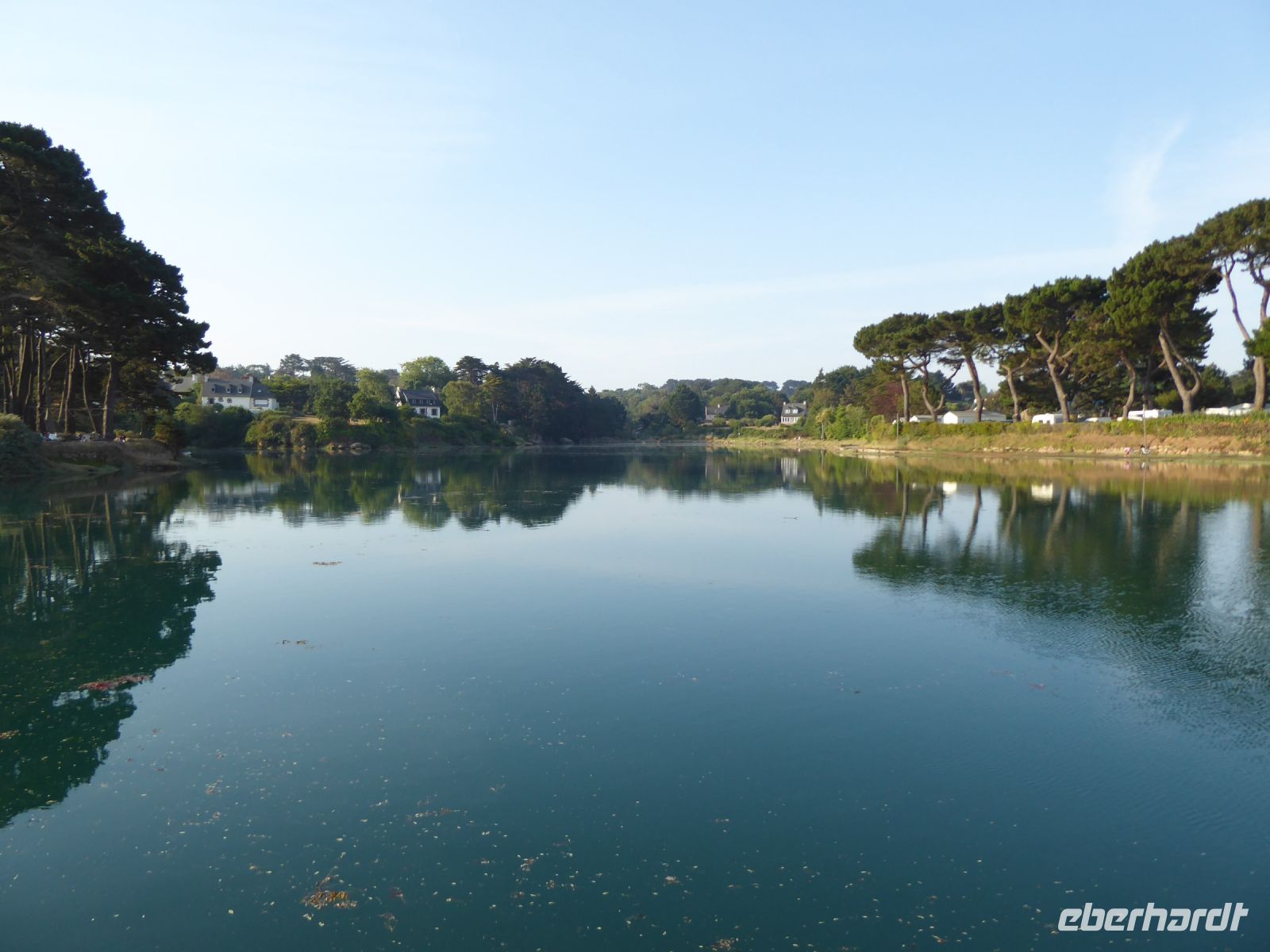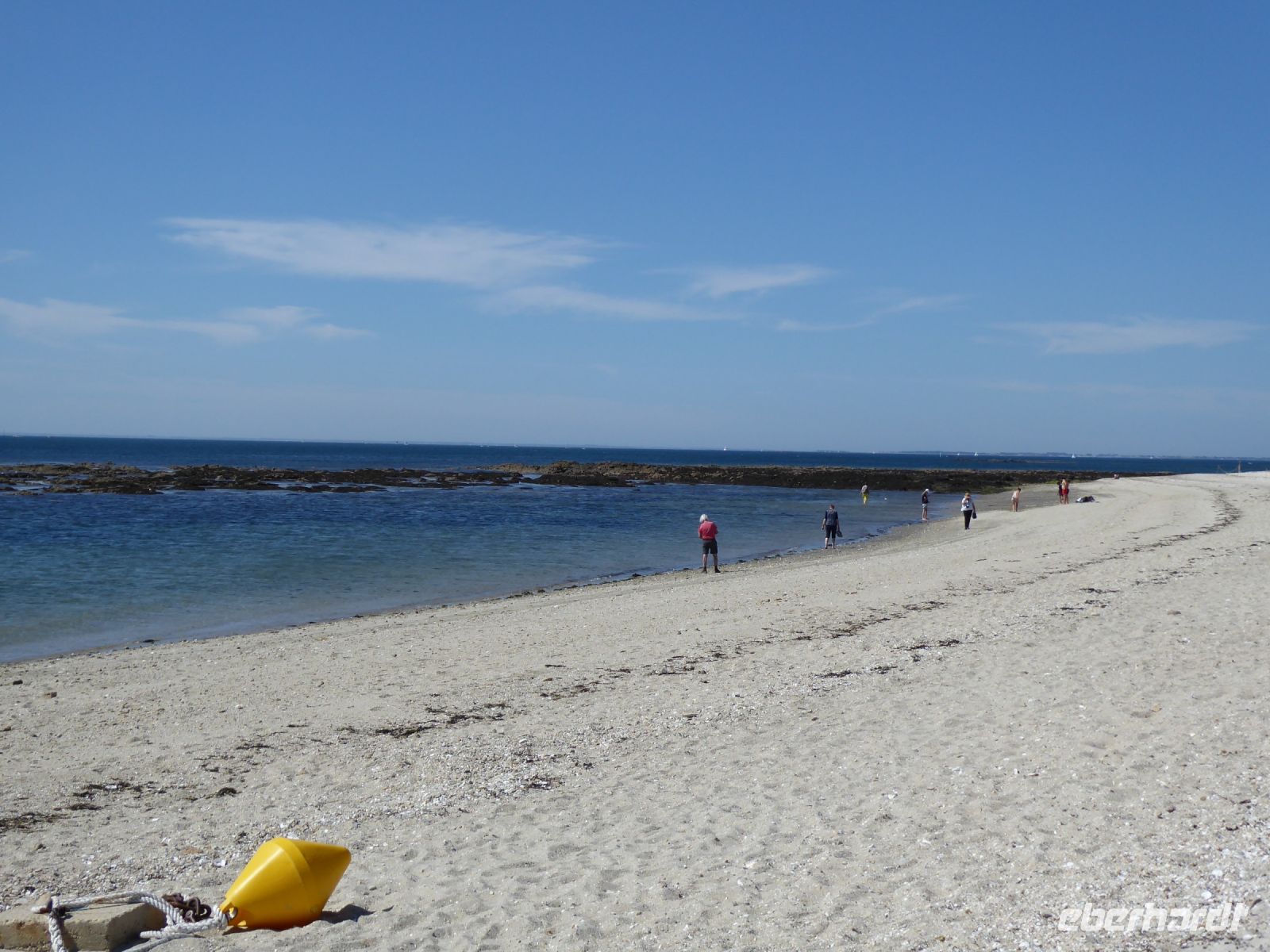 Heute durften wir uns auf einen Tag am Meer freuen und so packten wir Handtuch und Badeanzug mit in den Rucksack. Unsere Wanderung begann an der kleinen Kirche von Tronoen, die gerne die Kathedrale der Dünen genannt wird. Neben ihr steht der älteste Kalvarienberg der Bretagne aus dem fünfzehnten Jahrhundert. Mit über 100 ursprünglich wohl bunt bemalten Figuren wird hier das Leben und Sterben Christi dargestellt. Unsere Wanderung zur Küste führte uns über die Dünen zum Meer und entlang der herrlichen Küste barfuß über den weißen Sand der Baie d´Audierne. Auf der kleinen Landspitze Pointe de la Torche summieren sich die steinernen Relikte der Vergangenheit: ein prähistorischer Dolmen und gleich daneben eine Bunkeranlage aus dem Zweiten Weltkrieg. Am gleichwohl weißen Sandstrand Pors Carn bei Penmarch hüpften wir in das erstaunlich kalte Meer, das bei aufkommende Flut wunderschöne Wellen bis weit an den Strand brachte und uns im flachen wärmeren Wasser angenehm umspülte. Nach der Erfrischung stiefelten wir weiter bis St. Guenolé, wo bizarre Felsformationen im smaragdblauen Wasser der Cournailleküste um die Gunst der Betrachter wetteifern. Nach gut elf Wanderkilometer beendeten wir dort unseren Tag am Strand in einem der kleinen Cafés und ließen uns vom Bus abholen. Die Temperaturen stiegen am Nachmittag auf 35° an und wir hielten unseren Besuch in Concarneau entsprechend kurz, war doch auch die berühmte Ville Close, die Seefeste, mit Scharen bunter Menschen überfüllt. Concarneau war in Feierlaune, la Fête des Filets bleus, das traditionelle bretonische Volksfest, zieht seit weit über hundert Jahren Bretonen und Touristen in seinen Bann. Doch für einen Espresso im, bei Krimifans berühmten, Lokal ´L´Amiral` musste die Zeit noch reichen! Zum Abendessen waren wir in der kleinen Crêperie ´Les Arcades´ eingeladen, wo uns Fabienne und ihr Team mit leckeren Galettes complètes, Crêpes suzettes und frischem Cidre bewirteten. Gemütlich schlenderten wir danach zurück zum Hotel und genossen die laue Luft der blauen Stunde.