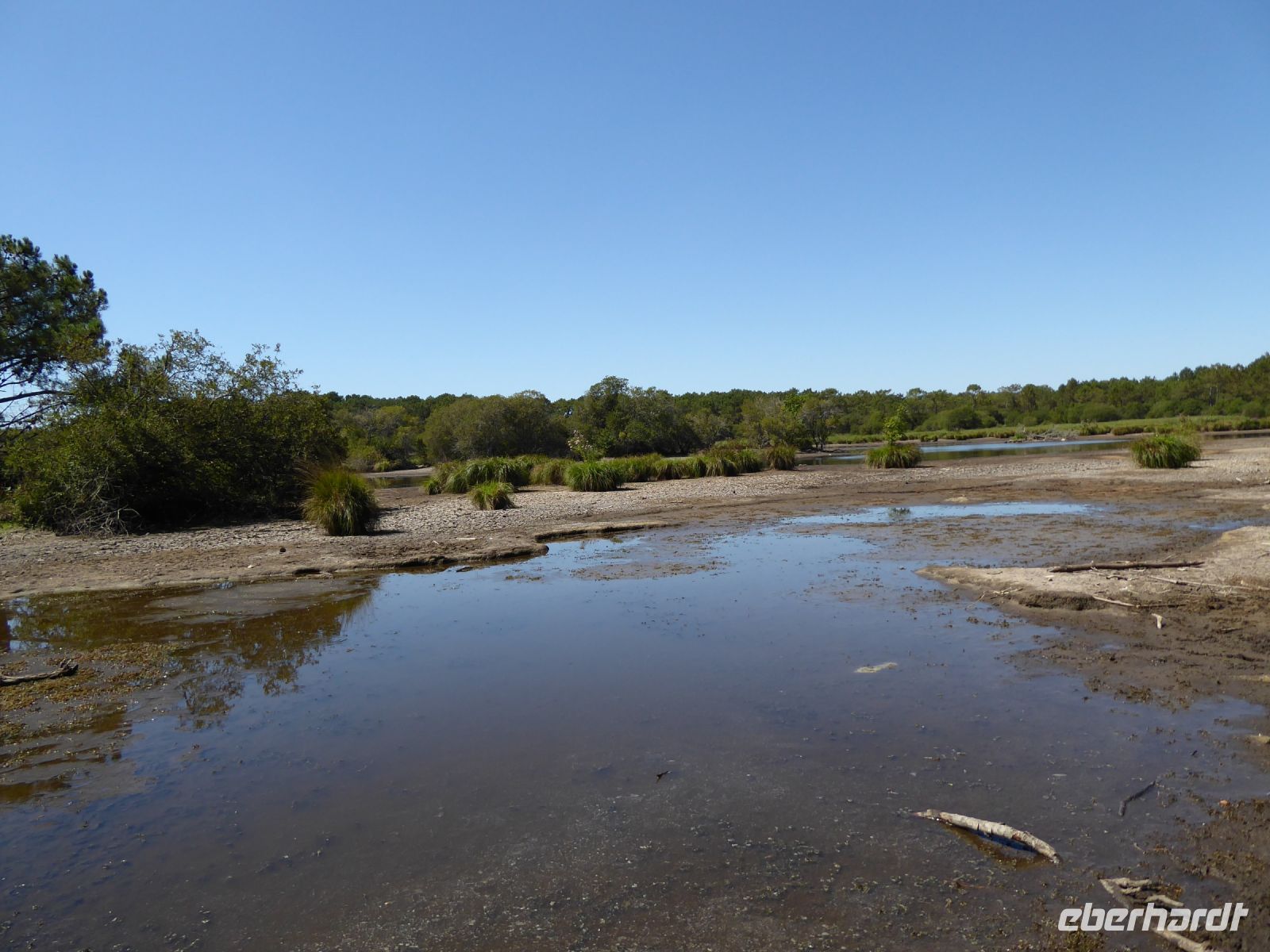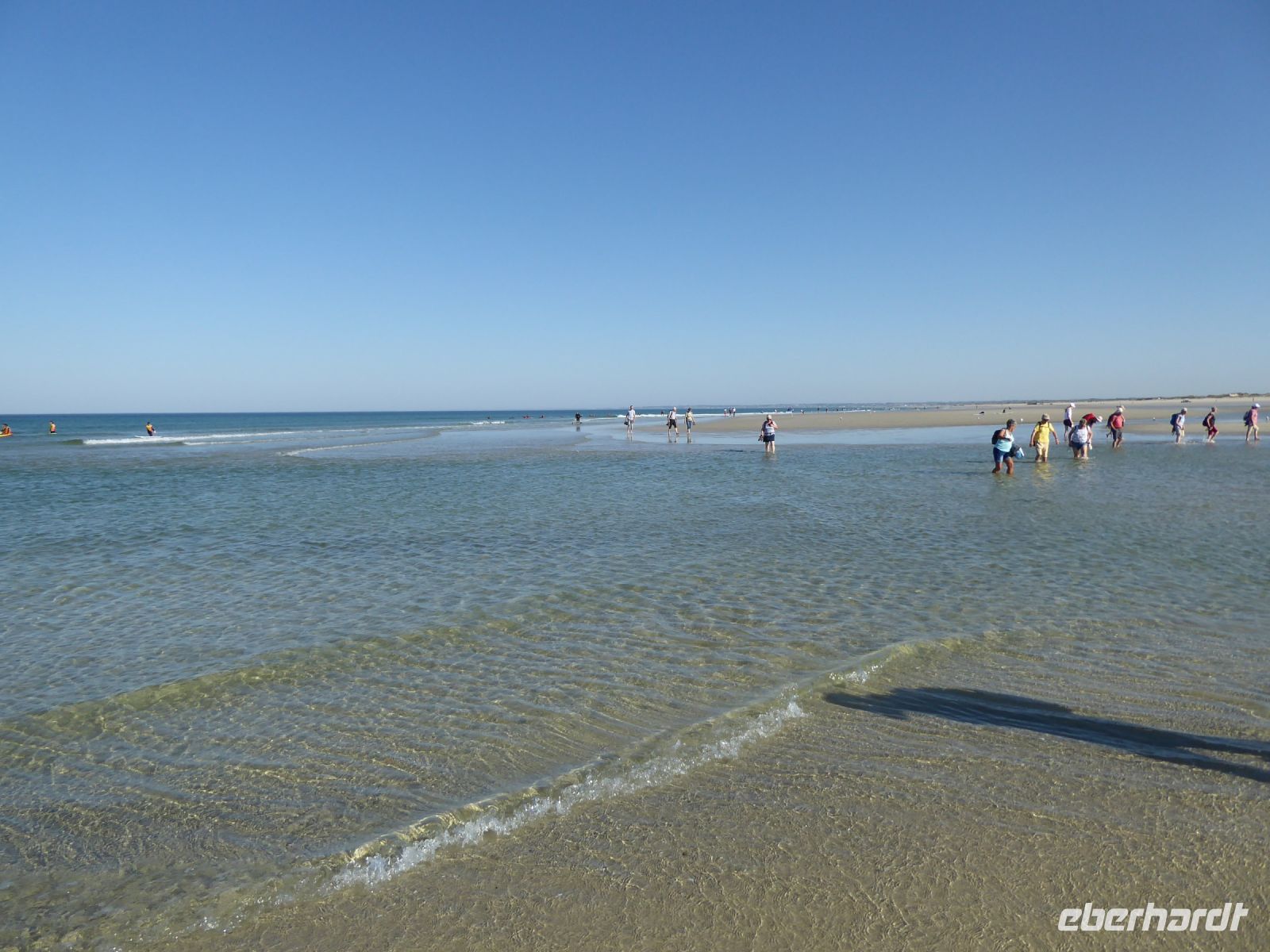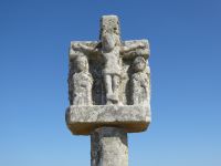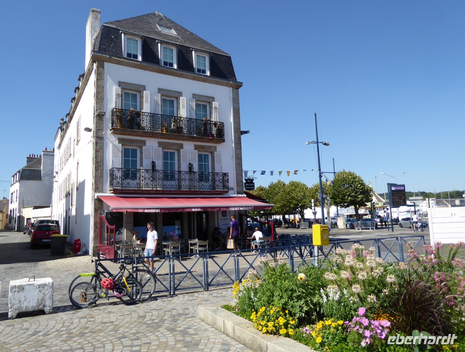 Heute durften wir uns auf einen Tag am Meer freuen und so packten wir Handtuch und Badeanzug mit in den Rucksack. Unsere Wanderung begann an der kleinen Kirche von Tronoen, die gerne die Kathedrale der Dünen genannt wird. Neben ihr steht der älteste Kalvarienberg der Bretagne aus dem fünfzehnten Jahrhundert. Mit über 100 ursprünglich wohl bunt bemalten Figuren wird hier das Leben und Sterben Christi dargestellt. Unsere Wanderung zur Küste führte uns über die Dünen zum Meer und entlang der herrlichen Küste barfuß über den weißen Sand der Baie d´Audierne. Auf der kleinen Landspitze Pointe de la Torche summieren sich die steinernen Relikte der Vergangenheit: ein prähistorischer Dolmen und gleich daneben eine Bunkeranlage aus dem Zweiten Weltkrieg. Am gleichwohl weißen Sandstrand Pors Carn bei Penmarch hüpften wir in das erstaunlich kalte Meer, das bei aufkommende Flut wunderschöne Wellen bis weit an den Strand brachte und uns im flachen wärmeren Wasser angenehm umspülte. Nach der Erfrischung stiefelten wir weiter bis St. Guenolé, wo bizarre Felsformationen im smaragdblauen Wasser der Cournailleküste um die Gunst der Betrachter wetteifern. Nach gut elf Wanderkilometer beendeten wir dort unseren Tag am Strand in einem der kleinen Cafés und ließen uns vom Bus abholen. Die Temperaturen stiegen am Nachmittag auf 35° an und wir hielten unseren Besuch in Concarneau entsprechend kurz, war doch auch die berühmte Ville Close, die Seefeste, mit Scharen bunter Menschen überfüllt. Concarneau war in Feierlaune, la Fête des Filets bleus, das traditionelle bretonische Volksfest, zieht seit weit über hundert Jahren Bretonen und Touristen in seinen Bann. Doch für einen Espresso im, bei Krimifans berühmten, Lokal ´L´Amiral` musste die Zeit noch reichen! Zum Abendessen waren wir in der kleinen Crêperie ´Les Arcades´ eingeladen, wo uns Fabienne und ihr Team mit leckeren Galettes complètes, Crêpes suzettes und frischem Cidre bewirteten. Gemütlich schlenderten wir danach zurück zum Hotel und genossen die laue Luft der blauen Stunde.