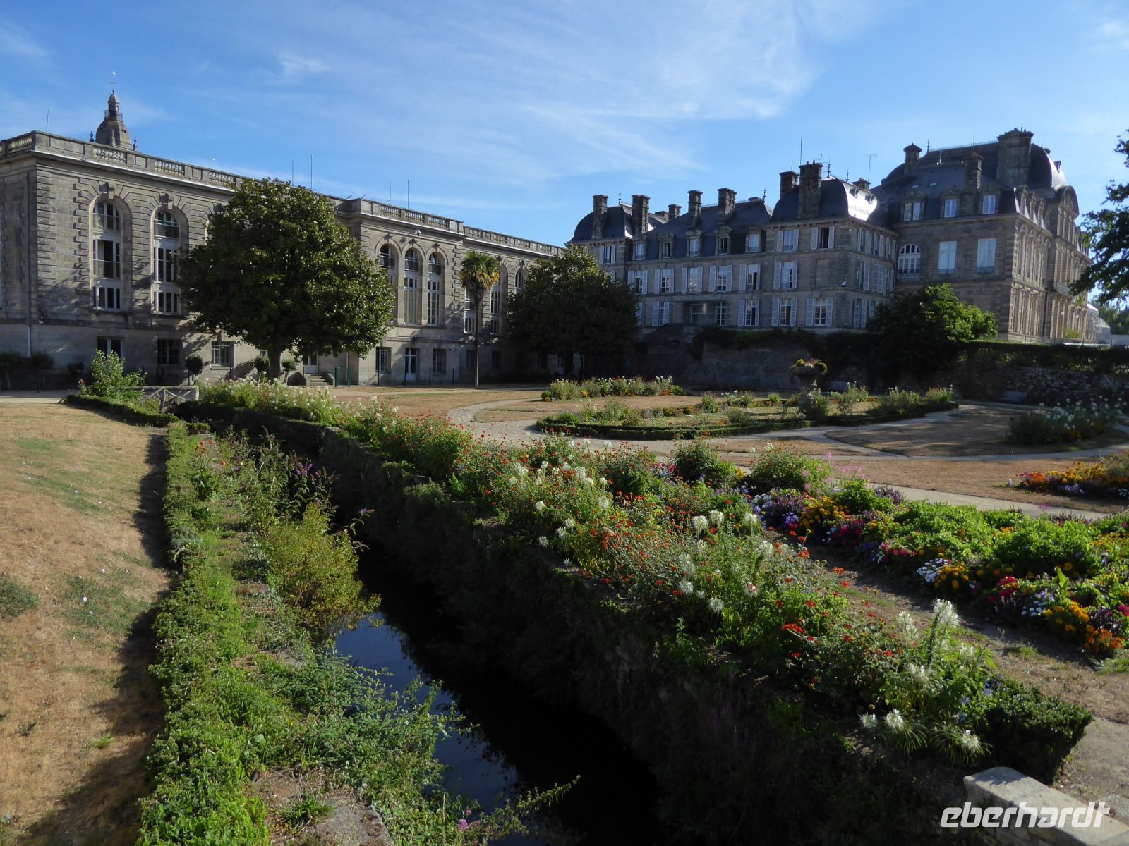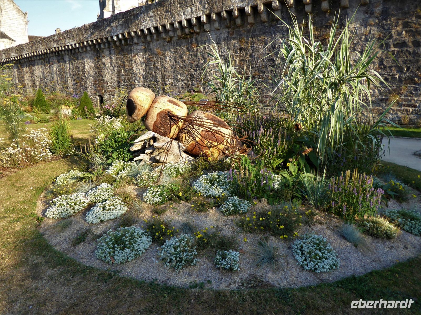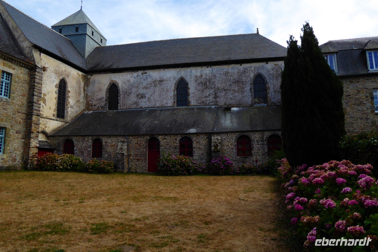 Wieder schien die Sonne vom strahlend blauen Himmel, als uns unsere Stadtführerin Kristin, eine waschechte Bretonin am Hotel abholte. Vorbei am beeindruckenden Rathaus von Vannes streiften wir durch die Gassen der Stadt zur Kathedrale. Die Kathedrale ist mit 110 Metern Länge eine der längsten gotischen Kathedralen in der Bretagne, die in ihrem fast 1000-jährigen Bestehen viele Veränderungen erfahren hat. In ihrem Inneren befindet sich das Grabmal des 1419 hier verstorbenen Dominikanermönch und Wanderprediger aus Valencia, Vincent Ferrer. Er begeisterte die Menschen seiner Zeit durch seine persönliche Ausstrahlung und einfache Lebensführung sowie die Ankündigung eines bevorstehenden Weltunterganges. Vor sechs Jahrhunderten Heilig gesprochen, ist er ein idealer Reisebegleiter: zuständig für reiche Ernte und guten Wein, der bei Fieber, Kopfschmerzen, Besessenheit und Gefahren aller Art angerufen wird. Über die Place des Lices, dem ehemaligen Turnierplatz, erreichten wir das untere Stadttor. Wir spazierten vorbei am Château de l´ Hermine und dem alten Waschhaus am Flüsschen Marle. Wir bewunderten die schönen französischen Gartenanlagen mit ihrer barocken Blütenpracht vor dem Schloss und entlang der mittelalterlichen Wehrmauer. Die kurzweilige Führung mit Kristin endete am Monoprix, wo wir uns mit Proviant und Getränken für unsere erste Wanderung am Nachmittag versorgten. Unser Bus brachte uns danach in das waldreiche Binnenland der Bretagne: Der Wald von Paimpont ist der Überrest eines riesigen, zusammenhängenden Waldgebietes, das einst das gesamte Landesinnere der Halbinsel bedeckte. Der Legendenname dieses Waldes lautet Brocéliande und soll der Schauplatz vieler Begebenheiten aus der Sagenwelt von König Artus und seiner Tafelrunde sein. Unser erster Spaziergang führte uns an die magische Quelle von Barenton, die der Trockenheit der letzten Wochen geschuldet, nur mäßig sprudelte. Und weder Merlin noch Viviane kreuzten unseren von Heidekraut und gelbem Stachelginster gesäumten Weg. Im lichten Wald machten wir eine kleine Pause, um uns miteinander bekannt zu machen. Gespannt auf die kommenden Tage setzten wir unseren Spaziergang fort. Nach einer Mittagspause am überdachten Marktplatz der kleinen Gemeinde Tréhorenteuc und der Besichtigung der Dorfkirche, machten wir uns auf ins Tal ohne Wiederkehr. Der goldene Baum, ein Kunstobjekt des französischen Bildhauers François Davin aus dem Jahre 1991, war von mehreren Schulklassen umlagert und so wanderten wir gleich weiter durch das Tal und hinauf auf das Hochplateau, von dem wir einen wunderschönen Ausblick über das unberührt scheinende Waldgebiet genossen. Da wir unsere erste Wanderung den außergewöhnlich hohen Temperaturen angepasst hatten, nutzten wir die gewonnene Zeit und stattete noch dem wenige Kilometer entfernt an einem See gelegenen Kloster von Paimpont einen kurzen Besuch ab.