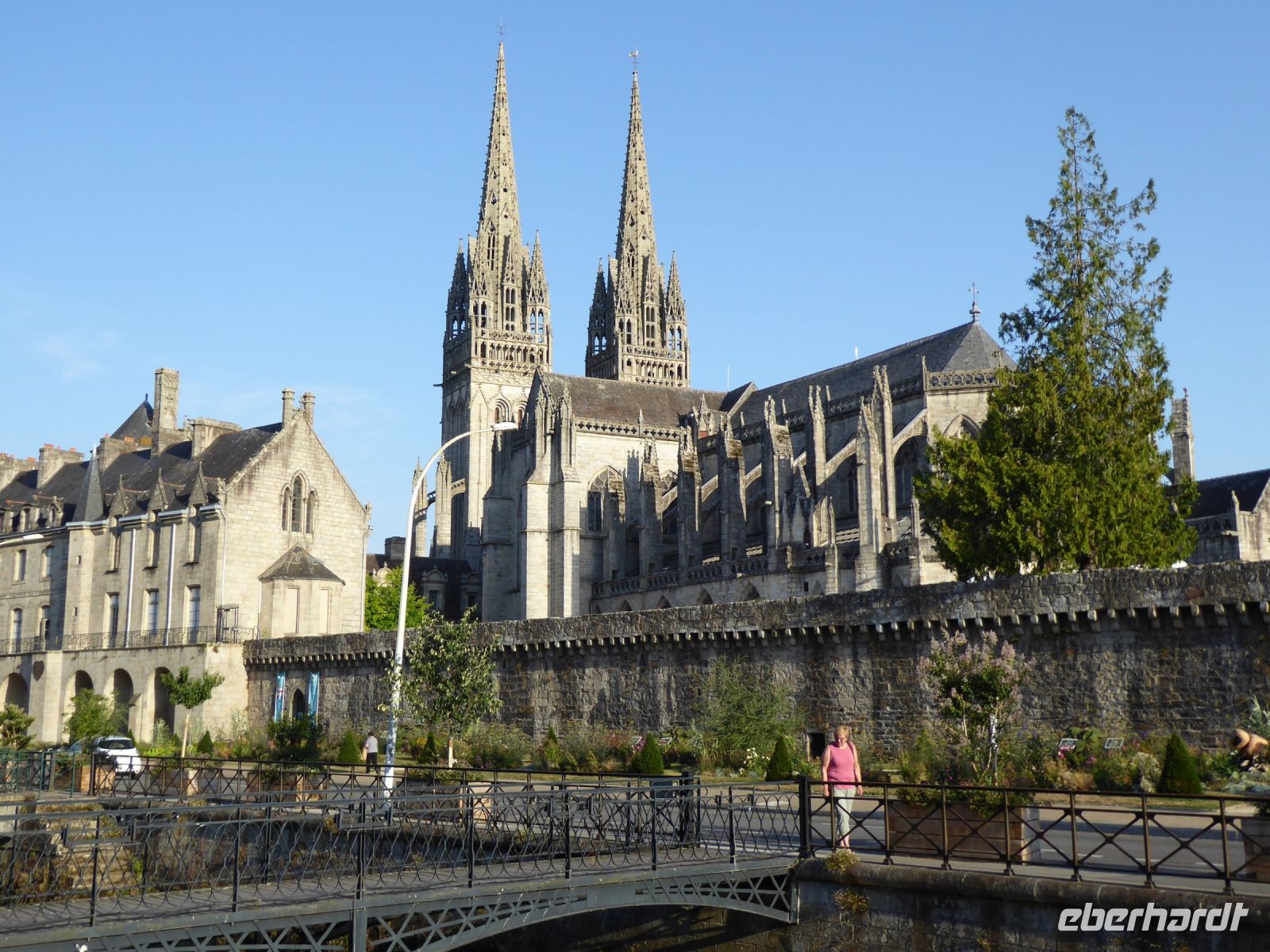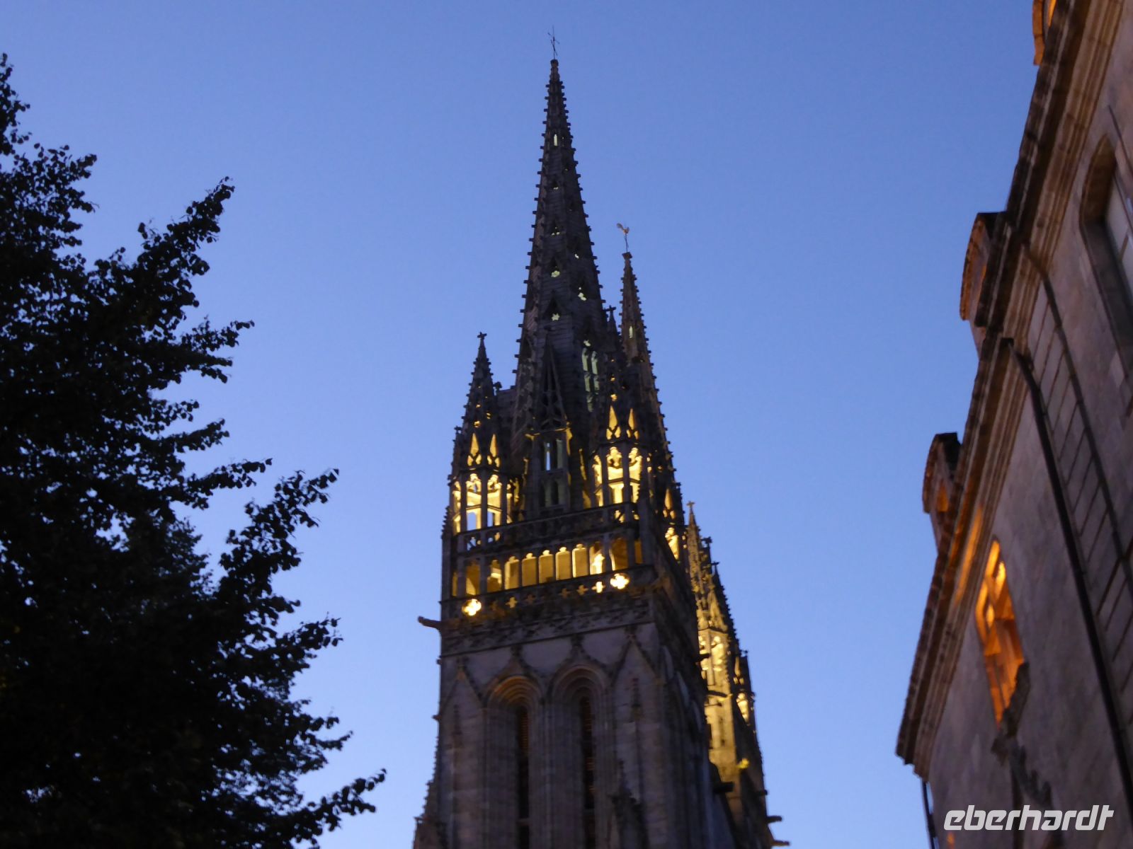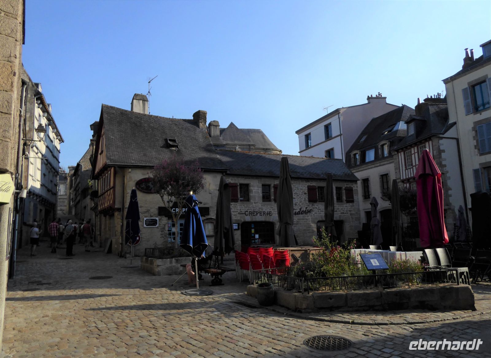 Unsere gepackten Koffer durften noch etwas im Hotel bleiben, da wir noch ein Rendezvous mit Yolande, unserer Stadtführerin in Quimper hatten. Ähnlich wie Rom liegt die Stadt Quimper auf sieben Hügeln. Drei Flüsse treffen hier aufeinander und bis zum Meer sind es nur wenige Kilometer. Die Hauptstadt der historischen Landschaft Cornouaille hat eine malerische Altstadt, deren Häuser zum Teil noch aus dem Mittelalter stammen. Weithin sichtbar überragen die Spitztürme der Kathedrale Saint Corentin die Stadt. Das Bauwerk, im Stil der bretonischen Gotik errichtet, wurde erst 600 Jahre nach der Grundsteinlegung mit dem Bau der beiden Kirchturmspitzen vollendet. Die Besonderheit dieser Kirche ist der vermeintlich grundlos nach links abknickende Chor. Ein weiteres Rätsel aus der Geschichte, das bis heute nicht vollständig gelöst wurde. Yolande würzte uns die Geschichte der Stadt mit vielen Details und lustigen persönlichen Anekdoten. Die Zeit eilte schnell vorüber und nach einer kleinen Shoppingstour im Anschluss an die Führung verließen wir Quimper und fuhren weiter Richtung Norden an die rosa Granitküste. Eine kleine Programmänderung beschied uns eine verspätete Mittagspause in Lannion. Die kleine Stadt liegt am neun Kilometer langen Mündungstrichter des Léguer, der sogar hier noch mitten in der Stadt das Spiel der Gezeiten sichtbar werden lässt. Wir fanden ein gemütliches Plätzchen an den Ufern des Flusses und genossen in gechillter Atmosphäre unter großen Sonnensegeln eine bretonische Wurst mit Pommes und Cidre, bevor wir noch einen kurzen Blick auf den hübschen, dicht mit alten Fachwerkhäusern bestandenen Marktplatz warfen. Von hier trennten uns nur noch wenige Kilometer vom Meer. In Trégastel spazierten wir gemütlich um die Halbinsel Renote, die mit bizarren Felsformationen, wunderschönen Anwesen und einem herrlichen Strand punktet. Inmitten der Jahrmillionen alten Steine gönnten wir uns einen erfrischenden Umtrunk mit süßem Cidre und leckeren bretonischen Keksen. Bei unserem weiteren Spaziergang hatten wir schöne Ausblicke auf die umgebenden Inseln, darunter auch auf die Insel Crostaèrés. Das neogotische Schloss auf der kleinen Insel wurde von dem polnischen Mathematiker und Erfinder Bruno Abdank-Abakanowicz Ende des neunzehnten Jahrhunderts erbaut. Ihn verband eine langjährige Freundschaft mit Henryk Sienkiewicz, der seinen Roman ´Quo vadis` hier verfasste. Die Insel mitsamt dem Schloss ist heute im Besitz des deutschen Schauspielers und Kabarettisten Dieter Hallervorden. Zurück in Lannion besuchten wir noch die Whisky Destillerie Warenghem die seit fünfunddreißig Jahren in der Bretagne Whisky herstellt. Die edlen Brände haben längst einen festen Platz in der Branche und genießen bei Kennern einen guten Ruf. Eingedeckt mit einem Probiersortiment dreier verschiedener Whiskysorten, verließen wir den doch stark kommerzialisierten Betrieb und kamen zeitig in unserem Gartenhotel am Rande von Lannion an.