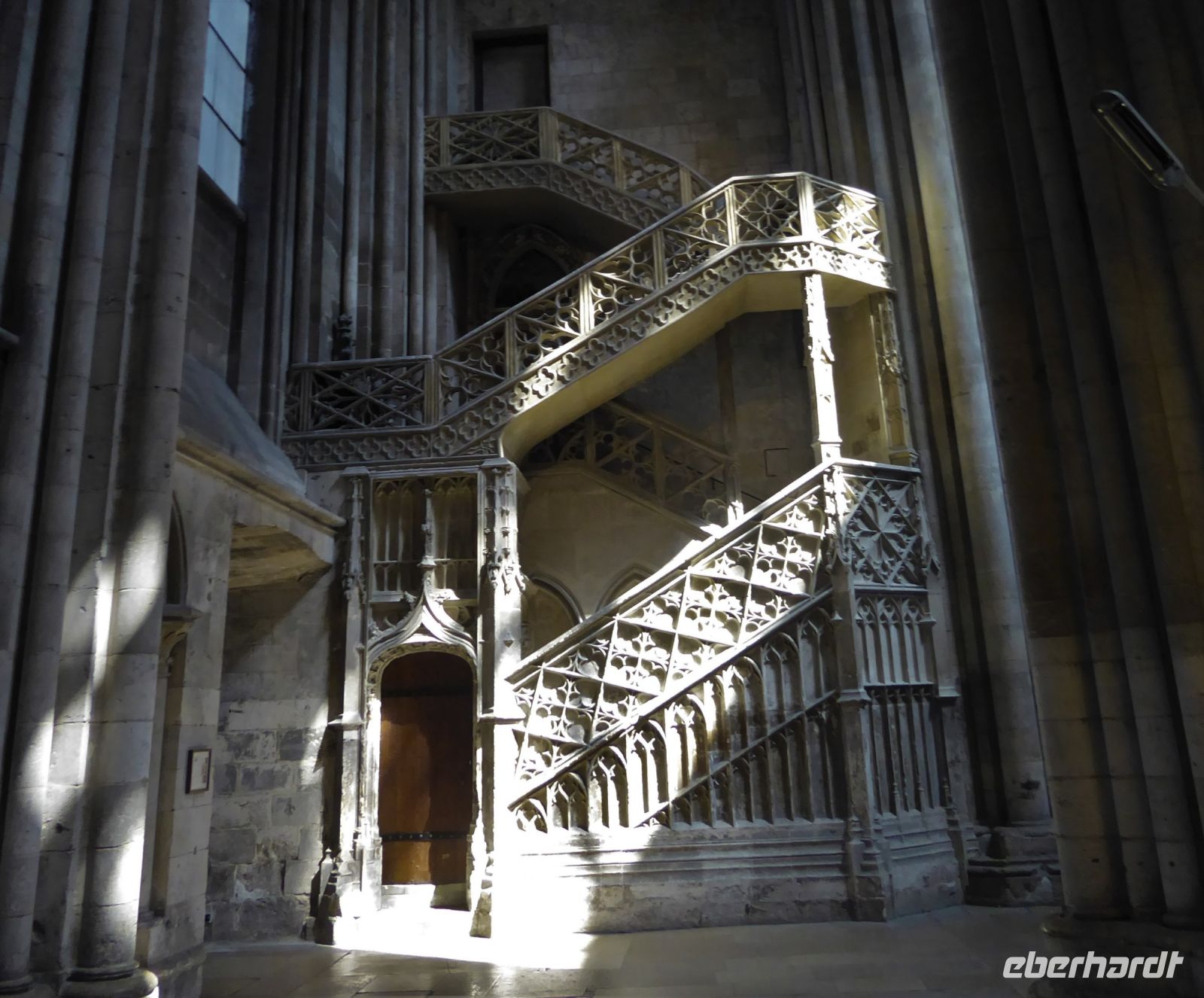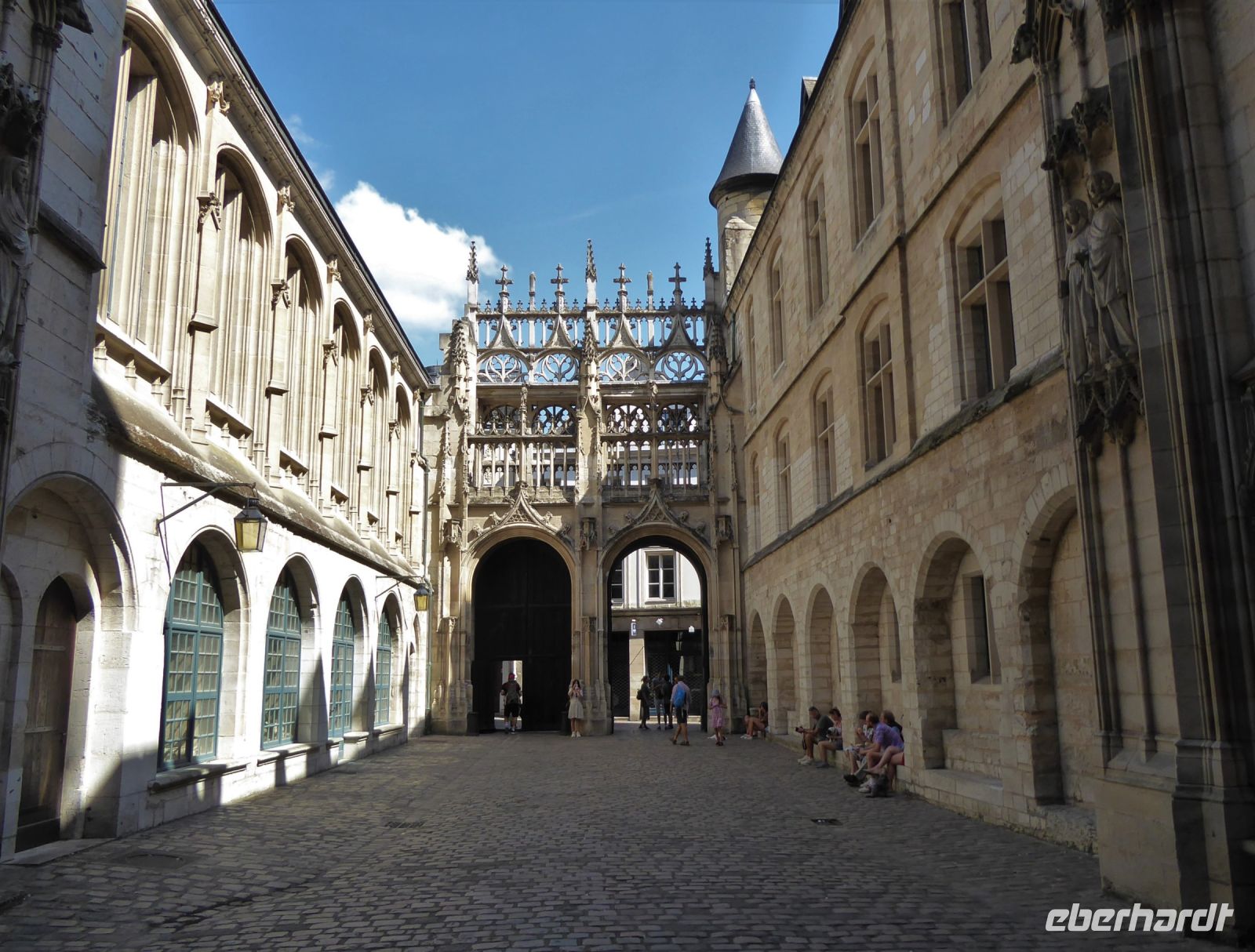 Am nächsten Morgen hieß es Abschied nehmen von der Bretagne, dem Meer und der Küste. Die erste Zwischenstation unserer Rückreise war die an der oberen Seine gelegene Stadt Rouen. Die Kathedrale Nôtre-Dame mit ihren beiden Türmen der Westfassade steht auf den Grundmauern eines romanischen Vorgängerbaus. Der sogenannte Butterturm ist eines der schönsten Beispiele für die Kunstfertigkeit der Bauleute der Hochgotik. Er ragt 75 Meter in den Himmel. Der Maler Claude Monet war fasziniert von der Fassade, die er in einem dreiunddreißig Gemälde umfassenden Bilderzyklus festgehalten hat. Mit dem Fotoapparat ist es längst nicht so einfach, das gesamte Bauwerk in einem Bild festzuhalten. Die Kirche St. Maclou und das dazugehörige Hospital, der sogenannte Pesthof, liegt hinter der Kathedrale. Dort, in einer der engen Gassen, wohnten Jean-Paul Sartre und Simon de Beauvoir. Bei unserer kompakten Stadtführung kamen wir vorbei am Justizpalast, einem prachtvollen gotischen Profanbau und dem Uhrturm mit seiner astronomischen Uhr aus dem vierzehnten Jahrhundert, bevor wir den alten Markt erreichten. Dort ist der Platz, an dem die junge Jeanne d´Arc aus Lothringen im Jahre 1431 den Flammentod erleiden musste. Die moderne Kirche, an dem von Fachwerkhäusern bestandenen Marktplatz, ist dieser jungen und mutigen Frau, deren Visionen und Taten den 100-jährigen Krieg beendeten, geweiht. Am frühen Abend erreichten wir Reims in der Champagne. Das zentral gelegene vier Sterne Hotel Univers bot allen Komfort für die Zwischenübernachtung, inklusive der in der Bretagne so schmerzlich vermissten Klimaanlagen. Das Abendessen entsprach den gehobenen Ansprüchen der französischen Küche, das filet mignon war ein Genuss! Nach dem Essen trafen wir uns zu einem kleinen Abendspaziergang durch die nächtliche Stadt und bummelten, vorbei am römischen Erbe, den Prachtbauten der französischen Königszeit und den modernen Gebäuden aus den zwanziger Jahren des vergangenen Jahrhunderts, zur Kathedrale Nôtre-Dame. Vor dem gewaltigen Portal gab ein auf der Durchreise befindliches Orchester ein kleines Konzert zur Aufbesserung seiner Urlaubskasse. Gebannt lauschten wir den Darbietungen und die fröhlichen Melodien eines Wiener Walzers begleiteten uns in die Nacht.