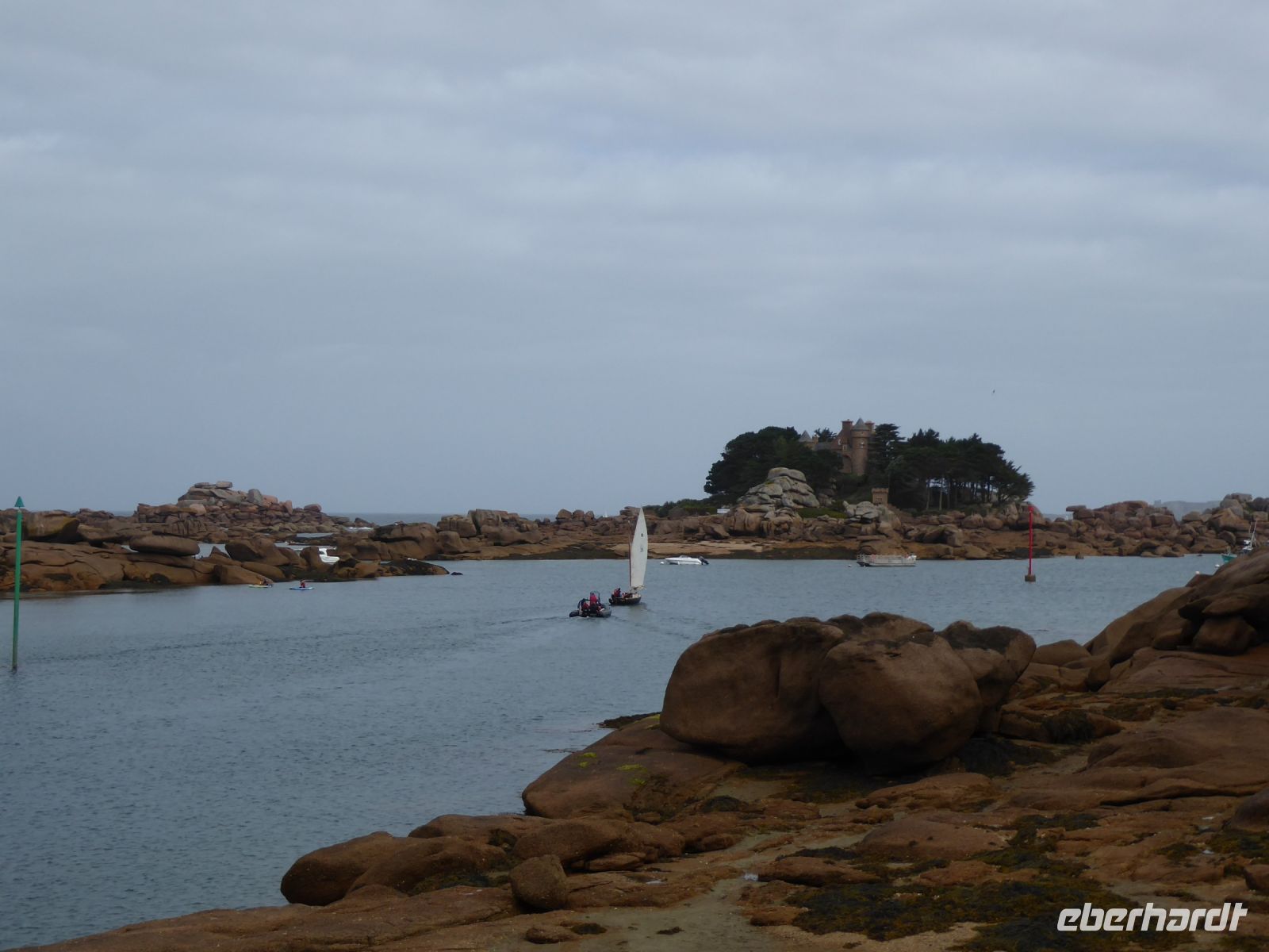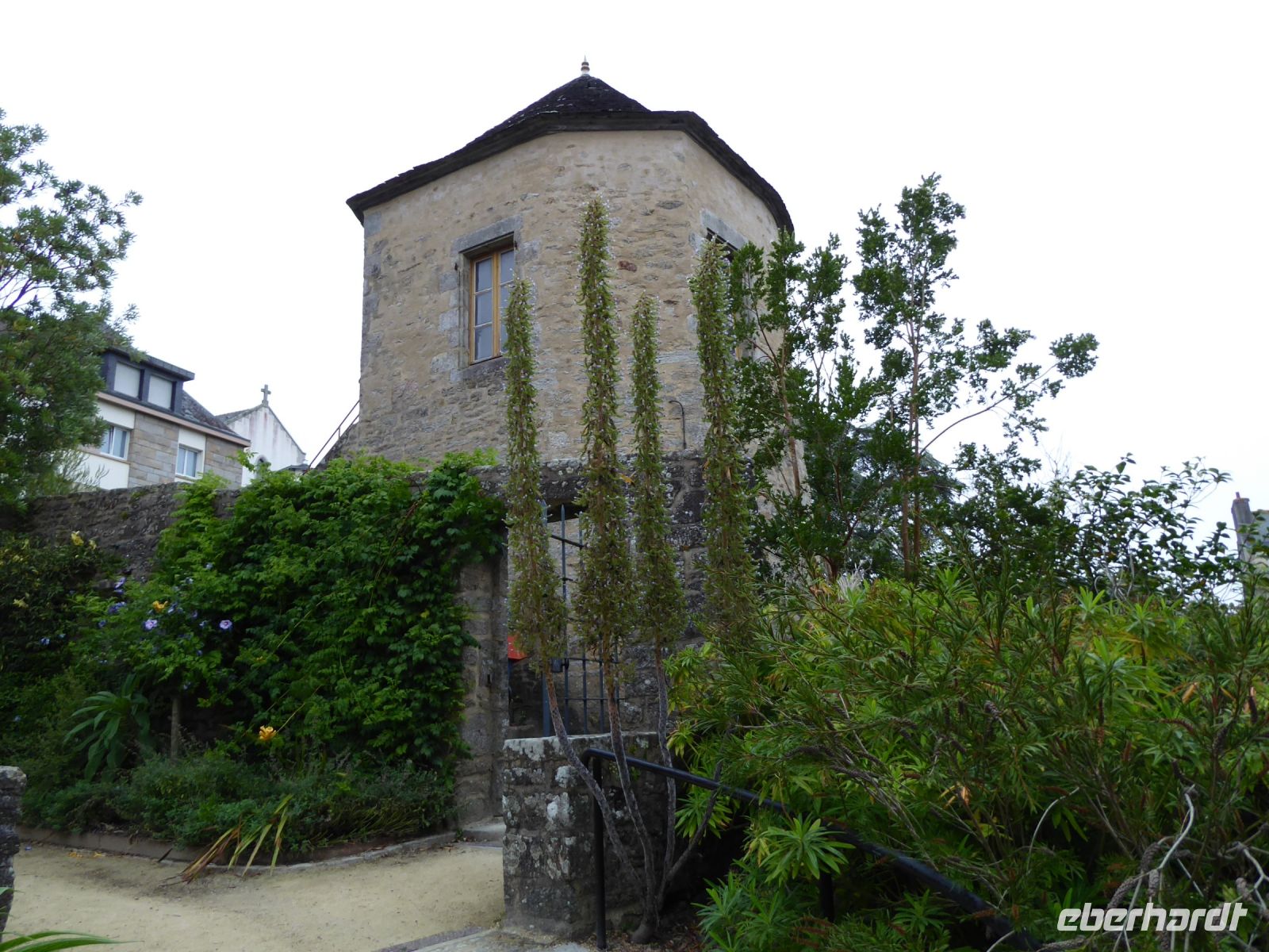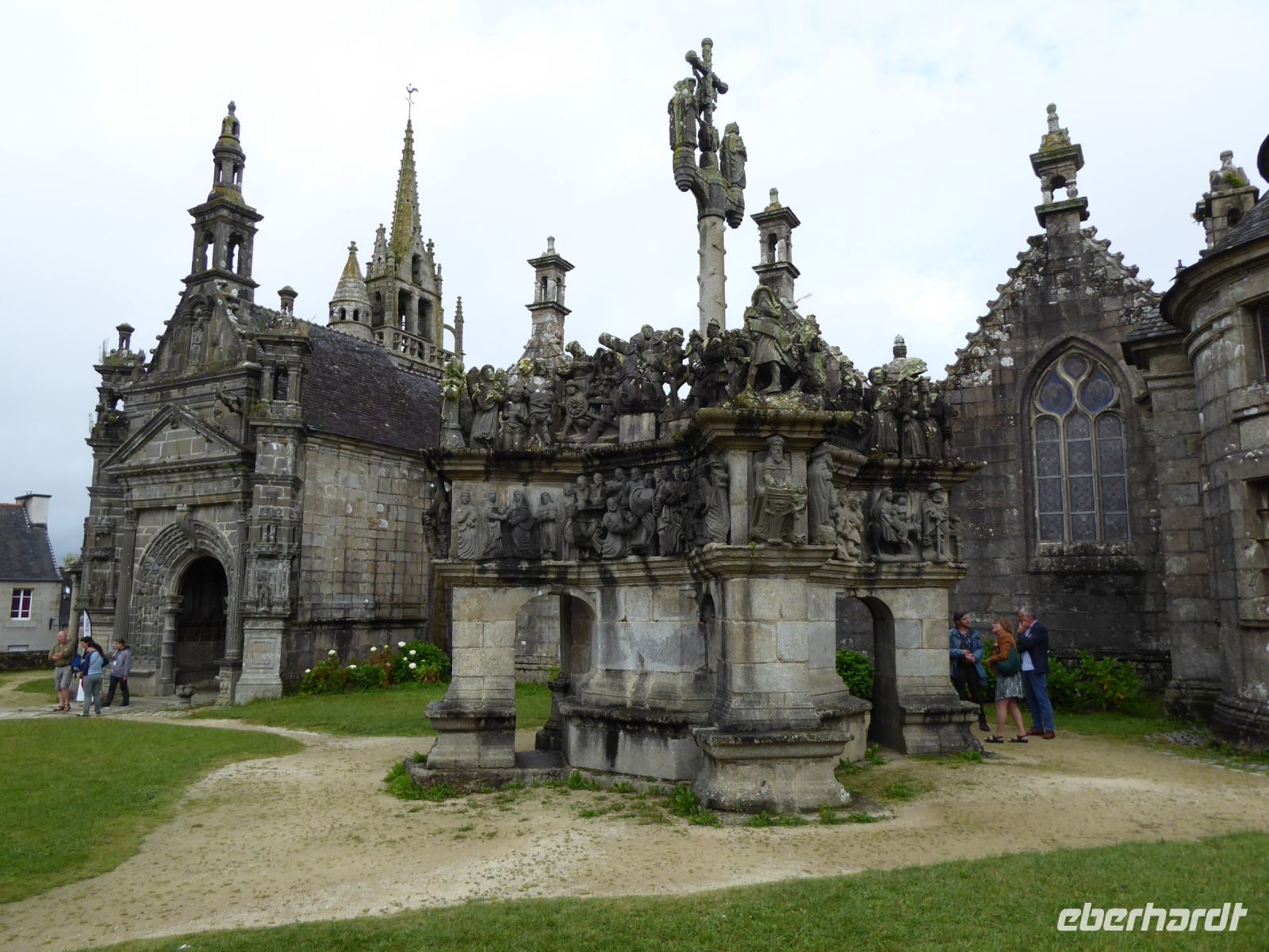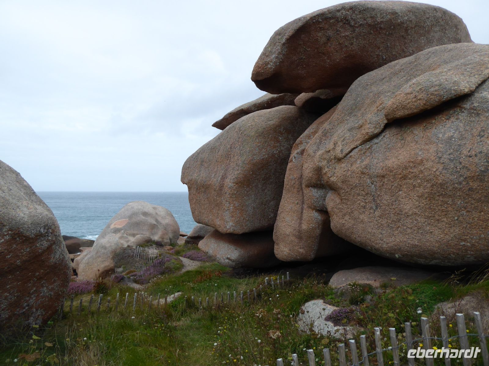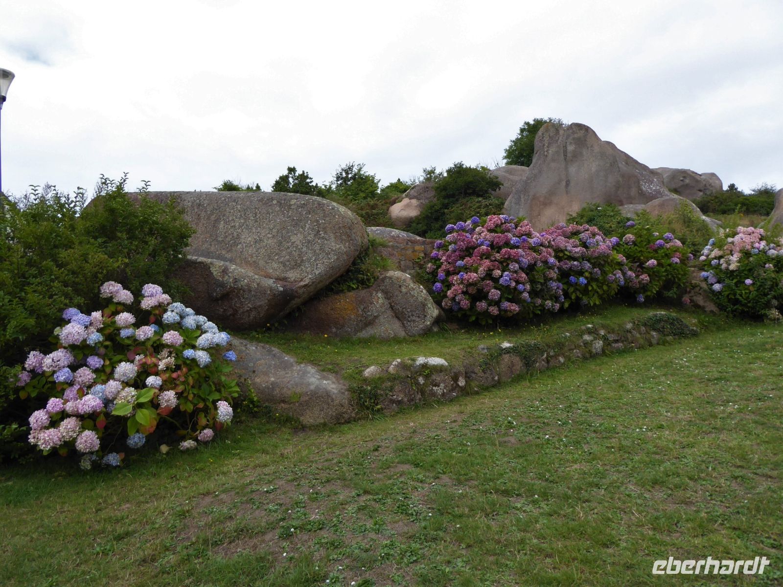 Vor unserer Weiterreise wollten wir uns heute noch Quimper genauer ansehen und gingen entlang der Odet zur Kathedrale Sankt Corentin, wo wir mit unserer Stadtführerin Yolande verabredet waren. Nach einem kurzen Blick in das Innere des Kirchengebäudes, mit seinem eigentümlich geknickten Chor und den wunderschönen Glasfenstern aller Epochen widmeten wir uns erst der Baugeschichte des imposanten Bauwerkes, die über sechs Jahrhunderte andauerte. Das nachhaltige Handeln des Heiligen Sankt Corentin, der jeden Tag nur einen Teil seiner Mahlzeit verspeiste und die Reste dem Meer wieder zurückgab, erstaunte uns schon am Vorabend bei unserem Bummel durch die Stadt. Ähnlich wie Rom liegt Quimper auf sieben Hügeln. Drei Flüsse treffen sich hier und bis zum Meer sind es nur wenige Kilometer. Quimper ist die Hauptstadt der Cornouaille. Yolande würzte uns die Geschichte der Stadt mit vielen Details und lustigen persönlichen Anekdoten. Wir waren auch in diesem Jahr ihre erste deutsche Reisegruppe! Unser Stadtspaziergang führte uns zuerst zum Garten des Friedens, einer wunderschönen Parkanlage mit mediterranem Bewuchs. Leider begann es zu regnen und so machten wir uns flugs auf in Richtung Markthalle. Unter der hölzernen Konstruktion, die auch an einen Schiffsrumpf erinnert, finden sich Stände mit ihrem bunten Warenangebot an Obst, Gemüse, Fleisch aus der Region und natürlich fangfrischen Fischen und Krustentieren. Unsere nächste Station war der umfriedete Pfarrbezirk in Guimiliau. Die Umfassungsmauer, das Triumphtor, die Kirche, das Beinhaus und der Kalvarienberg gehören mit ihrer unglaublichen Anzahl von über 200 Figuren zu den schönsten Anlagen dieser Art in der Bretagne. Die Entstehungszeit des einzigartigen Ensembles datiert ins sechzehnte Jahrhundert. Für die Reiseleiterin wartete hier noch eine kleine Überraschung, ein wunderschöner Blumenstrauß blauer Hortensien. Ein paar Straßenkilometer und viele Kreisel weiter erreichten wir in Trégastel wieder das Meer. Gemütlich spazierten wir um die Halbinsel Renote, die mit bizarren Felsformationen, wunderschönen Anwesen und einem herrlichen Strand punktet. Inmitten der Jahrmillionen alten Steine der rosa Granitküste hatten wir die schönsten Ausblicke auf das Meer und auf die umgebenden Inseln, darunter auch auf die Insel Crostaèrés. Das neogotische Schloss auf der kleinen Insel wurde von dem polnischen Mathematiker und Erfinder Bruno Abdank-Abakanowicz Ende des neunzehnten Jahrhunderts erbaut. Ihn verband eine langjährige Freundschaft mit Henryk Sienkiewicz, der seinen Roman ´Quo vadis` hier verfasste. Die Insel mitsamt dem Schloss ist heute im Besitz des deutschen Schauspielers und Kabarettisten Dieter Hallervorden. Zurück in Lannion besuchten wir noch die Whisky Destillerie Warenghem, die seit fünfunddreißig Jahren in der Bretagne Whisky herstellt. Die edlen Brände haben längst einen festen Platz in der Branche und genießen bei Kennern einen guten Ruf. Doch der Betrieb vor Ort ist stark kommerzialisiert und Wandergruppen scheinen eher den Ablauf und Verkauf zu stören. In unserem schönen Hotel in der Innenstadt von Lannion machten wir dann im Innenhof unsere private Whiskyverkostung, bevor wir gemeinsam zum Abendessen in einem landestypischen Lokal fein zu Abend speisten. Die spontane Einladung von einem unserer Mitreisenden (Danke, Uli!) zu den Getränken rundete diesen wunderschönen Tag ab.