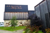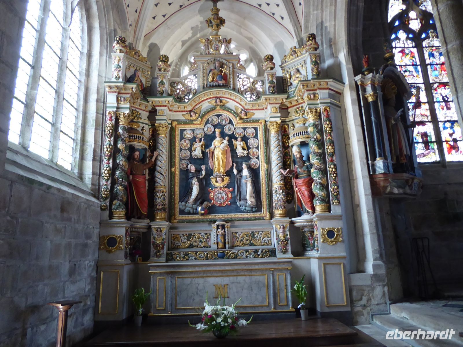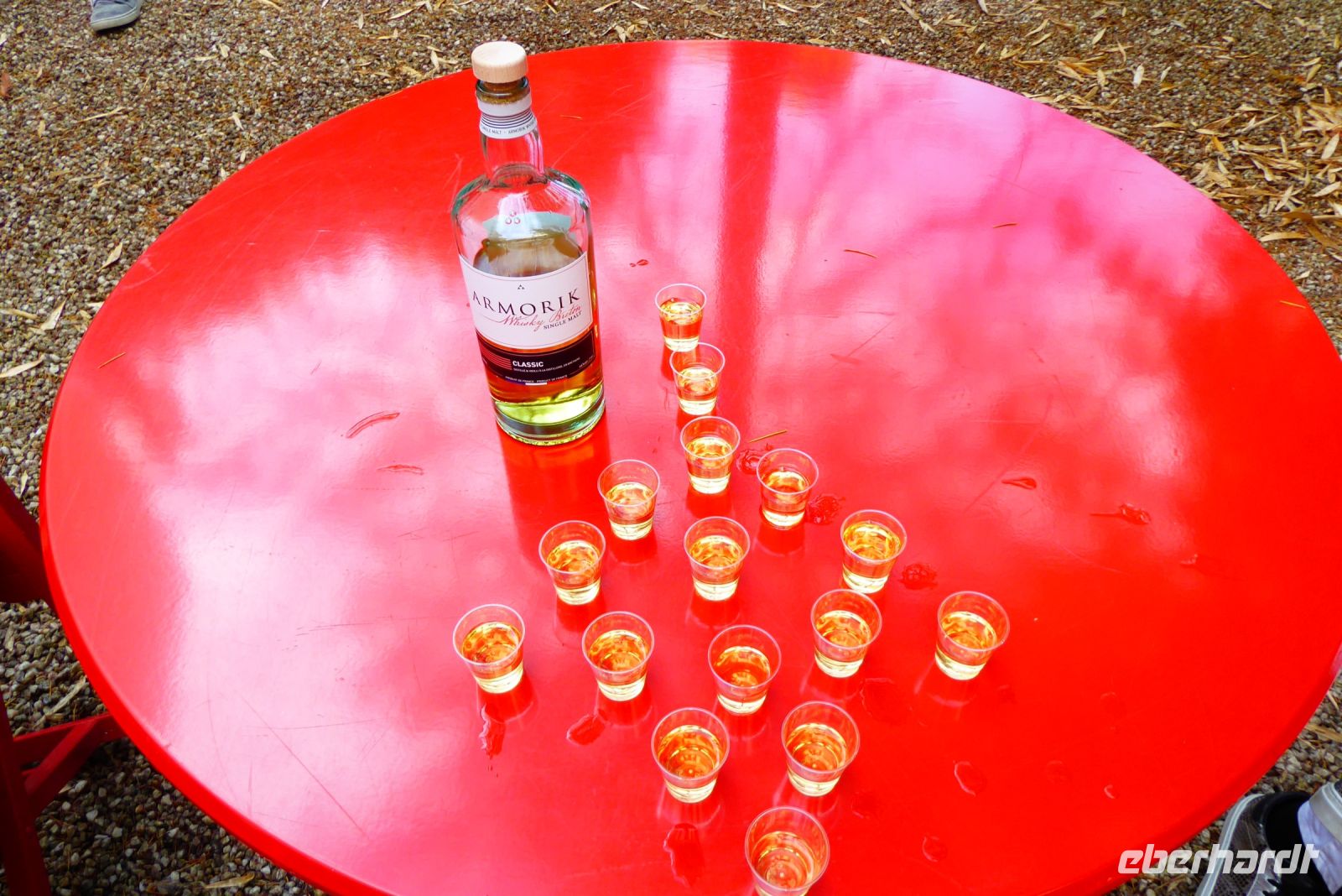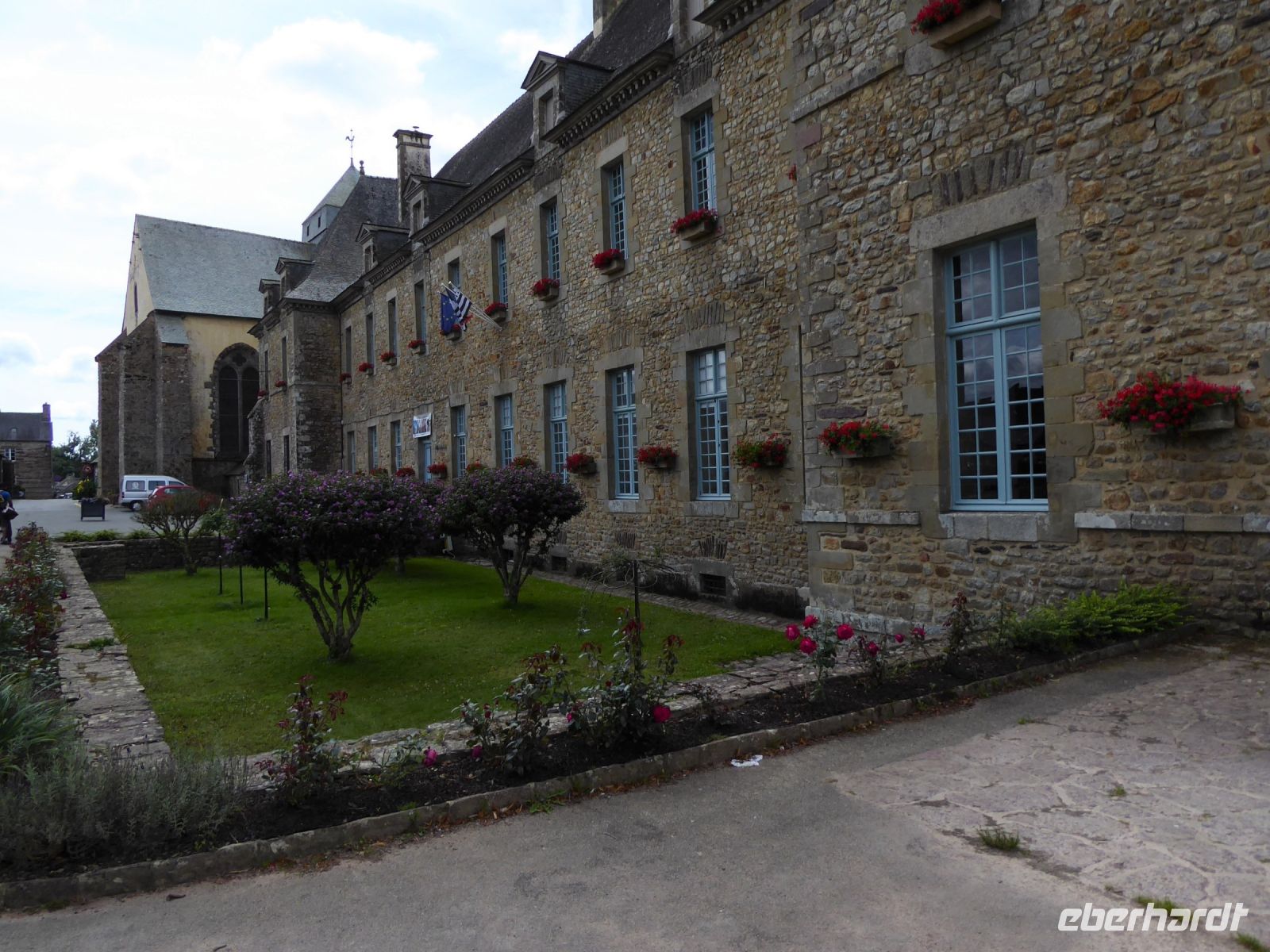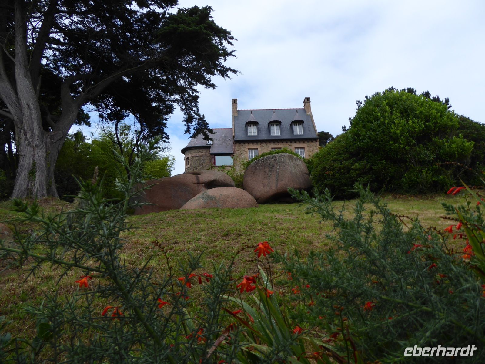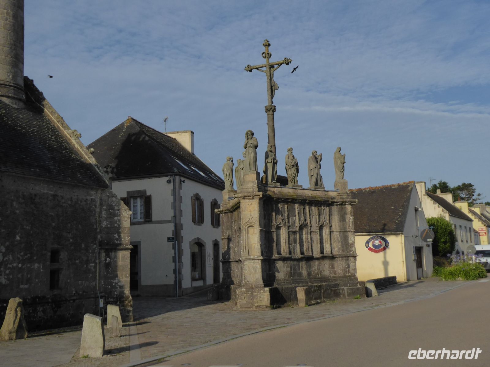 Vor unserer Weiterreise wollten wir uns heute noch Quimper genauer ansehen und gingen entlang der Odet zur Kathedrale Sankt Corentin, wo wir mit unserer Stadtführerin Yolande verabredet waren. Nach einem kurzen Blick in das Innere des Kirchengebäudes, mit seinem eigentümlich geknickten Chor und den wunderschönen Glasfenstern aller Epochen widmeten wir uns erst der Baugeschichte des imposanten Bauwerkes, die über sechs Jahrhunderte andauerte. Das nachhaltige Handeln des Heiligen Sankt Corentin, der jeden Tag nur einen Teil seiner Mahlzeit verspeiste und die Reste dem Meer wieder zurückgab, erstaunte uns schon am Vorabend bei unserem Bummel durch die Stadt. Ähnlich wie Rom liegt Quimper auf sieben Hügeln. Drei Flüsse treffen sich hier und bis zum Meer sind es nur wenige Kilometer. Quimper ist die Hauptstadt der Cornouaille. Yolande würzte uns die Geschichte der Stadt mit vielen Details und lustigen persönlichen Anekdoten. Wir waren auch in diesem Jahr ihre erste deutsche Reisegruppe! Unser Stadtspaziergang führte uns zuerst zum Garten des Friedens, einer wunderschönen Parkanlage mit mediterranem Bewuchs. Leider begann es zu regnen und so machten wir uns flugs auf in Richtung Markthalle. Unter der hölzernen Konstruktion, die auch an einen Schiffsrumpf erinnert, finden sich Stände mit ihrem bunten Warenangebot an Obst, Gemüse, Fleisch aus der Region und natürlich fangfrischen Fischen und Krustentieren. Unsere nächste Station war der umfriedete Pfarrbezirk in Guimiliau. Die Umfassungsmauer, das Triumphtor, die Kirche, das Beinhaus und der Kalvarienberg gehören mit ihrer unglaublichen Anzahl von über 200 Figuren zu den schönsten Anlagen dieser Art in der Bretagne. Die Entstehungszeit des einzigartigen Ensembles datiert ins sechzehnte Jahrhundert. Für die Reiseleiterin wartete hier noch eine kleine Überraschung, ein wunderschöner Blumenstrauß blauer Hortensien. Ein paar Straßenkilometer und viele Kreisel weiter erreichten wir in Trégastel wieder das Meer. Gemütlich spazierten wir um die Halbinsel Renote, die mit bizarren Felsformationen, wunderschönen Anwesen und einem herrlichen Strand punktet. Inmitten der Jahrmillionen alten Steine der rosa Granitküste hatten wir die schönsten Ausblicke auf das Meer und auf die umgebenden Inseln, darunter auch auf die Insel Crostaèrés. Das neogotische Schloss auf der kleinen Insel wurde von dem polnischen Mathematiker und Erfinder Bruno Abdank-Abakanowicz Ende des neunzehnten Jahrhunderts erbaut. Ihn verband eine langjährige Freundschaft mit Henryk Sienkiewicz, der seinen Roman ´Quo vadis` hier verfasste. Die Insel mitsamt dem Schloss ist heute im Besitz des deutschen Schauspielers und Kabarettisten Dieter Hallervorden. Zurück in Lannion besuchten wir noch die Whisky Destillerie Warenghem, die seit fünfunddreißig Jahren in der Bretagne Whisky herstellt. Die edlen Brände haben längst einen festen Platz in der Branche und genießen bei Kennern einen guten Ruf. Doch der Betrieb vor Ort ist stark kommerzialisiert und Wandergruppen scheinen eher den Ablauf und Verkauf zu stören. In unserem schönen Hotel in der Innenstadt von Lannion machten wir dann im Innenhof unsere private Whiskyverkostung, bevor wir gemeinsam zum Abendessen in einem landestypischen Lokal fein zu Abend speisten. Die spontane Einladung von einem unserer Mitreisenden (Danke, Uli!) zu den Getränken rundete diesen wunderschönen Tag ab.