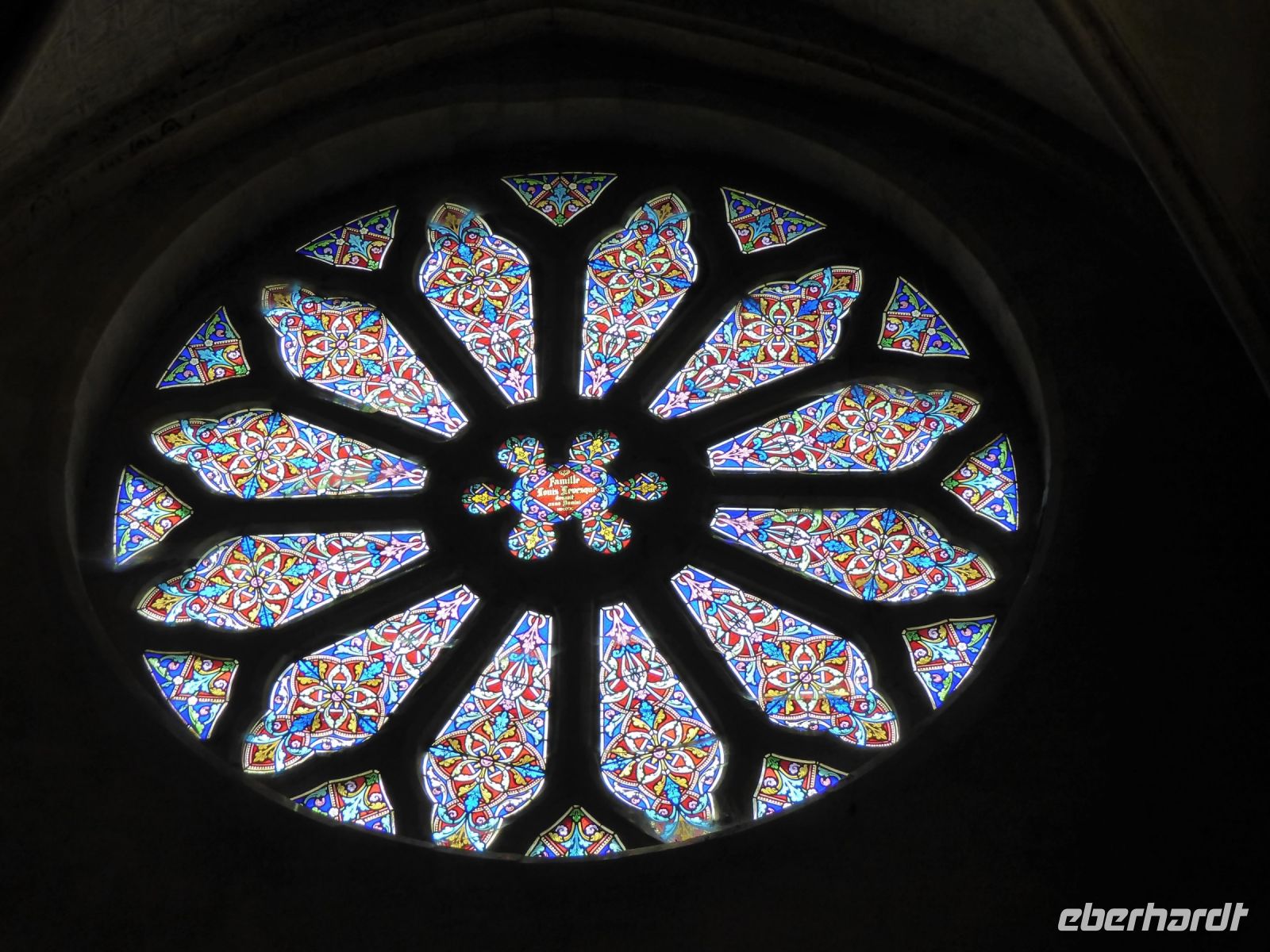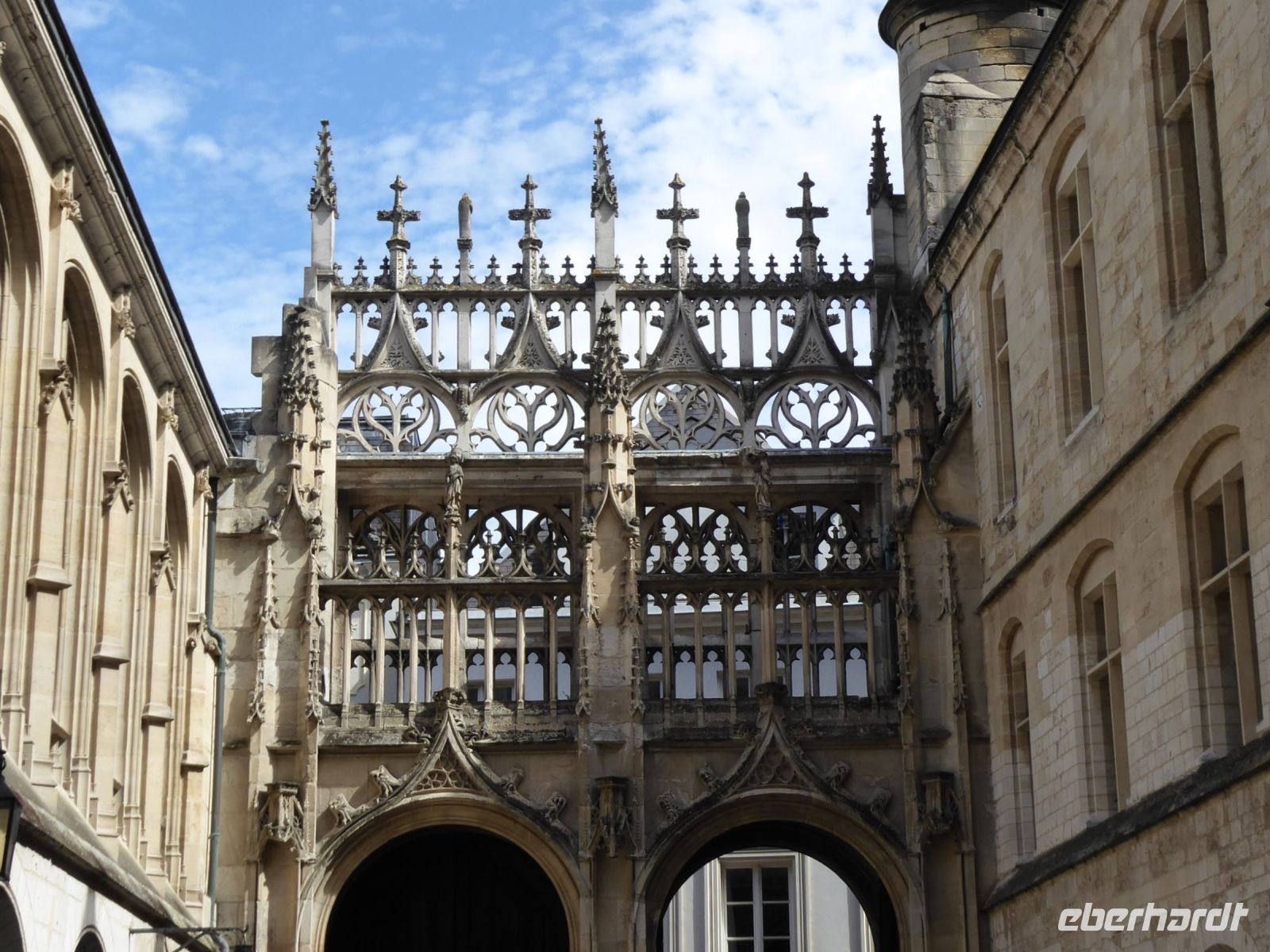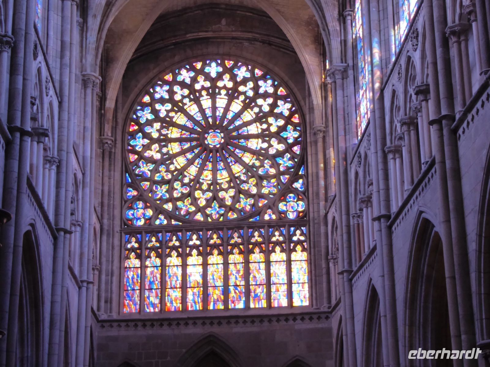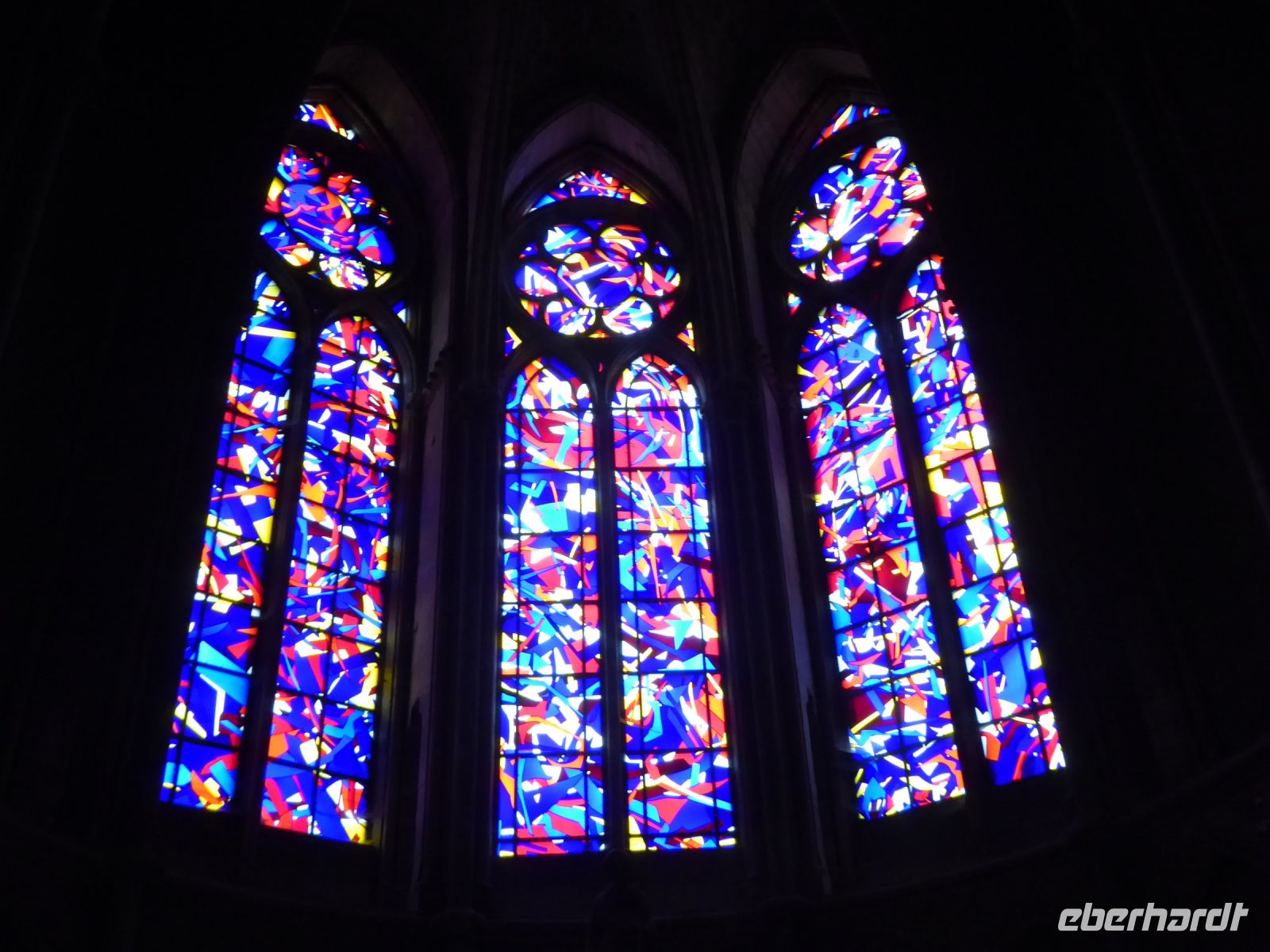 Am Nächsten Morgen hieß es 'Koffer packen' und Abschied nehmen von der Bretagne, dem Meer und der Küste. Die erste Etappe unserer Rückreise führte uns über die Straße der Gotik nach Rouen. Dort bewunderten wir die Fassade der Kathedrale von genau der Stelle, wo die Staffelei Claude Monets stand. Der große Maler des Impressionismus hat die Kathedrale in einem Bilderzyklus von dreiunddreißig Gemälden festgehalten. Seine Werke sind in den großen Museen in aller Welt vertreten. Die heutige Kathedrale Notre-Dame mit ihren beiden Türmen der Westfassade steht auf den Grundmauern eines romanischen Vorgängerbaus. Der Butterturm mit seinen 75 Metern Höhe ist eines der schönsten Beispiele für die Kunstfertigkeit der Bauleute der Hochgotik. Bis 1880 war der Turm über der Vierung mit 151 Metern Höhe das höchste Bauwerk der Welt! Die berühmten Gräber im Inneren des Bauwerks beleuchten die Meilensteine der Geschichte der Region: hier wurden Rollo, der erste Herzog der Normandie und Richard Löwenherz unter Stein gemeißelten Grabmonumenten bestattet - im Falle des Letztgenannten jedoch lediglich sein einbalsamiertes Herz in einem Bleikästchen. Durch die engen Gassen, dicht mit Fachwerkhäusern gesäumt, kamen wir erst zur Kirche St. Maclou und zum Pesthof, der heute nur noch in Schnitzereien am Gebälk der Gebäude an die großen Pestepidemien im vierzehnten und sechzehnten Jahrhundert erinnert. Ateliers, Ladenlokale, ein Café und ein Restaurant beleben heute das Ensemble. Kurze Zeit später erreichten wir den Justizpalast. An diesem größten, nicht sakralen Gebäude des ausgehenden Mittelalters, waren noch deutlich die Spuren der Häuserkämpfe am Ende des Zweiten Weltkriegs zu erkennen. Wir bestaunten noch den Uhrturm und gingen zum Alten Markt. An der Stätte, an der die junge Jeanne d´Arc 1431 den Flammentod erleiden musste, steht heute eine moderne Kirche, die ihr geweiht ist. Versorgt mit leckeren belegten Baguettes kletterten wir nach unserer Besichtigungstour wieder in den Bus und erreichten am frühen Abend die Stadt Reims in der Champagne. Unser Hotel lag direkt im Zentrum, sodass wir uns vor dem Abendessen noch zu einem gemeinsamen Spaziergang zur Kathedrale verabredeten. Die Kathedrale Notre Dame, mit ihrer Ausstattung und den mehr als 2300 Skulpturen, ist ein Meisterwerk der Hochgotik. Sie ist seit 1991 eingetragenes Weltkulturerbe der UNESCO. In dem imposanten Kirchengebäude wurden 29 französische Könige gekrönt, darunter auch Charles VII, der von Jeanne d´Arc zu seiner Krönung geführt wurde. Im Inneren der Kathedrale sind noch zahlreiche original erhaltene farbige Glasfenster aus dem dreizehnten Jahrhundert zu sehen. 1974 entwarf Marc Chagall drei Fenster für eine Kapelle des Chorraums. Im typischen transluzenten Blau Chagalls sind biblische Szenen dargestellt. Rechts und links werden diese Werke von sehr farbintensiven modernen Glasfenstern des aus Dessau stammenden Künstlers Imi Knoebel flankiert. Das heiter verhaltene Lächeln des berühmten lächelnden Engels an der Westfassade der Kathedrale begleitete uns in den Abend. Das Abendessen in der Brasserie Excelsior entsprach den gehobenen Ansprüchen an die französische Küche. Besonders lecker war das Dessert, eine Kreation aus den berühmten Bisquites roses aus Reims, die 1690 für den Sonnenkönig Ludwig XIV erfunden wurden. Getränkt in Champagner und mit frischen Beeren verziert waren sie der krönende Abschluss unseres letzten gemeinsamen Abendessens. Nicht umsonst steht auch die französische Küche mittlerweile auf der Liste des Weltkulturerbes der UNESCO!