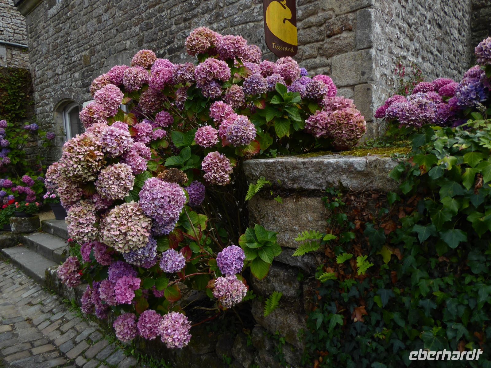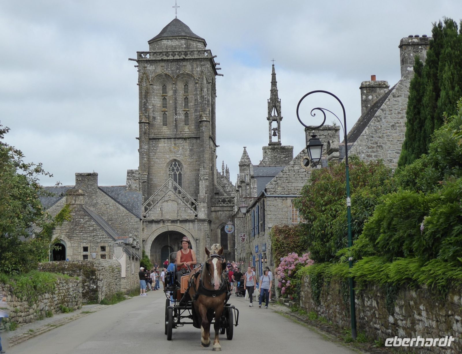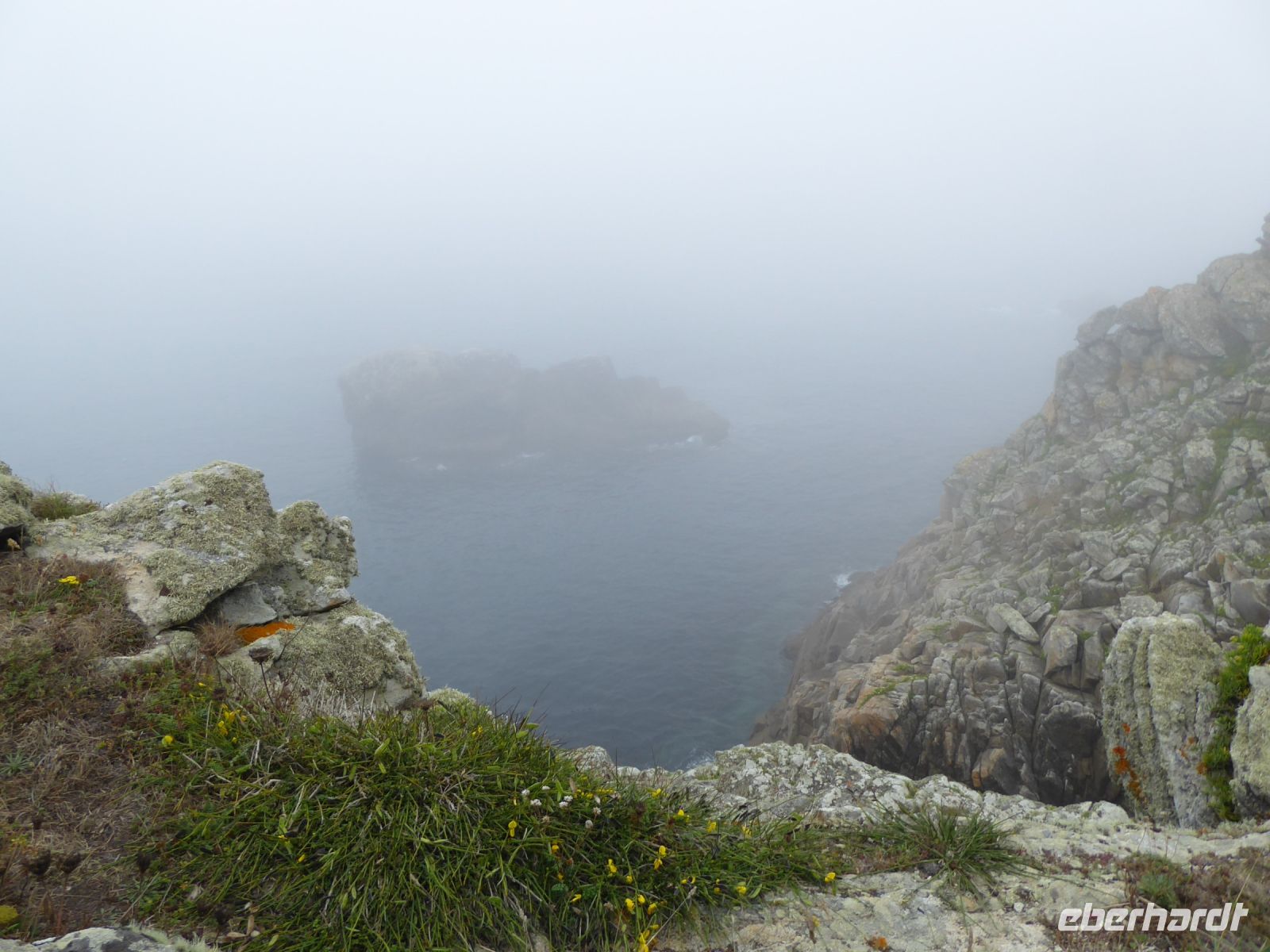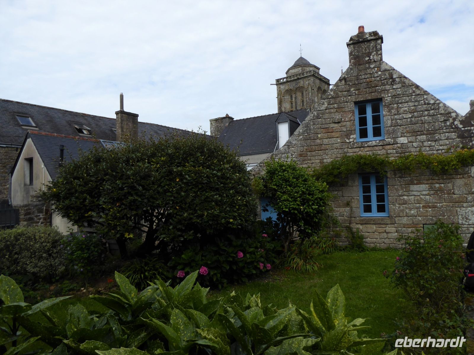 Unser heutiger Wanderweg führt uns über die GR 34, die Grande Route, die auf 1700 km um jede Klippe, jede Bucht der Bretagne, vom Mont St.Michel bis nach St. Nazaire, geht. Der schmale Pfad vom Parkplatz an der Pointe du Raz schlängelte sich durch große Farne und stacheligen Ginster, danach öffnete sich der Weg zum Meer, das wir mehr ahnten als sahen, denn dichter Nebel verstellte uns die Sicht. Selbst vom kleinen Aussichtsturm aus hatten wir nur eine 360° Aussicht auf weißen Nebel. Wacker stapften wir in stetigem Auf und Ab entlang des Küstenpfades. Blühende Erika tauchten die Hügel in violette Töne, Quellen sprangen aus den Felsen, ständig wechselte die Flora und bot dem Auge, wie der Fotolinse, trotz der schlechten Sicht stets neue Attraktionen. Gemütlich näherten wir uns der Landspitze, die sich 72 Meter über dem Meer erhebt. Langsam besserte sich das Wetter und wir sahen die Leuchttürme auf den beiden vorgelagerten Inseln und auch die Statue der Mutter Gottes der Schiffbrüchigen schälte sich langsam aus dem Nebel. In einer halben Stunde wollten wir uns wieder treffen, damit jeder selbst entscheiden konnte, wie weit er über die felsigen Klippen klettern wollte. Danach setzten wir unsere Wanderung fort zur Baie des Trépassés, einer herrlichen Bucht, die karibische Gefühle aufkommen ließ. Unterwegs ließen wir uns von dem unglaublichen Farbspiel des Meeres verzaubern. Am Strand angekommen, ließen wir es uns nicht nehmen in die herrlichen türkisfarbenen Wellen zu hüpfen. Une fois dedans, sagen die Franzosen und meinen damit, dass, wenn man einmal drin ist im kühlen Wasser, es doch sehr schön ist! Ein weiterer Höhepunkt dieses Tages war der Besuch des Städtchens Locronan. Trotz der im Sommer unvermeidlichen Touristen, hat man das Gefühl, hier sei die Zeit stehen geblieben. Das Erscheinungsbild des Dorfes ist noch komplett mittelalterlich und das bunte Markttreiben fügt sich harmonisch ein. Ab dem vierzehnten Jahrhundert kam die Stadt durch die Segeltuchweberei und den Handel mit allen großen Flotten zu Reichtum, der sich in wunderschönen Granithäusern und einer imposanten Dorfkirche zeigt. Nicht umsonst wurde der Ort mit dem Titel „besonders malerischer Ort der Bretagne“ ausgezeichnet Die Stadt diente daher auch schon öfters als Filmkulisse, so auch für den 1979 von Roman Polanski gedrehten Film „Tess“, der zum internationalen Durchbruch für die damals gerade achtzehnjährige Nastassja Kinski wurde.