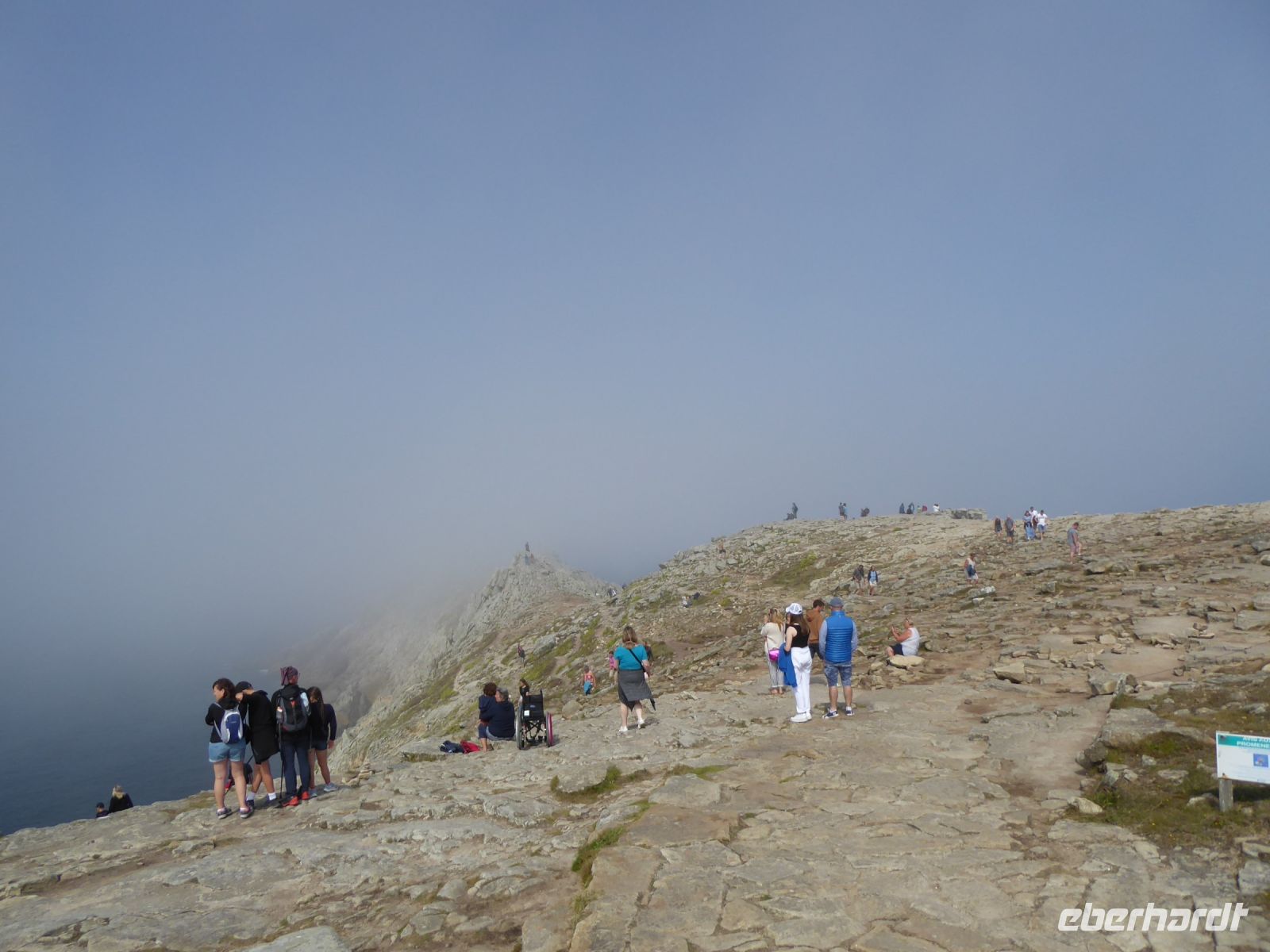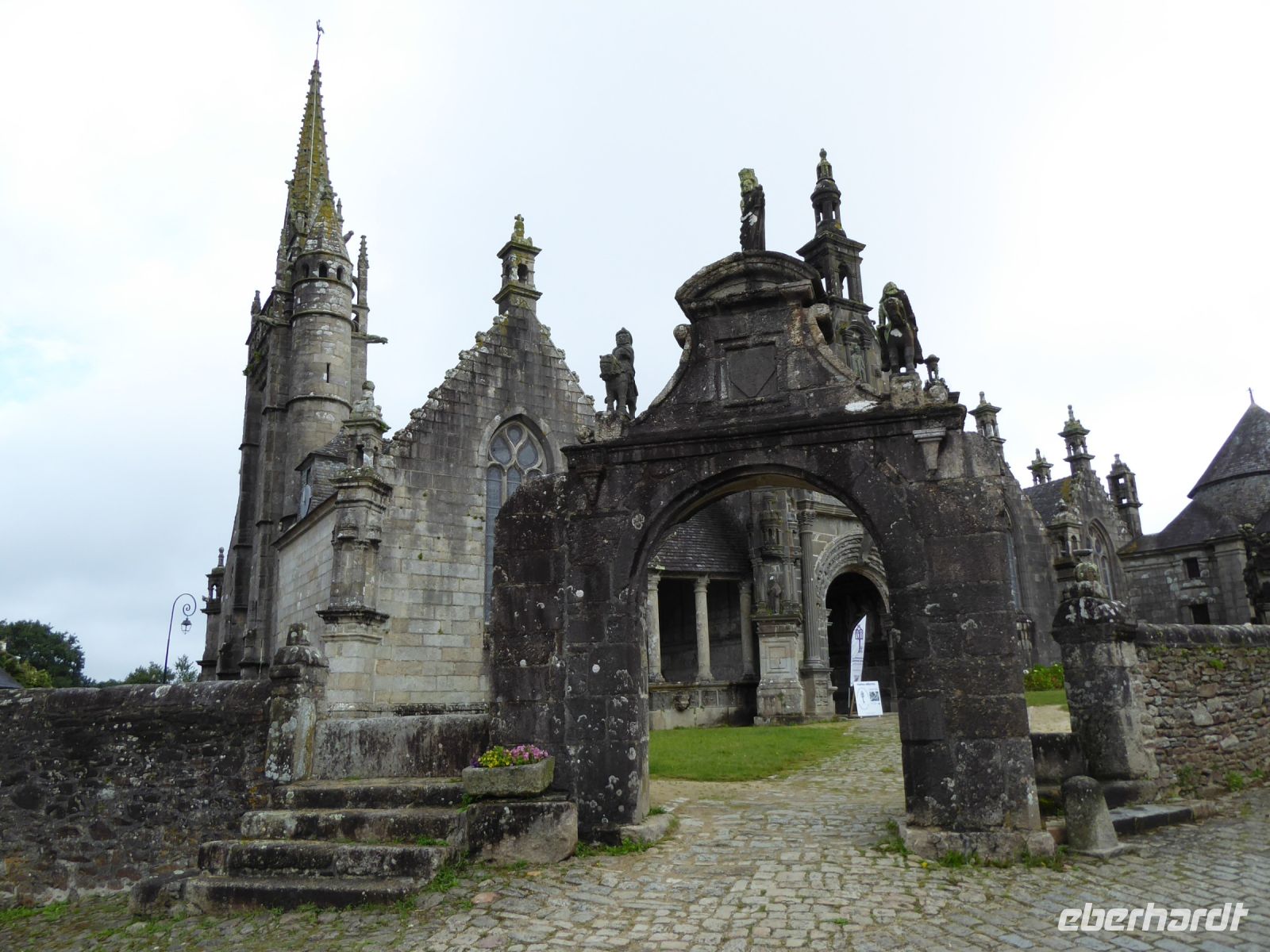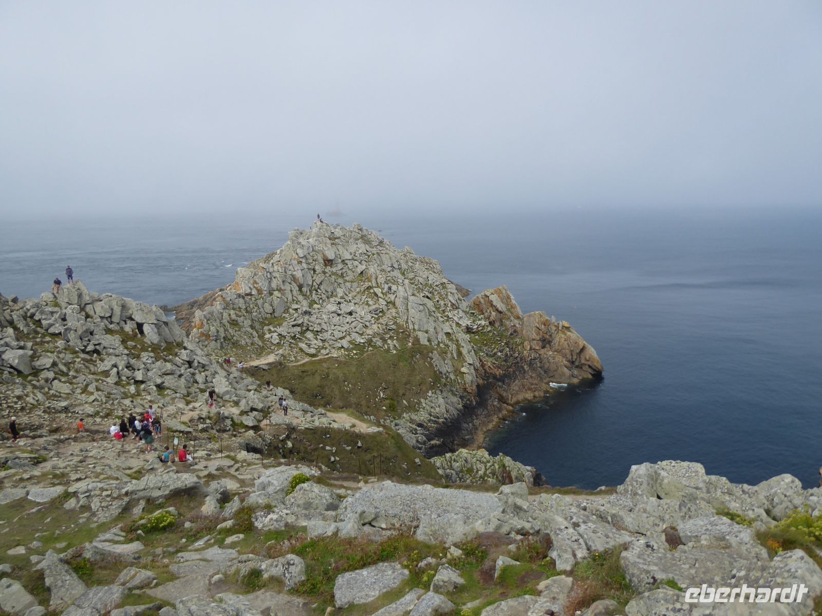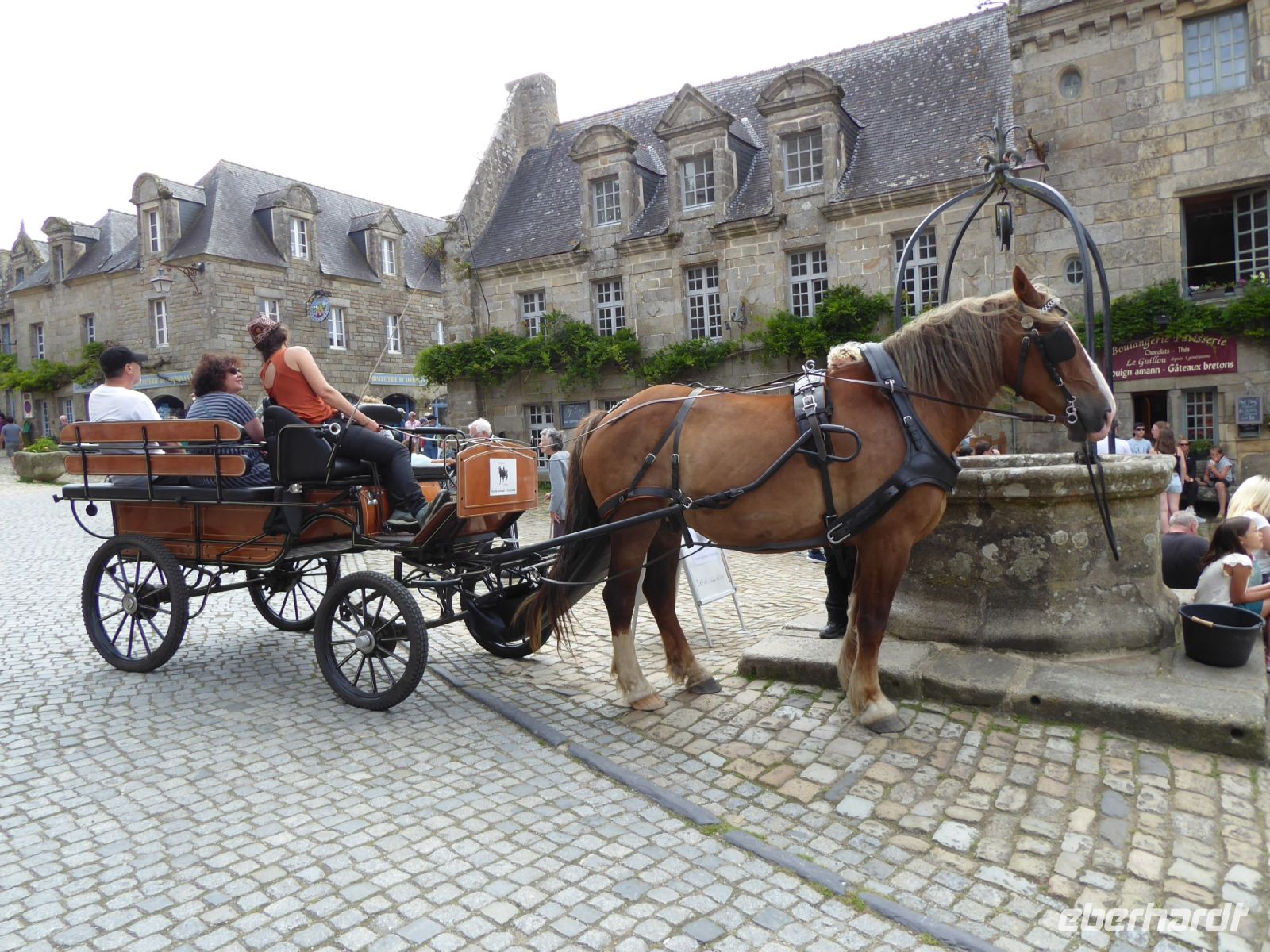Unser heutiger Wanderweg führt uns über die GR 34, die Grande Route, die auf 1700 km um jede Klippe, jede Bucht der Bretagne, vom Mont St.Michel bis nach St. Nazaire, geht. Der schmale Pfad vom Parkplatz an der Pointe du Raz schlängelte sich durch große Farne und stacheligen Ginster, danach öffnete sich der Weg zum Meer, das wir mehr ahnten als sahen, denn dichter Nebel verstellte uns die Sicht. Selbst vom kleinen Aussichtsturm aus hatten wir nur eine 360° Aussicht auf weißen Nebel. Wacker stapften wir in stetigem Auf und Ab entlang des Küstenpfades. Blühende Erika tauchten die Hügel in violette Töne, Quellen sprangen aus den Felsen, ständig wechselte die Flora und bot dem Auge, wie der Fotolinse, trotz der schlechten Sicht stets neue Attraktionen. Gemütlich näherten wir uns der Landspitze, die sich 72 Meter über dem Meer erhebt. Langsam besserte sich das Wetter und wir sahen die Leuchttürme auf den beiden vorgelagerten Inseln und auch die Statue der Mutter Gottes der Schiffbrüchigen schälte sich langsam aus dem Nebel. In einer halben Stunde wollten wir uns wieder treffen, damit jeder selbst entscheiden konnte, wie weit er über die felsigen Klippen klettern wollte. Danach setzten wir unsere Wanderung fort zur Baie des Trépassés, einer herrlichen Bucht, die karibische Gefühle aufkommen ließ. Unterwegs ließen wir uns von dem unglaublichen Farbspiel des Meeres verzaubern. Am Strand angekommen, ließen wir es uns nicht nehmen in die herrlichen türkisfarbenen Wellen zu hüpfen. Une fois dedans, sagen die Franzosen und meinen damit, dass, wenn man einmal drin ist im kühlen Wasser, es doch sehr schön ist! Ein weiterer Höhepunkt dieses Tages war der Besuch des Städtchens Locronan. Trotz der im Sommer unvermeidlichen Touristen, hat man das Gefühl, hier sei die Zeit stehen geblieben. Das Erscheinungsbild des Dorfes ist noch komplett mittelalterlich und das bunte Markttreiben fügt sich harmonisch ein. Ab dem vierzehnten Jahrhundert kam die Stadt durch die Segeltuchweberei und den Handel mit allen großen Flotten zu Reichtum, der sich in wunderschönen Granithäusern und einer imposanten Dorfkirche zeigt. Nicht umsonst wurde der Ort mit dem Titel „besonders malerischer Ort der Bretagne“ ausgezeichnet Die Stadt diente daher auch schon öfters als Filmkulisse, so auch für den 1979 von Roman Polanski gedrehten Film „Tess“, der zum internationalen Durchbruch für die damals gerade achtzehnjährige Nastassja Kinski wurde.