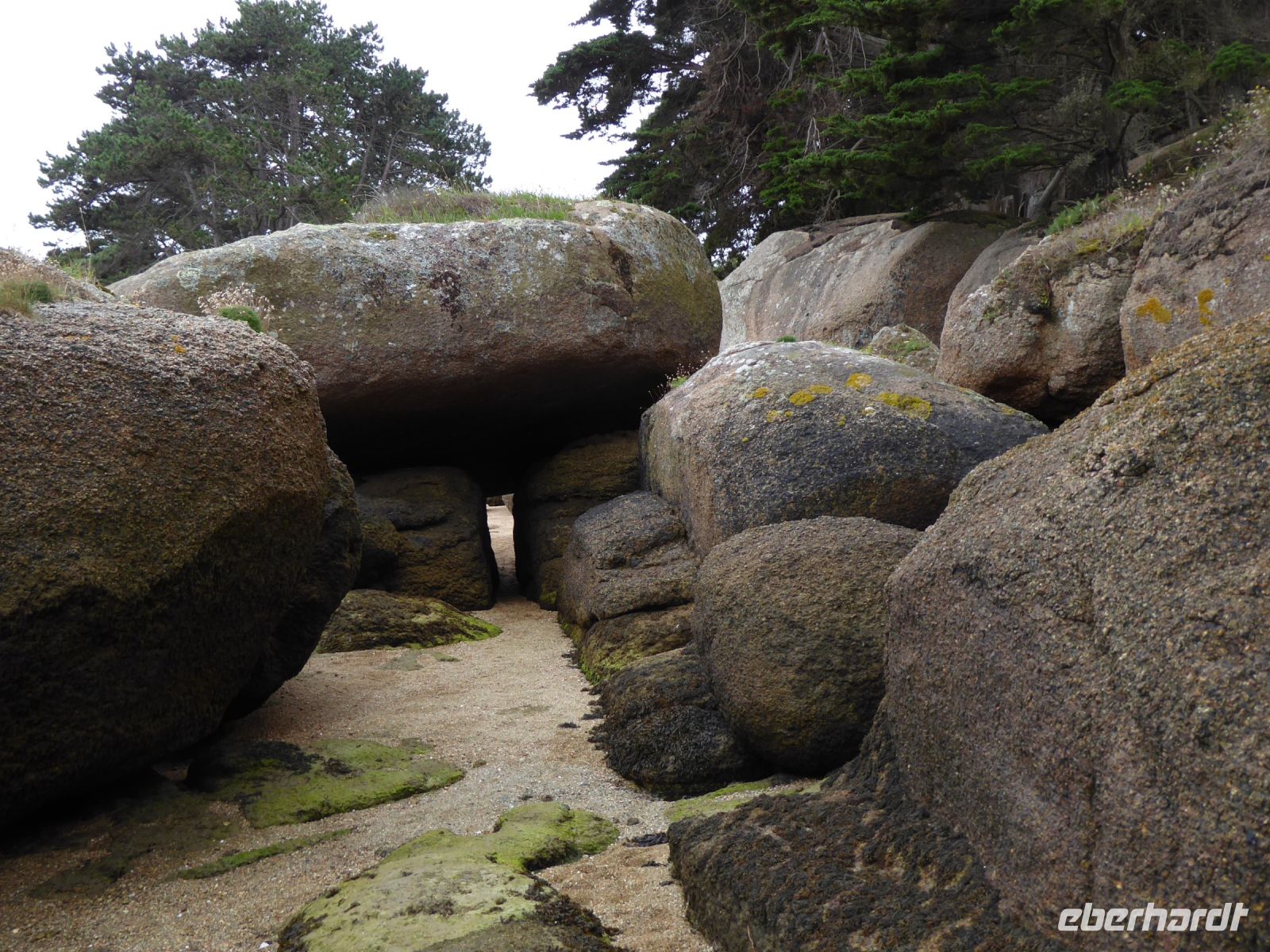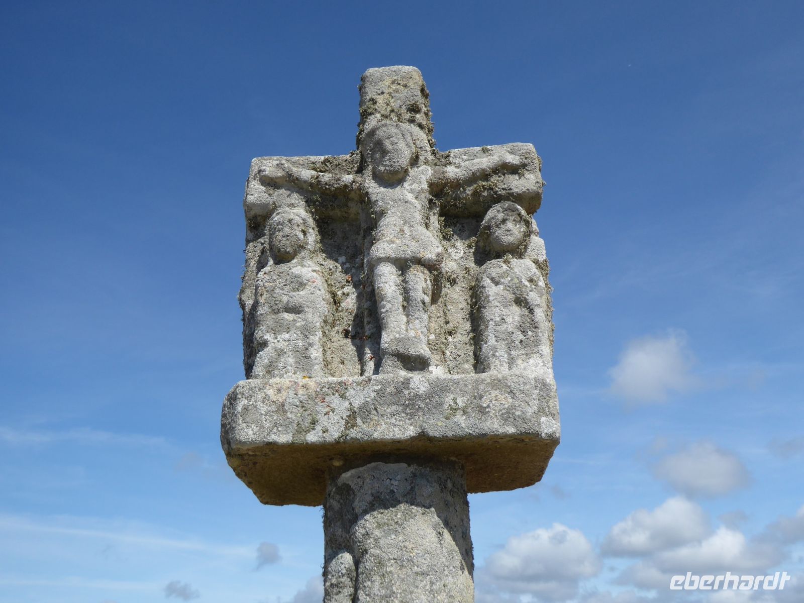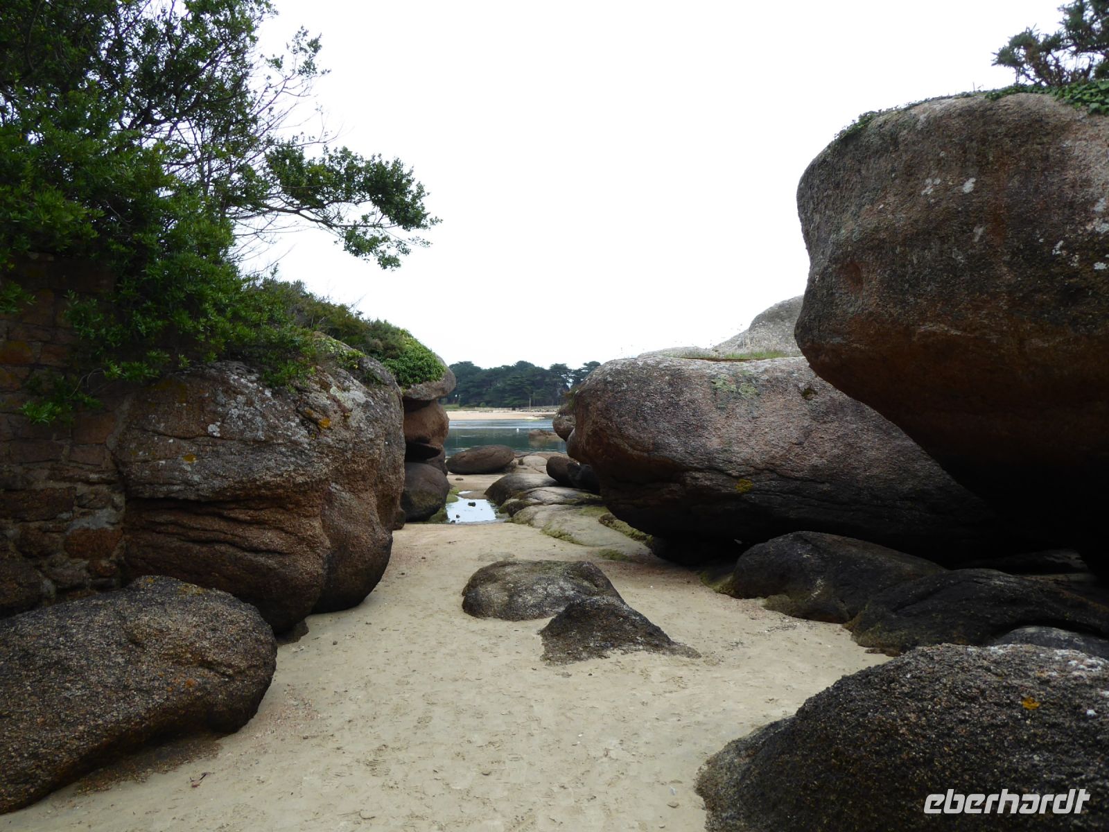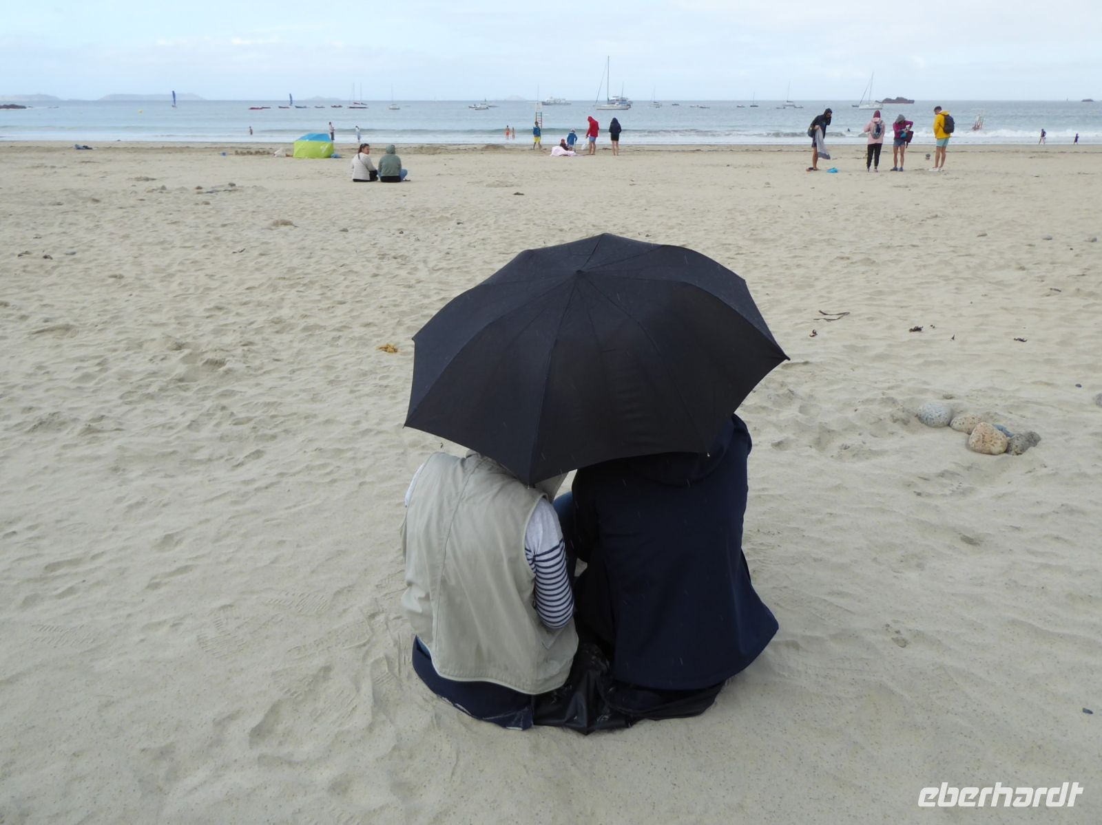 Unser heutiger Wanderweg führt uns über die GR 34, die Grande Route, die auf 1700 km um jede Klippe, jede Bucht der Bretagne, vom Mont St.Michel bis nach St. Nazaire, geht. Der schmale Pfad vom Parkplatz an der Pointe du Raz schlängelte sich durch große Farne und stacheligen Ginster, danach öffnete sich der Weg zum Meer, das wir mehr ahnten als sahen, denn dichter Nebel verstellte uns die Sicht. Selbst vom kleinen Aussichtsturm aus hatten wir nur eine 360° Aussicht auf weißen Nebel. Wacker stapften wir in stetigem Auf und Ab entlang des Küstenpfades. Blühende Erika tauchten die Hügel in violette Töne, Quellen sprangen aus den Felsen, ständig wechselte die Flora und bot dem Auge, wie der Fotolinse, trotz der schlechten Sicht stets neue Attraktionen. Gemütlich näherten wir uns der Landspitze, die sich 72 Meter über dem Meer erhebt. Langsam besserte sich das Wetter und wir sahen die Leuchttürme auf den beiden vorgelagerten Inseln und auch die Statue der Mutter Gottes der Schiffbrüchigen schälte sich langsam aus dem Nebel. In einer halben Stunde wollten wir uns wieder treffen, damit jeder selbst entscheiden konnte, wie weit er über die felsigen Klippen klettern wollte. Danach setzten wir unsere Wanderung fort zur Baie des Trépassés, einer herrlichen Bucht, die karibische Gefühle aufkommen ließ. Unterwegs ließen wir uns von dem unglaublichen Farbspiel des Meeres verzaubern. Am Strand angekommen, ließen wir es uns nicht nehmen in die herrlichen türkisfarbenen Wellen zu hüpfen. Une fois dedans, sagen die Franzosen und meinen damit, dass, wenn man einmal drin ist im kühlen Wasser, es doch sehr schön ist! Ein weiterer Höhepunkt dieses Tages war der Besuch des Städtchens Locronan. Trotz der im Sommer unvermeidlichen Touristen, hat man das Gefühl, hier sei die Zeit stehen geblieben. Das Erscheinungsbild des Dorfes ist noch komplett mittelalterlich und das bunte Markttreiben fügt sich harmonisch ein. Ab dem vierzehnten Jahrhundert kam die Stadt durch die Segeltuchweberei und den Handel mit allen großen Flotten zu Reichtum, der sich in wunderschönen Granithäusern und einer imposanten Dorfkirche zeigt. Nicht umsonst wurde der Ort mit dem Titel „besonders malerischer Ort der Bretagne“ ausgezeichnet Die Stadt diente daher auch schon öfters als Filmkulisse, so auch für den 1979 von Roman Polanski gedrehten Film „Tess“, der zum internationalen Durchbruch für die damals gerade achtzehnjährige Nastassja Kinski wurde.