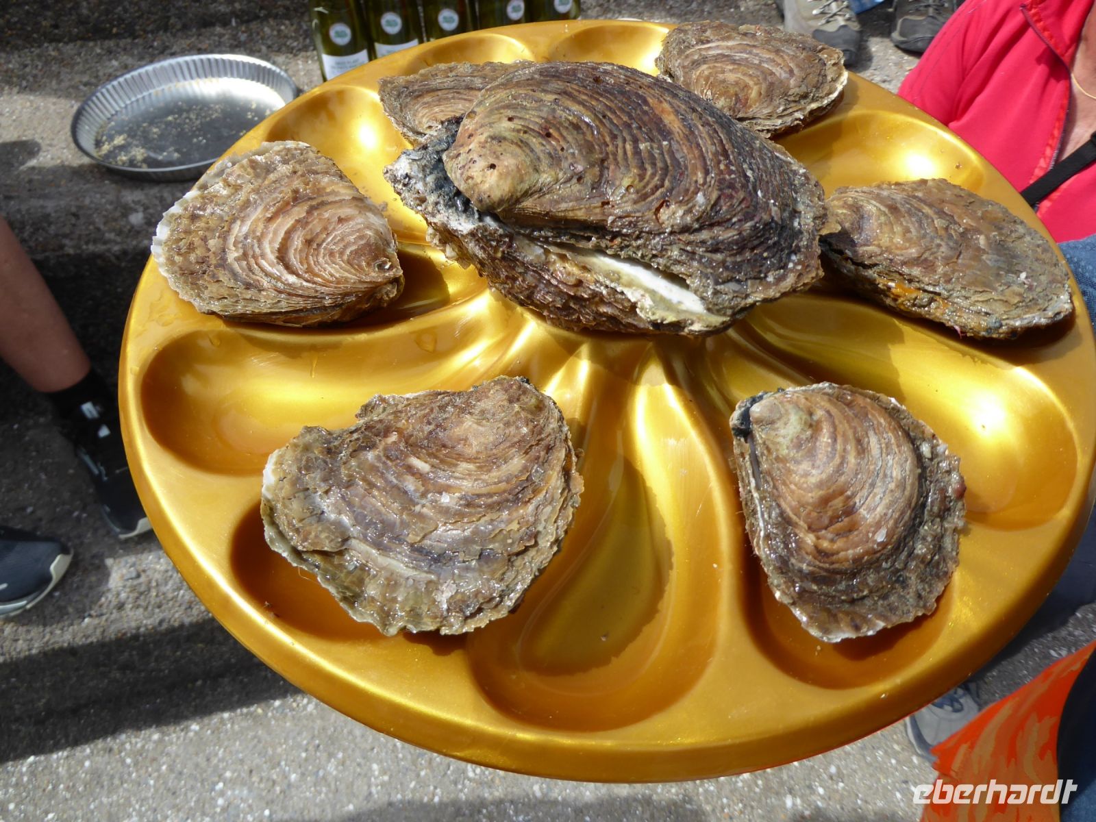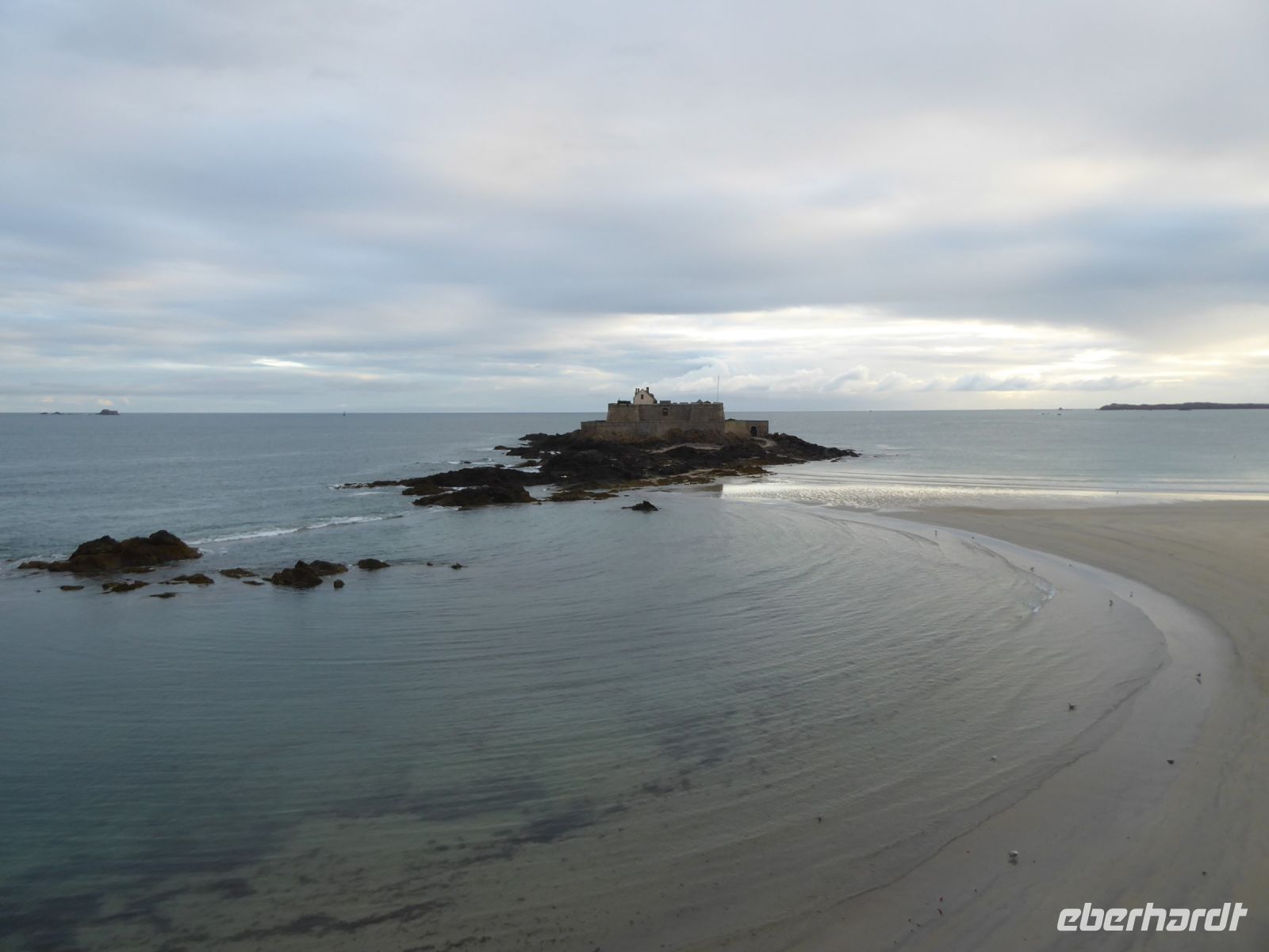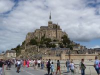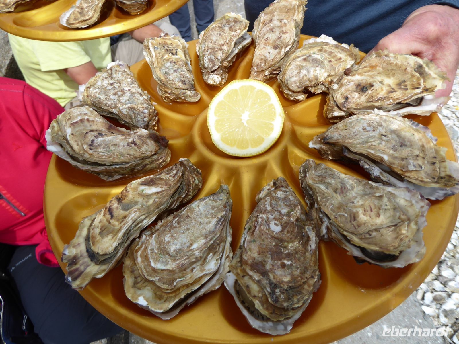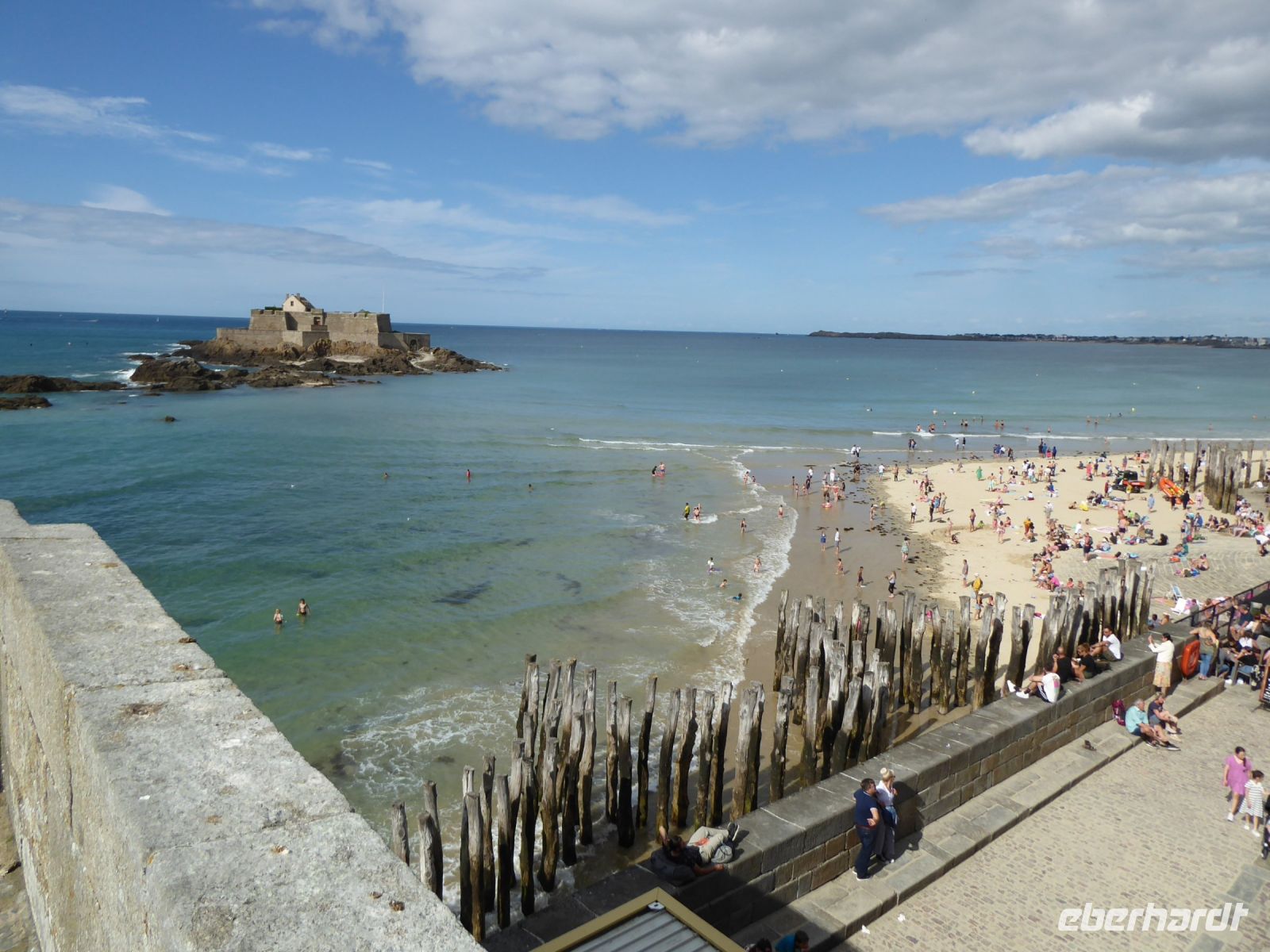 Schon früh machten wir uns auf zum Mont Saint Michel. Noch vor dem großen Ansturm erreichten wir den Inselberg, der auch bei Ebbe ein imposantes Bild bot. Wir entschieden uns, zu Fuß über die erst vor zehn Jahren gebaute Stelzenbrücke zu gehen. Langsam näherten wir uns dem Inselberg, der die Menschen seit 1300 Jahren in seinen Bann zieht. Jedes Jahr wird die Anlage, die seit 1979 UNESCO Weltkulturerbe ist, von über drei Millionen Touristen und Pilgern besucht. Viele Jahrzehnte lang wurde die Klosteranlage als gefürchtetes Staatsgefängnis genutzt, bis sich im neunzehnten Jahrhundert Victor Hugo für die Schließung des Gefängnisses einsetzte. Heute ist der Klosterberg das touristische Highlight der Normandie. Um die obere Abteikirche zu erreichen müssen erst viele steile Stufen erklommen werden, doch die grandiose Aussicht von oben entschädigt für alle Mühen! Ausgerüstet mit Audioguides ließen wir uns die Geschichte der bedeutenden christlichen Wallfahrtsstätte erklären. Bei unserem Rundgang über die Festungsmauern konnten wir die Wattwanderer beobachten und sahen, einer Ameisenstraße gleich, die Besuchermassen über die neue Brücke den Berg erstürmen. Glück gehabt, das frühe Aufstehen hat sich gelohnt - wir hatten den Berg noch fast für uns und konnten im Kreuzgang noch kurz die meditative Stille genießen! Nach und nach füllten sich die Gassen mit einer Flut von Touristen, die sich den Mont St. Michel als Ziel für ihren Sonntagsausflug auserkoren hatten. So verließen wir die Anlage gemeinsam und fuhren mit dem gesteckt vollen Shuttlebus zurück zum Parkplatz. Als nächstes Ziel stand die Stadt Cancale und unsere Austernverkostung an. Austernzucht ist in Cancale schon seit dem 13. Jahrhundert nachgewiesen. Heute beschäftigen 50 Austernzuchtbetriebe mit einem Jahresumsatz von über vier Millionen Euro 300 Mitarbeiter und versorgen die Gourmets in aller Welt mit den besten Austern der Welt. Doch frisch direkt am Strand genossen sind die berühmten Austern aus Cancale doch noch immer am Besten. Mit gut gekühlten Flaschen Weißwein aus dem Pays de Nantes spazierten wir durch das sonntäglich festlich gestimmte Städtchen, vorbei an gesteckt vollen Restaurants, in denen großzügig getafelt wurde. Wir wollten zu den Marktständen am Ende des Ortes, die auch sonntags frische Austern feil bieten, um uns von der Einzigartigkeit des Geschmacks der berühmten Cancaleser Austern überzeugen zu lassen. Auf der großen Freitreppe hinter dem Markt fanden wir ein gemütliches Plätzchen zwischen Feinschmeckern aus aller Welt, die sich hier am Strand ein Stelldichein geben. Am Anfang eher zögerlich, leisteten dann auch wir unseren Beitrag zur Erhöhung des Berges aus Austernschalen zu unseren Füßen und genossen die Atmosphäre dieses besonderen Ortes. Zurück in St. Malò reichte es noch für ein kleines Bad im Meer oder für einen Spaziergang durch die Altstadt. St. Malò wurde nach der Bombardierung durch anglo-amerikanische Truppen im August 1944 nach alten Plänen originalgetreu wieder aufgebaut und ist heute das Ziel internationaler Touristen.