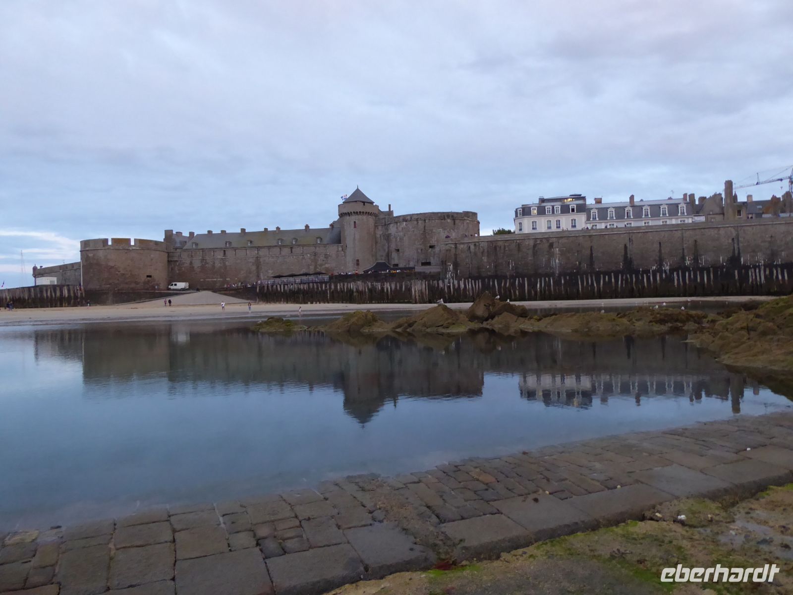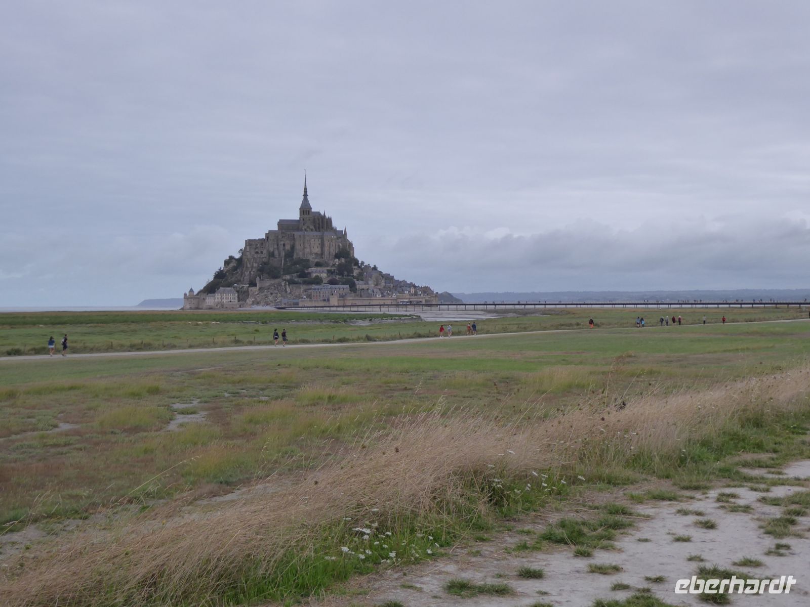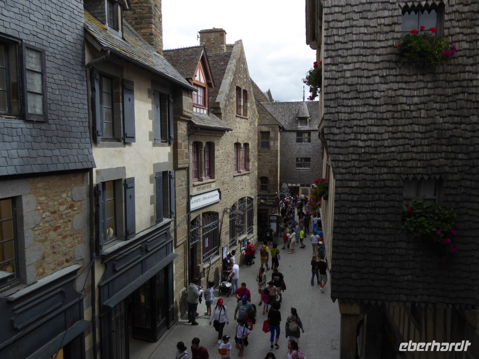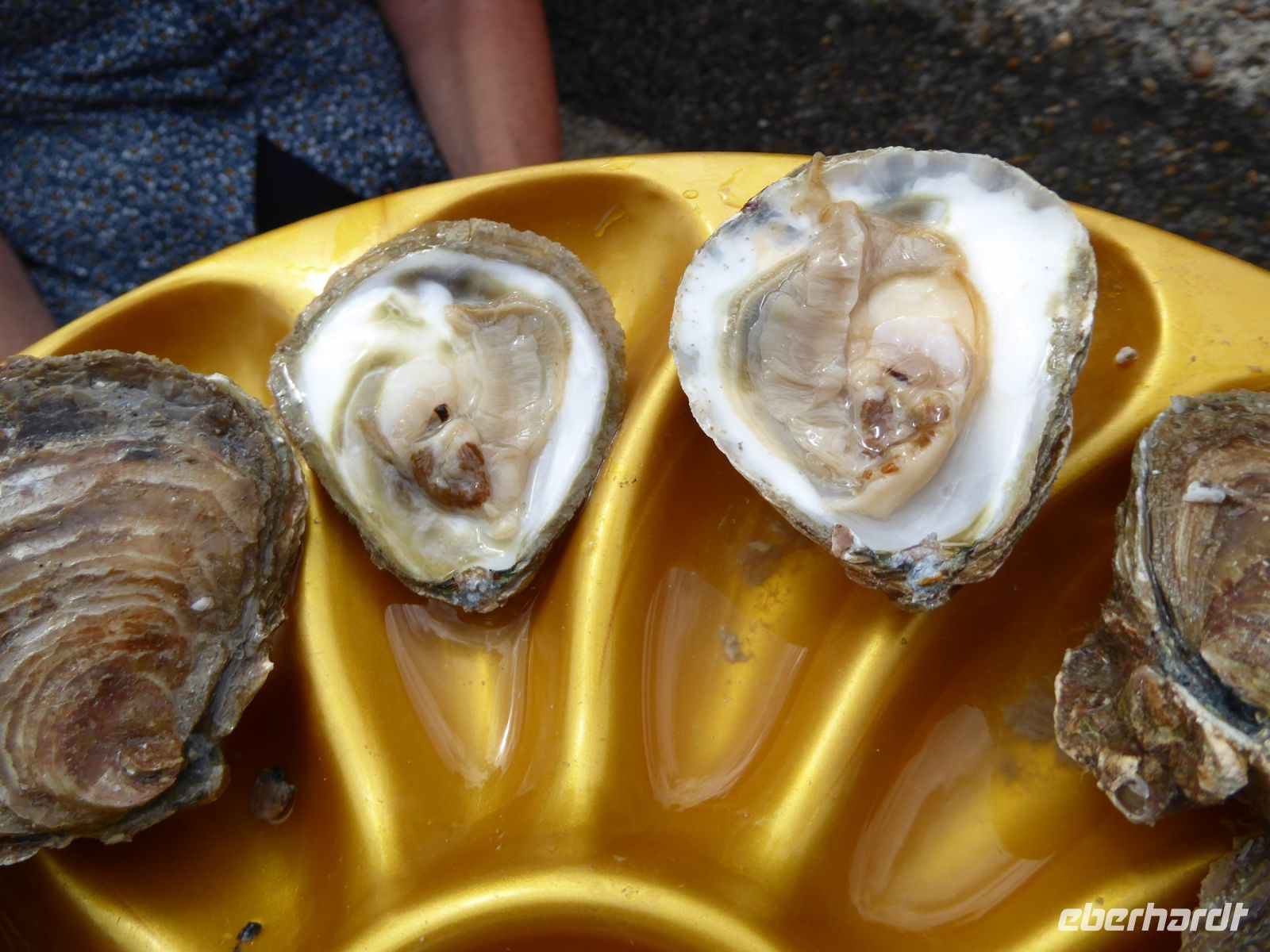 Schon früh machten wir uns auf zum Mont Saint Michel. Noch vor dem großen Ansturm erreichten wir den Inselberg, der auch bei Ebbe ein imposantes Bild bot. Wir entschieden uns, zu Fuß über die erst vor zehn Jahren gebaute Stelzenbrücke zu gehen. Langsam näherten wir uns dem Inselberg, der die Menschen seit 1300 Jahren in seinen Bann zieht. Jedes Jahr wird die Anlage, die seit 1979 UNESCO Weltkulturerbe ist, von über drei Millionen Touristen und Pilgern besucht. Viele Jahrzehnte lang wurde die Klosteranlage als gefürchtetes Staatsgefängnis genutzt, bis sich im neunzehnten Jahrhundert Victor Hugo für die Schließung des Gefängnisses einsetzte. Heute ist der Klosterberg das touristische Highlight der Normandie. Um die obere Abteikirche zu erreichen müssen erst viele steile Stufen erklommen werden, doch die grandiose Aussicht von oben entschädigt für alle Mühen! Ausgerüstet mit Audioguides ließen wir uns die Geschichte der bedeutenden christlichen Wallfahrtsstätte erklären. Bei unserem Rundgang über die Festungsmauern konnten wir die Wattwanderer beobachten und sahen, einer Ameisenstraße gleich, die Besuchermassen über die neue Brücke den Berg erstürmen. Glück gehabt, das frühe Aufstehen hat sich gelohnt - wir hatten den Berg noch fast für uns und konnten im Kreuzgang noch kurz die meditative Stille genießen! Nach und nach füllten sich die Gassen mit einer Flut von Touristen, die sich den Mont St. Michel als Ziel für ihren Sonntagsausflug auserkoren hatten. So verließen wir die Anlage gemeinsam und fuhren mit dem gesteckt vollen Shuttlebus zurück zum Parkplatz. Als nächstes Ziel stand die Stadt Cancale und unsere Austernverkostung an. Austernzucht ist in Cancale schon seit dem 13. Jahrhundert nachgewiesen. Heute beschäftigen 50 Austernzuchtbetriebe mit einem Jahresumsatz von über vier Millionen Euro 300 Mitarbeiter und versorgen die Gourmets in aller Welt mit den besten Austern der Welt. Doch frisch direkt am Strand genossen sind die berühmten Austern aus Cancale doch noch immer am Besten. Mit gut gekühlten Flaschen Weißwein aus dem Pays de Nantes spazierten wir durch das sonntäglich festlich gestimmte Städtchen, vorbei an gesteckt vollen Restaurants, in denen großzügig getafelt wurde. Wir wollten zu den Marktständen am Ende des Ortes, die auch sonntags frische Austern feil bieten, um uns von der Einzigartigkeit des Geschmacks der berühmten Cancaleser Austern überzeugen zu lassen. Auf der großen Freitreppe hinter dem Markt fanden wir ein gemütliches Plätzchen zwischen Feinschmeckern aus aller Welt, die sich hier am Strand ein Stelldichein geben. Am Anfang eher zögerlich, leisteten dann auch wir unseren Beitrag zur Erhöhung des Berges aus Austernschalen zu unseren Füßen und genossen die Atmosphäre dieses besonderen Ortes. Zurück in St. Malò reichte es noch für ein kleines Bad im Meer oder für einen Spaziergang durch die Altstadt. St. Malò wurde nach der Bombardierung durch anglo-amerikanische Truppen im August 1944 nach alten Plänen originalgetreu wieder aufgebaut und ist heute das Ziel internationaler Touristen.