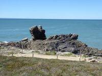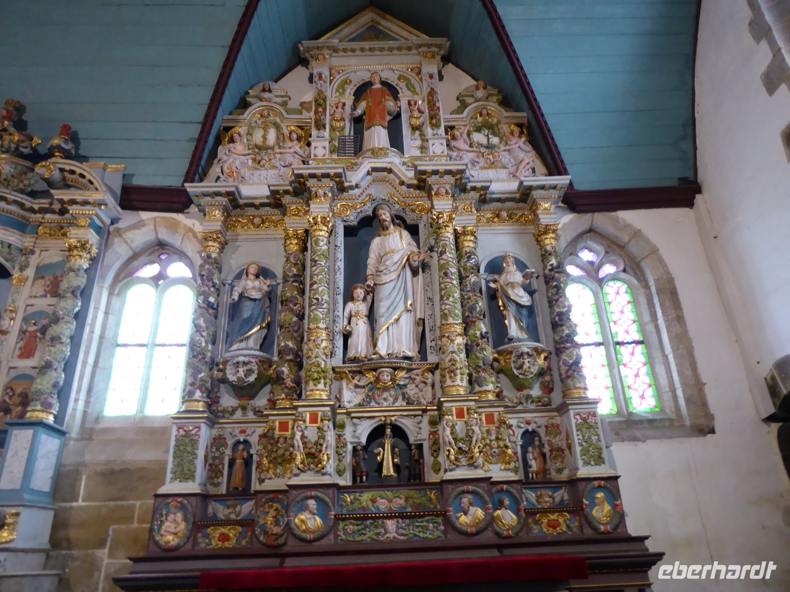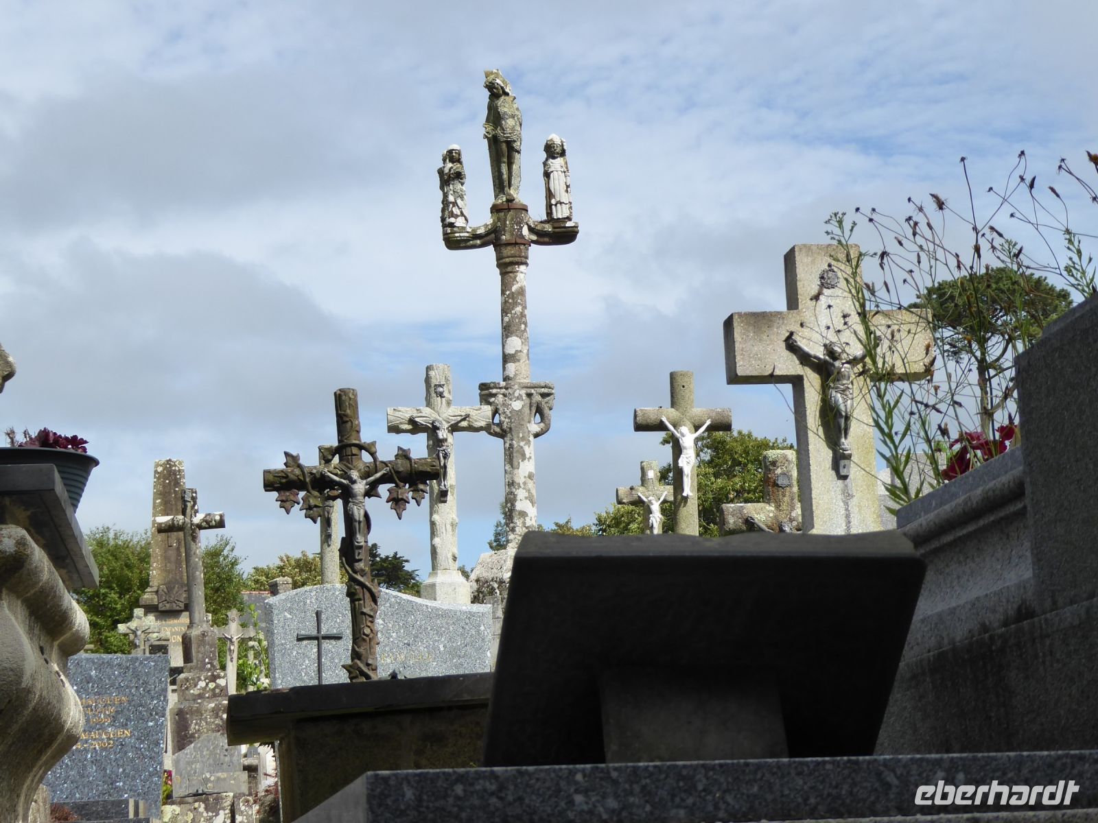 Wenige Kilometer weiter, auf der Halbinsel Penmarch steht in Tronoën der älteste der Kalvarienberge der Bretagne. Auf einem Plateau über dem Meer wurde bereits um 1400 eine kleine Kapelle, die gerne die Kathedrale der Dünen genannt wird, errichtet und wenig später mit über einhundert, ursprünglich wohl bunt bemalten, Figuren verziert, die das Leben Christi darstellen. Vermutlich befand sich bereits in der Vorgeschichte hier eine Kultstätte - eine Quelle findet sich noch immer in unmittelbarer Nähe. Unser Weg führt uns zu den Dünen und, die Ebbe ausnutzend, spazieren wir barfuß über den Strand. Die meisten Wassersportler waren in Neopren gewandert, und so richtig einladend war das Wasser des Atlantik mit seinen maximal 19° Wassertemperatur wirklich nicht. Nur eine verwegene Schwimmerin unserer Gruppe, im kalten Wasser der Ostsee gestählt, wagte sich ins kühle Nass. Der Rest der Gruppe genoss die kostenlose Thalasso-Therapie für Körper und Seele! Doch am Strand trafen wir auch auf steinerne Zeugnisse der jüngeren Vergangenheit. Wie von Teufels Hand geworfene Würfel liegen die Bunker des Atlantikwalles am Strand und auf der Pointe de la Torche findet sich der in Beton gegossene Größenwahn der deutschen Heeresführung neben einem Megalithgrab der Jungsteinzeit. Bis zum Leuchtturm von Eckmühl wetteifern bizarre Felsformationen, mit tosender Gischt zu ihren Füßen und buhlen im smaragdblauen Wasser um die Gunst der Fotografen. Auch die am Meerfenchel klebenden Schnirkelschnecken boten ein schönes Fotomotiv und förderten längst vergessen geglaubte Kinderreime wieder zu Tage! In der kleinen Kirche Notre-Dame de la Joie hängen bunte Votivschiffe von der hölzernen Decke und erinnern daran, dass seit jeher das Meer gleichzeitig Segen und Fluch war. Entlang des Weges warnen auch immer wieder große Schilder vor der „sterblichen Gefahr“ in den Wellen. Nach gut zwölf Wanderkilometern freuten wir uns alle wieder unseren blauen Bus zu erblicken! Zum Abendessen fanden wir uns alle wieder zusammen in einer kleinen Crêperie in Quimper und ließen uns mit leckeren Galettes und viel Cidre verwöhnen.