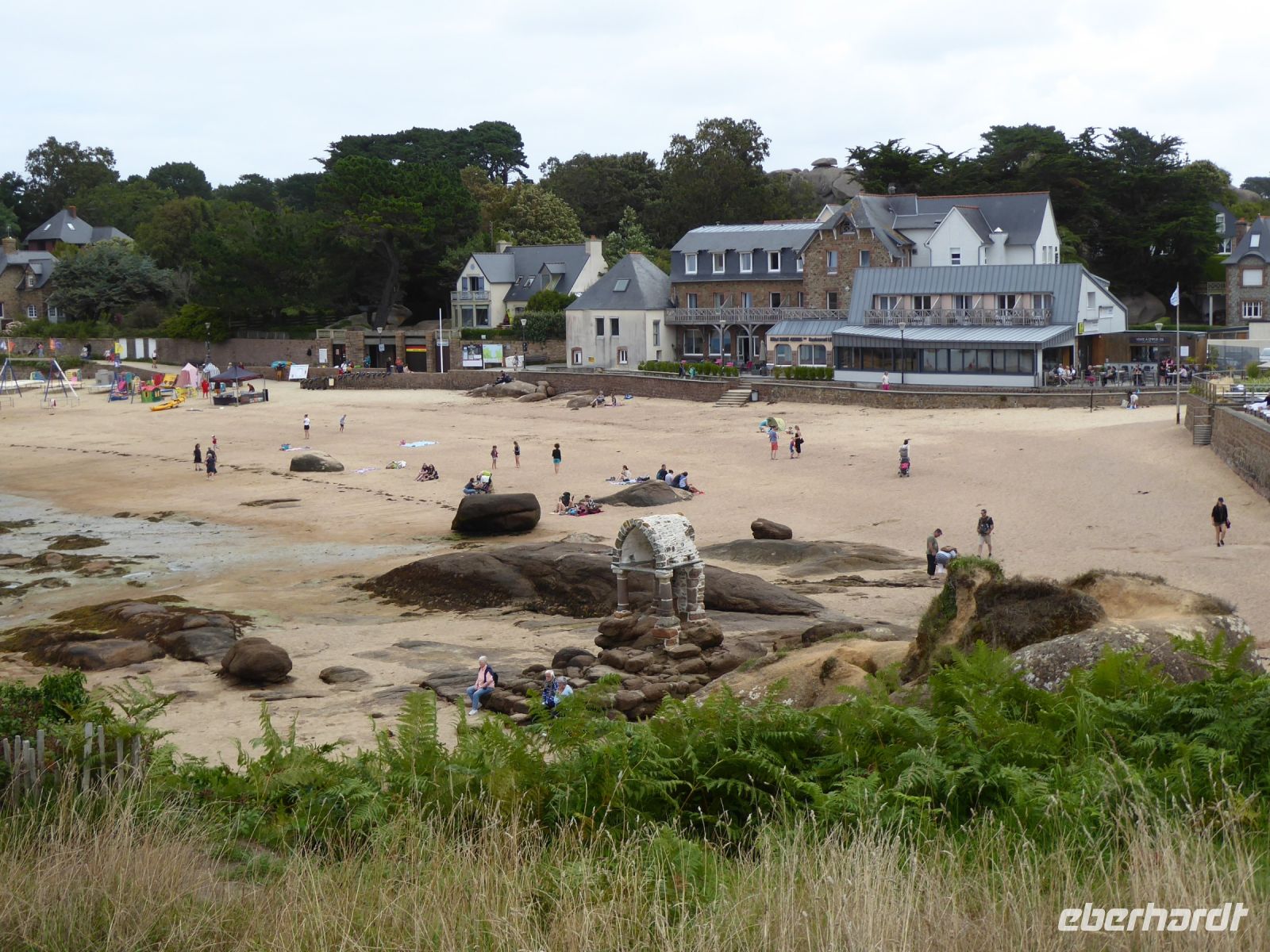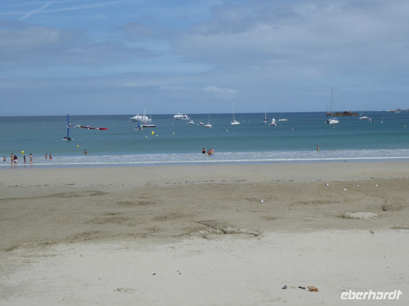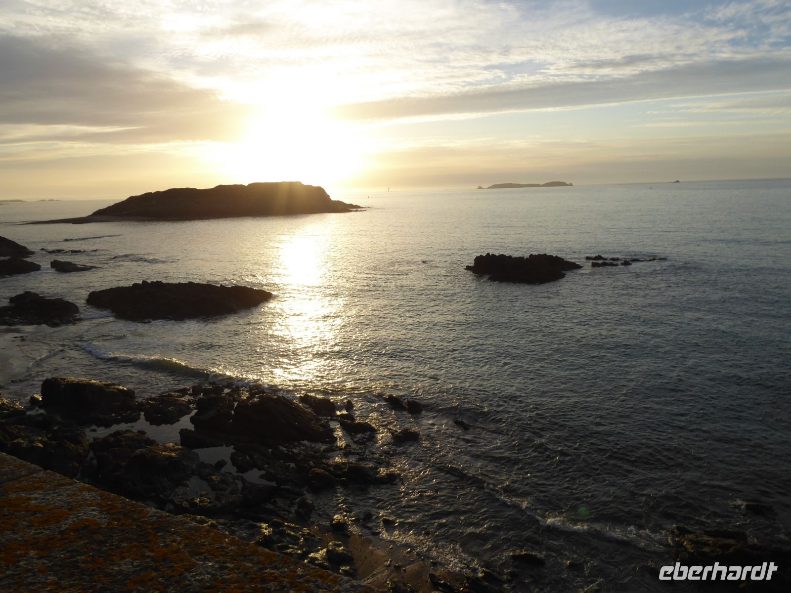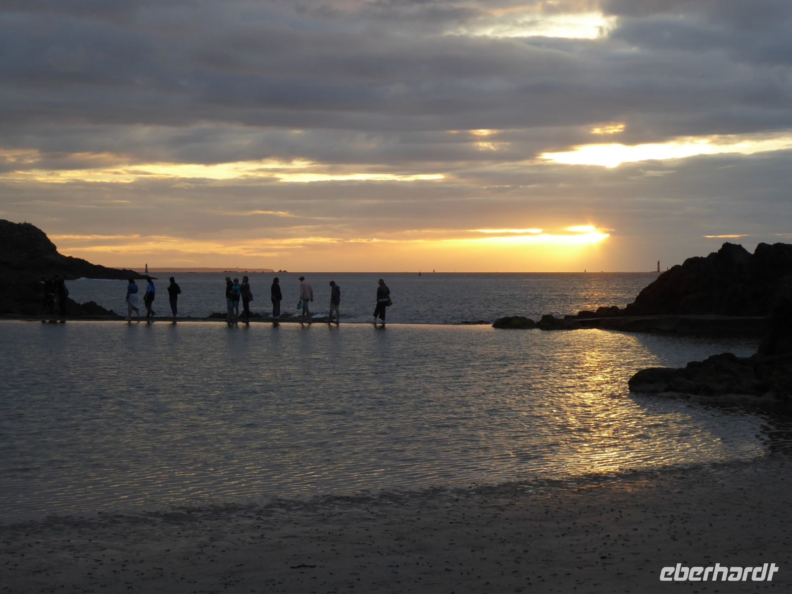 Heute stand die Wanderung zu dem vielleicht schönsten Abschnitt unserer Reise an. Bei herrlichem Wetter und angenehmen Temperaturen knapp unter 25° wanderten wir den Weg am Strand entlang, den das Meer erst vor kurzer Zeit freigegeben hat. Um dem zähen Schlamm zu entkommen, mussten wir eine kleine Klettertour über die Wellenbrecher auf uns nehmen. Durch die eleganten Villenviertel von Trégastel, vorbei an den Kapitänshäusern und den beiden Wassermühlen von Ploumanac´h erreichten wir den kleinen Stausee, wo das Traouiero Tal abzweigt, das im sechsten Band der Romane um Kommissar Dupin, 'Bretonisches Leuchten', eine wichtige Rolle spielt. Hier beginnt der geologisch interessanteste Teil der Route. Vor 300 Millionen Jahren sind diese Steine entstanden, die, wie von Riesenhand geworfen, bizarre Formationen bilden. Bei der Interpretation der Gebilde sind keine Grenzen gesetzt: neben einem großen Stapel Crêpes sitzt ein Papagei und sieht das nicht aus wie ein Schwarzwälder Bollenhut? Und da hinten, ist das nicht ein riesiger Igel? Sogar das markante Profil Gérard Depardieus ist in den Formationen zu entdecken! Wir gingen über den alten Zöllner- und Schmugglerpfad, der uns immer wieder herrliche Ausblicke auf das Meer und die vorgelagerten Inselchen bot. Mitten am Strand von Ploumenac´h, steht ein kleines Oratorium mit der Statue des Heiligen Guirec. Eine Nadel in seine Nase gestochen, soll heiratswilligen jungen Mädchen einen Ehemann bescheren. Kein Wunder, bei der Beanspruchung, dass die alte Holzstatue längst in massiven Stein ausgetauscht wurde. Am Leuchtturm Men Ruz angekommen, kletterten wir über die blanken Felsen, an die gewaltige Wellen donnerten. Das große Gebäude neben dem Leuchtturm wurde 1903 für den Sohn von Gustav Eiffel errichtet und steht derzeit zum Verkauf. Leider verschlechterte sich das Wetter mit kurzen aber kräftigen Schauern, vor denen wir im Maison Littoral Schutz fanden. Kurze Zeit später schien wieder die Sonne und wir wanderten weiter entlang dieser sensiblen Küstenlandschaft, die schon mehrere Ölkatastrophen zu verkraften hatte. Die Spuren der Havarie der Amoco Cadiz 1978 sind noch immer zu sehen. Die weitere Wanderung war ein einziges Spiel der Farben: der rosa Granit, der tiefblaue Himmel, das Smaragdgrün des Meeres, dunkelgrüne Koniferen, Palmen, wilde leuchtend orangefarbene Montbretien und dazu die blau-violett blühenden Hortensien. Wir wanderten durch schattige Laubengänge weiter und gut eine Stunde später erreichte unsere starke Wandergruppe den herrlich weißen Sandstrand von Trestraou. Der Strand lud ein zum Verweilen und so verbrachten wir unsere Zeit mit Sonnenbaden, Strandlaufen und Eisessen, bevor es wieder Zeit wurde, den Bus zu besteigen. Leichte Wellen umspülten die Mauern der kleinen Korsarenstadt St. Malò, die wir am frühen Abend erreichten. Das Hotel Univers liegt mitten in der Altstadt am Festungsring und die engen Gassen laden zu Entdeckerspaziergängen ein. Die 1,8 Kilometer lange Stadtmauer schließt die Altstadt intra muros ein, durchbrochen nur von eindrucksvollen Stadttoren. Von oben hat man einen fantastischen Blick einerseits auf die imposanten Gebäude der Stadt und andererseits auf die vorgelagerten Inseln und Felsen, die bei Ebbe langsam aus dem smaragdgrünen Wasser emporsteigen. Das Fort National, Teil der Verteidigungsanlagen Vaubans, war gerade zu Fuß zu erreichen und wir erlebten nach dem Abendessen im Hotel Chateaubriand in stimmungsvollem Ambiente des Fin de Siècle, einen fantastischen Sonnenuntergang.