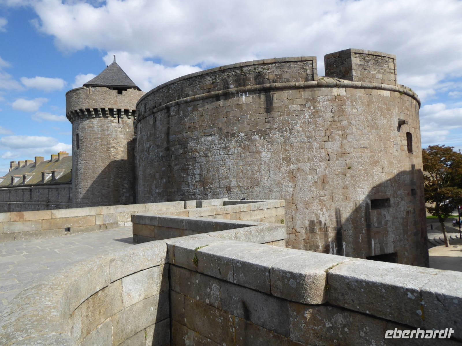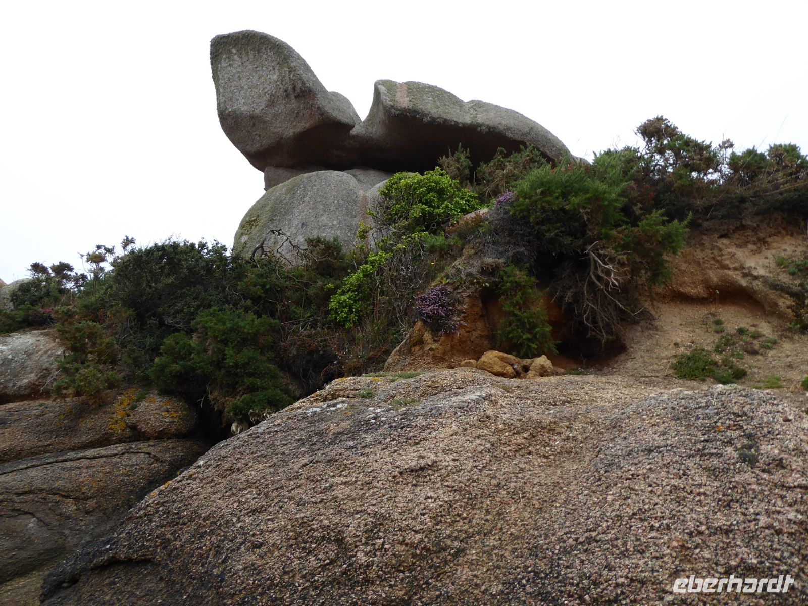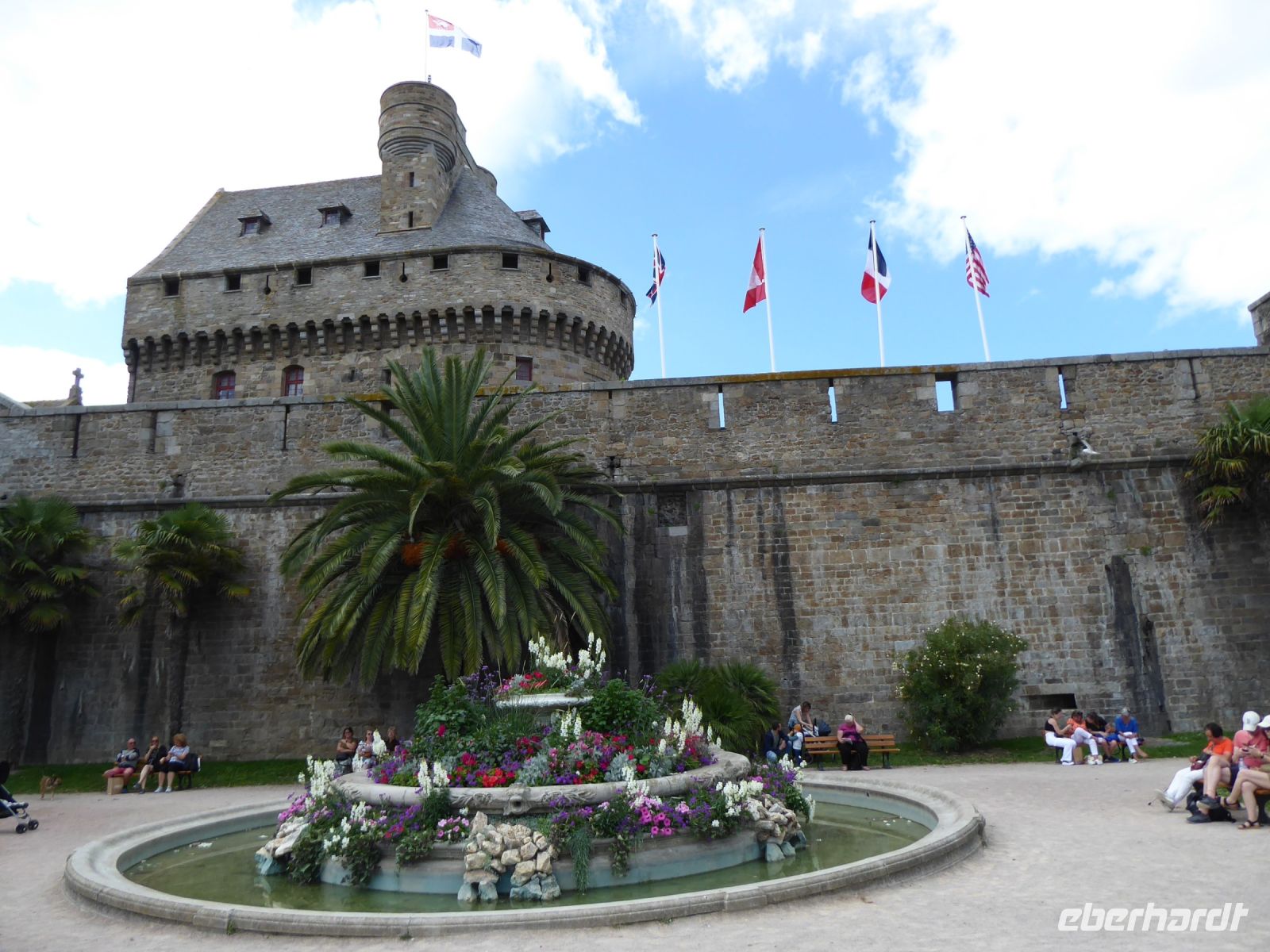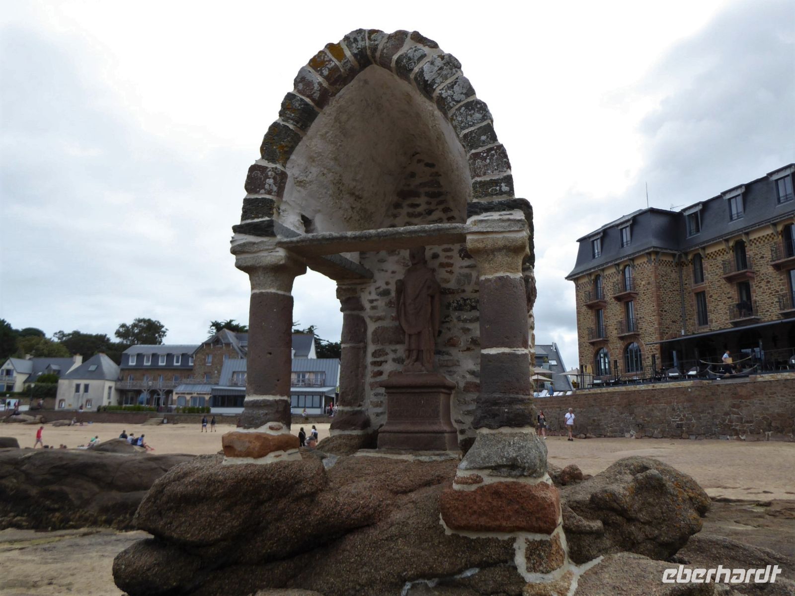 Heute stand die Wanderung zu dem vielleicht schönsten Abschnitt unserer Reise an. Bei herrlichem Wetter und angenehmen Temperaturen knapp unter 25° wanderten wir den Weg am Strand entlang, den das Meer erst vor kurzer Zeit freigegeben hat. Um dem zähen Schlamm zu entkommen, mussten wir eine kleine Klettertour über die Wellenbrecher auf uns nehmen. Durch die eleganten Villenviertel von Trégastel, vorbei an den Kapitänshäusern und den beiden Wassermühlen von Ploumanac´h erreichten wir den kleinen Stausee, wo das Traouiero Tal abzweigt, das im sechsten Band der Romane um Kommissar Dupin, 'Bretonisches Leuchten', eine wichtige Rolle spielt. Hier beginnt der geologisch interessanteste Teil der Route. Vor 300 Millionen Jahren sind diese Steine entstanden, die, wie von Riesenhand geworfen, bizarre Formationen bilden. Bei der Interpretation der Gebilde sind keine Grenzen gesetzt: neben einem großen Stapel Crêpes sitzt ein Papagei und sieht das nicht aus wie ein Schwarzwälder Bollenhut? Und da hinten, ist das nicht ein riesiger Igel? Sogar das markante Profil Gérard Depardieus ist in den Formationen zu entdecken! Wir gingen über den alten Zöllner- und Schmugglerpfad, der uns immer wieder herrliche Ausblicke auf das Meer und die vorgelagerten Inselchen bot. Mitten am Strand von Ploumenac´h, steht ein kleines Oratorium mit der Statue des Heiligen Guirec. Eine Nadel in seine Nase gestochen, soll heiratswilligen jungen Mädchen einen Ehemann bescheren. Kein Wunder, bei der Beanspruchung, dass die alte Holzstatue längst in massiven Stein ausgetauscht wurde. Am Leuchtturm Men Ruz angekommen, kletterten wir über die blanken Felsen, an die gewaltige Wellen donnerten. Das große Gebäude neben dem Leuchtturm wurde 1903 für den Sohn von Gustav Eiffel errichtet und steht derzeit zum Verkauf. Leider verschlechterte sich das Wetter mit kurzen aber kräftigen Schauern, vor denen wir im Maison Littoral Schutz fanden. Kurze Zeit später schien wieder die Sonne und wir wanderten weiter entlang dieser sensiblen Küstenlandschaft, die schon mehrere Ölkatastrophen zu verkraften hatte. Die Spuren der Havarie der Amoco Cadiz 1978 sind noch immer zu sehen. Die weitere Wanderung war ein einziges Spiel der Farben: der rosa Granit, der tiefblaue Himmel, das Smaragdgrün des Meeres, dunkelgrüne Koniferen, Palmen, wilde leuchtend orangefarbene Montbretien und dazu die blau-violett blühenden Hortensien. Wir wanderten durch schattige Laubengänge weiter und gut eine Stunde später erreichte unsere starke Wandergruppe den herrlich weißen Sandstrand von Trestraou. Der Strand lud ein zum Verweilen und so verbrachten wir unsere Zeit mit Sonnenbaden, Strandlaufen und Eisessen, bevor es wieder Zeit wurde, den Bus zu besteigen. Leichte Wellen umspülten die Mauern der kleinen Korsarenstadt St. Malò, die wir am frühen Abend erreichten. Das Hotel Univers liegt mitten in der Altstadt am Festungsring und die engen Gassen laden zu Entdeckerspaziergängen ein. Die 1,8 Kilometer lange Stadtmauer schließt die Altstadt intra muros ein, durchbrochen nur von eindrucksvollen Stadttoren. Von oben hat man einen fantastischen Blick einerseits auf die imposanten Gebäude der Stadt und andererseits auf die vorgelagerten Inseln und Felsen, die bei Ebbe langsam aus dem smaragdgrünen Wasser emporsteigen. Das Fort National, Teil der Verteidigungsanlagen Vaubans, war gerade zu Fuß zu erreichen und wir erlebten nach dem Abendessen im Hotel Chateaubriand in stimmungsvollem Ambiente des Fin de Siècle, einen fantastischen Sonnenuntergang.