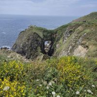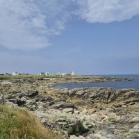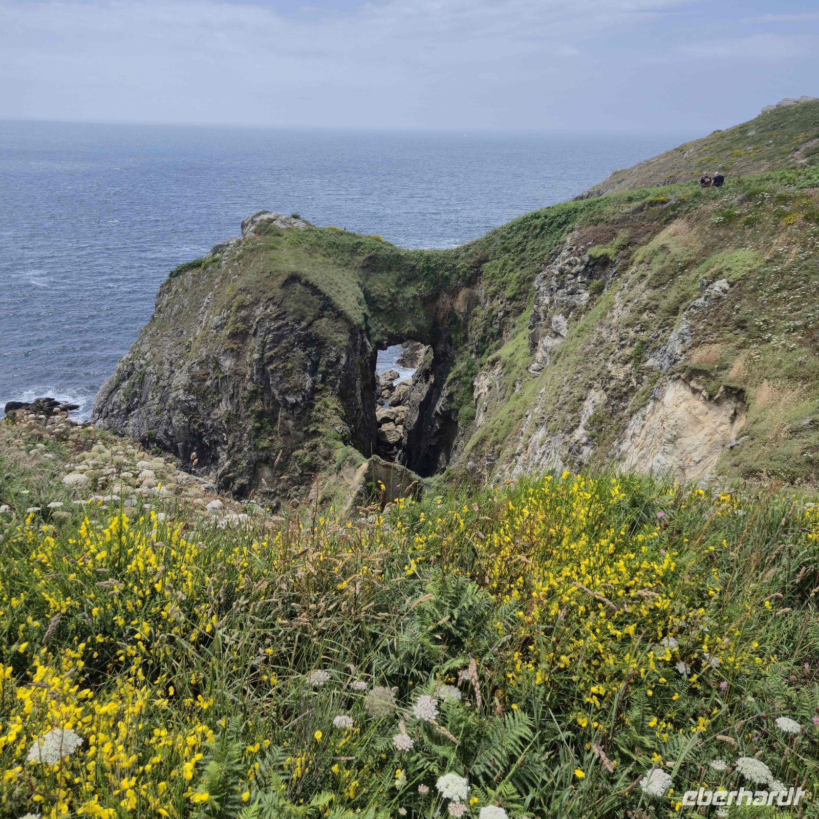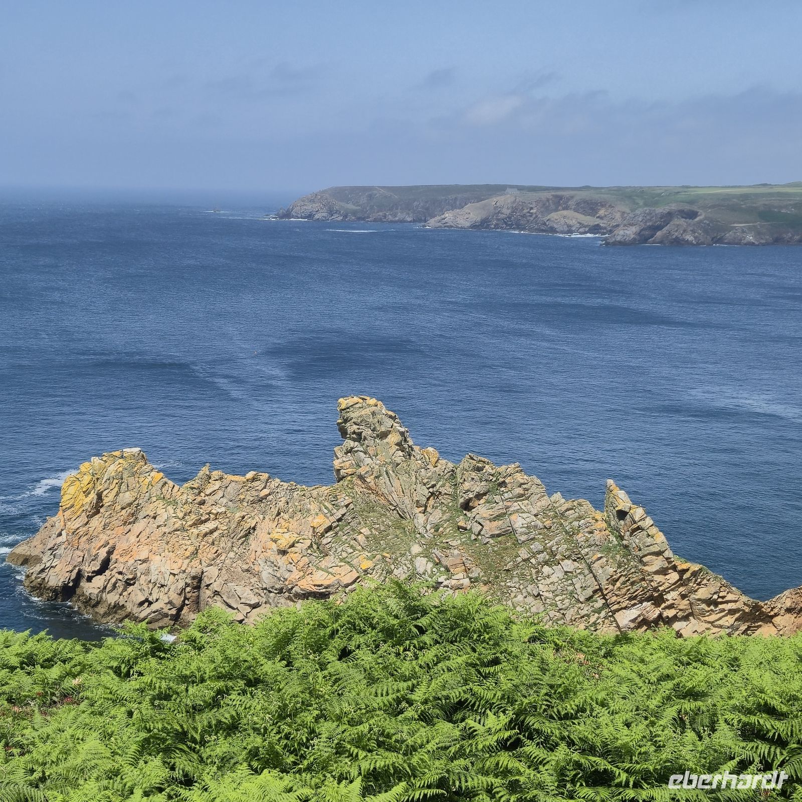 Von dem Kirchlein Notre Dame du Bon Voyage nahe Plogoff begannen wir eine der bemerkenswertesten Wanderungen dieser Reise. Rund 13 Kilometer sind es auf einem Weg entlang der Steilküste um die Pointe du Raz herum (raz ist bretonisch und bedeutet „rasen“, Bezug ist die schnelle Meeresströmung). Das französische „land’s end“ ist ein wildes Kap von 72 m Höhe über dem Meer. Hier führen über schroffe Klippen in einem leichten Auf und Ab die Fernwanderwege E5 und GR 34 herum. Durch Heide und Strandnelken, hoch und herunter, kommt man zunächst zum winzigen Port de Feunteun, der sich für eine Rast anbietet. Das nutzten wir für ein Picknick. Am Kap selbst wimmelt es dann wieder von Kurzzeitbesuchern, die vom Besucherzentrum im Sommer mit einem Pendelbus zum Signalturm gelangen können. Seit einiger Zeit ist hier eine „Grand Site National“ mit besonderem Schutz. Dem musste ein Brei von etlichen Boutiquen und Hotels weichen, leider 1996 auch das kleine Hotel d’Iroise der Mme Le Coz von 1950, was einigen Wirbel in der Presse verursachte. Man bedenke, dass in der Nähe einmal ein Atomkraftwerk entstehen sollte!