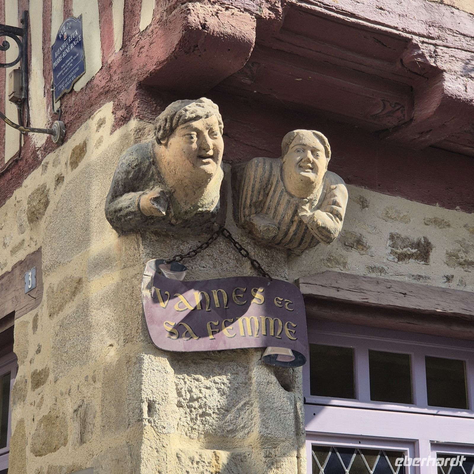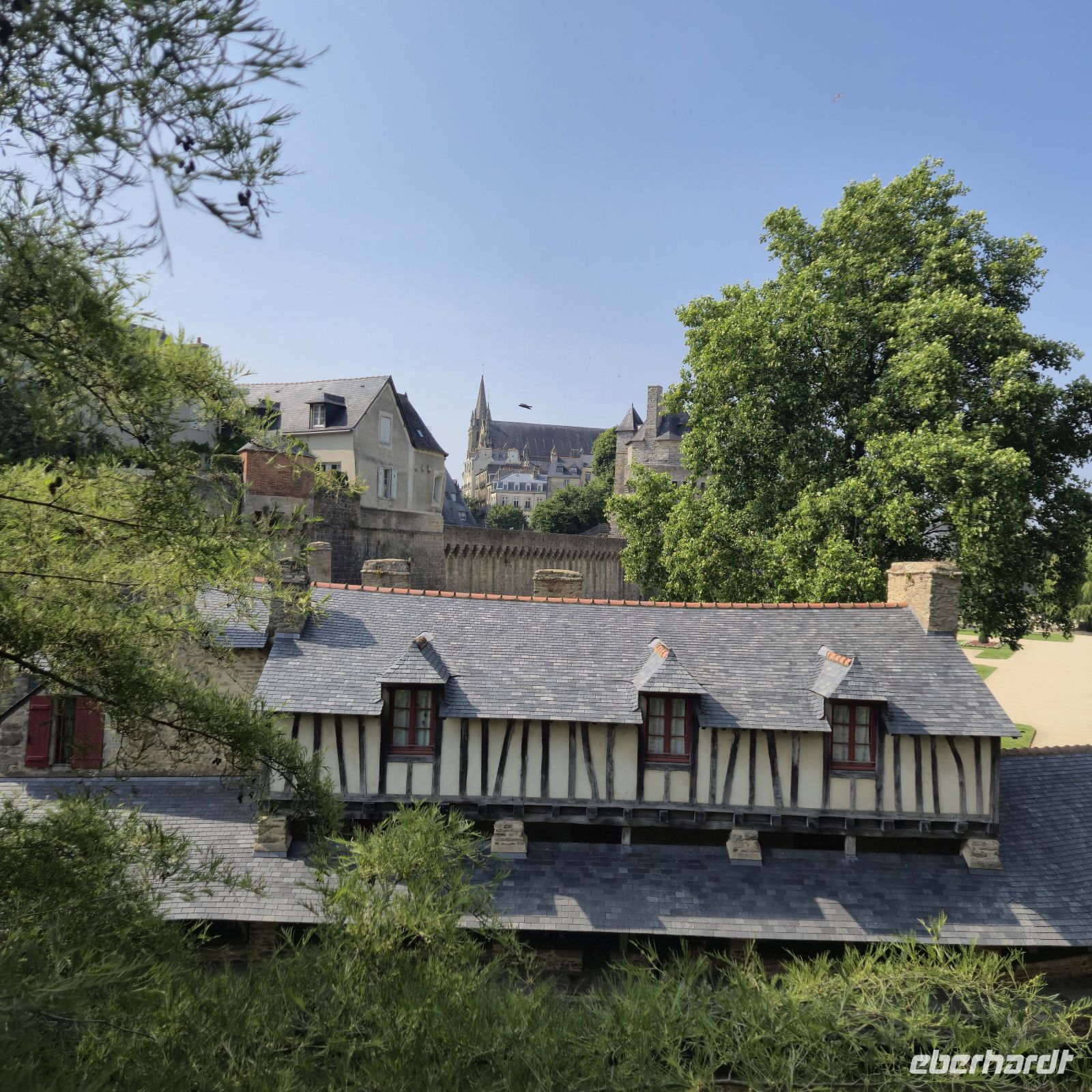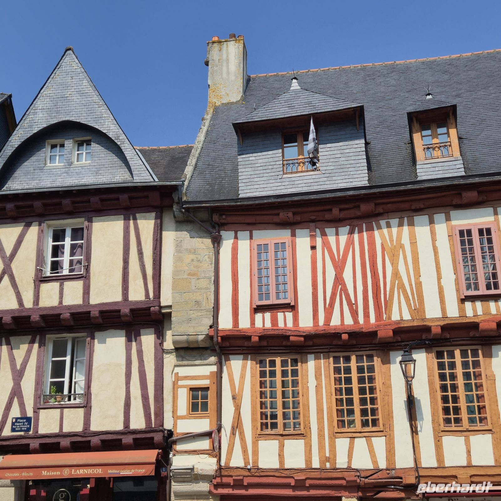 Die Altstadt zieht sich vom kleinen Hafen südlich hinauf. Man geht durch die Porte St.Vincent (den man grüßen sollte) bis zum Altstadtplatz des Lices. Im Osten der Altstadt findet sich die ortsbildprägende Stadtmauer mit der Tour du Connétable und den nahen Waschhäusern. Der Park im französischen Stil, mit dem die Stadtmauer inszeniert wird, wurde in seiner heutigen Form erst in jüngerer Zeit angelegt. Man geht hinauf zu den viel fotografierten Holzfiguren "Vannes et sa femme" und zur Place Valencia, benannt nach der Geburtsstadt des Vincent Ferrer, der hier predigte. Großartige Fachwerkhäuser gibt es vor allen um die Kathedrale, die Bauphasen vom 12. bis 19. Jahrhundert vereint.