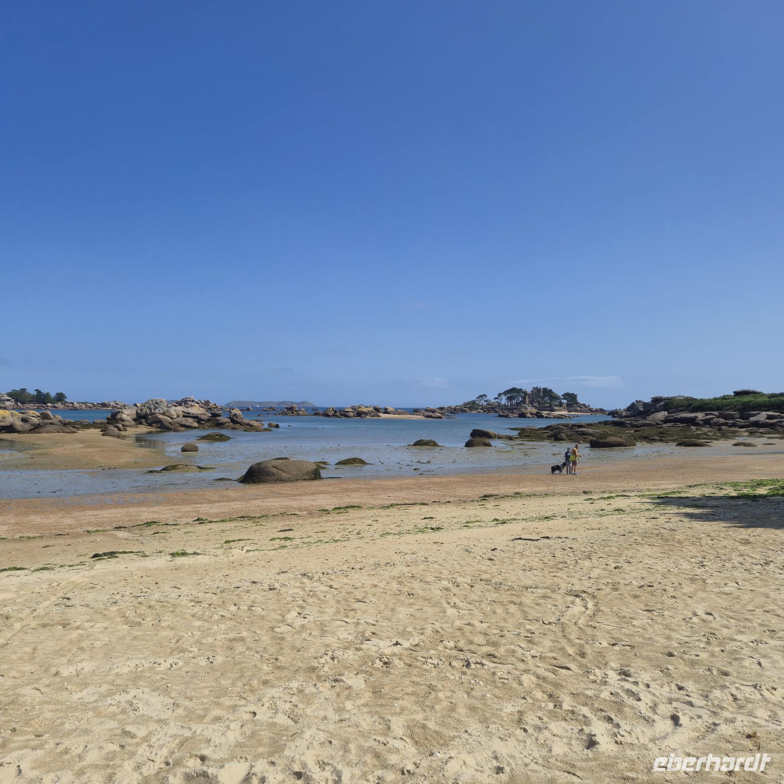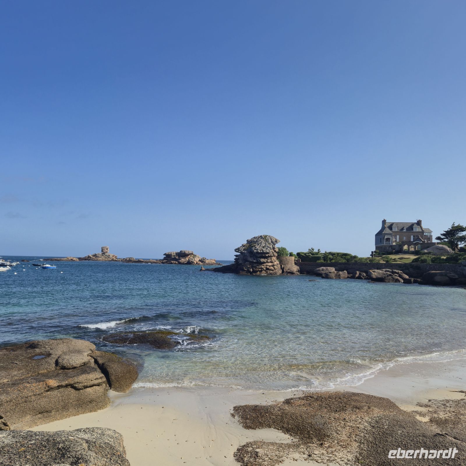 Ein weiterer Höhepunkt dieser Reise war die lange Wanderung von Trégastel entlang der verschlungenen Küstenlinie nach Trestraou. Hier befindet sich die Cote du Granit Rosé, die rosa Granitküste. Unzählige rosa Felsen, die wie zufällig ins Wasser geworfen erscheinen, säumen den Weg, ebenso wie teils kitschige Märchenschlösser. In Trégastel hat man Strandbauten und Meerwasserschwimmbad geschickt in die Felsformationen eingepasst. Der kleine Strand von St. Guirec bezieht seinen Namen auf einen mittelalterlichen Bildstock am Strand zu Ehren des Heiligen. Hier beginnt auch der Zöllnerpfad, der uns kurzweilig zum Strand von Trestraou führte.