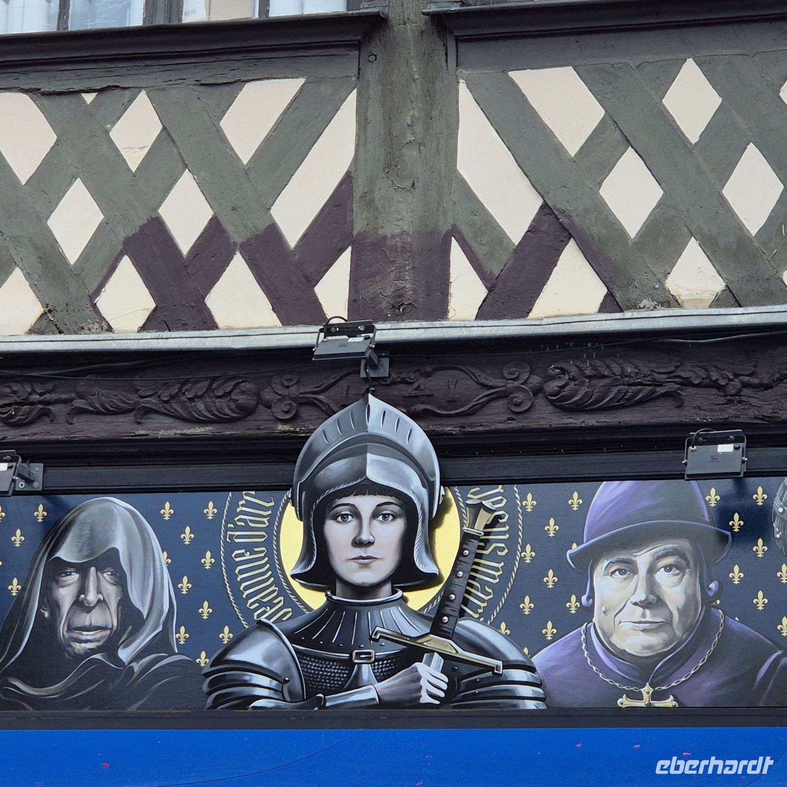 Als im frühen 15.Jh. die Normandie von den Engländern besetzt wurde, ereignete sich die Geschichte von Jeanne d’Arc aus Lothringen, die dem späteren französischen König Karl VII gegen die mit den Engländern verbündeten Burgunder zu Hilfe kam. Sie wurde Weihnachten 1430 bei dem Versuch, das von den Burgundern besetzte Compiègne zu befreien, gefangen genommen. Eigentlich hatte sie längst „abgeschworen“, doch die Engländer kauften ihre Gegnerin für 10.000 Franken, um sie am 30.Mai 1431 auf dem alten Marktplatz hinrichten zu lassen. Sie wurde später nicht nur rehabilitiert, sondern auch heiliggesprochen. Was dieses 19jährige Mädchen angetrieben und so gestärkt hat, dass Mächtige auf sie aufmerksam wurden, ob Gott ihr befahl, - all das bleibt im mythischen Dunkel. Zahlreiche Rezeptionen dieser Geschichte gibt es im Film, Theater, in der Musik, in der Literatur und in Computerspielen.