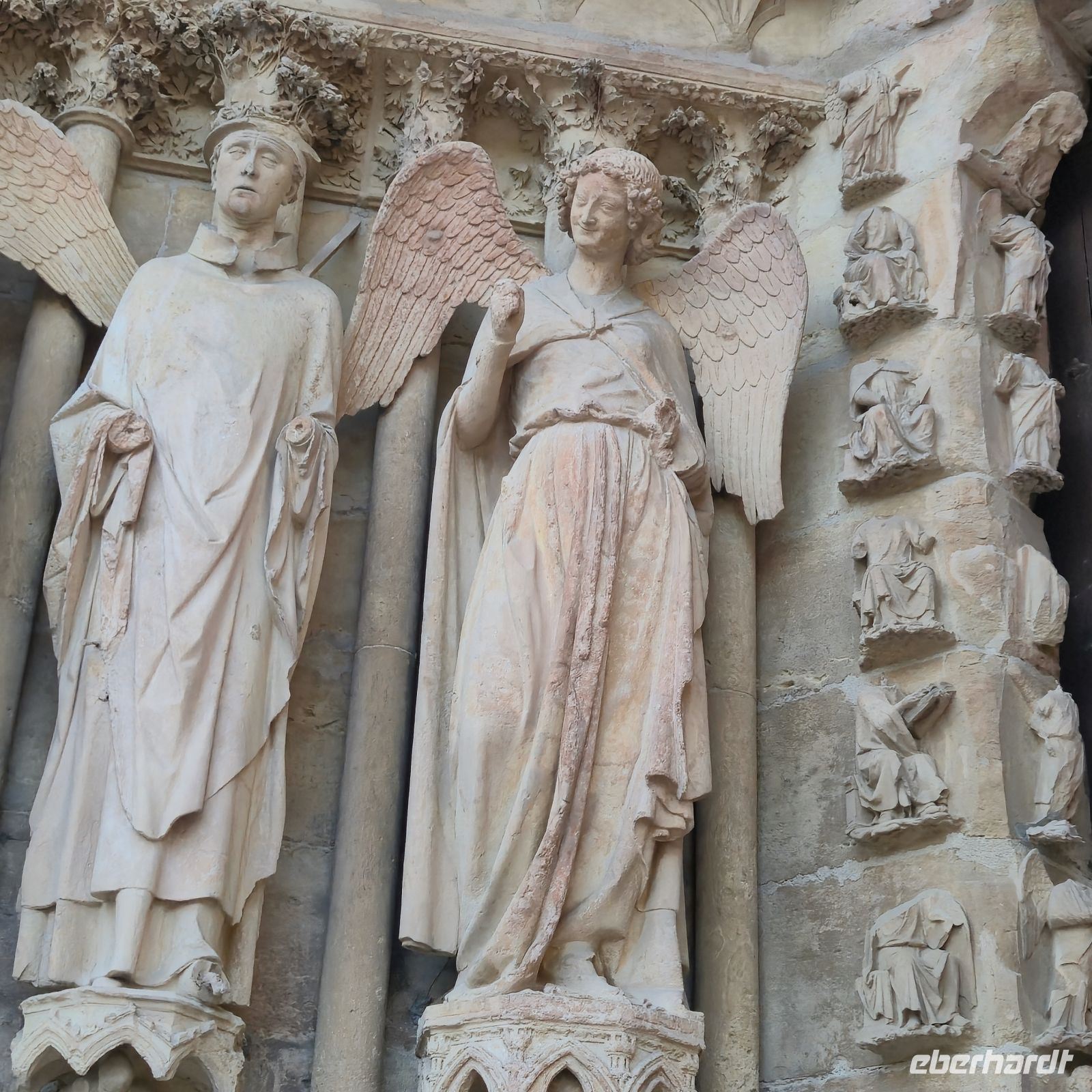 Am Abend gelang es uns nicht, noch in die Krönungs -Kathedrale von Reims zu gelangen, aber nach dem Abendessen hatten doch einige noch die Gelegenheit, wenigstens die Fassade mit ihren bemerkenswerten Figuren in Augenschein zu nehmen. Vor allem der lächelnde Engel ist hier zu nennen, eine der bekanntesten und besten Figuren der Gotik. Aber auch viele andere Figuren hier waren Vorbild für die Bildwerke Straßburgs, Naumburgs und Meissens.