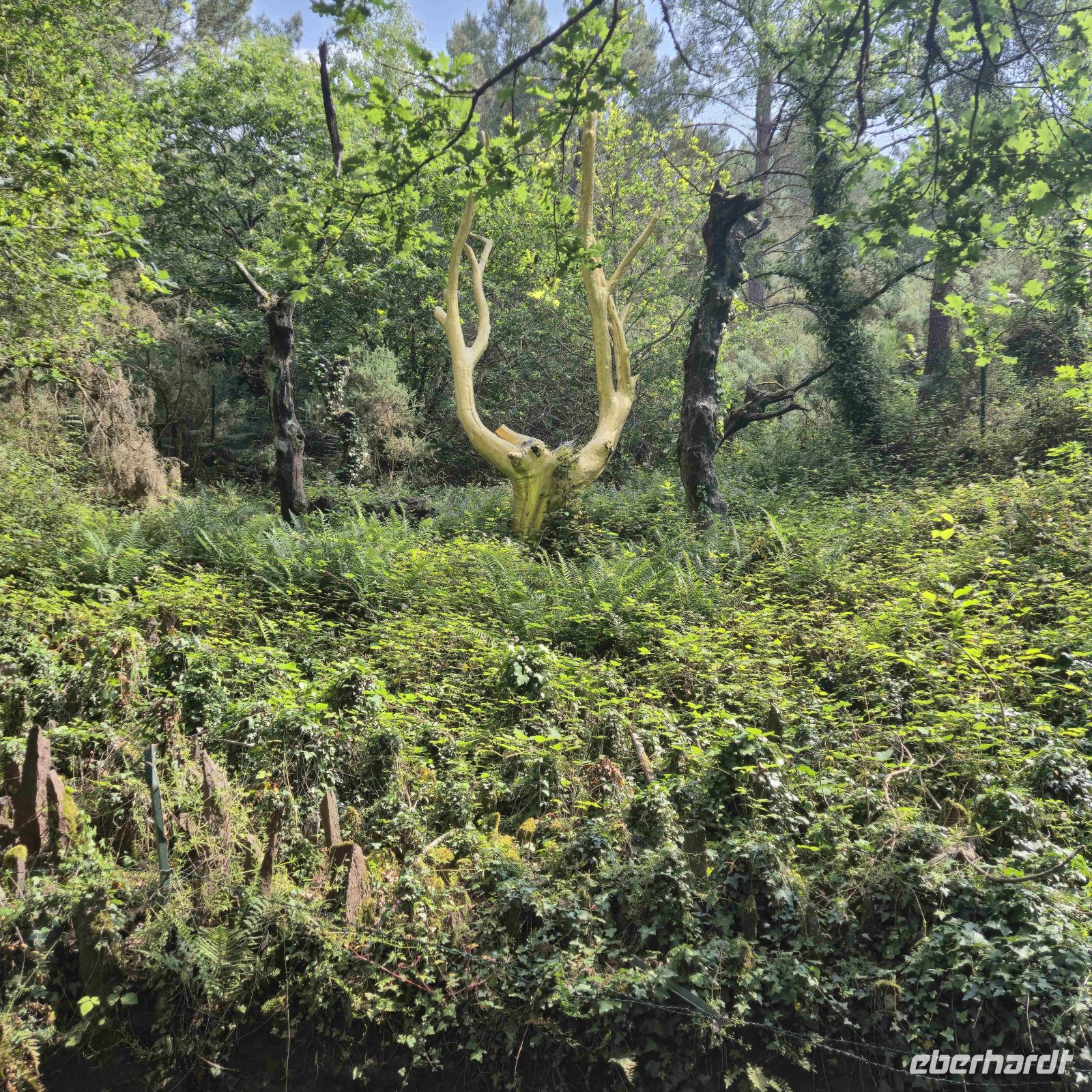 Später starteten wir von der „Église du Graal“ in Tréhorenteuc eine Wanderung von 8 km, die uns zunächst an einem Bächlein entlang führte, das das Val sans Retour (Tal ohne Wiederkehr) formt. Hier befindet sich der „Arbre d’Or“ (der goldene Baum), der uns tatsächlich mit Goldfarbe angestrichen entgegen leuchtete, und der See „Feenspiegel“, in dem Morgane, eine aus Cornwall stammende Prinzessin, Halbschwester von Artus und Schülerin Merlins, ihr Unwesen trieb (treibt?). Die von ihr gefangen gehaltenen untreuen Ritter wurden von Lancelot befreit, der dazu ein ganzes Arsenal an Sinnestäuschungen überwinden musste. Später ging es aus dem romantischen Tal heraus und man musste die Zeugnisse großer Waldbrände zur Kenntnis nehmen. Überraschend tauchte das imposante Wasserschloss Trécesson auf.