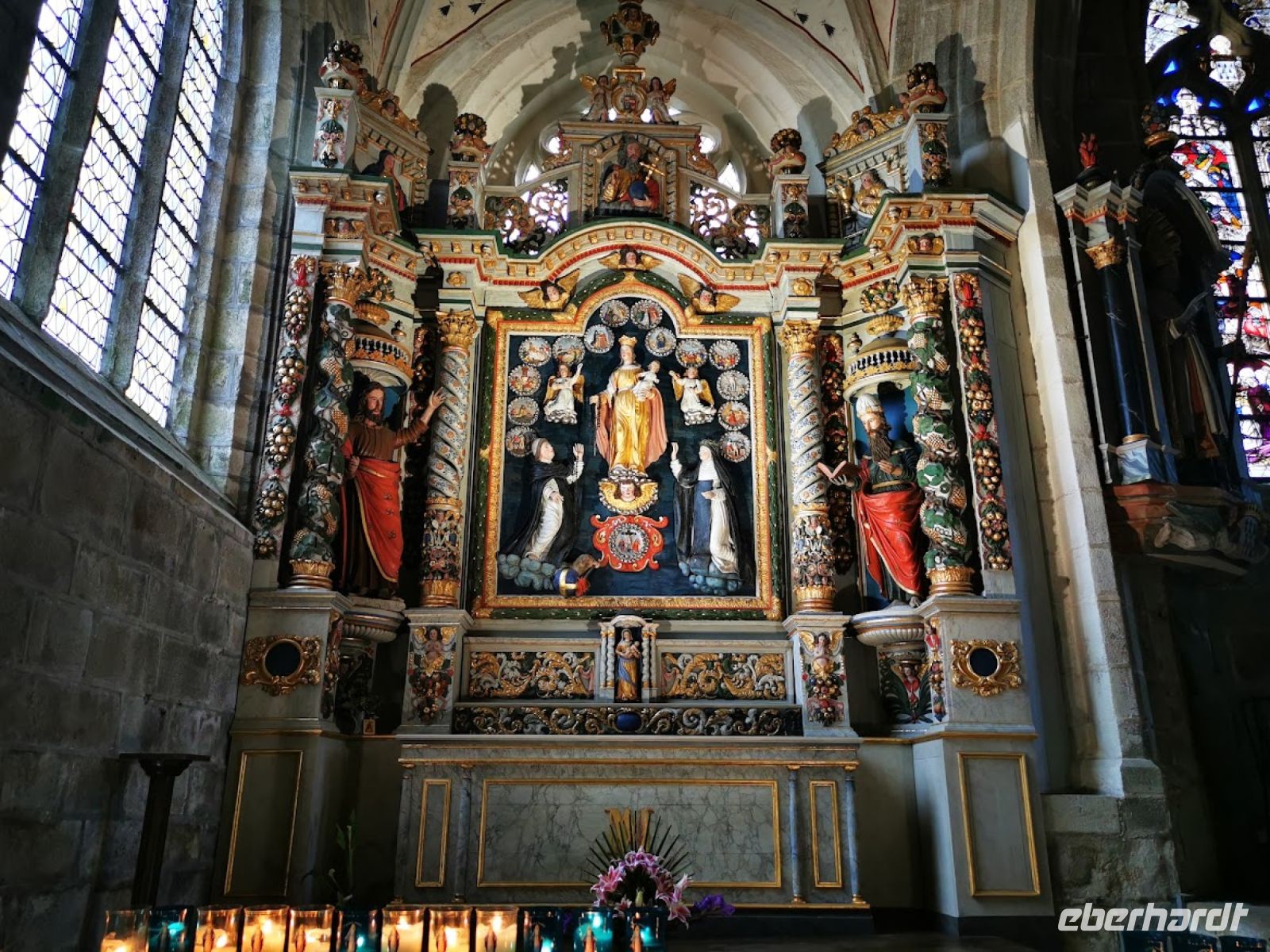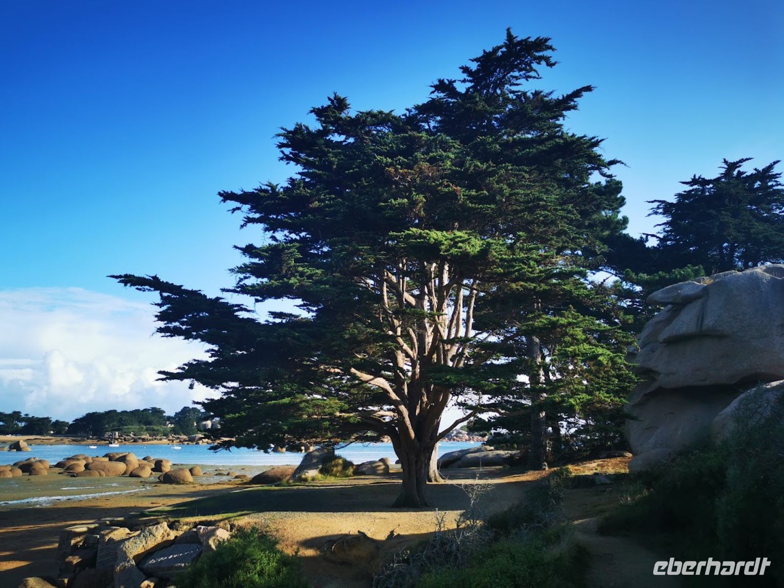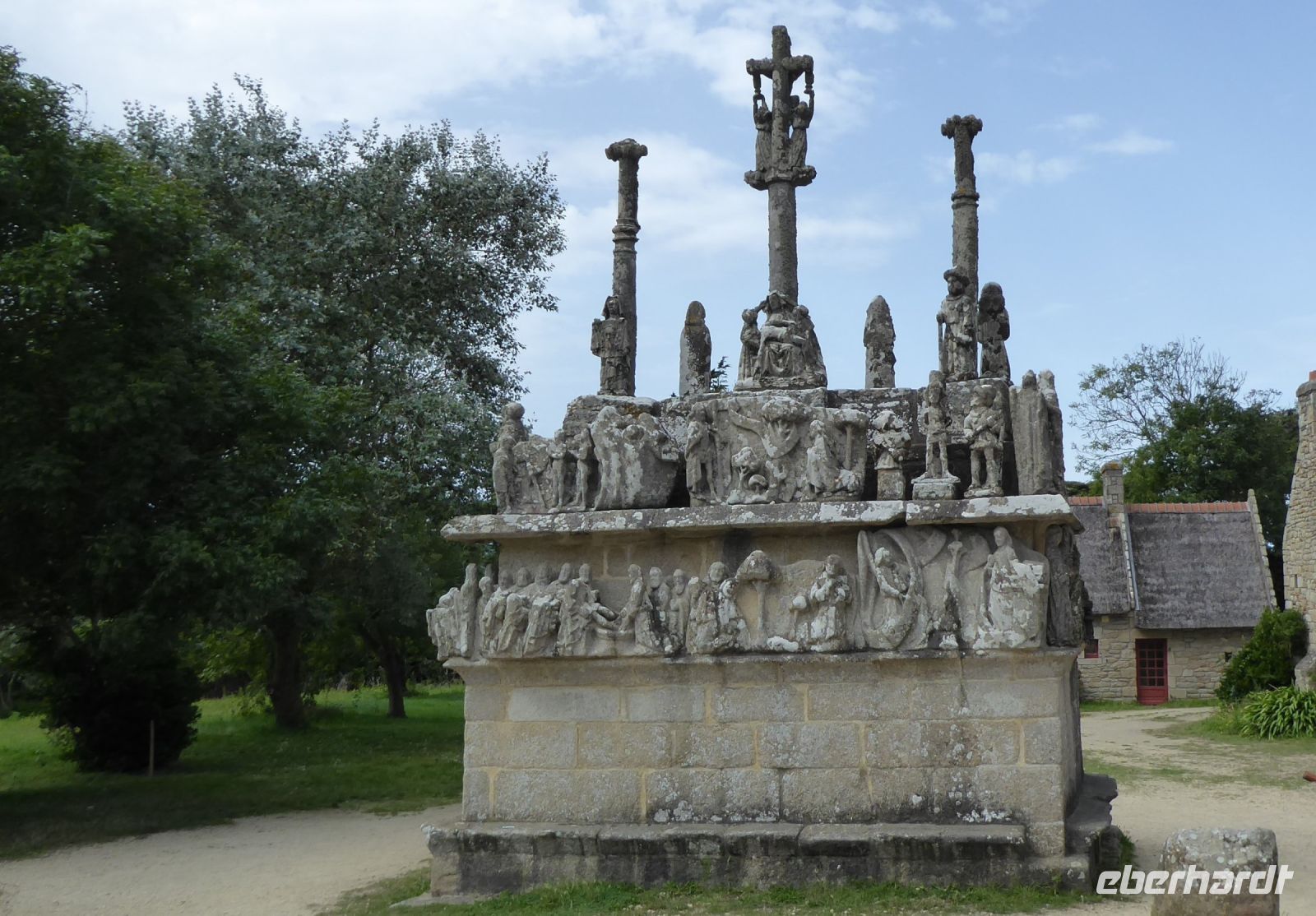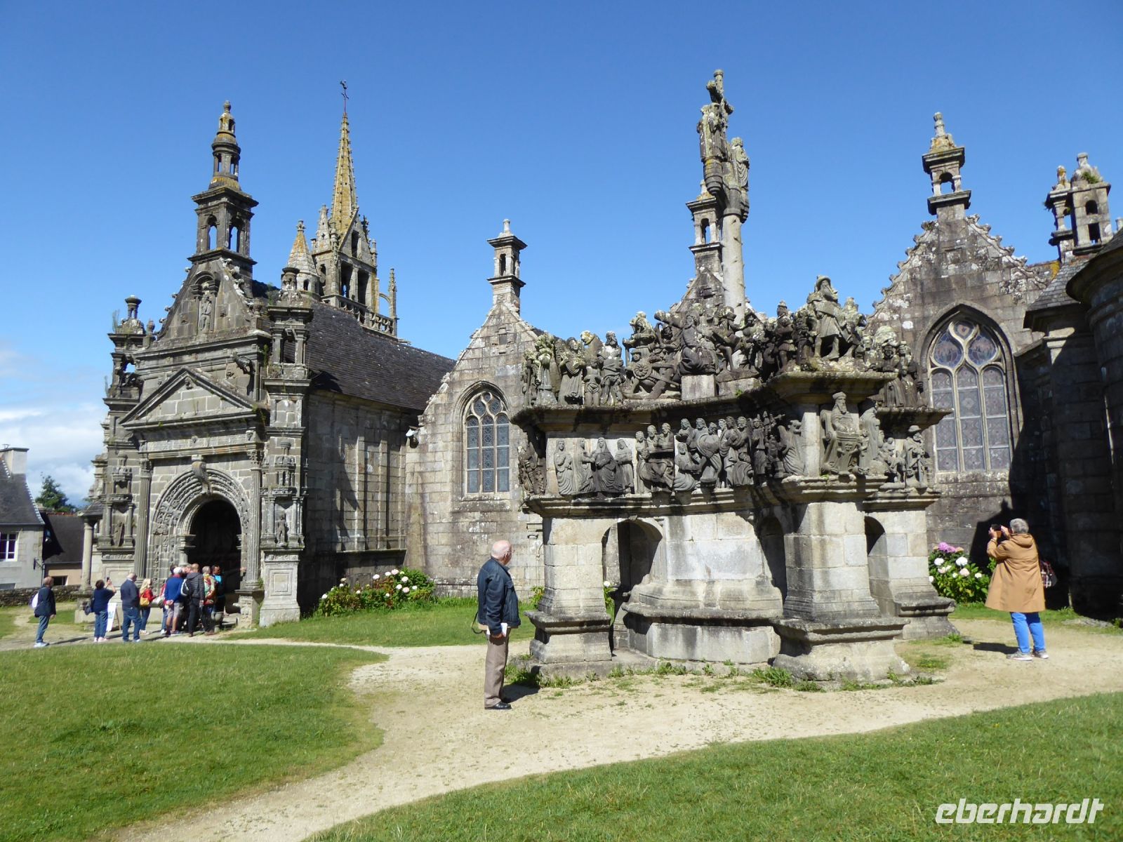 Heute Morgen wollten wir uns noch die Stadt Quimper genauer ansehen. Mit unserer Stadtführerin Yolande verabredeten wir uns an der Kathedrale. Ähnlich wie Rom liegt Quimper auf sieben Hügeln. Drei Flüsse treffen sich hier und bis zum Meer sind es nur wenige Kilometer. Wir bummelten durch die Gassen der Altstadt und bestaunten die schönen alten Fachwerkhäuser, den Buttermarkt mit seinen netten Crêperien und natürlich die Kathedrale Sankt Corentin. Mehr als 600 Jahre mussten vergehen bis das Gotteshaus seine heutige Gestalt erhielt. Noch vor der Führung hatten wir die Chance einen kurzen Blick ins Innere zu werfen. Auffallend dabei ist der leicht abgeknickt gebaute Chor, der viel Platz für Spekulationen lässt und in dieser Form baugeschichtlich einzigartig ist. Im Chorumgang beeindruckten uns die bunten Glasfenster, darunter auch moderne Arbeiten der in Paris lebenden ungarischen Künstlerin Anna Stein. Mit Yolande schlenderten wir durch den wunderschönen Garten des Friedens mit seinen mediterranen Pflanzen. Riesige Palmen, Bananenstauden und blühender Ingwer entrückten uns von Zeit und Ort. Yolande würzte uns die Geschichte der Stadt, die die Hauptstadt der Cornouaille ist, mit vielen Details und lustigen persönlichen Anekdoten. Wer hätte gedacht, dass sowohl der Dichter Max Jacob, wie auch René Laennec, der Erfinder des Stethoskops sowie Alexandre Massé, der Erfinder des Vierlochknopfes in Quimper geboren wurden!? Unsere nächste Station auf dem Weg in den Norden war der umfriedete Pfarrbezirk im Guimiliau. Die Umfassungsmauer, das Triumphtor, die Kirche, das Beinhaus und der Kalvarienberg mit seiner unglaublichen Anzahl von über 200 Figuren gehören zu den schönsten Anlagen dieser Art in der Bretagne. Die Entstehungszeit des einzigartigen Ensembles datiert ins sechzehnte Jahrhundert. Es ist ein lebendiges Zeugnis der Volksfrömmigkeit der Region. Ein paar Straßenkilometer und viele Kreisel weiter erreichten wir in Trégastel wieder das Meer. Gemütlich spazierten wir um die Halbinsel Renote, die mit bizarren Felsformationen, wunderschönen Anwesen und einem herrlichen Strand punktet. Inmitten der Jahrmillionen alten Steine der rosa Granitküste hatten wir die schönsten Ausblicke auf das Meer und auf die umgebenden Inseln, darunter auch auf die Insel Costaèrés. Das neugotische Schloss auf der kleinen Insel wurde von dem polnischen Mathematiker und Erfinder Bruno Abdank-Abakanowicz Ende des neunzehnten Jahrhunderts erbaut und wurde zum Zentrum der polnischen Immigranten. Darunter auch Henryk Sienkiewicz, der hier seinen 1895 veröffentlichten Roman „Quo vadis“ verfasste. Die kleine Insel samt ihrer Gebäude erwarb 1988 der deutsche Schauspieler und Kabarettist Didi Hallervorden als Zweitwohnsitz. Nach unserer Wanderung stand der Besuch einer Whiskey Destillerie auf dem Programm. Vor fünfunddreißig Jahren wurde die Idee, in der Bretagne Whisky herzustellen, von der Brennerei Warenghem umgesetzt. Die edlen Brände haben längst einen festen Platz in der Branche und genießen bei Kennern einen guten Ruf. Leider ist der Betrieb stark kommerzialisiert und nicht mehr auf Busgruppen angewiesen. So kauften wir ein paar Fläschchen der edlen Brände, die wir im gemütlichen Garten des Hotel Kyriad in Lannion ganz für uns allein verkosteten. In entspannter Atmosphäre ließen wir den Abend ausklingen.