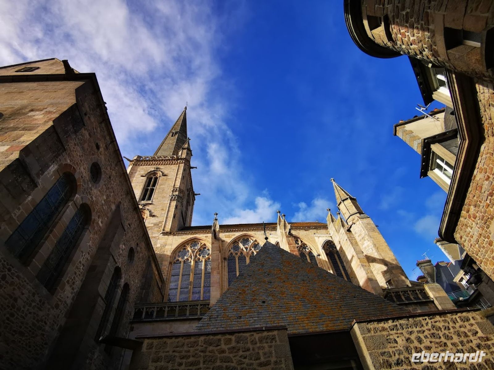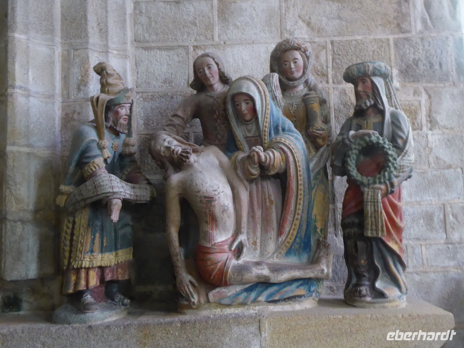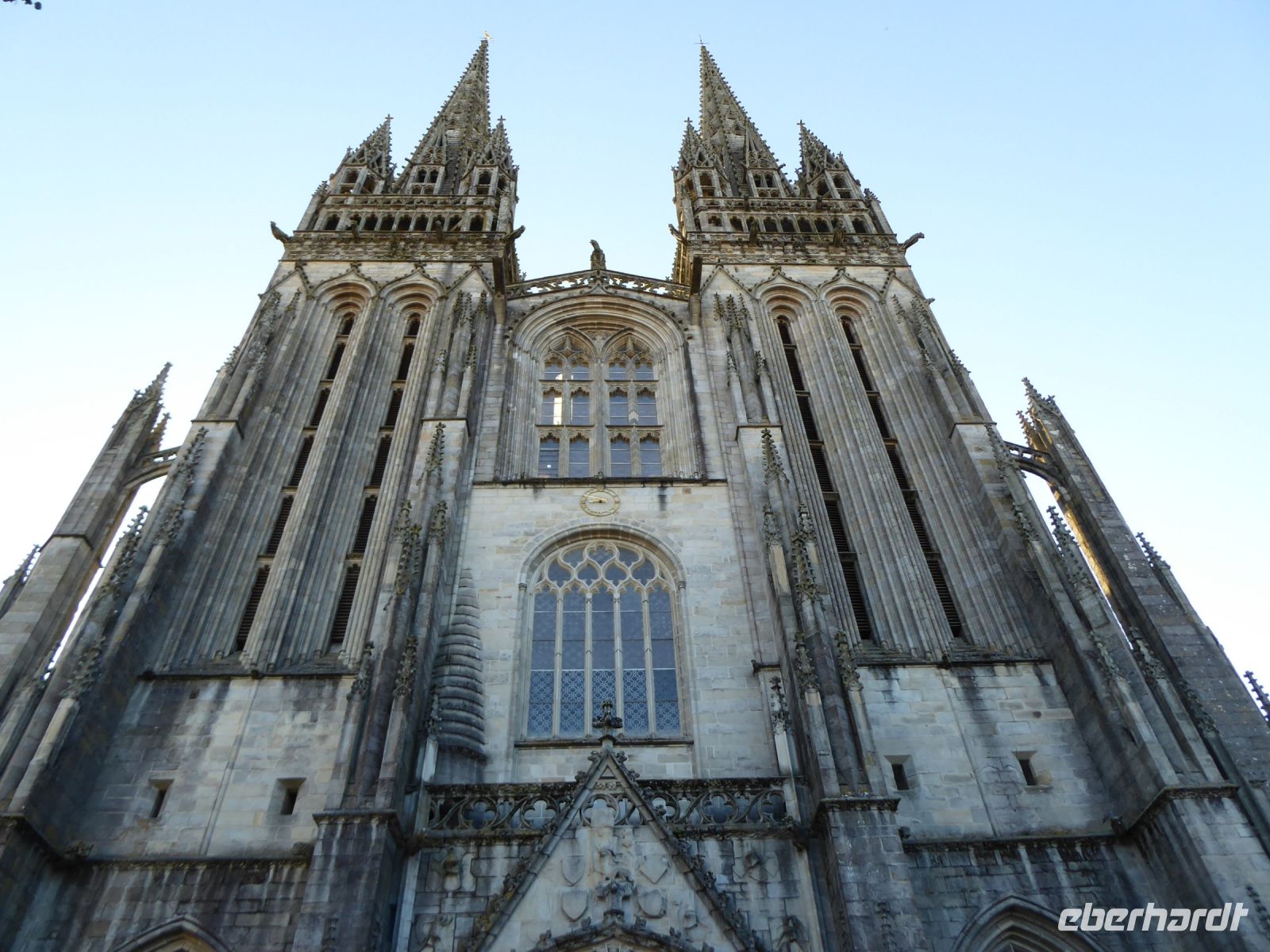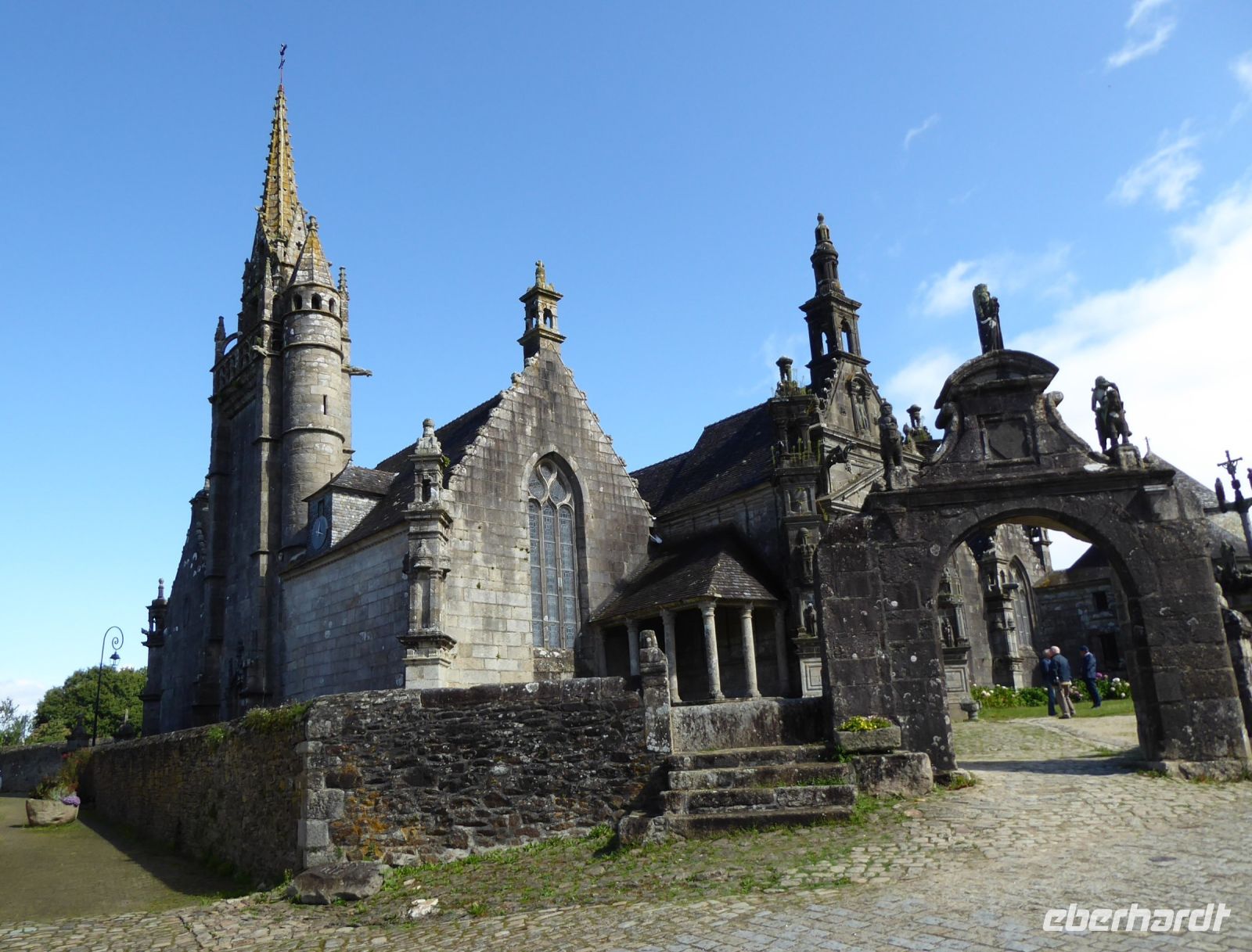 Heute Morgen wollten wir uns noch die Stadt Quimper genauer ansehen. Mit unserer Stadtführerin Yolande verabredeten wir uns an der Kathedrale. Ähnlich wie Rom liegt Quimper auf sieben Hügeln. Drei Flüsse treffen sich hier und bis zum Meer sind es nur wenige Kilometer. Wir bummelten durch die Gassen der Altstadt und bestaunten die schönen alten Fachwerkhäuser, den Buttermarkt mit seinen netten Crêperien und natürlich die Kathedrale Sankt Corentin. Mehr als 600 Jahre mussten vergehen bis das Gotteshaus seine heutige Gestalt erhielt. Noch vor der Führung hatten wir die Chance einen kurzen Blick ins Innere zu werfen. Auffallend dabei ist der leicht abgeknickt gebaute Chor, der viel Platz für Spekulationen lässt und in dieser Form baugeschichtlich einzigartig ist. Im Chorumgang beeindruckten uns die bunten Glasfenster, darunter auch moderne Arbeiten der in Paris lebenden ungarischen Künstlerin Anna Stein. Mit Yolande schlenderten wir durch den wunderschönen Garten des Friedens mit seinen mediterranen Pflanzen. Riesige Palmen, Bananenstauden und blühender Ingwer entrückten uns von Zeit und Ort. Yolande würzte uns die Geschichte der Stadt, die die Hauptstadt der Cornouaille ist, mit vielen Details und lustigen persönlichen Anekdoten. Wer hätte gedacht, dass sowohl der Dichter Max Jacob, wie auch René Laennec, der Erfinder des Stethoskops sowie Alexandre Massé, der Erfinder des Vierlochknopfes in Quimper geboren wurden!? Unsere nächste Station auf dem Weg in den Norden war der umfriedete Pfarrbezirk im Guimiliau. Die Umfassungsmauer, das Triumphtor, die Kirche, das Beinhaus und der Kalvarienberg mit seiner unglaublichen Anzahl von über 200 Figuren gehören zu den schönsten Anlagen dieser Art in der Bretagne. Die Entstehungszeit des einzigartigen Ensembles datiert ins sechzehnte Jahrhundert. Es ist ein lebendiges Zeugnis der Volksfrömmigkeit der Region. Ein paar Straßenkilometer und viele Kreisel weiter erreichten wir in Trégastel wieder das Meer. Gemütlich spazierten wir um die Halbinsel Renote, die mit bizarren Felsformationen, wunderschönen Anwesen und einem herrlichen Strand punktet. Inmitten der Jahrmillionen alten Steine der rosa Granitküste hatten wir die schönsten Ausblicke auf das Meer und auf die umgebenden Inseln, darunter auch auf die Insel Costaèrés. Das neugotische Schloss auf der kleinen Insel wurde von dem polnischen Mathematiker und Erfinder Bruno Abdank-Abakanowicz Ende des neunzehnten Jahrhunderts erbaut und wurde zum Zentrum der polnischen Immigranten. Darunter auch Henryk Sienkiewicz, der hier seinen 1895 veröffentlichten Roman „Quo vadis“ verfasste. Die kleine Insel samt ihrer Gebäude erwarb 1988 der deutsche Schauspieler und Kabarettist Didi Hallervorden als Zweitwohnsitz. Nach unserer Wanderung stand der Besuch einer Whiskey Destillerie auf dem Programm. Vor fünfunddreißig Jahren wurde die Idee, in der Bretagne Whisky herzustellen, von der Brennerei Warenghem umgesetzt. Die edlen Brände haben längst einen festen Platz in der Branche und genießen bei Kennern einen guten Ruf. Leider ist der Betrieb stark kommerzialisiert und nicht mehr auf Busgruppen angewiesen. So kauften wir ein paar Fläschchen der edlen Brände, die wir im gemütlichen Garten des Hotel Kyriad in Lannion ganz für uns allein verkosteten. In entspannter Atmosphäre ließen wir den Abend ausklingen.