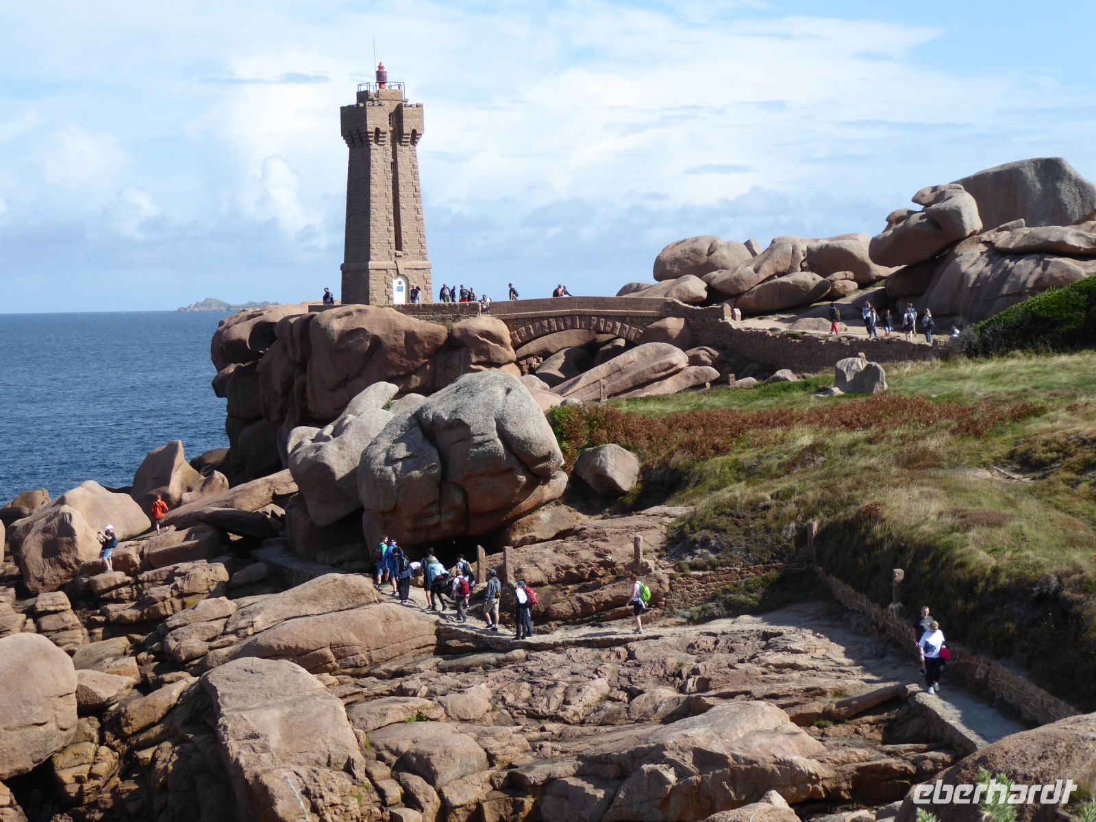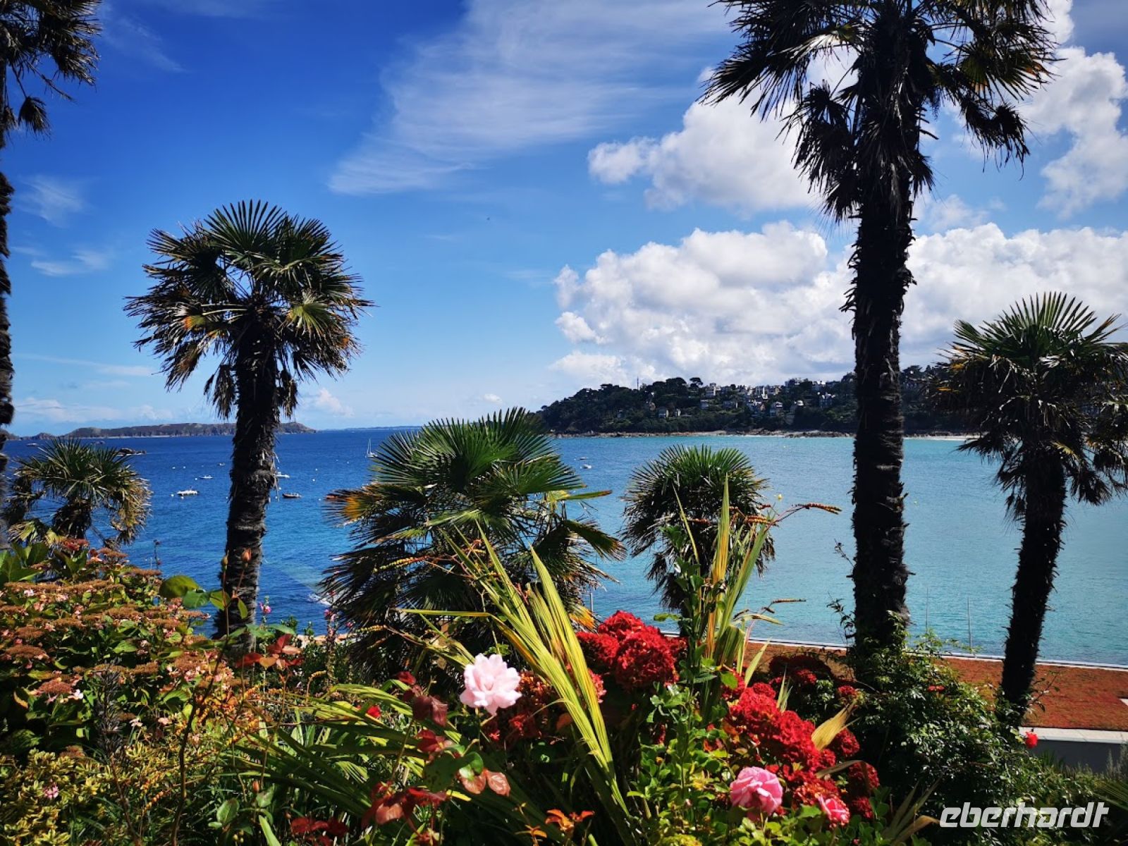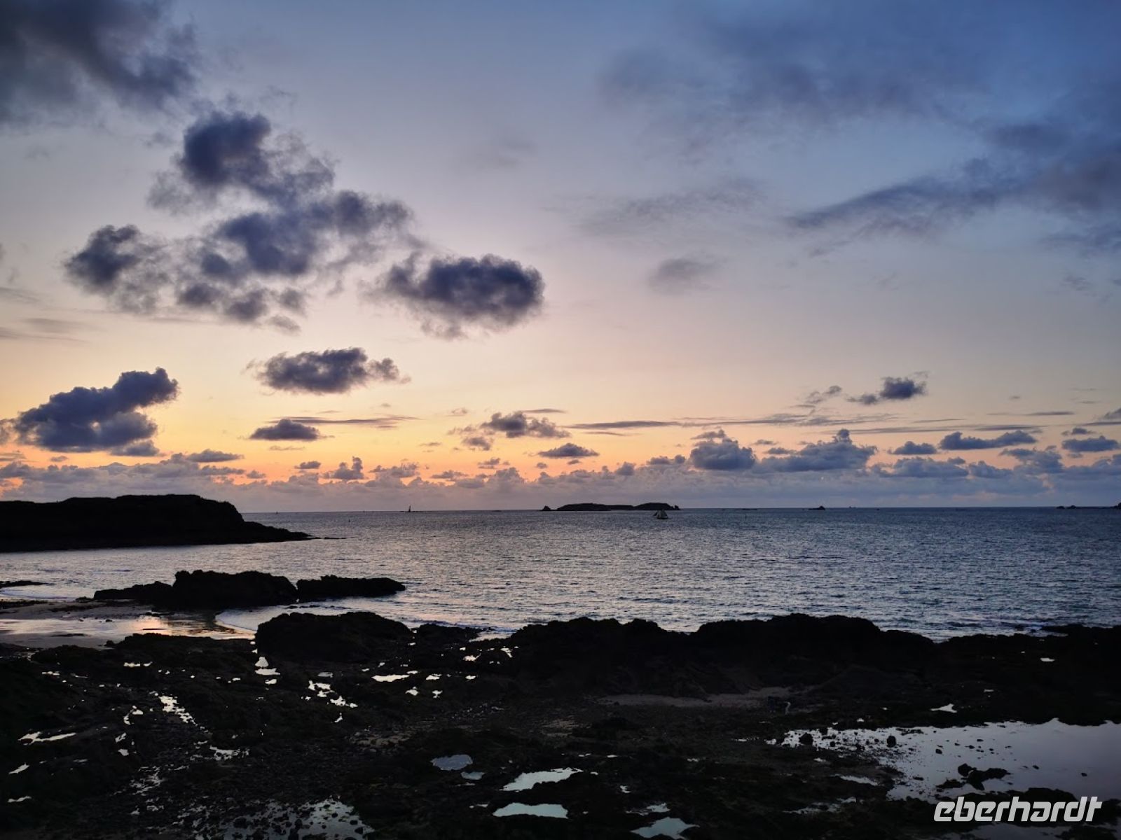 Die rosa Granitküste gehört zu den schönsten Küstenabschnitten der Bretagne. Bereits gestern konnten wir uns bei unserer kleinen Wanderung davon überzeugen. Heute bei wunderschönem Wetter und angenehmen Temperaturen, stand der berühmte Zöllnerpfad auf unserem Programm. Wir starteten wieder in Trégastel auf dem großen Parkplatz und marschierten am Meer entlang durch die eleganten Villenviertel, vorbei an den alten Kapitänshäusern und den beiden Wassermühlen von Ploumanac´h. Dort, an einem kleinen Stausee zweigt das Traouiero Tal ab. Im sechsten Band der Romane um Kommissar Dupin, “Bretonisches Leuchten“ spielen die großen Steinbrüche am anderen Ende des Tales eine wichtige Rolle. Hier beginnt auch der geologisch interessanteste Teil unserer Wanderroute. Vor 300 Millionen Jahren sind die Steine entstanden, die wie von Riesenhand geworfen, bizarre Formationen bilden. Sieht das nicht aus wie ein Schwarzwälder Bollenhut? Und da hinten, ist das nicht ein riesiger Igel? Sitzt da auf dem großen Stapel Crêpes nicht ein Papagei? Bei der Interpretation dieser Gebilde sind keine Grenzen gesetzt! Sogar das markante Profil Gerard Depardieus ist in den Felsformationen zu entdecken. Wir gingen über den versteckten alten Schmugglerpfad, der uns immer wieder herrliche Ausblicke auf das Meer und die vorgelagerten Inselchen bot. Mitten am Strand von Ploumanac'h steht ein kleines Oratorium mit der Statue des Heiligen Guirec. Eine Nadel in seine Nase gestochen, soll heiratswilligen jungen Mädchen einen Ehemann bescheren. Da niemand von uns einen Ehemann herbeiwünschte, ließen wir die Statue links liegen und marschierten weiter zum Leuchtturm Men Ruz, der seit fünfundsiebzig Jahren an der felsigen Küste den Schiffen den rechten Weg weist. Hier beginnt dann der eigentliche Zöllnerpfad. Man kann noch die kleinen runden, gemauerten Unterstände der Zöllner sehen, die von hier aus das offene Meer beobachten mussten. Wir kletterten über die blanken Felsen am Leuchtturm und hörten die gewaltigen Wellen an die Felsen donnern. Darüber hat 1903 Gustav Eiffel für seinen Sohn eine repräsentative Villa errichten lassen, die nicht ganz umsonst “Ker Awel“, Haus im Wind, heißt. Wir wanderten weiter entlang dieser sensiblen Küstenlandschaft, die schon mehrere Ölkatastrophen zu verkraften hatte. Die Spuren der Havarie der Amoco Cadiz 1978 sind noch immer zu sehen! Die weitere Wanderung war ein einziges Spiel der Farben: der rosa Granit, der tiefblaue Himmel, das Smaragdgrün des Meeres, dunkelgrüne Koniferen, Palmen, leuchtend orangefarbene wilde Montbretien und dazu die blauvioletten Hortensien. Wir wanderten durch schattige Laubengänge entlang der Küste weiter und gut eine Stunde später erreichten wir den herrlich weißen Sandstrand von Trestraou. Der Strand lud ein zum Verweilen und das Meer lud ein zum Baden. Und endlich traute sich auch der letzte unserer Reisegäste in die Fluten! Entspannt verbrachten wir unsere Zeit am Strand mit Schwimmen, Sonnenbaden, Strandlaufen und Eis essen, bevor es wieder Zeit wurde den Bus zu besteigen. Am frühen Abend erreichten wir die kleine Korsarenstadt St. Malò. Das Hotel Univers liegt mitten in der Altstadt. Die engen Gassen laden zu Entdeckerspaziergängen ein. Die gewaltige Stadtmauer schließt die Altstadt ein, durchbrochen nur von eindrucksvollen Stadttoren. Von hier oben bietet sich ein fantastischer Blick auf die vorgelagerten, befestigten Inseln und Felsen, die bei Ebbe langsam aus dem smaragdgrünen Wasser emporsteigen. Nach dem Abendessen im Hotel Châteaubriand, in stimmungsvollem Ambiente des Fin de Siècle, erlebten wir einen fantastischen Sonnenuntergang.