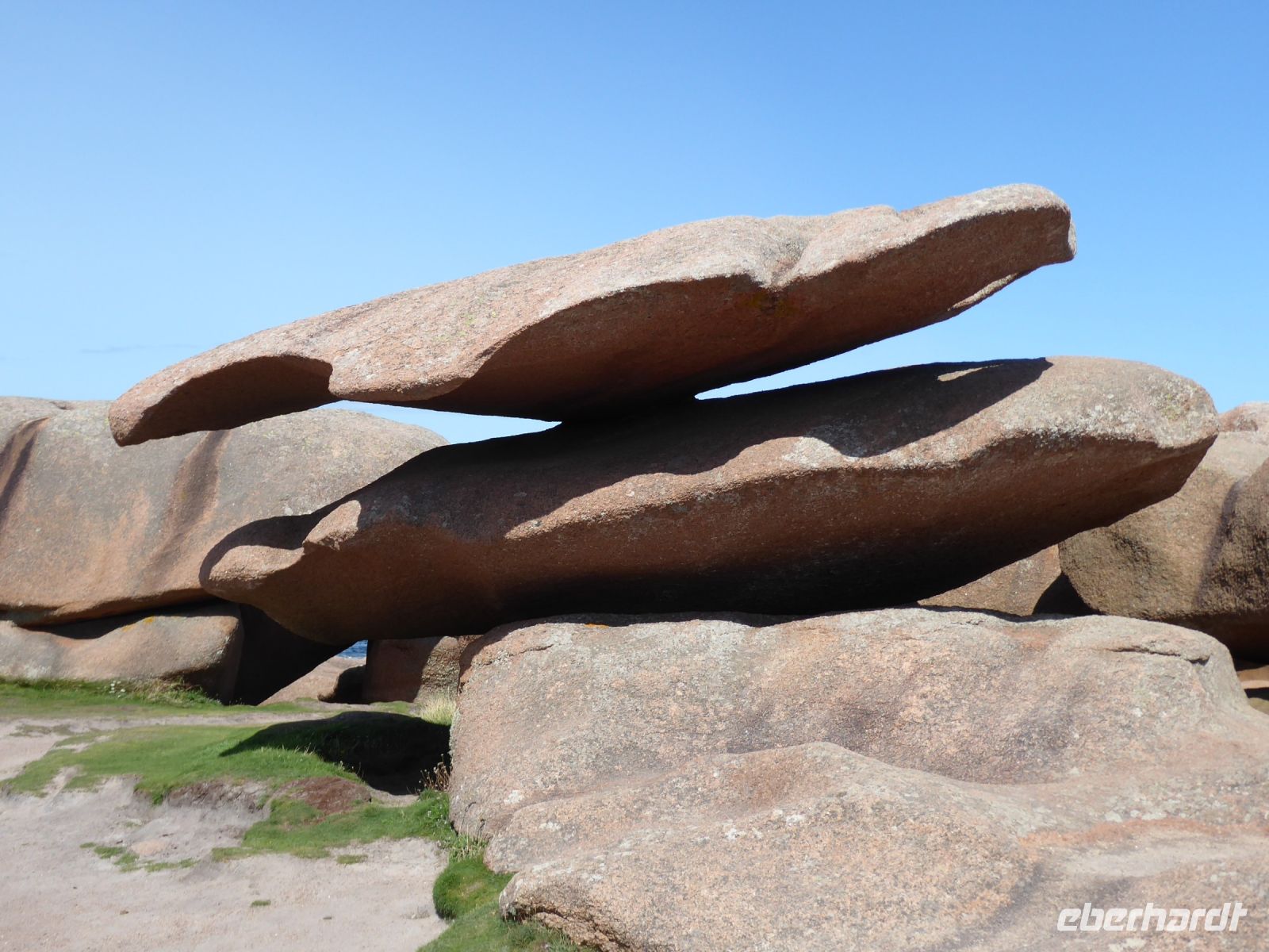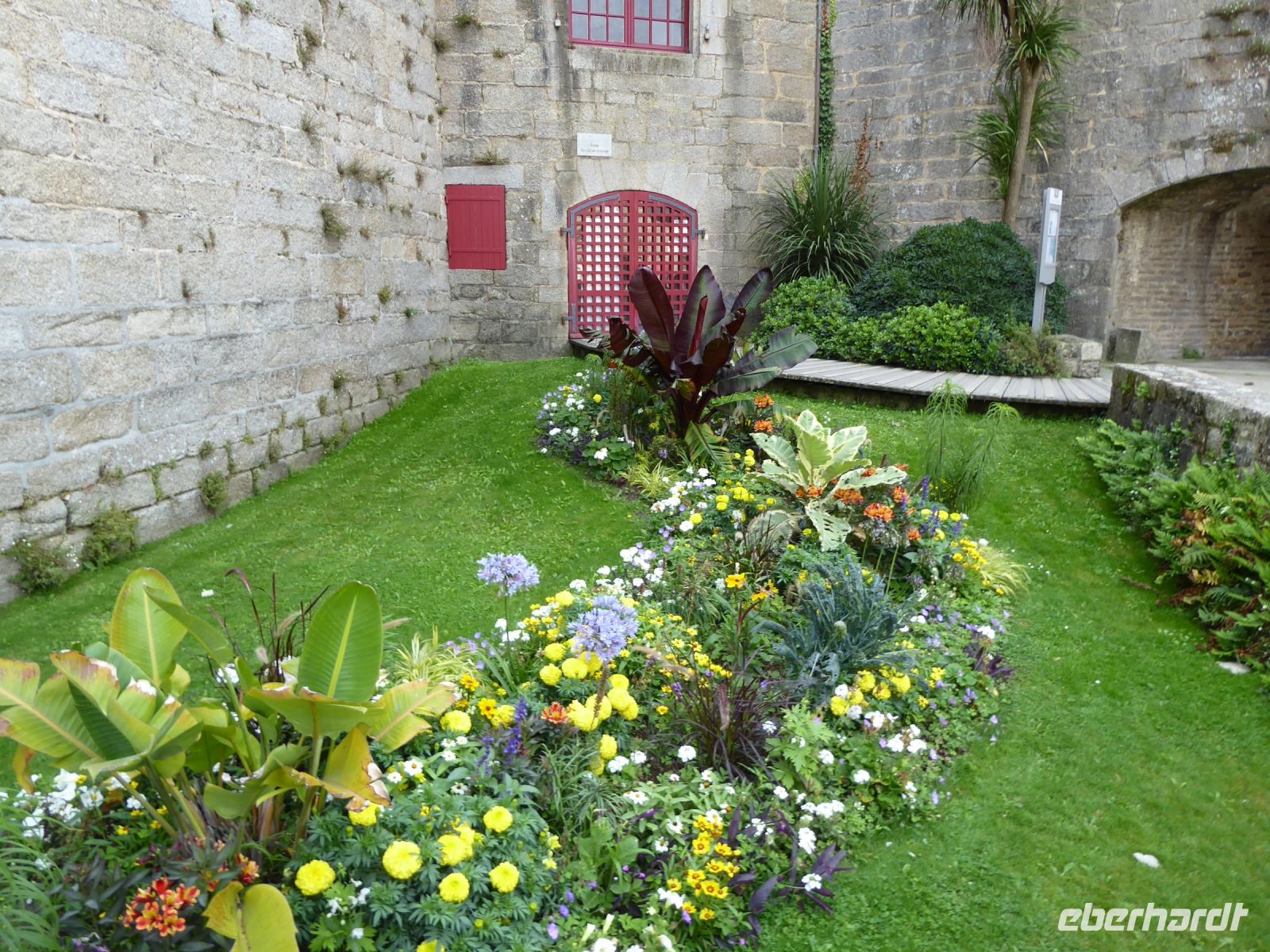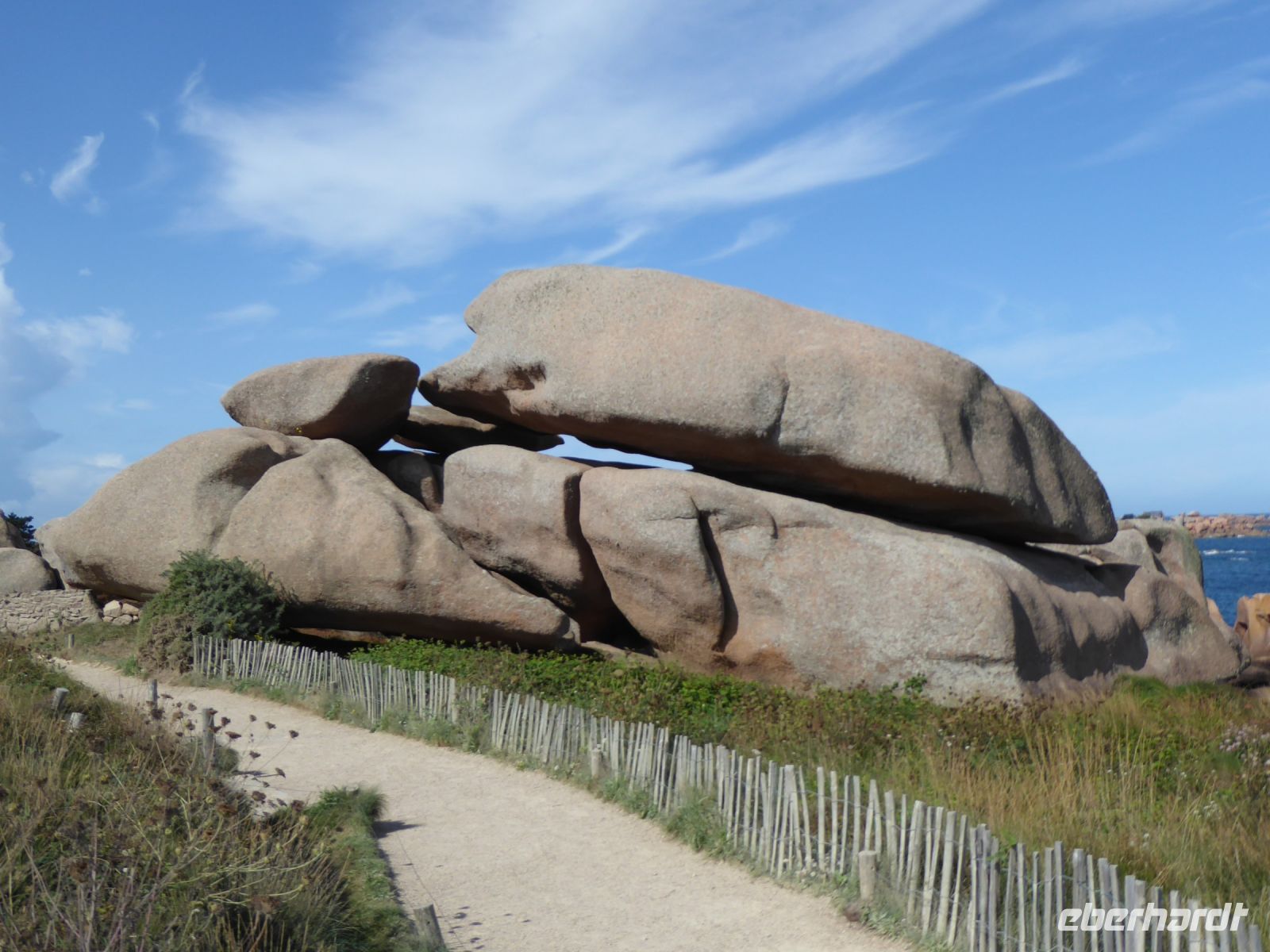 Die rosa Granitküste gehört zu den schönsten Küstenabschnitten der Bretagne. Bereits gestern konnten wir uns bei unserer kleinen Wanderung davon überzeugen. Heute bei wunderschönem Wetter und angenehmen Temperaturen, stand der berühmte Zöllnerpfad auf unserem Programm. Wir starteten wieder in Trégastel auf dem großen Parkplatz und marschierten am Meer entlang durch die eleganten Villenviertel, vorbei an den alten Kapitänshäusern und den beiden Wassermühlen von Ploumanac´h. Dort, an einem kleinen Stausee zweigt das Traouiero Tal ab. Im sechsten Band der Romane um Kommissar Dupin, “Bretonisches Leuchten“ spielen die großen Steinbrüche am anderen Ende des Tales eine wichtige Rolle. Hier beginnt auch der geologisch interessanteste Teil unserer Wanderroute. Vor 300 Millionen Jahren sind die Steine entstanden, die wie von Riesenhand geworfen, bizarre Formationen bilden. Sieht das nicht aus wie ein Schwarzwälder Bollenhut? Und da hinten, ist das nicht ein riesiger Igel? Sitzt da auf dem großen Stapel Crêpes nicht ein Papagei? Bei der Interpretation dieser Gebilde sind keine Grenzen gesetzt! Sogar das markante Profil Gerard Depardieus ist in den Felsformationen zu entdecken. Wir gingen über den versteckten alten Schmugglerpfad, der uns immer wieder herrliche Ausblicke auf das Meer und die vorgelagerten Inselchen bot. Mitten am Strand von Ploumanac'h steht ein kleines Oratorium mit der Statue des Heiligen Guirec. Eine Nadel in seine Nase gestochen, soll heiratswilligen jungen Mädchen einen Ehemann bescheren. Da niemand von uns einen Ehemann herbeiwünschte, ließen wir die Statue links liegen und marschierten weiter zum Leuchtturm Men Ruz, der seit fünfundsiebzig Jahren an der felsigen Küste den Schiffen den rechten Weg weist. Hier beginnt dann der eigentliche Zöllnerpfad. Man kann noch die kleinen runden, gemauerten Unterstände der Zöllner sehen, die von hier aus das offene Meer beobachten mussten. Wir kletterten über die blanken Felsen am Leuchtturm und hörten die gewaltigen Wellen an die Felsen donnern. Darüber hat 1903 Gustav Eiffel für seinen Sohn eine repräsentative Villa errichten lassen, die nicht ganz umsonst “Ker Awel“, Haus im Wind, heißt. Wir wanderten weiter entlang dieser sensiblen Küstenlandschaft, die schon mehrere Ölkatastrophen zu verkraften hatte. Die Spuren der Havarie der Amoco Cadiz 1978 sind noch immer zu sehen! Die weitere Wanderung war ein einziges Spiel der Farben: der rosa Granit, der tiefblaue Himmel, das Smaragdgrün des Meeres, dunkelgrüne Koniferen, Palmen, leuchtend orangefarbene wilde Montbretien und dazu die blauvioletten Hortensien. Wir wanderten durch schattige Laubengänge entlang der Küste weiter und gut eine Stunde später erreichten wir den herrlich weißen Sandstrand von Trestraou. Der Strand lud ein zum Verweilen und das Meer lud ein zum Baden. Und endlich traute sich auch der letzte unserer Reisegäste in die Fluten! Entspannt verbrachten wir unsere Zeit am Strand mit Schwimmen, Sonnenbaden, Strandlaufen und Eis essen, bevor es wieder Zeit wurde den Bus zu besteigen. Am frühen Abend erreichten wir die kleine Korsarenstadt St. Malò. Das Hotel Univers liegt mitten in der Altstadt. Die engen Gassen laden zu Entdeckerspaziergängen ein. Die gewaltige Stadtmauer schließt die Altstadt ein, durchbrochen nur von eindrucksvollen Stadttoren. Von hier oben bietet sich ein fantastischer Blick auf die vorgelagerten, befestigten Inseln und Felsen, die bei Ebbe langsam aus dem smaragdgrünen Wasser emporsteigen. Nach dem Abendessen im Hotel Châteaubriand, in stimmungsvollem Ambiente des Fin de Siècle, erlebten wir einen fantastischen Sonnenuntergang.