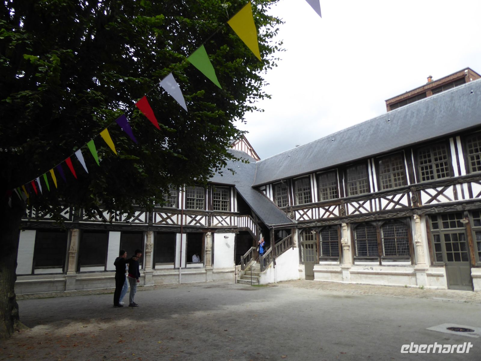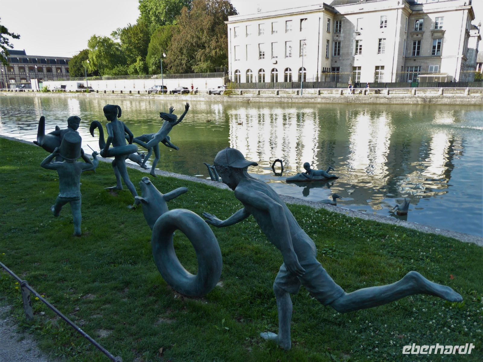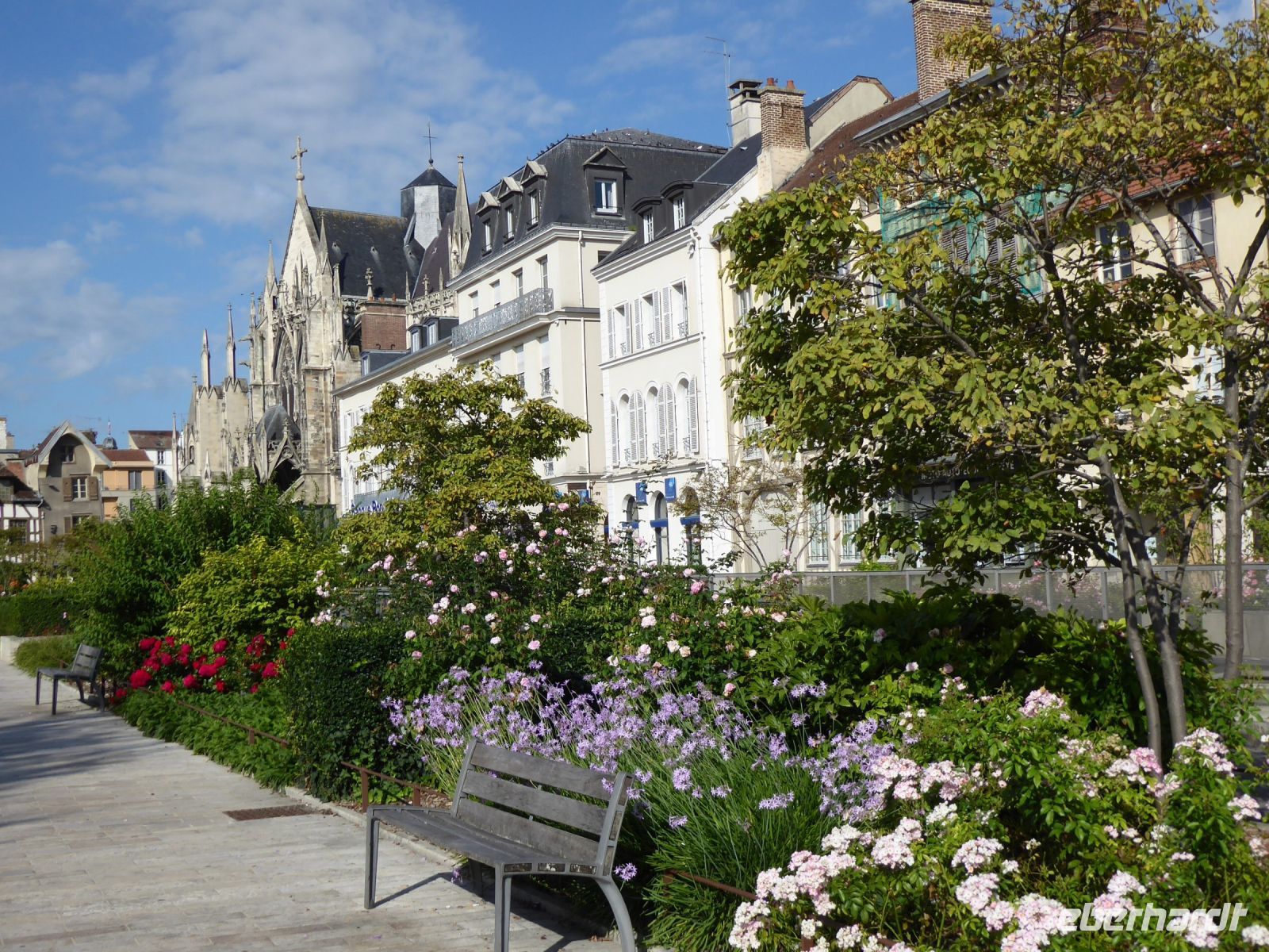 Am nächsten Morgen starteten wir zu unserer ersten Stadtbesichtigung. Das kleine Städtchen Troyes zeigte sich am Sonntagmorgen noch recht verschlafen. Wir bummelten durch die engen Gassen und bestaunten die bunten und windschiefen Fachwerkhäuser. Die Form der Altstadt erinnert an einen Champagnerkorken, worauf die Bürger der Stadt stolz hinweisen. In den dicht von Fachwerkhäusern bestandenen Straßen und Gassen spürt man bis heute den Geist des Mittelalters. Im elften Jahrhundert wurde hier Schlomo Jizchaki, der spätere Rabbiner und Gelehrte Raschi, geboren. Er ist einer der bedeutendsten jüdischen Gelehrten des Mittelalters, der auch in Worms und Mainz studierte. Thibault, der Befreier Jerusalems, schrieb hier seine Liebeslieder für Blanca von Kastilien und Chrétien de Troyes mischte christliche Tugenden, Ritterehre und Minne mit dem Mythos um die Ritter von der Tafelrunde und König Artus: im zwölften Jahrhundert wurde so hier der moderne Ritterroman geboren. Die Kathedrale St. Pierre und St. Paul wurde durch die französischen Revolutionäre ihres Figurenschmucks beraubt, doch im Inneren leuchten die wunderschönen, alten Glasfenster in ihrer ganzen Pracht. Die ganze Stadt erscheint heiter und lebensfroh. Wir schlenderten durch die gepflegten Parkanlagen, schnuppern an duftenden Rosen und bewunderten das alte Karussell aus der Zeit der Jahrhundertwende. Von den originellen modernen Skulpturen hat es uns besonders die fröhliche Kinderschar des belgischen Künstlers Tom Frantzen angetan, die sich gut gelaunt zum Bad im kühlen Nass der Seine am Ufer des Flusses trifft. Gerne wären wir noch länger in dieser netten, sympathischen Stadt geblieben, doch bis Vannes in der Bretagne lag noch ein weiter Weg vor uns.