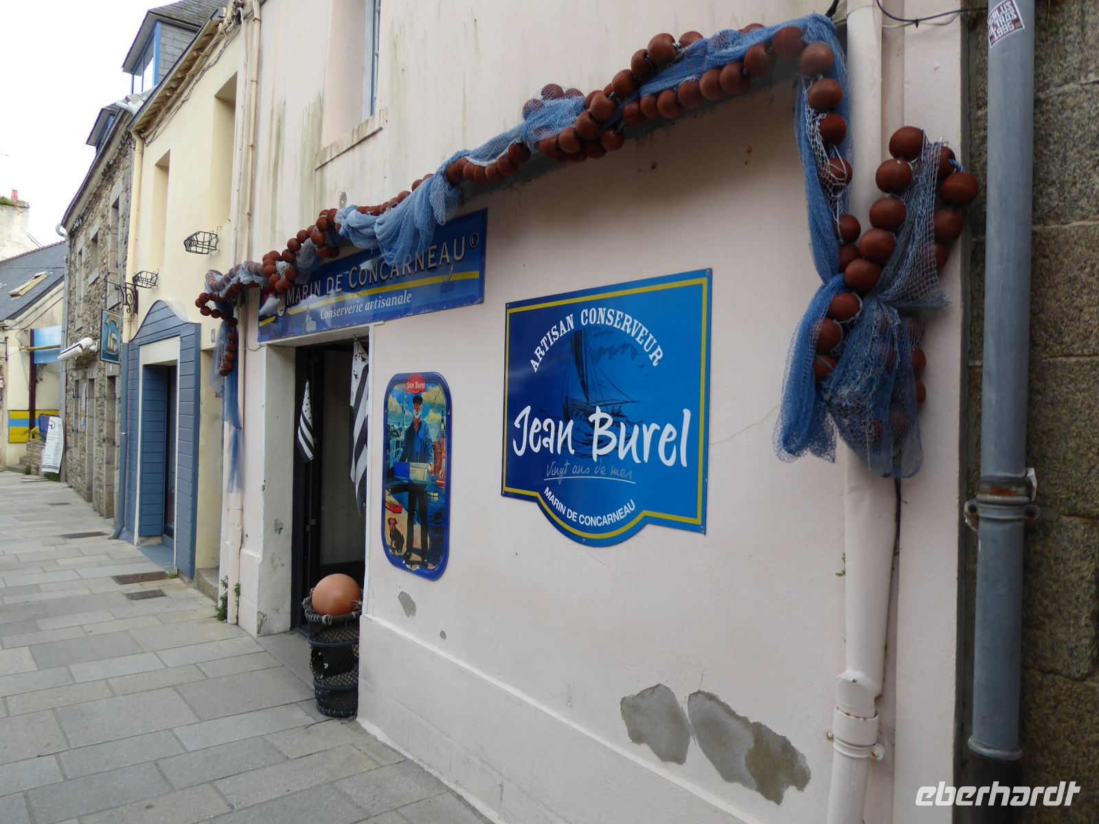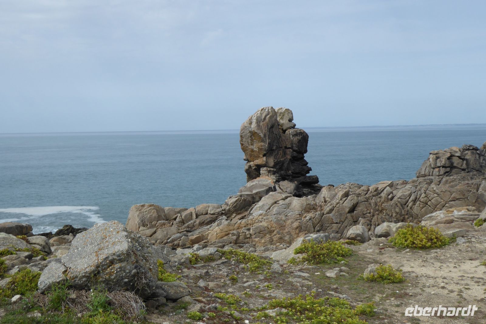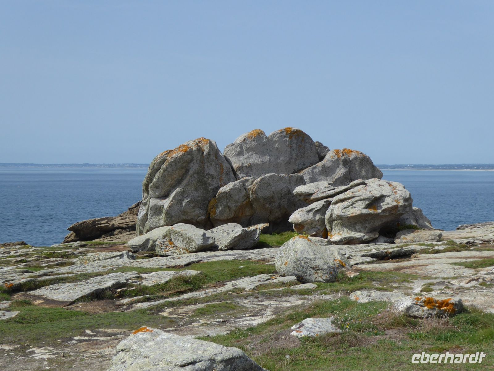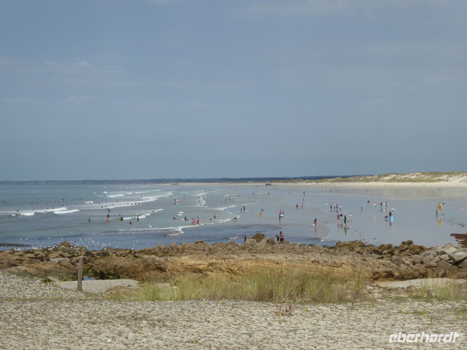 Gleich am nächsten Morgen brachen wir auf nach Concarneau. Früh am Morgen waren noch wenige Touristen in der Ville Close, der der Stadt vorgelagerten Seefeste, die deutlich die Handschrift Vaubans, des großen Festungsbaumeisters Ludwigs XIV trägt. Bunte Fahnen, die die Weltoffenheit der Hafenstadt unterstreichen, begrüßen die Besucher. Von den massiven Wehrmauern hat man einen schönen Blick auf die Uferstraße. Dort befindet sich das legendäre Stammlokal, l´Amiral, des (fiktiven) Kommissar Dupin. Unter dem Pseudonym Jean-Luc Bannalec hat 2012 der Autor und Verleger Jörg Bong einen neuen Serienhelden geschaffen, dessen Einsatzgebiet in der Bretagne ist. Pünktlich zu den Sommerferien ist der zwölfte Band der Serie erschienen. Die Romane wurden vor der herrlichen Kulisse der Bretagne verfilmt und haben, vor allem in Deutschland, einen unglaublichen Bretagne Boom ausgelöst. Auch wir ließen uns von diese Stadt in ihren Bann ziehen, schlenderten durch die engen Gassen, stöberten in den pittoresken Läden und entdeckten, für sich und die Daheimgebliebenen, das eine oder andere Mitbringsel, darunter auch die berühmten Öl Sardinen, die über große Handelsketten mittlerweile auch in Deutschland zu bekommen sind. Die wunderschönen Fischdosen der lokalen kleinen Hersteller findet man allerdings nur hier! Nach einem kleinen „Ekspresso“ im Amiral ging unsere Fahrt weiter nach Tronoën, wo wir vor unserer Wanderung einen der ältesten Kalvarienberge der Bretagne aus dem fünfzehnten Jahrhundert besichtigten. Er ist ein beeindruckendes Zeugnis der Volksfrömmigkeit der Region. Unser Weg führte uns direkt zu den Dünen und dort entlang der herrlichen Küste barfuß über den weißen Sand der Baie d´Audierne. Bei herrlichem Wetter und leichtem Wind genossen wir die kostenlose Thalasso-Therapie! Wir umrundeten eine kleine Halbinsel zur Pointe de la Torche, auf der sich die Zeugnisse der Geschichte seltsam summieren: ein Dolmen und daneben eine große Bunkeranlage aus dem Zweiten Weltkrieg. Überall in der Bretagne liegen am Strand die kleinen Wachbunker des Atlantikwalles, wie Würfel, von Teufelshand geworfen. Auch die nächste Bucht, Pors Carn, bei Penmarch lockte mit weißem Sandstrand und so sprangen wir fast ausnahmslos ins Meer, das bei aufkommende Flut wunderschöne Wellen bis weit an den Strand brachte und uns im flachen wärmeren Wasser angenehm umspülte. Nach der Erfrischung stiefelten wir weiter bis Sankt Guenolé, vorbei an bizarren Felsformationen, die im smaragdblauen Wasser der Cornouaille-Küste um die Gunst der Betrachter wetteiferten. Nach gut elf Wanderkilometern beendeten wir dort unseren Tag mit einem kleinen Blick auf einen Flohmarkt, an dessen Rand unser Bus schon auf uns wartete. Zum Abendessen waren wir in einer kleinen Crêperie in Quimper eingeladen, wo uns Nathalie und ihr Team mit leckeren Galettes aus Buchweizenmehl, feinen süßen Crêpes und viel frischem Cidre bewirtete. Ein schöner Ausklang eines schönen Tages!