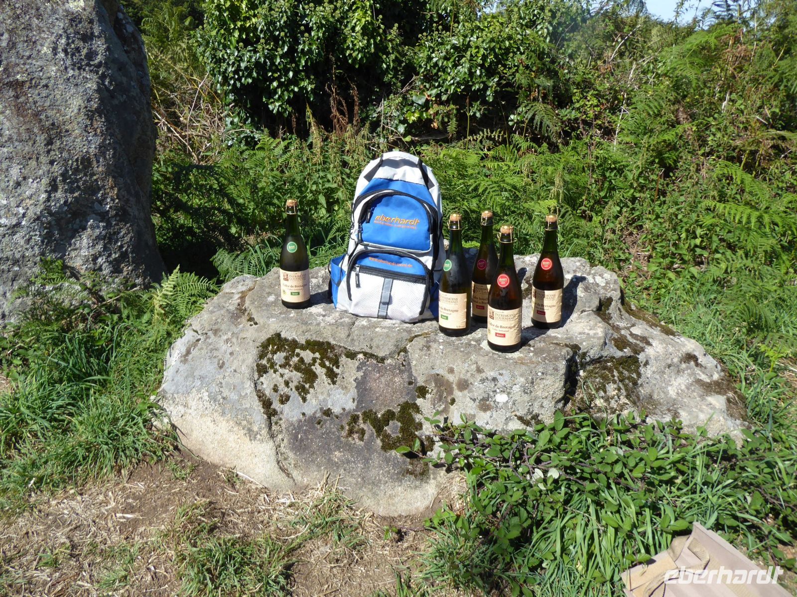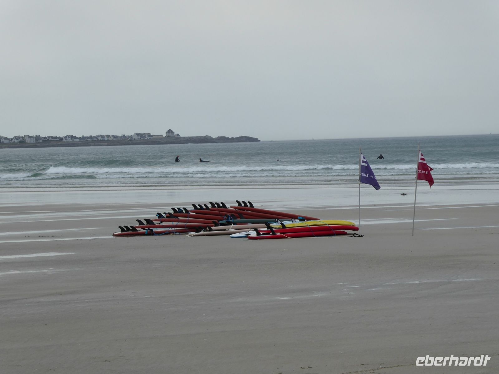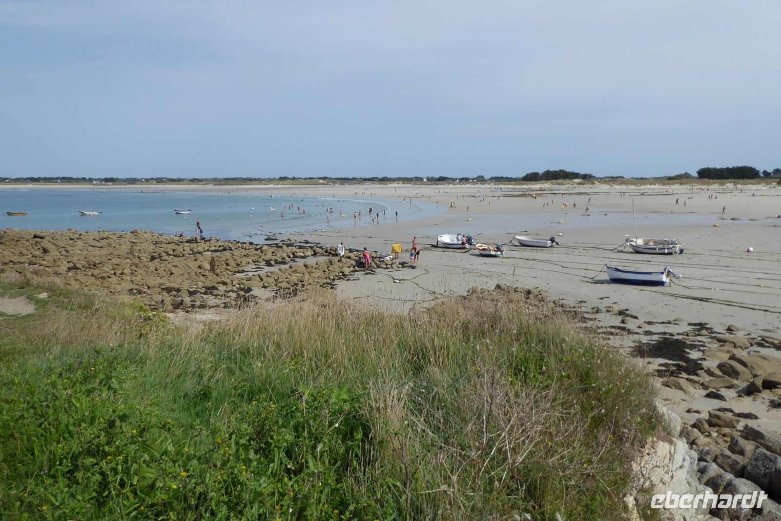 Gleich am nächsten Morgen brachen wir auf nach Concarneau. Früh am Morgen waren noch wenige Touristen in der Ville Close, der der Stadt vorgelagerten Seefeste, die deutlich die Handschrift Vaubans, des großen Festungsbaumeisters Ludwigs XIV trägt. Bunte Fahnen, die die Weltoffenheit der Hafenstadt unterstreichen, begrüßen die Besucher. Von den massiven Wehrmauern hat man einen schönen Blick auf die Uferstraße. Dort befindet sich das legendäre Stammlokal, l´Amiral, des (fiktiven) Kommissar Dupin. Unter dem Pseudonym Jean-Luc Bannalec hat 2012 der Autor und Verleger Jörg Bong einen neuen Serienhelden geschaffen, dessen Einsatzgebiet in der Bretagne ist. Pünktlich zu den Sommerferien ist der zwölfte Band der Serie erschienen. Die Romane wurden vor der herrlichen Kulisse der Bretagne verfilmt und haben, vor allem in Deutschland, einen unglaublichen Bretagne Boom ausgelöst. Auch wir ließen uns von diese Stadt in ihren Bann ziehen, schlenderten durch die engen Gassen, stöberten in den pittoresken Läden und entdeckten, für sich und die Daheimgebliebenen, das eine oder andere Mitbringsel, darunter auch die berühmten Öl Sardinen, die über große Handelsketten mittlerweile auch in Deutschland zu bekommen sind. Die wunderschönen Fischdosen der lokalen kleinen Hersteller findet man allerdings nur hier! Nach einem kleinen „Ekspresso“ im Amiral ging unsere Fahrt weiter nach Tronoën, wo wir vor unserer Wanderung einen der ältesten Kalvarienberge der Bretagne aus dem fünfzehnten Jahrhundert besichtigten. Er ist ein beeindruckendes Zeugnis der Volksfrömmigkeit der Region. Unser Weg führte uns direkt zu den Dünen und dort entlang der herrlichen Küste barfuß über den weißen Sand der Baie d´Audierne. Bei herrlichem Wetter und leichtem Wind genossen wir die kostenlose Thalasso-Therapie! Wir umrundeten eine kleine Halbinsel zur Pointe de la Torche, auf der sich die Zeugnisse der Geschichte seltsam summieren: ein Dolmen und daneben eine große Bunkeranlage aus dem Zweiten Weltkrieg. Überall in der Bretagne liegen am Strand die kleinen Wachbunker des Atlantikwalles, wie Würfel, von Teufelshand geworfen. Auch die nächste Bucht, Pors Carn, bei Penmarch lockte mit weißem Sandstrand und so sprangen wir fast ausnahmslos ins Meer, das bei aufkommende Flut wunderschöne Wellen bis weit an den Strand brachte und uns im flachen wärmeren Wasser angenehm umspülte. Nach der Erfrischung stiefelten wir weiter bis Sankt Guenolé, vorbei an bizarren Felsformationen, die im smaragdblauen Wasser der Cornouaille-Küste um die Gunst der Betrachter wetteiferten. Nach gut elf Wanderkilometern beendeten wir dort unseren Tag mit einem kleinen Blick auf einen Flohmarkt, an dessen Rand unser Bus schon auf uns wartete. Zum Abendessen waren wir in einer kleinen Crêperie in Quimper eingeladen, wo uns Nathalie und ihr Team mit leckeren Galettes aus Buchweizenmehl, feinen süßen Crêpes und viel frischem Cidre bewirtete. Ein schöner Ausklang eines schönen Tages!