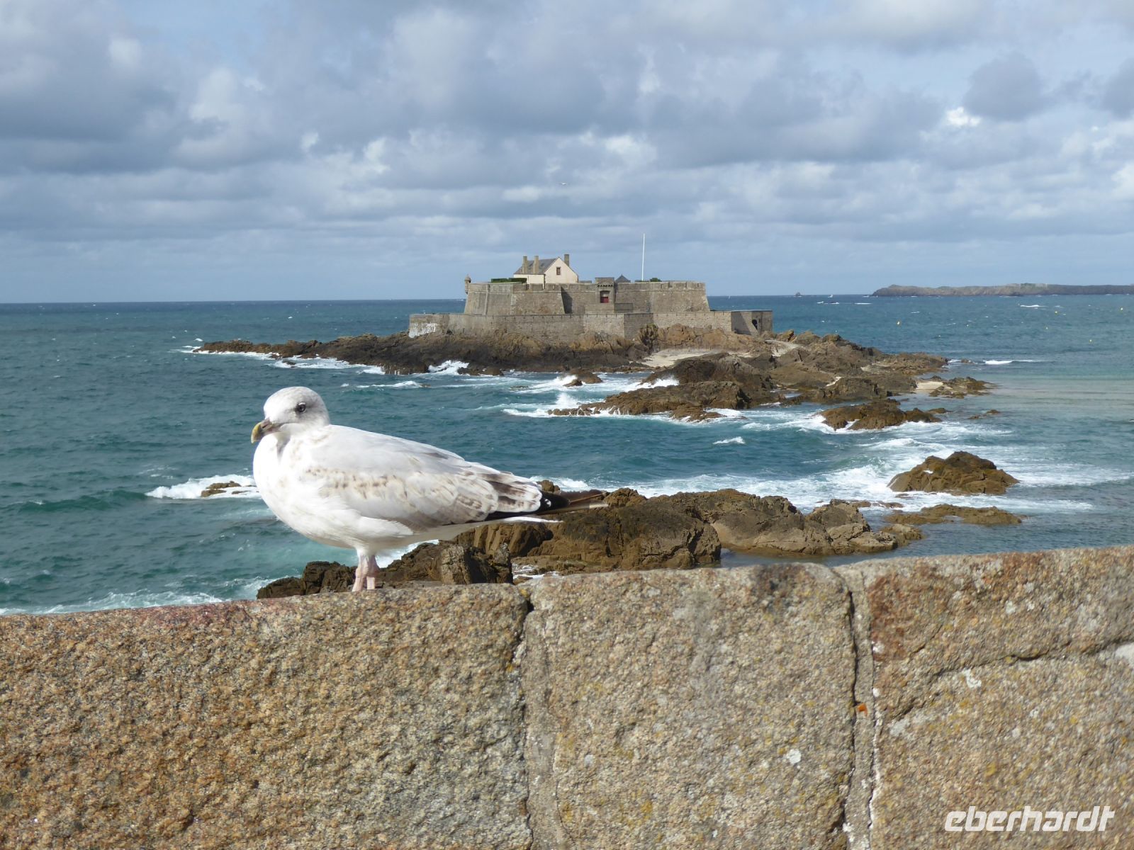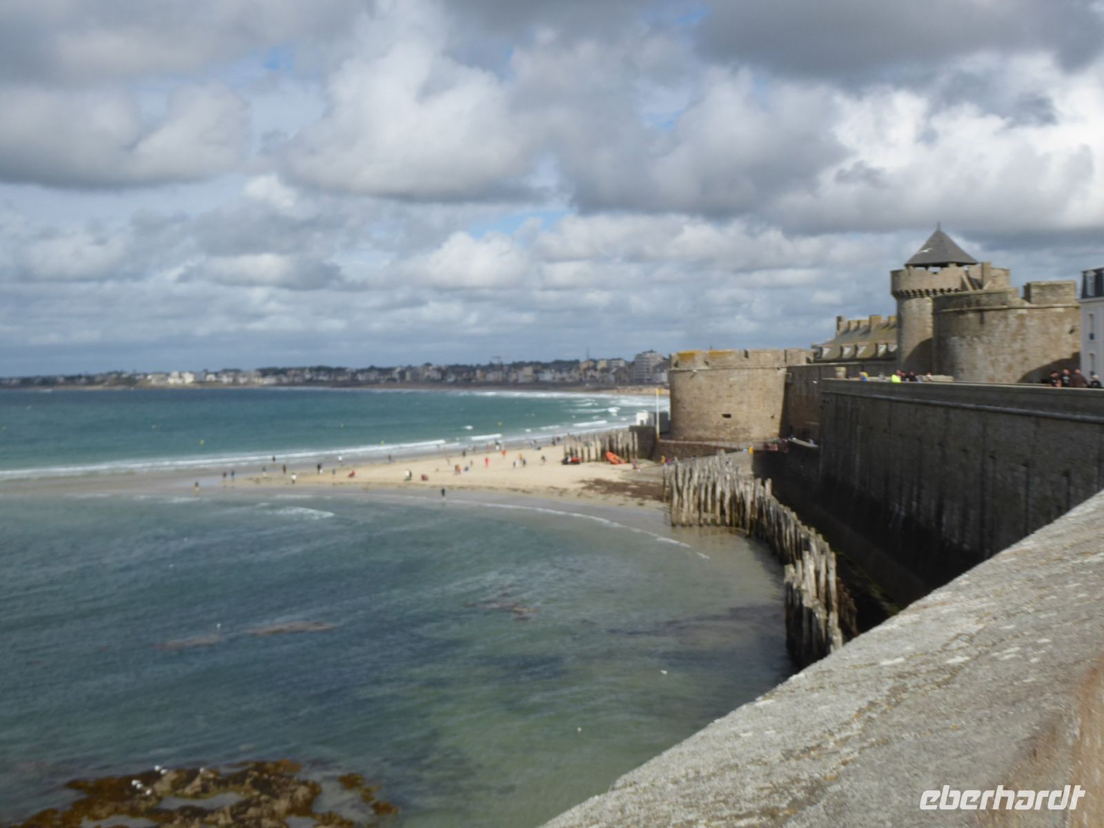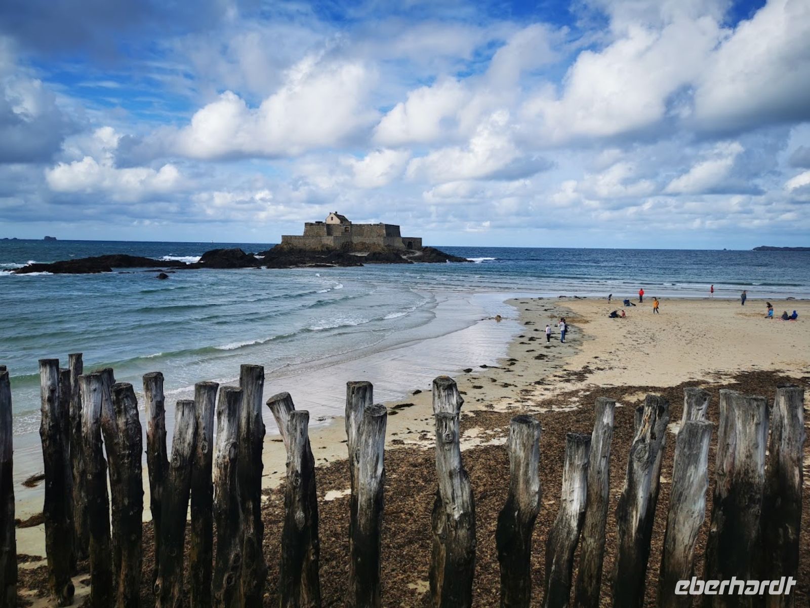 Zu ungewöhnlich frühen Stunde machten wir uns auf zum Mont St. Michel, um noch vor dem großen Ansturm den Inselberg zu erreichen. Auch bei Ebbe bietet sich ein imposantes Bild. Wir entschieden uns zu Fuß über die erst vor vierzehn Jahren gebaute Stelzenbrücke zu gehen. Langsam näherten wir uns dem Inselberg, der die Menschen seit 1300 Jahren in seinen Bann zieht. Jedes Jahr wird die Anlage, die seit 1979 UNESCO Weltkulturerbe ist, von über 3 Millionen Touristen und Pilgern besucht. Bis in die Mitte des neunzehnten Jahrhunderts wurde die Klosteranlage als gefürchtetes Staatsgefängnis genutzt. Erst Victor Hugo und andere haben sich für die Schließung des Gefängnisses eingesetzt. Heute ist der Klosterberg das touristische Highlight der Normandie. Vor der grandiosen Aussicht des, ohne Gebäude, 92 Meter hohen Berges, müssen viele steile Stufen erklommen werden. 300 Stufen sind es zum oberen Plateau und unzählige weitere Treppen im Inneren der Anlage lassen keine rechte Freude bei unseren kniegeschädigten Reiseteilnehmern aufkommen. Doch das Erlebnis Mont Saint Michel entschädigt für alle Mühen und Schmerzen. Selbst der immer wieder einsetzende Regen konnte die Freude, an dem Erlebnis nicht trüben. Le Merveille, das Wunder, das ist der Mont Saint Michel für alle Menschen: für fromme Pilger wie für Touristen mit unterschiedlichsten Interessen. Niemand kann sich dem Bann des Bauwerks entziehen. Ausgerüstet mit Audioguides ließen wir uns die Geschichte der bedeutenden christlichen Wallfahrtsstätte erklären. Gemeinsam fuhren wir mit dem Shuttlebus wieder zurück zum Parkplatz. Als nächstes Ziel stand die Stadt Cancale und unsere Austernverkostung auf dem Programm. Die Austernzucht in Cancale blickt auf eine lange Tradition zurück, sie ist schon seit dem dreizehnten Jahrhundert nachgewiesen. Nirgends sind die Austern frischer, nirgends bekommt man bessere Austern als in Cancale. Marktfrisch wird überwiegend die pazifische Felsenauster angeboten und mit etwas Zitrone direkt am Strand verzehrt. Auch die seltenere europäische Auster, die Huître plat, bei Feinschmeckern wegen ihres leicht nussigen Geschmacks gerühmt, wird hier auf dem Austernmarkt angeboten. Ausgestattet mit mehreren Flaschen gut gekühlten Weißweins, einem leckeren Sauvignon blanc, gesellten wir uns zu den anderen Gourmets und schlürften genüsslich direkt am Meer die frischen Austern. Zurück in St. Malò bummelten wir durch die von dicken Mauern umgebene Korsaren Stadt. Wir staunten über den perfekten Wiederaufbau der im August 1944 zu 85% durch angloamerikanische Bombardierungen zerstörte Stadt, in der sich die deutschen Besatzer verschanzt hatten und sich weigerten zu kapitulieren. Heute tummeln sich Touristen in den Gassen, aus allen Lokalen tönt Musik und Lachen - längst ist so Malò zu einer Hochburg des internationalen Tourismus geworden. Erst spät in der Nacht wird es ruhig und die Wellen des Meeres branden sanft an die hölzernen Wellenbrecher.