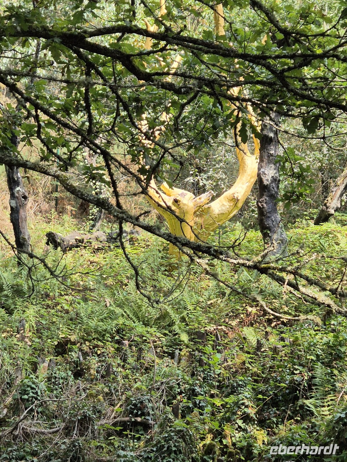 Später starteten wir von der „Église du Graal“ in Tréhorenteuc eine Wanderung von 7,5 km, die uns zunächst an einem Bächlein entlang führte, das das Val sans Retour (Tal ohne Wiederkehr) formt. Hier befindet sich der „Arbre d’Or“ (der goldene Baum), der uns tatsächlich mit Goldfarbe angestrichen entgegen leuchtet, und der See „Feenspiegel“, in dem Morgane, eine aus Cornwall stammende Prinzessin, Halbschwester von Artus und Schülerin Merlins, ihr Unwesen trieb (treibt?). Die von ihr gefangen gehaltenen untreuen Ritter wurden von Lancelot befreit, der dazu ein ganzes Arsenal an Sinnestäuschungen überwinden musste. Später ging es aus dem romantischen Tal heraus und man musste die Zeugnisse großer Waldbrände zur Kenntnis nehmen. Überraschend tauchte das imposante Wasserschloss Trécesson auf. Der Bus erwartete uns auf einem nahen Parkplatz und brachte uns zurück nach Vannes.
