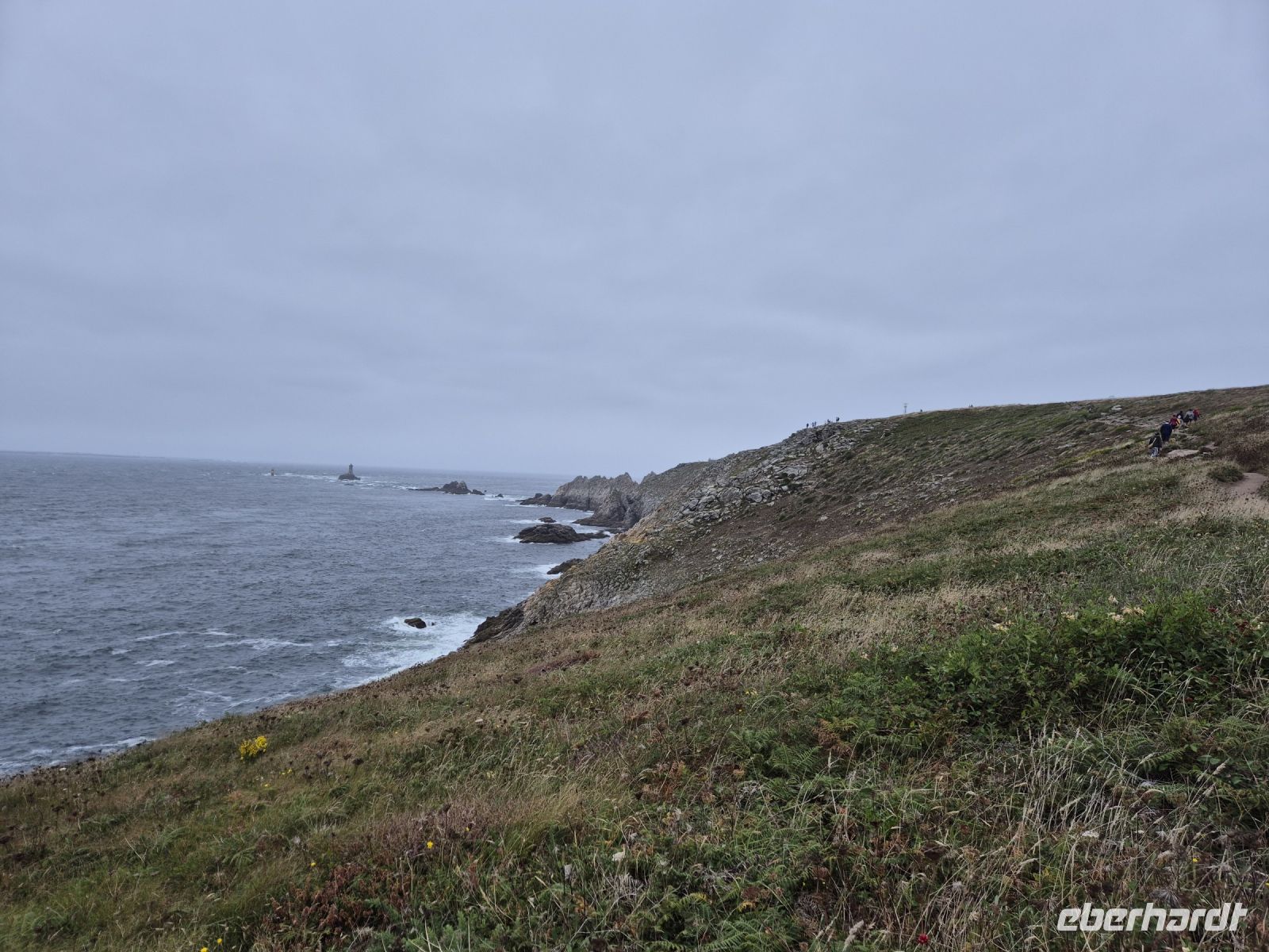 Von dem Kirchlein Notre Dame du Bon Voyage nahe Plogoff begannen wir die vielleicht bemerkenswerteste Wanderung auf dieser Reise. Rund 12 Kilometer sind es auf einem Weg entlang der Steilküste bis zur Pointe du Raz (raz ist bretonisch und bedeutet „rasen“, Bezug ist die schnelle Meeresströmung). Das französische „land’s end“ ist ein wildes Kap von 72 m Höhe über dem Meer. Hier führen über schroffe Klippen in einem leichten Auf und Ab die Fernwanderwege E5 und GR 34 herum. Durch Heide und Strandnelken kommt man zunächst zu einer kleinen Boots-Slipanlage, die sich für eine Rast anbietet. Am Kap selbst wimmelt es dann wieder von Kurzzeitbesuchern, die vom Besucherzentrum im Sommer mit einem Pendelbus zum Signalturm gelangen können. Seit einiger Zeit ist hier eine „Grand Site National“ mit besonderem Schutz. Dem musste ein Brei von etlichen Boutiquen und Hotels weichen, leider 1996 auch das kleine Hotel d’Iroise der Mme Le Coz von 1950, was einigen Wirbel in der Presse verursachte. Man bedenke, dass in der Nähe, mitten in dieser atemberaubenden Natur, einmal ein Atomkraftwerk entstehen sollte!