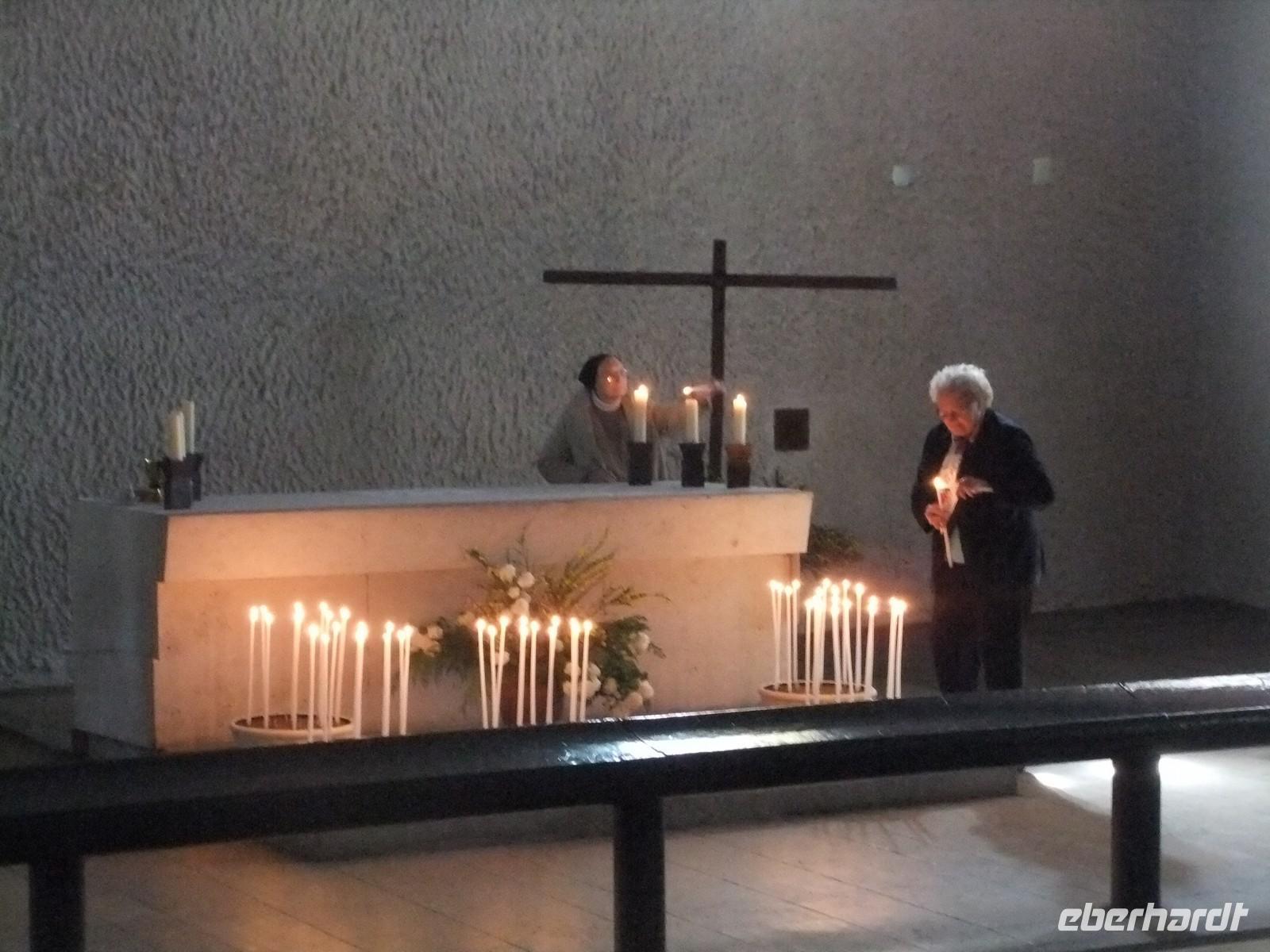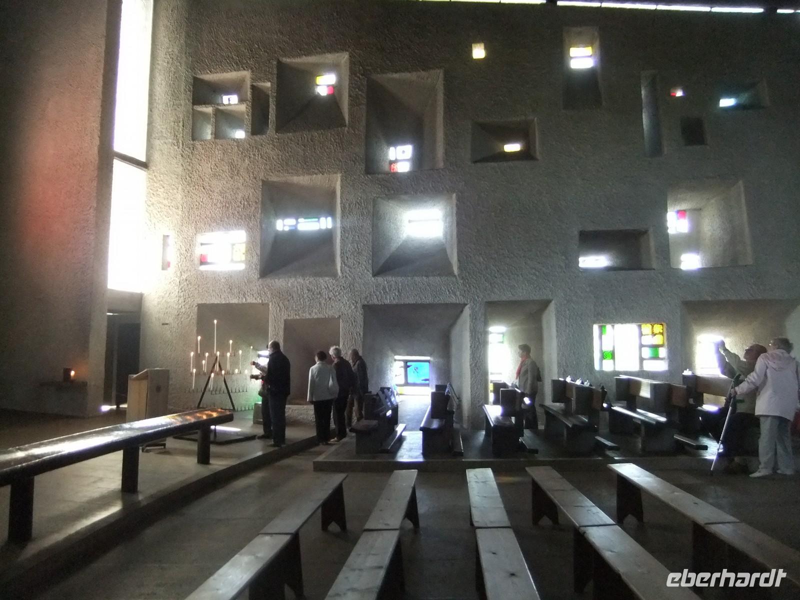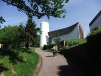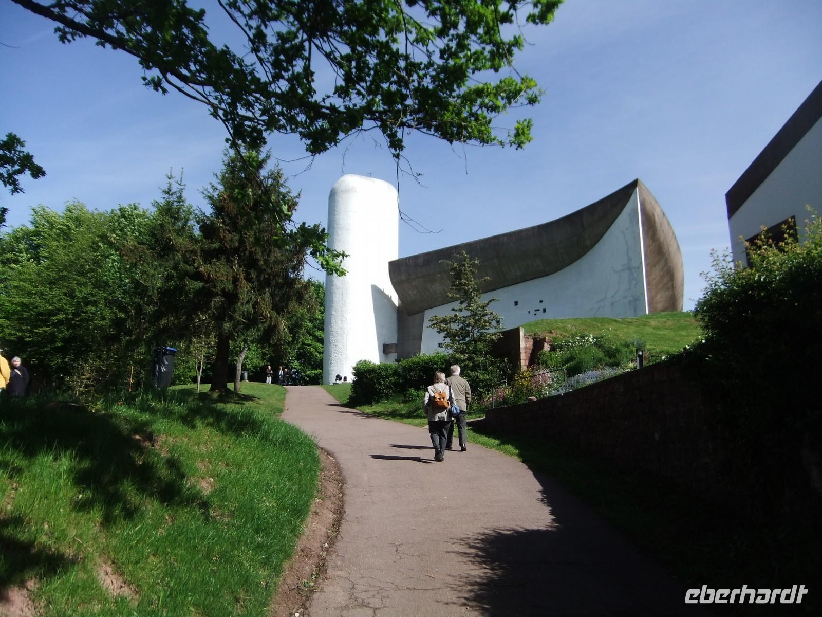 einer Anhöhe. Le Coubusier baute meist moderne Wohnanlagen und auch Repräsentationsbauten, zum Bau der Kapelle musste er nach Kriegsende erst überredet werden. Aus dem Material Beton entwickelte er ungewöhnliche Formen, leitet Licht über Türme in das Innere und legte an den Emailplatten des Haupttores selbst Hand an (er hatten den Beruf eines Ziffernblattmalers- und emailleurs gelernt).