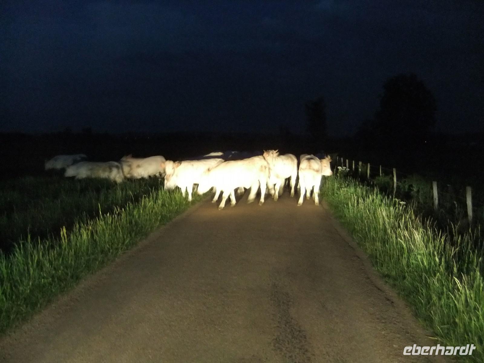 Aber der Höhepunkt kam noch, wenn auch der Weg in den Norden etwas weit war und wir uns an Weiden, Wäldchen und weißen Kühen schon satt gesehen hatten. Die Ferme Auberge hat es verstanden, ihre Produkte in einem üppigen Abendessen einzusetzen, ein Fest für Gourmets und Gourmands. Und offenbar geben die Kühe doch noch Milch, denn wo wäre sonst die viele dicke Sahne und der köstliche frischeste Frischkäse hergekommen.