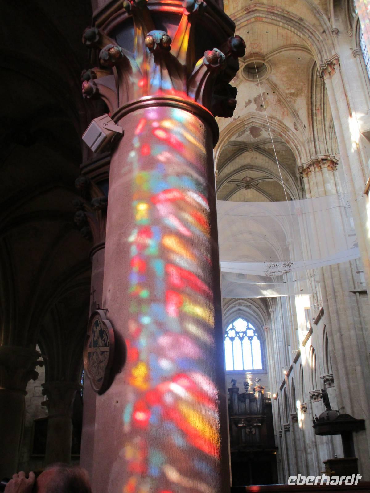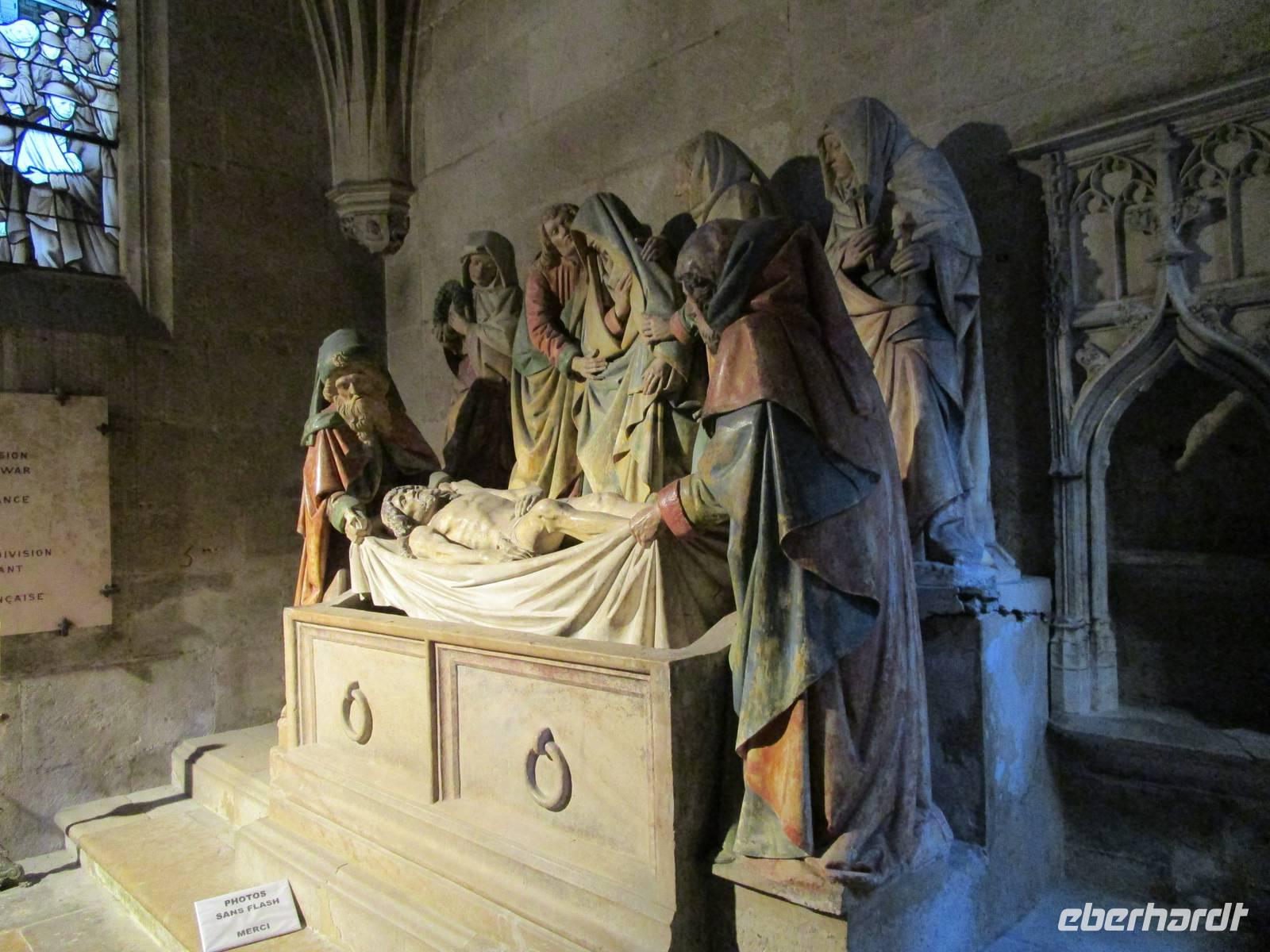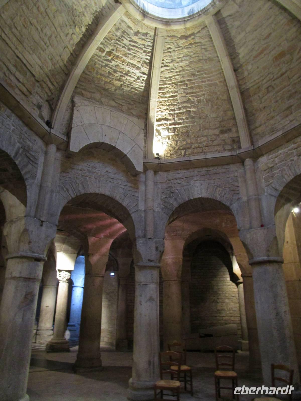 Die Ziele des heutigen Tages liegen nicht weit auseinander: zwischen Dijon und Beaune. Eines der berühmtesten Weinanbaugebiete Frankreichs zieht sich zwischen Nationalstraße und der Hügelkette entlang, die Cote de Nuits. Nach Süden schließt sich die Cote de Beaune an. Beaune ist deshalb Zentrum des Weinbaus der Bourgogne. Der Ort war früher auch Hauptstadt, bevor die Herzöge nach Dijon zogen. Ihr Kanzler, Nicolas Rolin war einer der reichsten und mächtigsten Männer der Zeit. Er stiftete zusammen mit seiner ebenso reichen Frau ein Hospital für arme Kranke. Sie dachten dabei sicher an ihr Seelenheil. Hier zog 1452 der erste Kranke ein und erst 1971 übersiedelte der letzte Kranke in ein neues Krankenhaus. Dazwischen hatte sich die Innenreinrichtung wenig verändert. Das Gebäude ist schon ein Schmuckstück mit seinen Dächern aus bunten glasierten Ziegeln, seiner jahrhundertealten Inneneinrichtung und seinen wertvollen Wandteppichen. Das größte Juwel ist jedoch der Weltgerichtsaltar von Rogier van der Weyden, zur Mahnung und Erbauung der Kranken geschaffen und zum Ruhme der edlen Stifter. Bevor wir in das Kloster Citeaux weiterverfahren, besuchen wir das mauerumschlossenes Weingut Clos Vougeot seiner Mönche. Damals versorgte das Gut die Mönche, denn die Benediktinerregel hatte Ihnen ein Viertel Wein pro Tag zugestanden. Heute wird auf 51 ha von 86 Besitzern der Grand Cru Clos Vougeot produziert. Ein großer Teil der Gebäude stammt aus dem 12.Jhdt., ebenso die 4 mächtigen Weinpressen. Das Schloss ist seit 80 Jahren Sitz des Ordens der Weinkenner, der Chevalier de Tastevin. Vom Stammkloster der Zisterzienser Citeaux ist nach der Revolution wenig geblieben, aber heute leben wieder 3 Dutzend Mönche hier. Ihre neu erbaute Kirche ist schlicht gehalten, so wie es Bernhard von Clairvaux schon vor 800 Jahren vorschrieb. Durch die Herstellung eines bekannten Käse sind sie wirtschaftlich selbständig. Burgund ist vielleicht nicht die bekannteste Käseregion Frankreichs, aber der Epoisses-Käse der Fromagerie Gaugry ist einer der besten Weichkäse. Wir verkosten verschiedene Ausführungen, dazu ein Glas guten Bourgogne-Wein. Aber Wein und Käse sind nicht alles. Eine weitere Köstlichkeit wird in Nuits-St.-George aus schwarzen Johannisbeeren gewonnen, Creme de Cassis. Dieses Elixier ist nicht nur Grundlage des Kir, einem Aperitif aus diesem Likör und dem Burgunder Weißwein Aligoté, sondern soll auch Allzweck-Heilmittel sein. Bei der Besichtigung der Produktionsanlage erfahren wir viel über die Herstellung und die Verkostung bestätigt die hohe Qualität der Erzeugnisse.