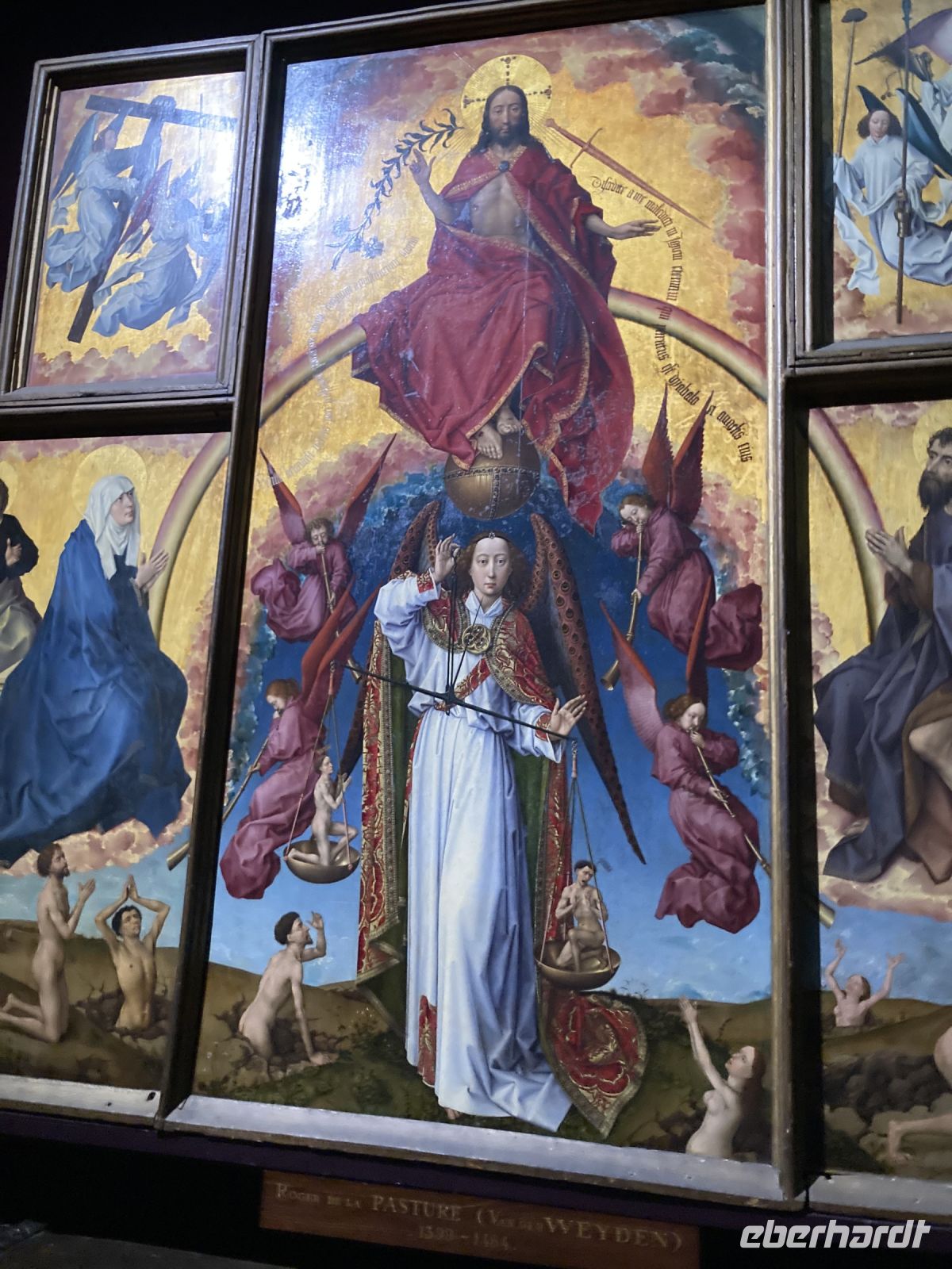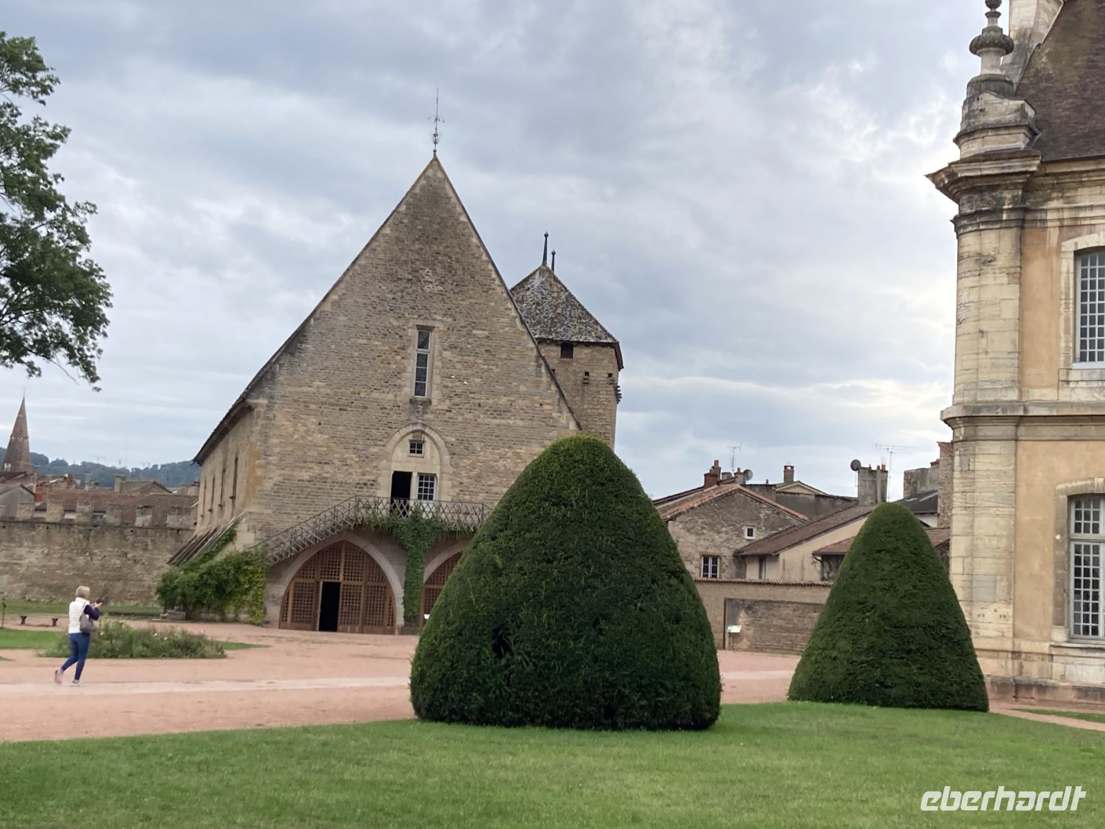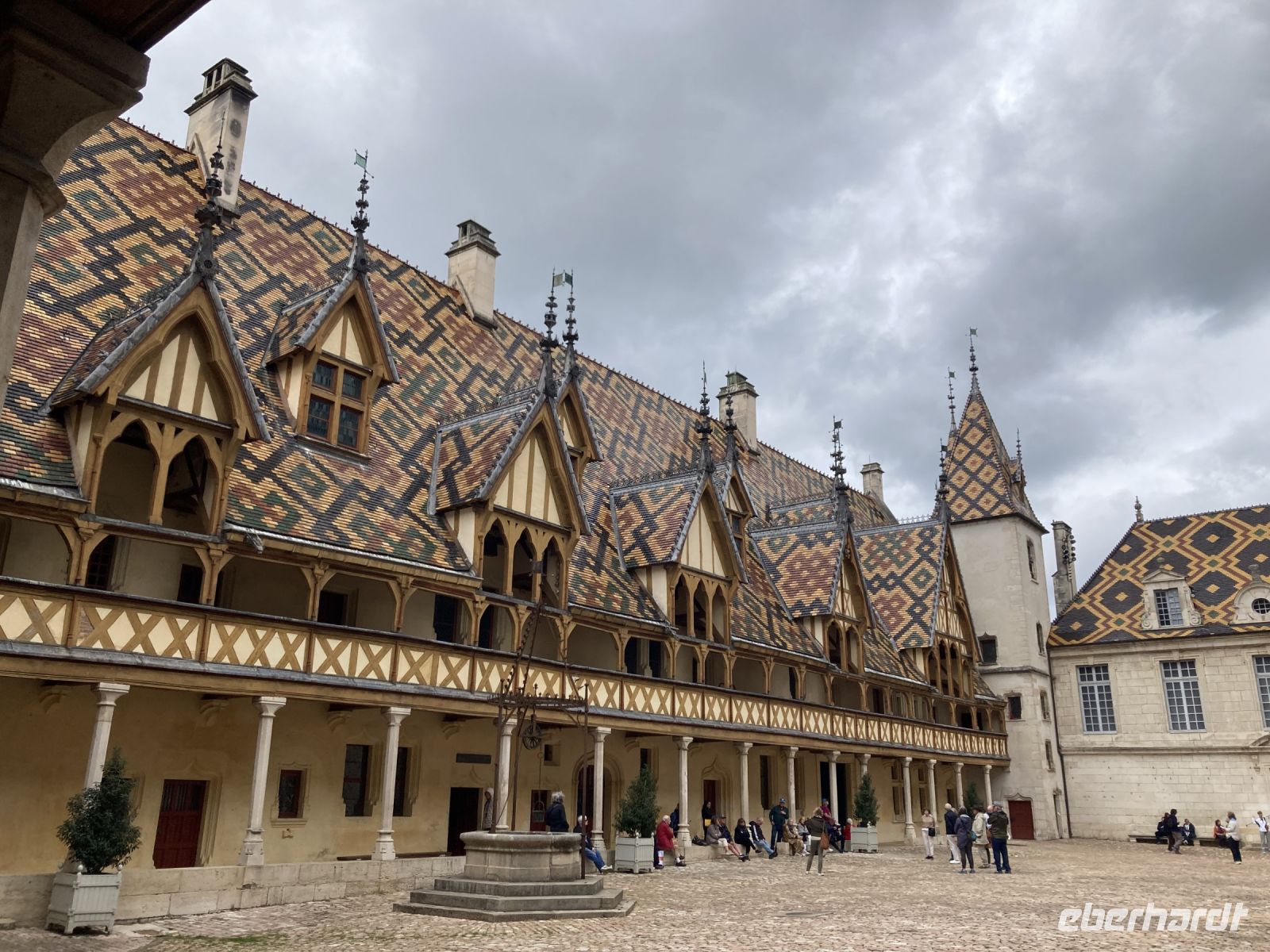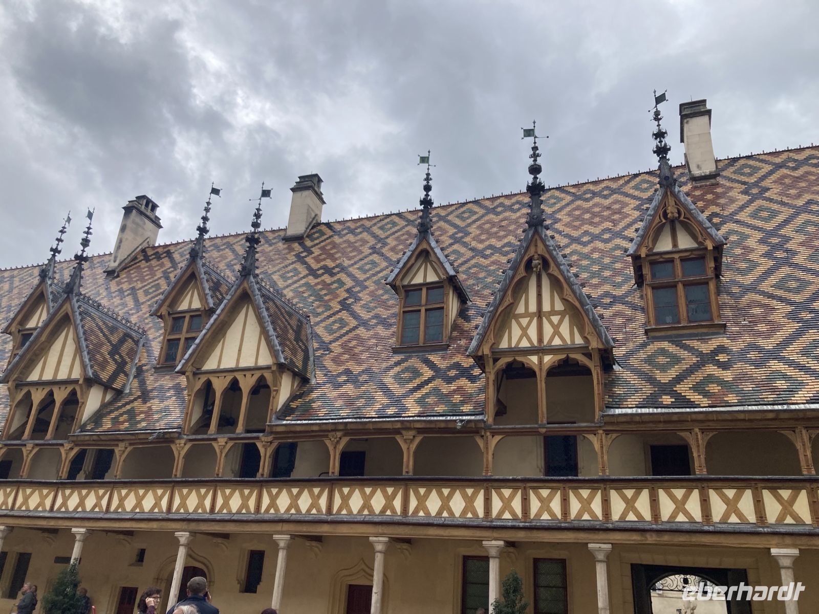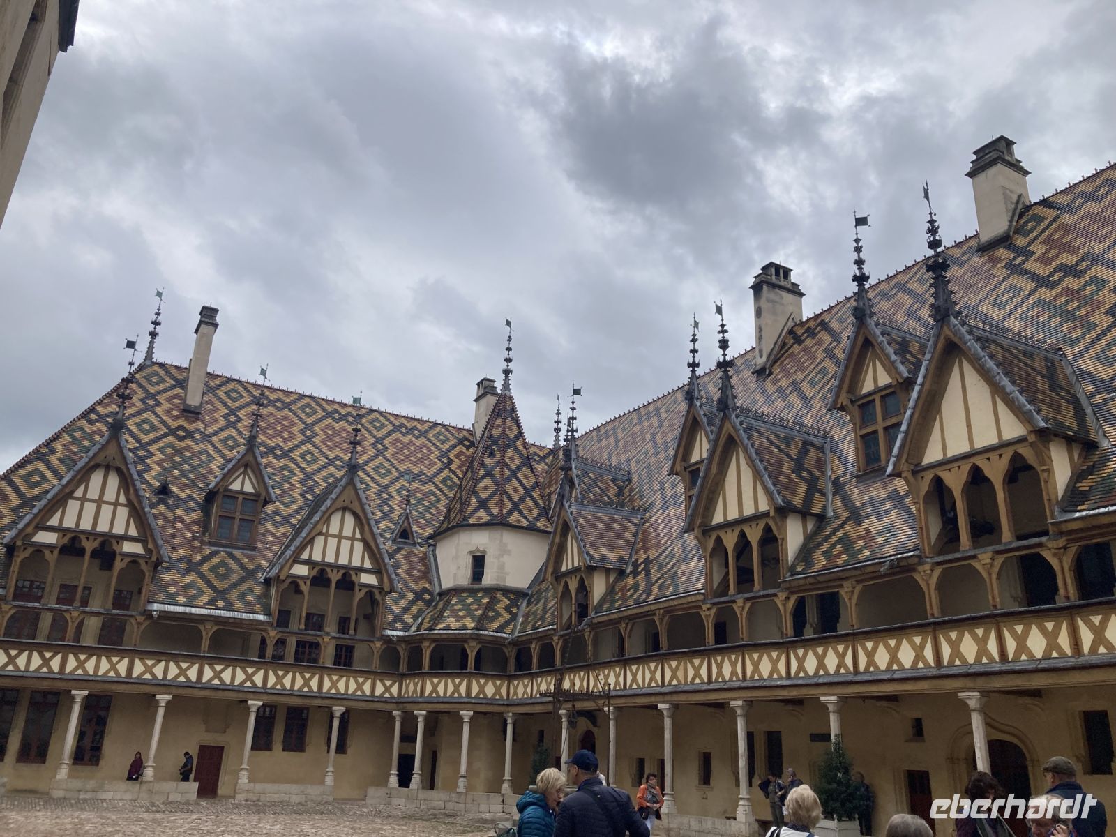 Das ist bei unserem nächsten Ziel genauso: Wir fahren in die Hauptstadt des Weines, nach Beaune, in der wir vor allem das berühmte Hotel-Dieu besichtigen wollen. Dieses ehemalige Krankenhaus, das sich auch um die Armen und Alten kümmerte, wurde im 15. Jahrhundert von einem der berühmtesten Machtpolitiker der damaligen Zeit, dem Kanzler der burgundischen Herzöge, Nicolas Rolin (aus Autun) und seiner Frau gestiftet. Es besticht vor allem durch sein mit bunten, glasierten Ziegeln versehenes Dach und dem berühmten Triptychon des flandrischen Malers Rogier van der Weyden, das das Jüngste Gericht mit dem heiligen Michael an der Seelenwaage zum Thema hat (wie in Autun).