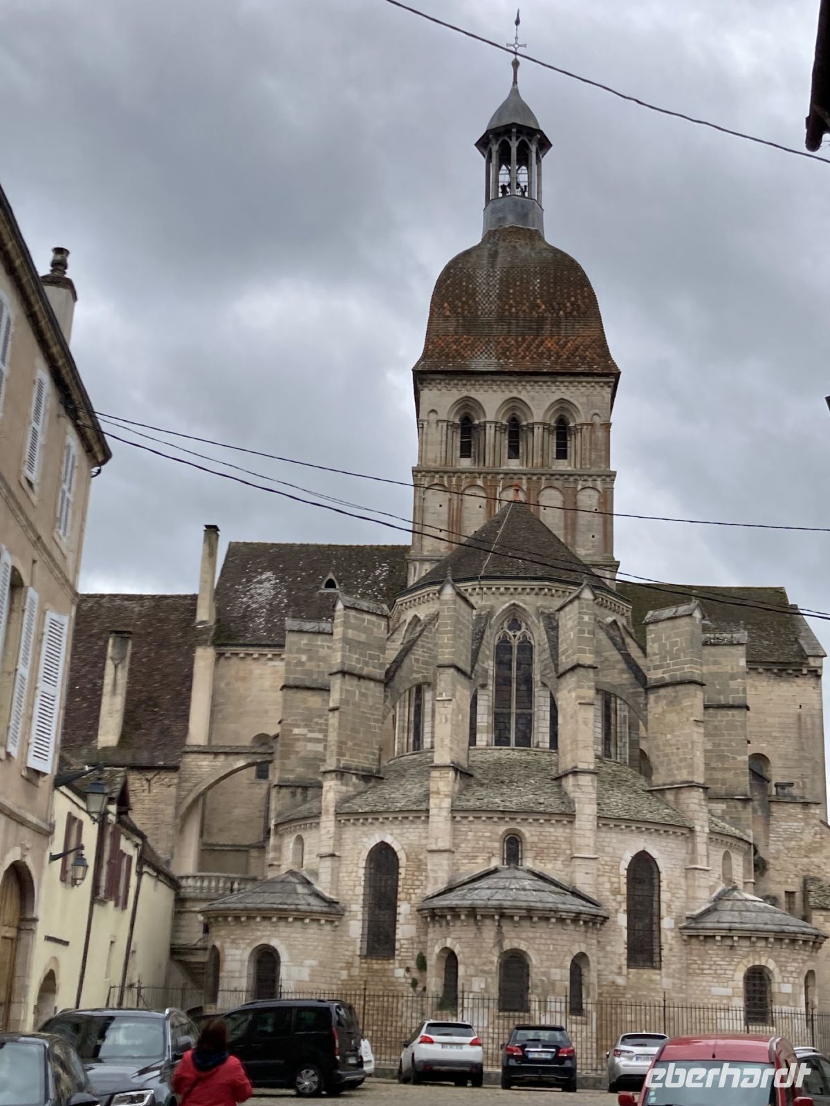 Bei angenehmen Wetter machen wir uns zu unserer allerersten Besichtigungstour auf. Wir fahren nach Autun, stellen den Bus auf dem riesengroßen Platz vor dem Hotel de Ville ab und schlendern vorbei an der eleganten Einkaufspassage und dem eindrucksvollen Geburtshaus der Familie Rolin zur alles überragenden Kathedrale, die wir sogleich in Augenschein nehmen. Als erstes bewundern wir das vielleicht schönste Nartex-Portal einer romanischen Kirche, bei dem der legendäre Bildhauer Gislebertus im Tympanon das Jüngste Gericht so meisterhaft wiedergibt, dass er viele Nachahmer (z.B .in Vezelay) fand. Vor allem die liebenswerte Darstellung des die Seelenwaage manipulierenden Erzengels Michael zeugt von einer verständnisvollen Haltung zum allgegenwärtigen Jenseitsglauben. Dann betreten wir die ehrwürdige Basilika, deren kostbare Säulenkapitelle uns mit ihren bildhaften Steinmetzarbeiten begeistern. Dabei gilt es die vielen Darstellungen aus dem Alten Testament, die sogenannte biblia pauperum, zu entschlüsseln. Und es gilt die Architektur mit ihren Spitztonnengewölben und ihren dreigeteilten Seitenwänden mit Arkaden, Blendtriforen und Obergaden zu beachten, die auf die Nachfolge der alles bestimmenden Kathedrale von Cluny hinweist.