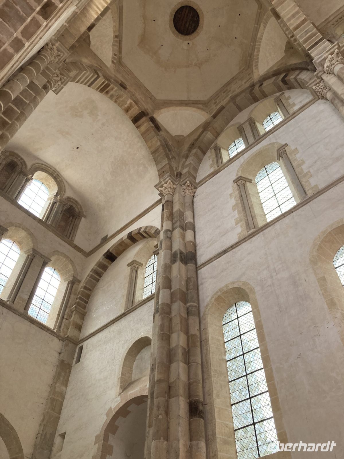 Wieder liegt der Reiseleiter richtig mit seiner Wettereinschätzung, sodass wir ohne Regenschutz den steilen Kirchenberg erklimmen und uns die herrliche Kathedrale mit seiner gebänderten Innenkonstruktion und dem überaus eindrucksvollen Säulenkapitellen zu Gemüte führen können. Der Blick ins Cure-Tal vom Park hinter der Kirche darf natürlich nicht fehlen, genauso wenig wie das Würstchenessen am Bus.