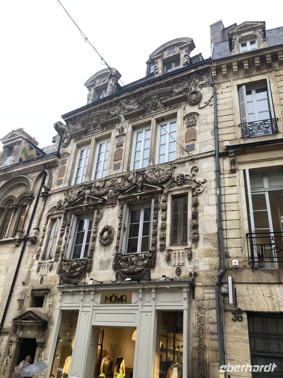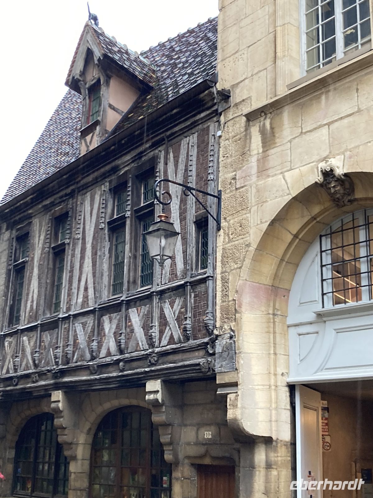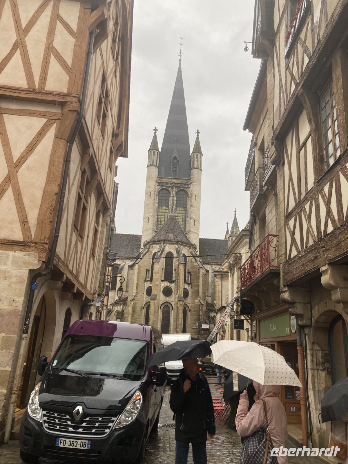 Nachdem wir bisher dem schlechten Wetter getrotzt haben, hat es uns heute so richtig erwischt. Und so müssen wir den Stadtrundgang in Dijon bei strömendem Regen absolvieren. Da hilft es auch wenig, dass wir mit unserer Stadtführerin Christelle eine außerordentlich lebhafte Person zugeteilt bekommen haben, die lautmalerisch und pantomimisch alles gibt, .Mit ihr plantschen wir durch die pittoresken mittelalterlichen Gassen, wo es an jeder Ecke ein uraltes Fachwerkhaus, ein mondäner Stadtpalast oder ein romantischer Platz zu bewundern gibt. An der Kirche Notre-Dame, deren Blessuren aus der Zeit der französischen Revolution noch deutlich sichtbar sind, statten wir "Chouette", der kleinen Eule an der Nordseite der Kirche, einen Besuch ab, um uns unsere Wünsche erfüllen zu lassen. Gegenüber befindet sich das Stammhaus des Senfherstellers Fallot, bei dem wir im Anschluss an die Stadtführung vorbeischauen. Hier in dem verwinkelten kleinen Laden können wir, vor Nässe dampfend, die unterschiedlichsten Sorten des Produktes probieren, für das Dijon weltberühmt ist. Und so ist es naheliegend, dass EBERHARDT TRAVEL seinen Gästen als Erinnerung an diese Reise ein Glas Moutard de Dijon avec vin blanc überreicht.