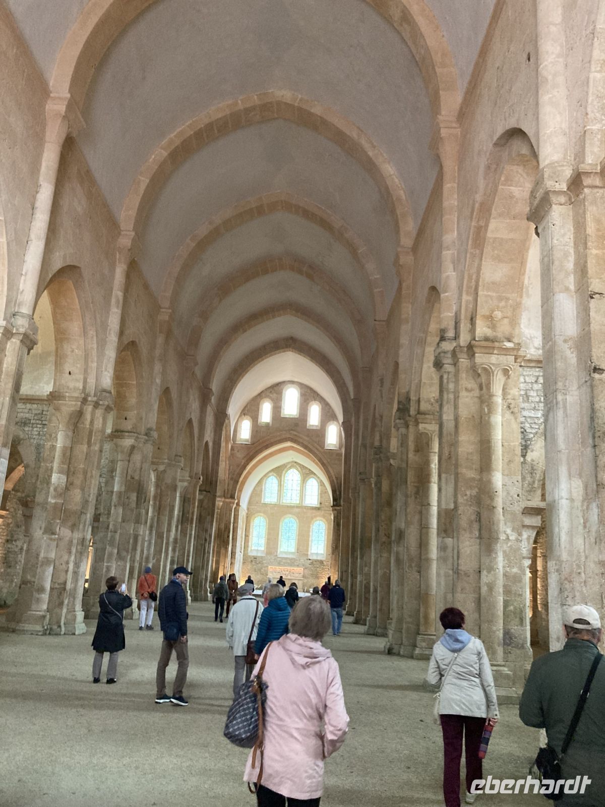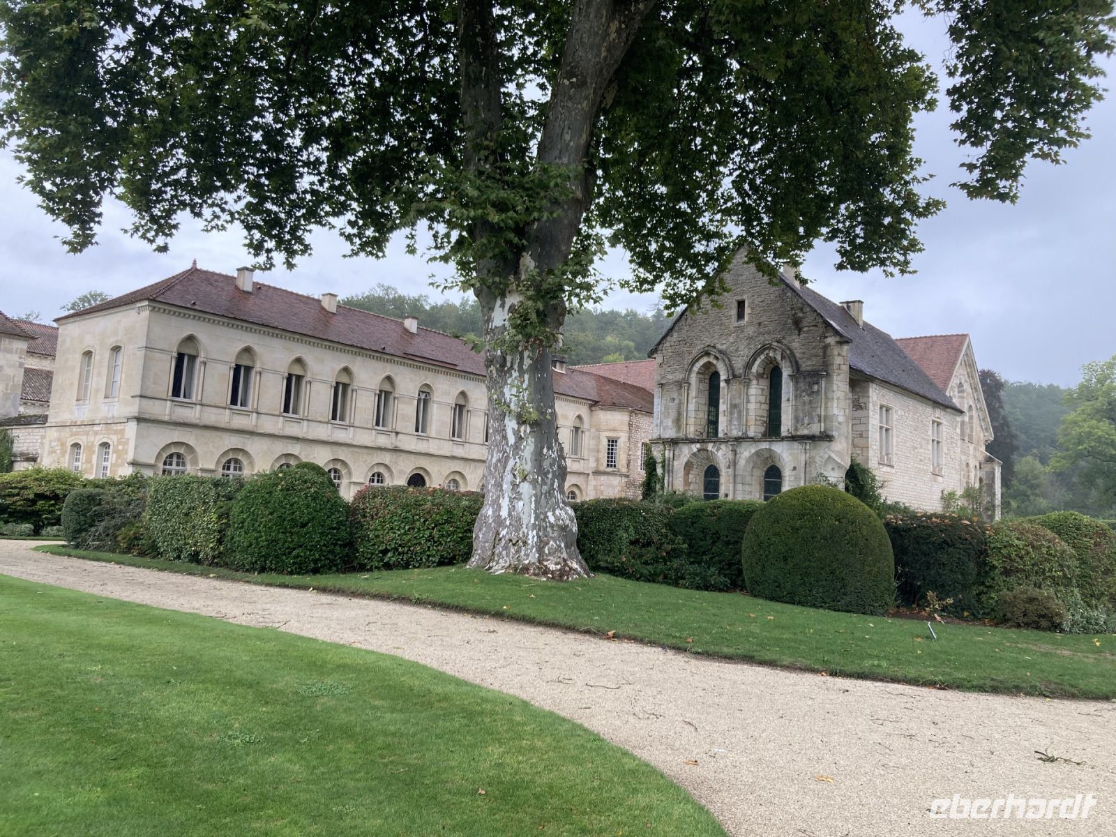 Heute fahren wir Richtung Norden entlang des Canal de Bourgogne vorbei an grünen Weiden, Hügeln und Wäldern. Schließlich gelangen wir im nassen Morgennebel zur Abtei von Fontenay, die gemäß den Weisungen der zisterziensischen Regeln an einem Flüsschen in der Einöde liegt. Die 1118 von Bernhard von Clairvaux gegründete Abtei gilt als die besterhaltene in Frankreich und bot in ihrer Blütezeit mehr als 280 Mönchen und Laien Unterschlupf. Zwar weichten auch in Fontenay weltliche Einflüsse, vor allem in der Zeit der Kommende, das streng religiöse Leben auf und während der französischen Revolution wurde das Kloster säkularisiert. Aufgrund der abgeschiedenen Lage aber wurde die Abtei nicht zerstört, sondern über eine lange Zeit als Papierfabrik genutzt, deren Eigentümer Nachfahren der Gebrüder Mongolfiere, der Erfinder des Heißluftballons, waren. Nach der Schließung der Fabrik zu Beginn des 20. Jahrhunderts machten sich Verwandte der Familie daran, dieses monastische Kleinod mit großem Engagement und beträchtlichen finanziellen Mitteln wieder in seinen originalen Zustand zu versetzen, was zum Beispiel an der Wiederherstellung des gestampften Kiesbodens in der Kirche deutlich wird .