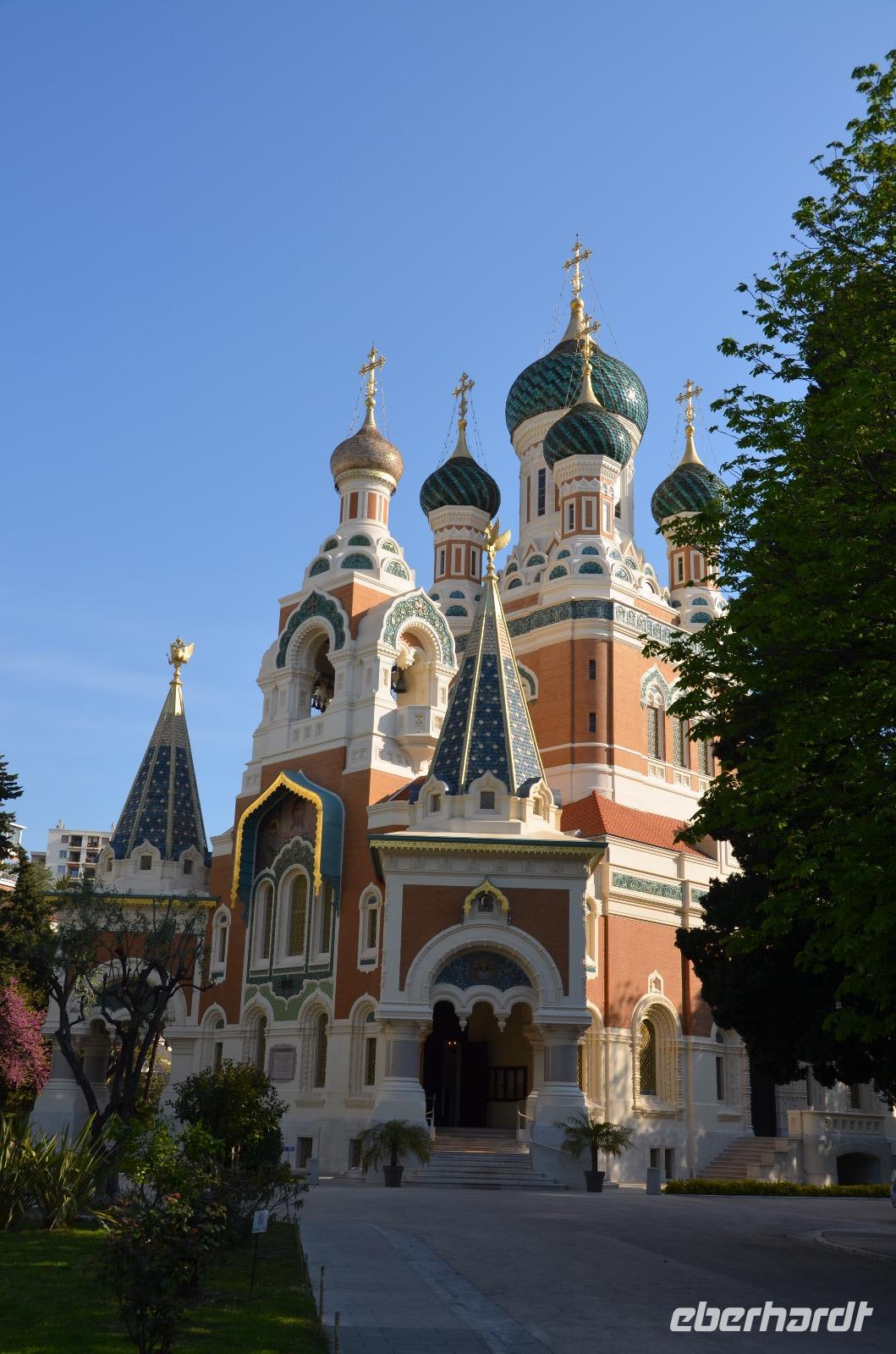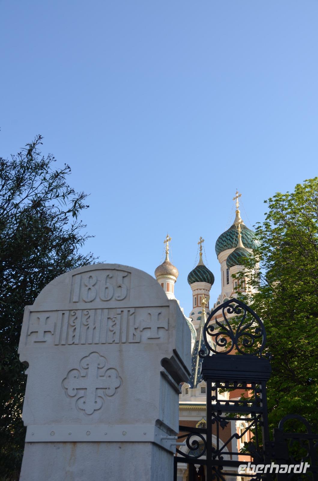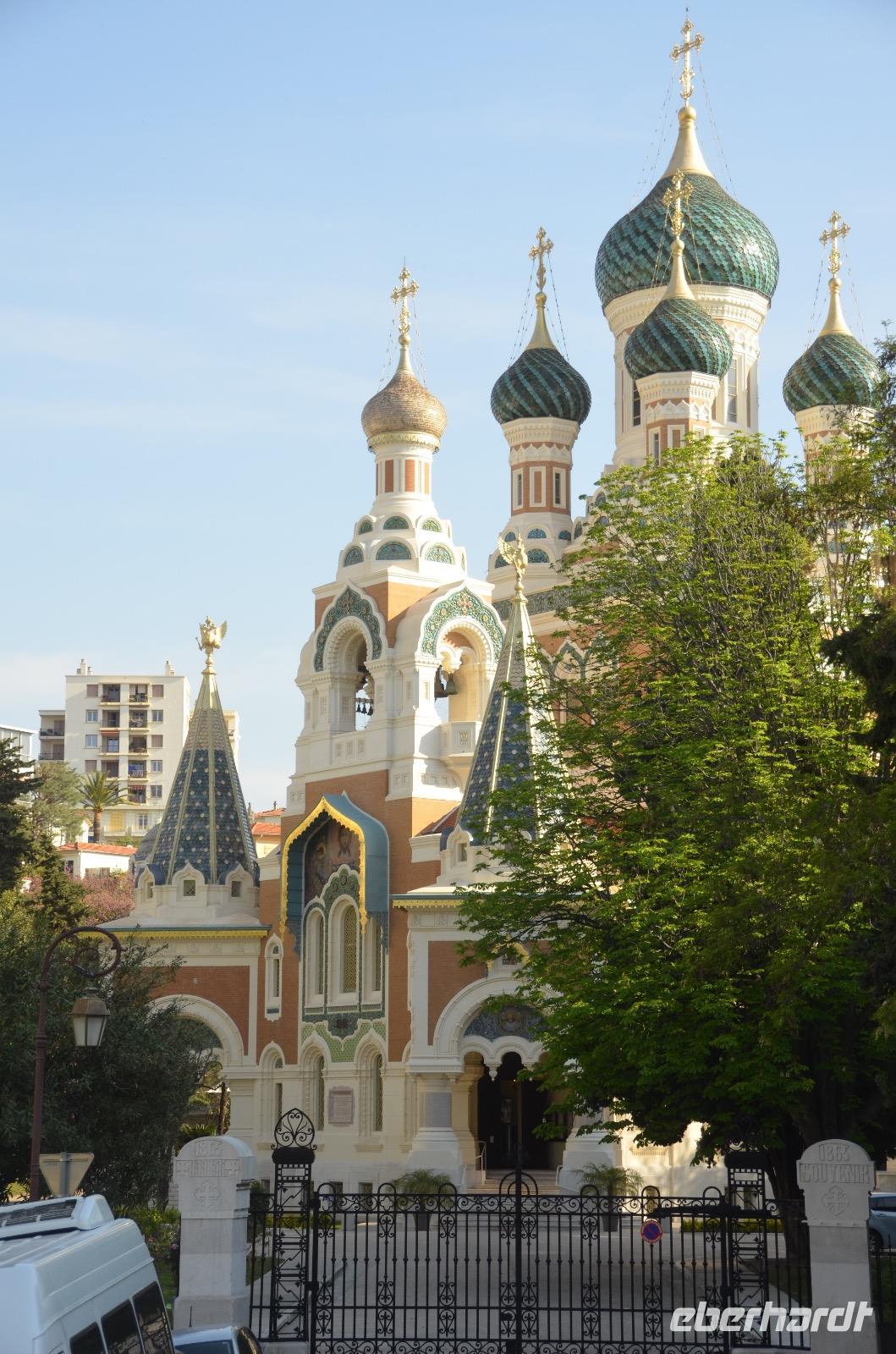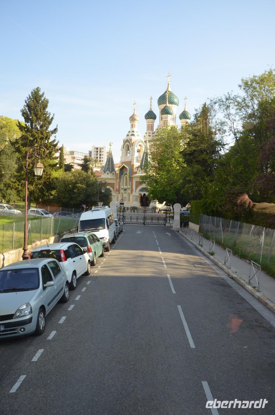 Nach unserem ersten französischen Frühstück, begann unsere Stadtrundfahrt durch Nizza, die fünft größte Stadt Frankreichs. Unser Reiseleiter Richard führte uns als erstes zu einer 1912 erbauten russischen Kirche. Mit ihren prächtigen Zwiebelkuppeln bot sie uns ein tolles Fotomotiv. Das Gotteshaus gehört heute dem russischen Staat. Die Geschichte für die Entstehung dieser Kirche reicht allerdings bis Mitte des 19. Jahrhunderts zurück, als die russische Zarin Alexandra begann, ihren Urlaub in Nizza zu verbringen. Diese Tradition führte die Zarenfamilie fort.