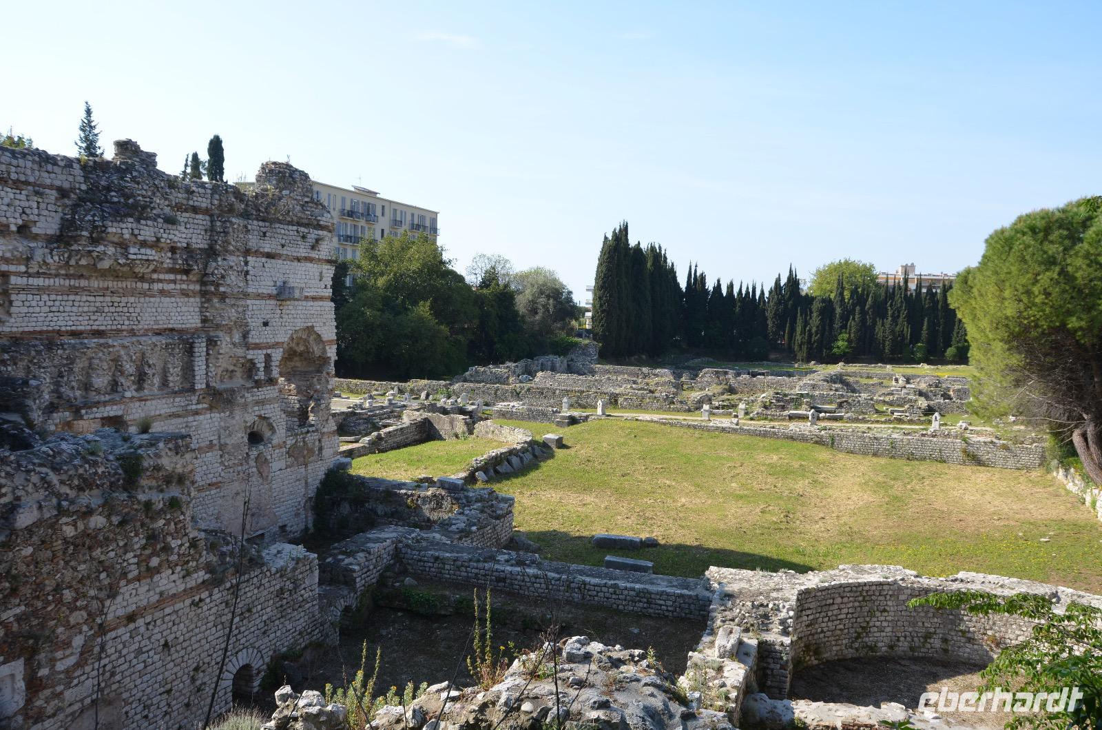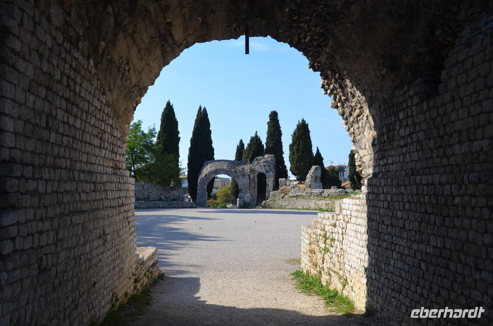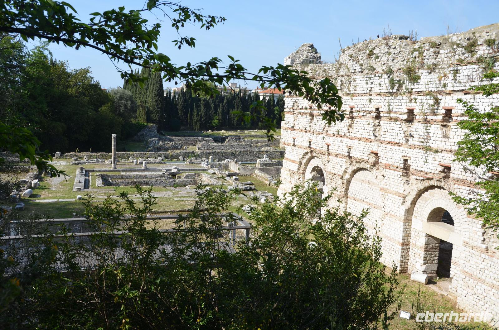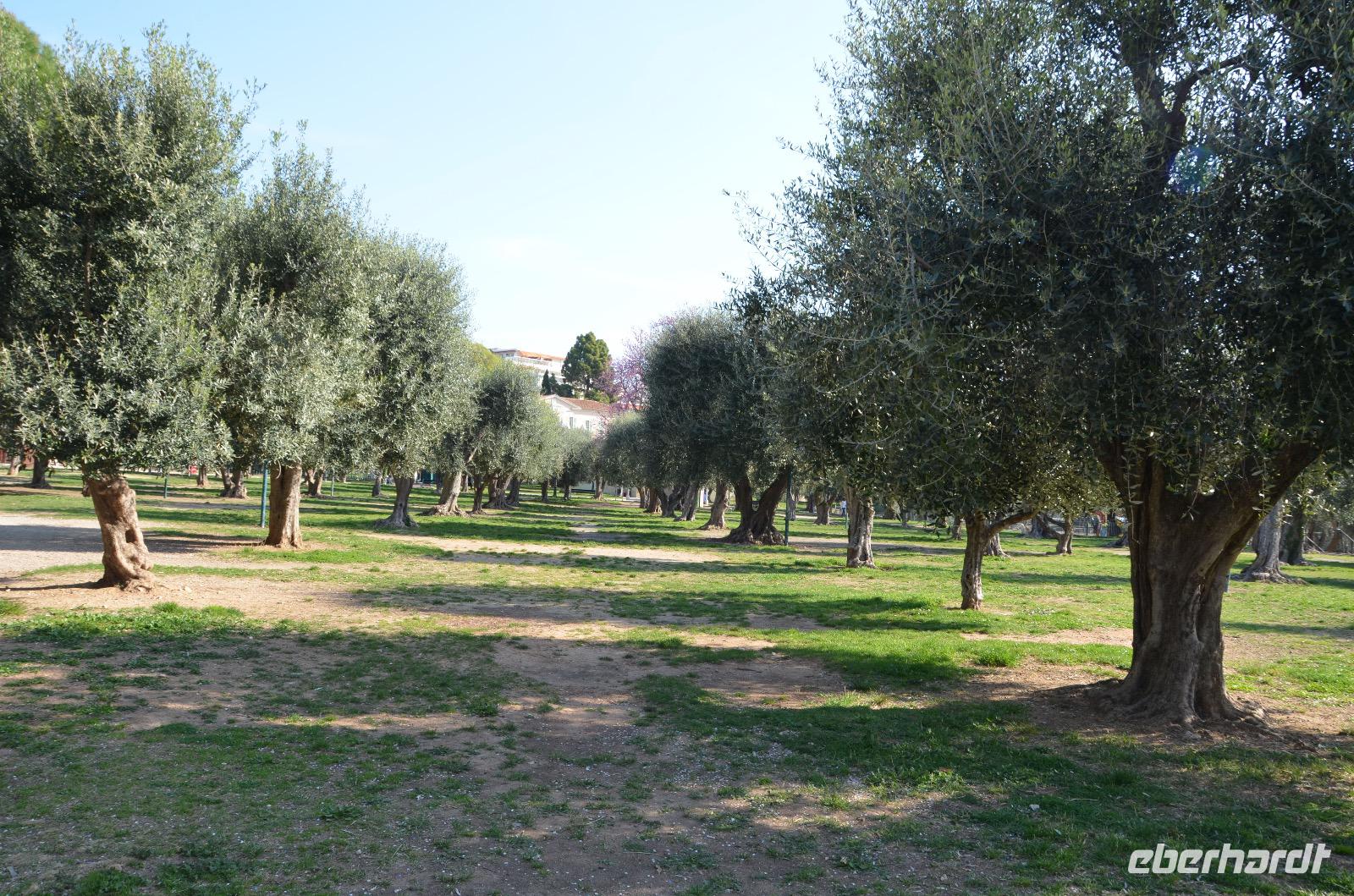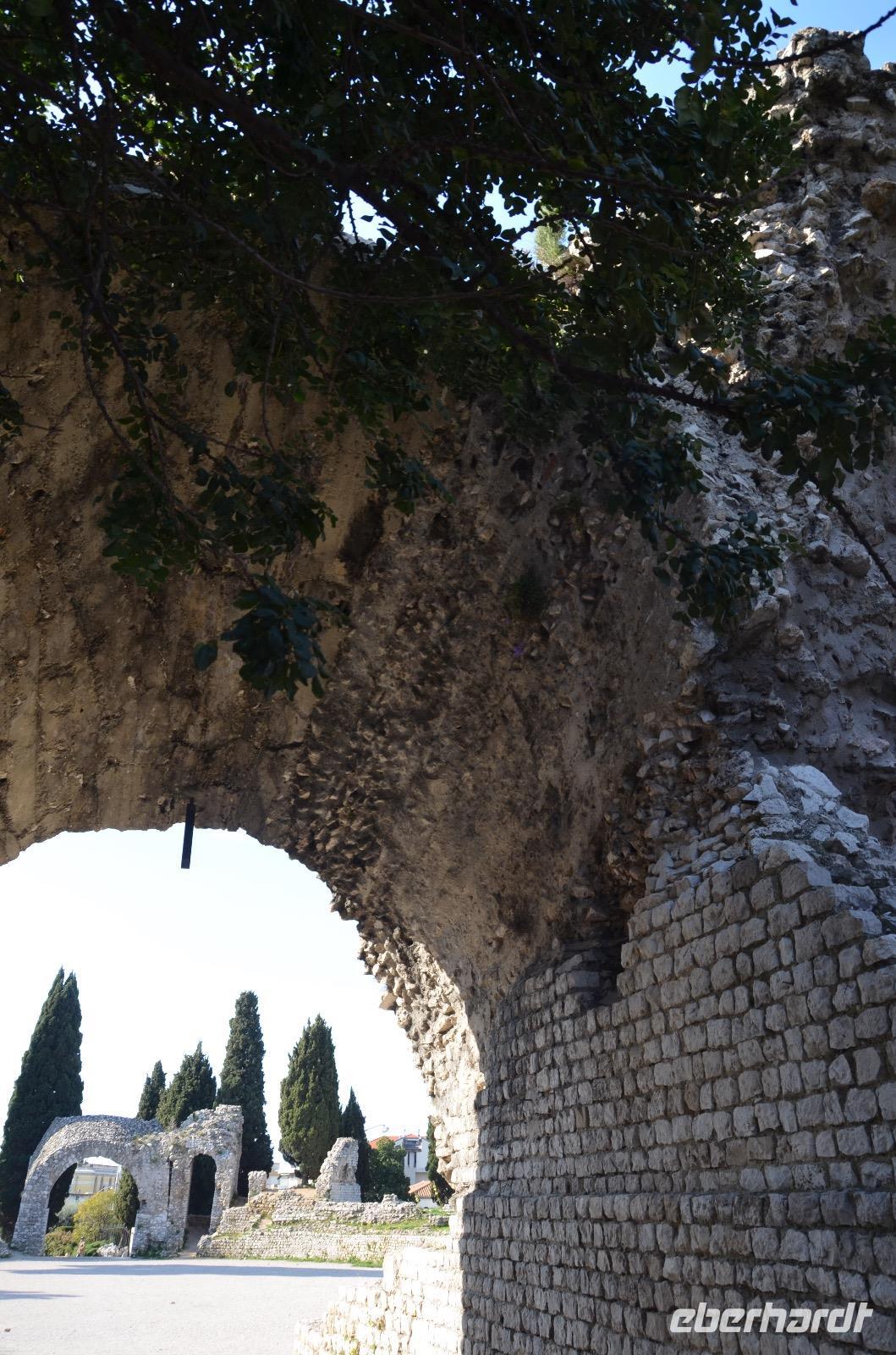 Gegenüber des Museums befindet sich ein riesiger Olivengarten mit bis zu 400 Jahre alten Bäumen. Wir schlenderten entlang der angelegten Alleen bis wir zu den Ruinen der ehemaligen Bäder und Thermen der Römer kamen. Diese stammen aus dem 2. Jahrhundert nach Christus. Der Grund für die relativ gute Erhaltung dieser Anlage, liegt darin, dass die Gebäude zwischenzeitlich als Stallungen genutzt wurden und nicht wie der Rest der Stadt abgerissen wurde.