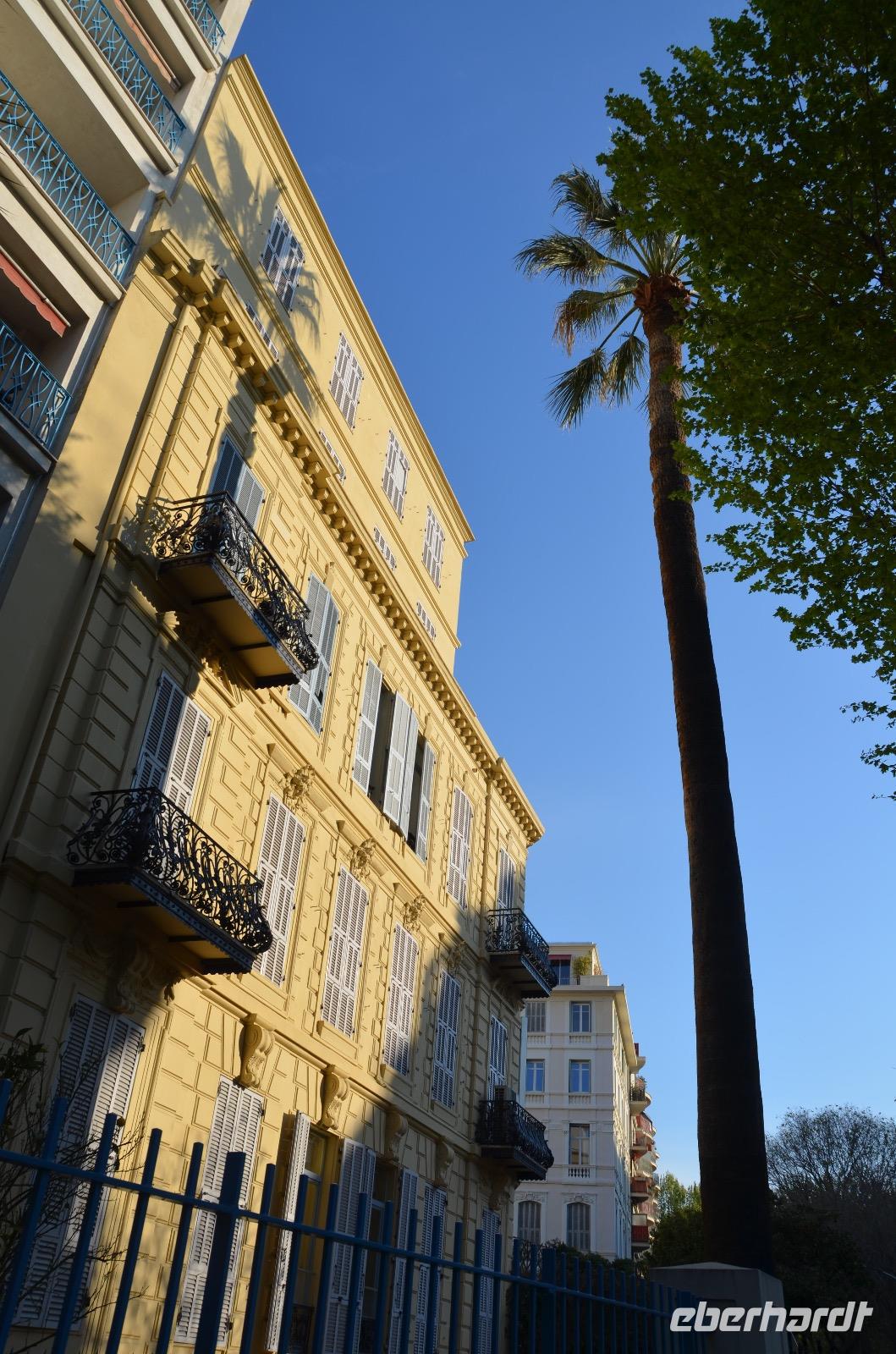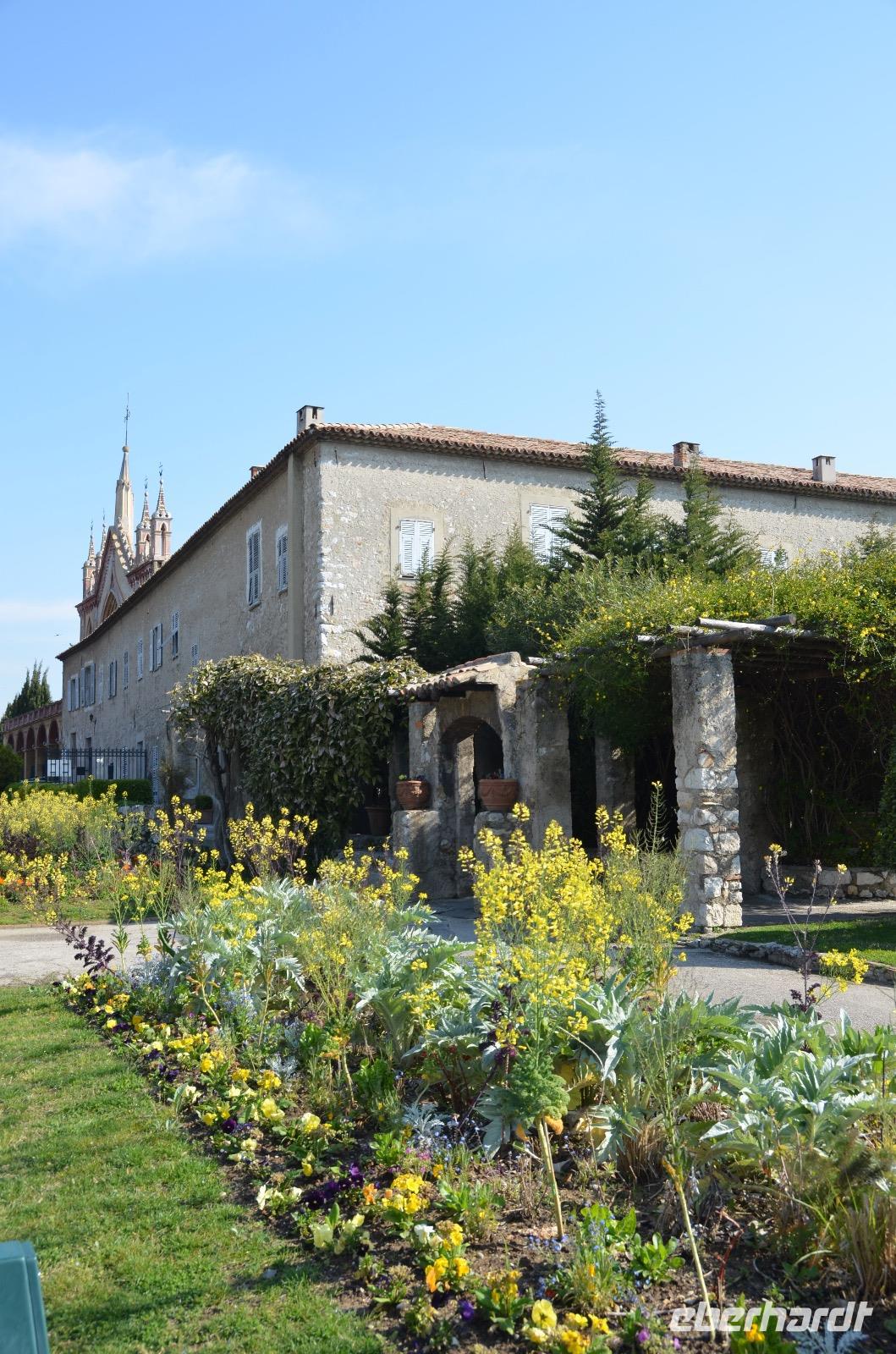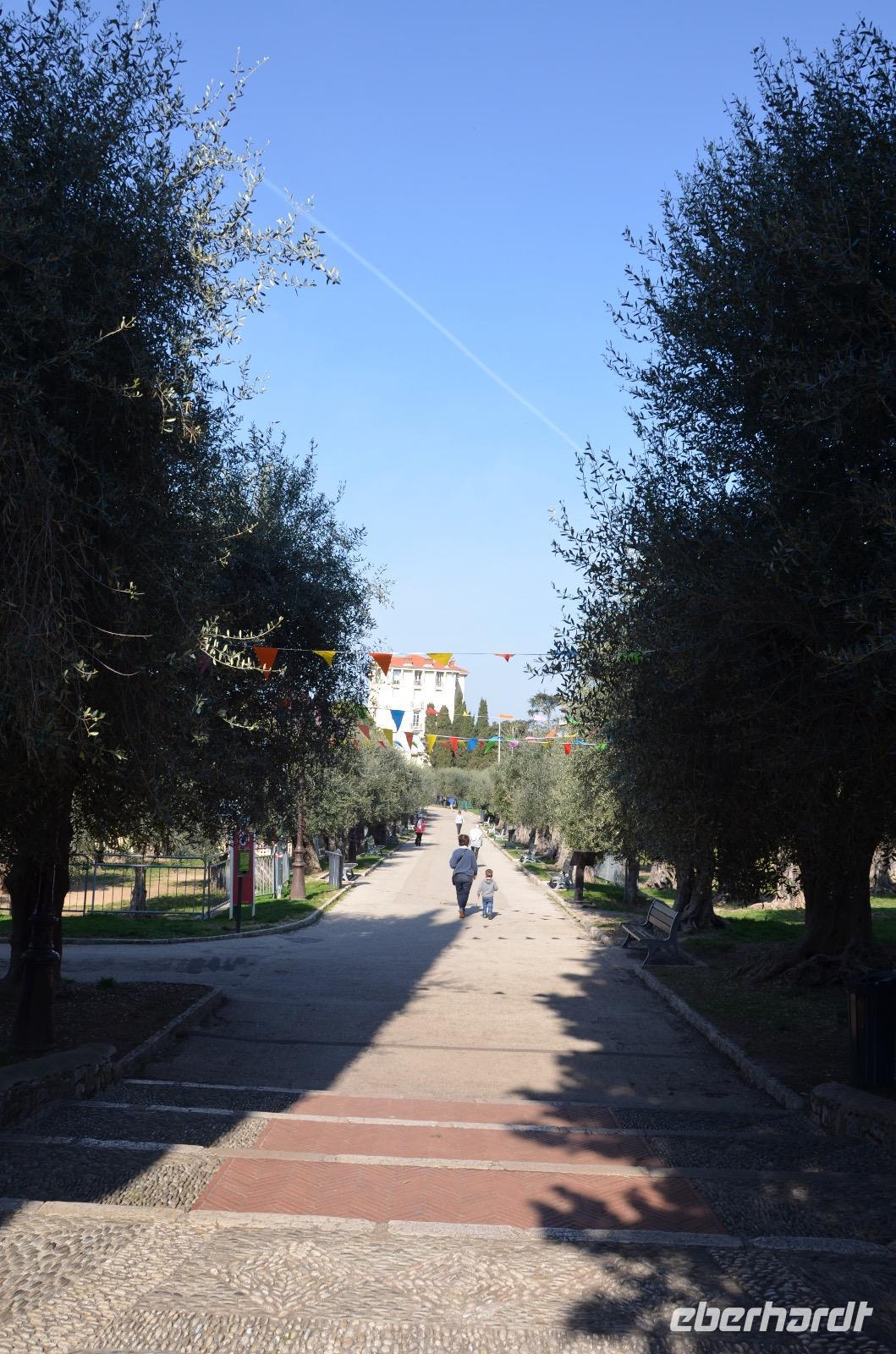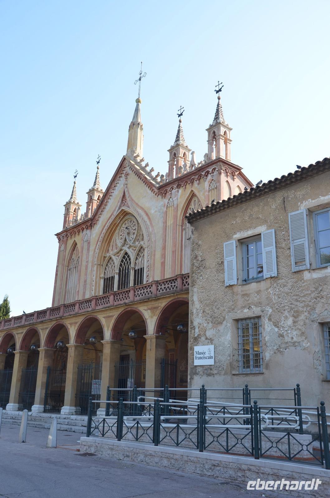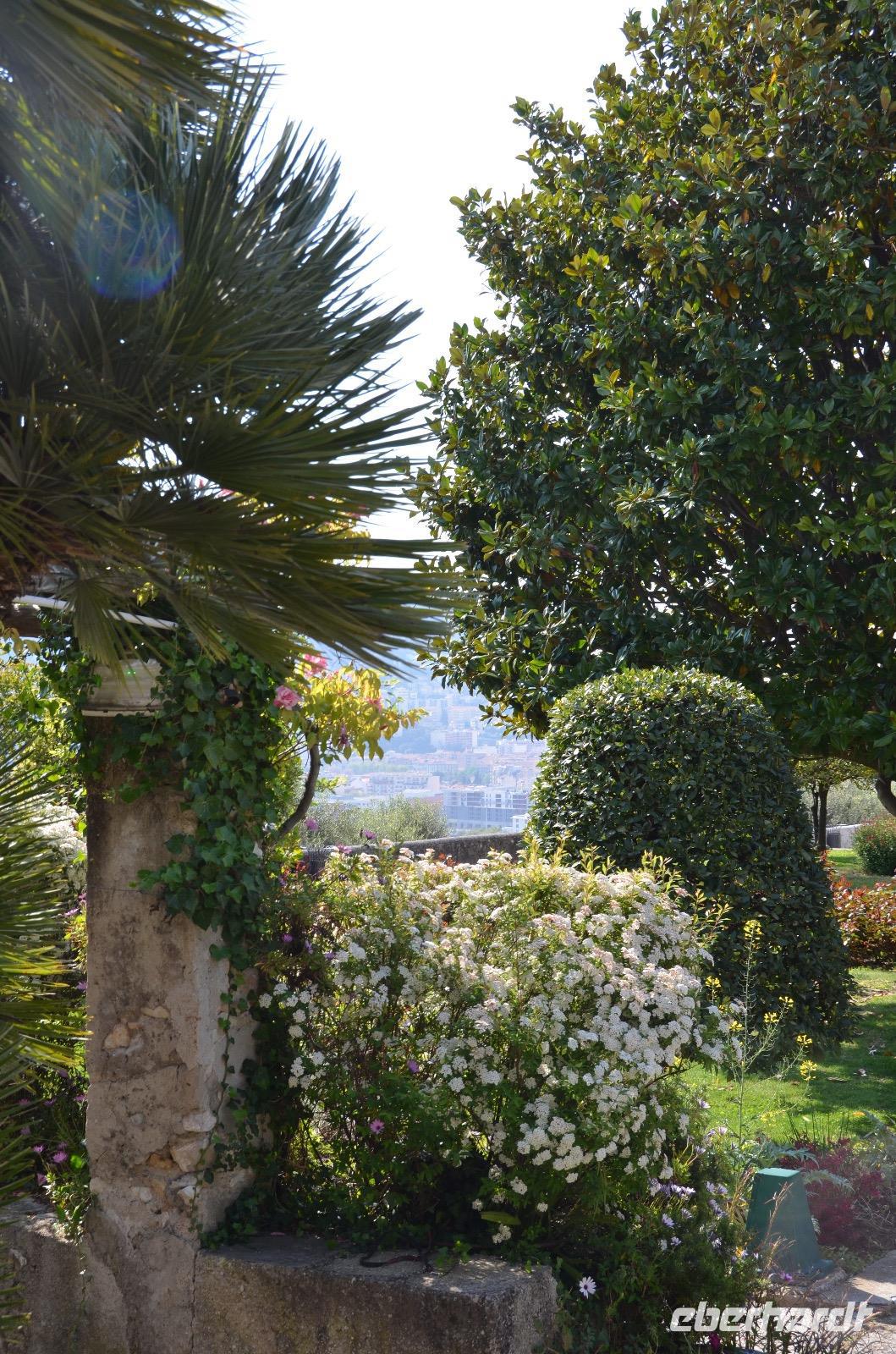 Immer der Sonne entgegen, kamen wir schließlich an dem Franziskaner Kloster mit seiner Kirche aus dem 16. Jahrhundert an. Richard führte uns in den Klostergarten und wir waren beeindruckt von der Blüten- und Pflanzenvielfalt. Der Mohn blühte hier in gelb, orange sowie rot, die Rosen rankten über den Torbögen und die Palmenblätter wehten im Wind. Voller Begeisterung spazierten wir durch den liebevoll angelegten Garten und entdeckten sogar ein paar Mangoldpflanzen, welche als Delikatesse an der Côte d'Azur gelten. Auf dem Rückweg schauten wir auch in die Klosterkirche rein, bevor es mit dem Bus Richtung Altstadt ging. Unser Weg führte uns an dem berühmten, ehemaligen Hotel Regina vorbei. Vor dem großen Komplex steht eine Statue der Königin Viktoria von England, die hier drei Winter verbrachte. Insgesamt hat das Haus 600 Zimmer, welche nach dem 1. Weltkrieg als Appartements verkauft wurden.