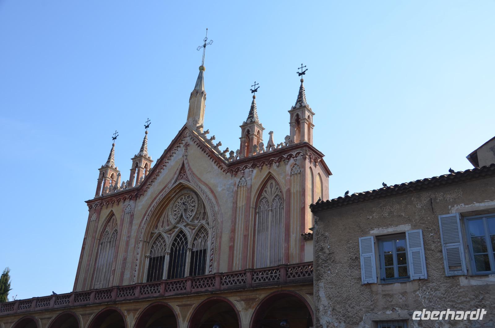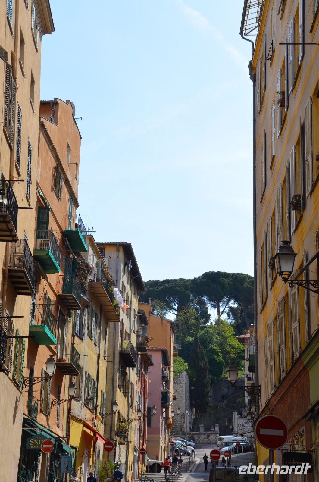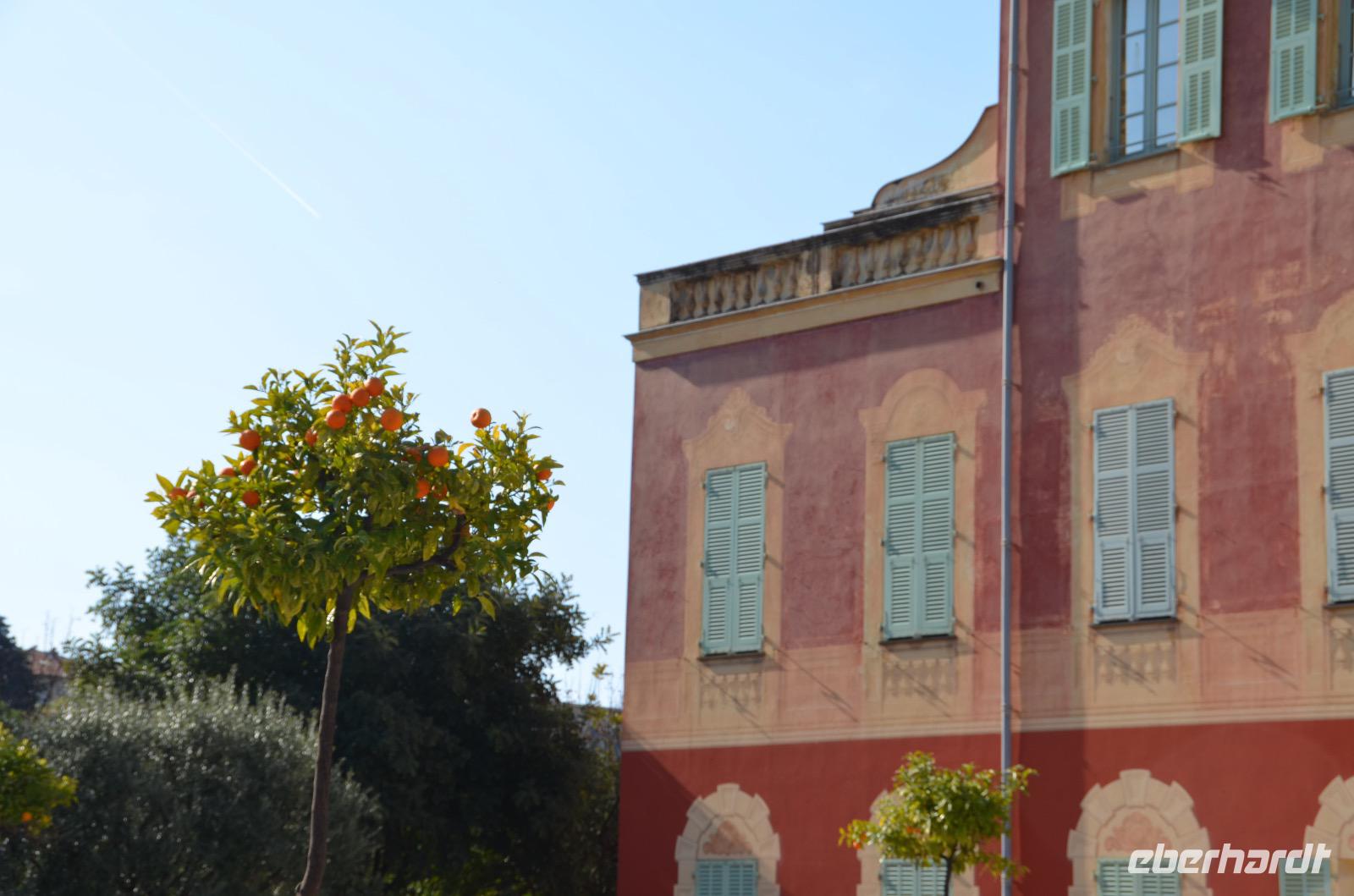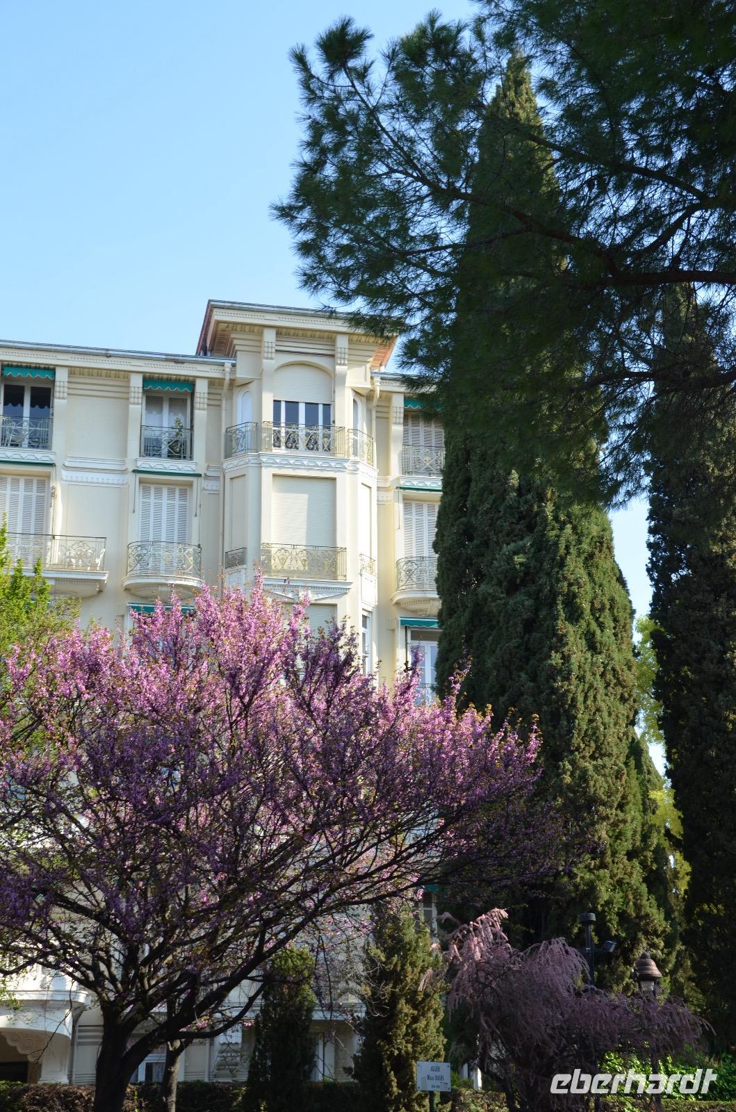 Immer der Sonne entgegen, kamen wir schließlich an dem Franziskaner Kloster mit seiner Kirche aus dem 16. Jahrhundert an. Richard führte uns in den Klostergarten und wir waren beeindruckt von der Blüten- und Pflanzenvielfalt. Der Mohn blühte hier in gelb, orange sowie rot, die Rosen rankten über den Torbögen und die Palmenblätter wehten im Wind. Voller Begeisterung spazierten wir durch den liebevoll angelegten Garten und entdeckten sogar ein paar Mangoldpflanzen, welche als Delikatesse an der Côte d'Azur gelten. Auf dem Rückweg schauten wir auch in die Klosterkirche rein, bevor es mit dem Bus Richtung Altstadt ging. Unser Weg führte uns an dem berühmten, ehemaligen Hotel Regina vorbei. Vor dem großen Komplex steht eine Statue der Königin Viktoria von England, die hier drei Winter verbrachte. Insgesamt hat das Haus 600 Zimmer, welche nach dem 1. Weltkrieg als Appartements verkauft wurden.
