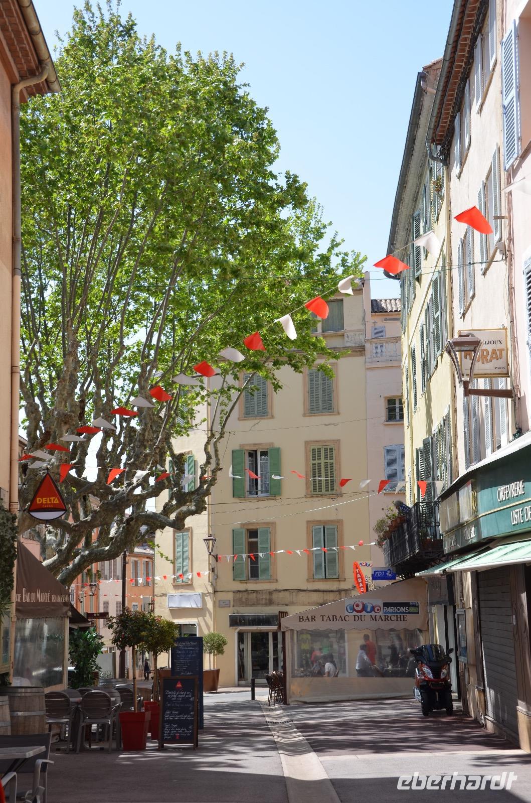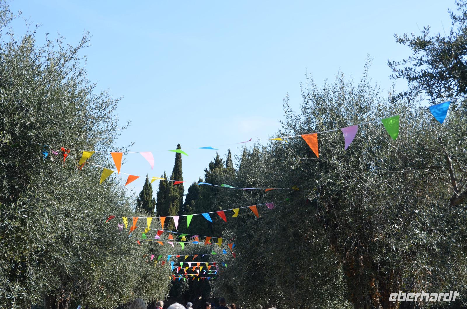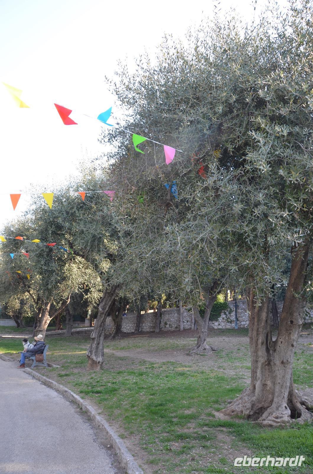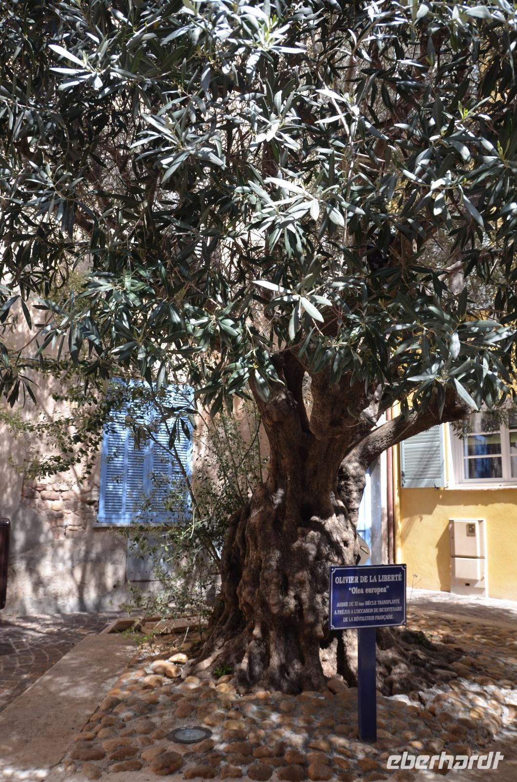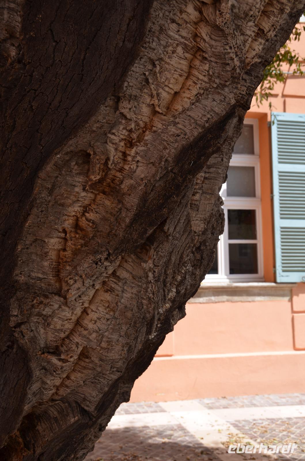 Um die Stadt herum wurde im 16. Jahrhundert eine Mauer errichtet, vor allem wegen der Religionskriege. Bei einem Rundgang durch die Ortschaft, erreichten wir als erstes die Kathedrale mit ihrem Glockenturm. Bereits Anfang des 5. Jahrhunderts stand hier eine Taufkapelle, welche heute noch erhalten ist. Wir hatten das Glück durch ein Tor in die 2. älteste Taufkapelle Frankreichs zu blicken. Bei unserem Spaziergang fielen uns vor allem die vielen bunten Wimpel auf, die vor den cremefarbenen Häuserfassaden einen schönen Kontrast und ein tolles Fotomotiv darstellten. Auf dem zentralen Platz von Fréjus wurde zum Ende des Krieges am 11.11.1918 eine Korkeiche gepflanzt. So hatten wir die Möglichkeit diesen interessanten Baum auch aus der Nähe zu betrachten und die Rinde zu berühren. Weiter in der Stadtmitte, zwischen den Häusern entdeckten wir einen alten Olivenbaum, der wohl aus dem 11. Jahrhundert stammen soll.